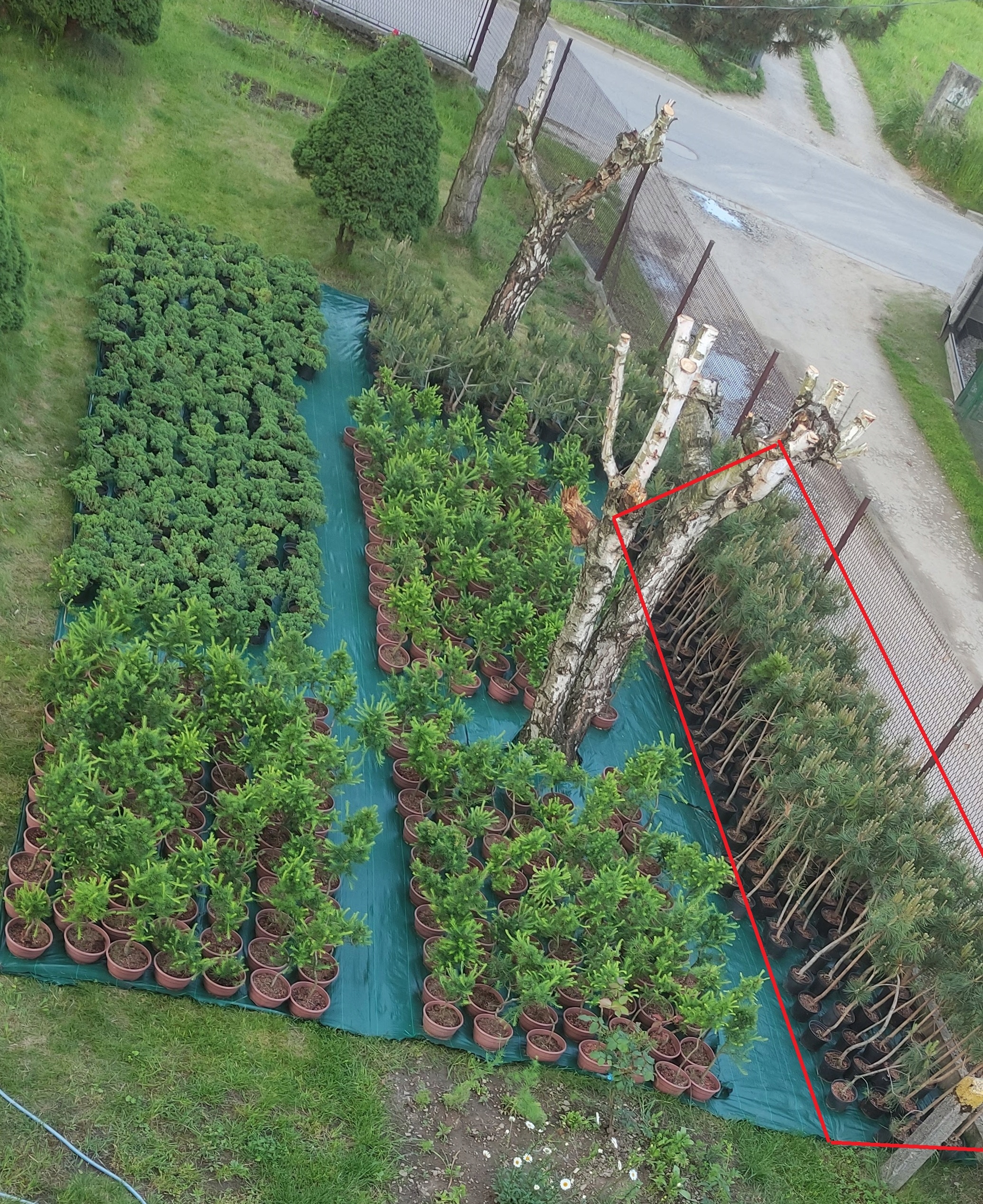 To co widzisz na zdjęciu to cała nasza szkółka, a na czerwono zaznaczyliśmy sprzedawane na tej aukcji sosny, dzięki takiej ilości jesteśmy w stanie każde drzewko traktować indywidualnie, nie hurtowo.