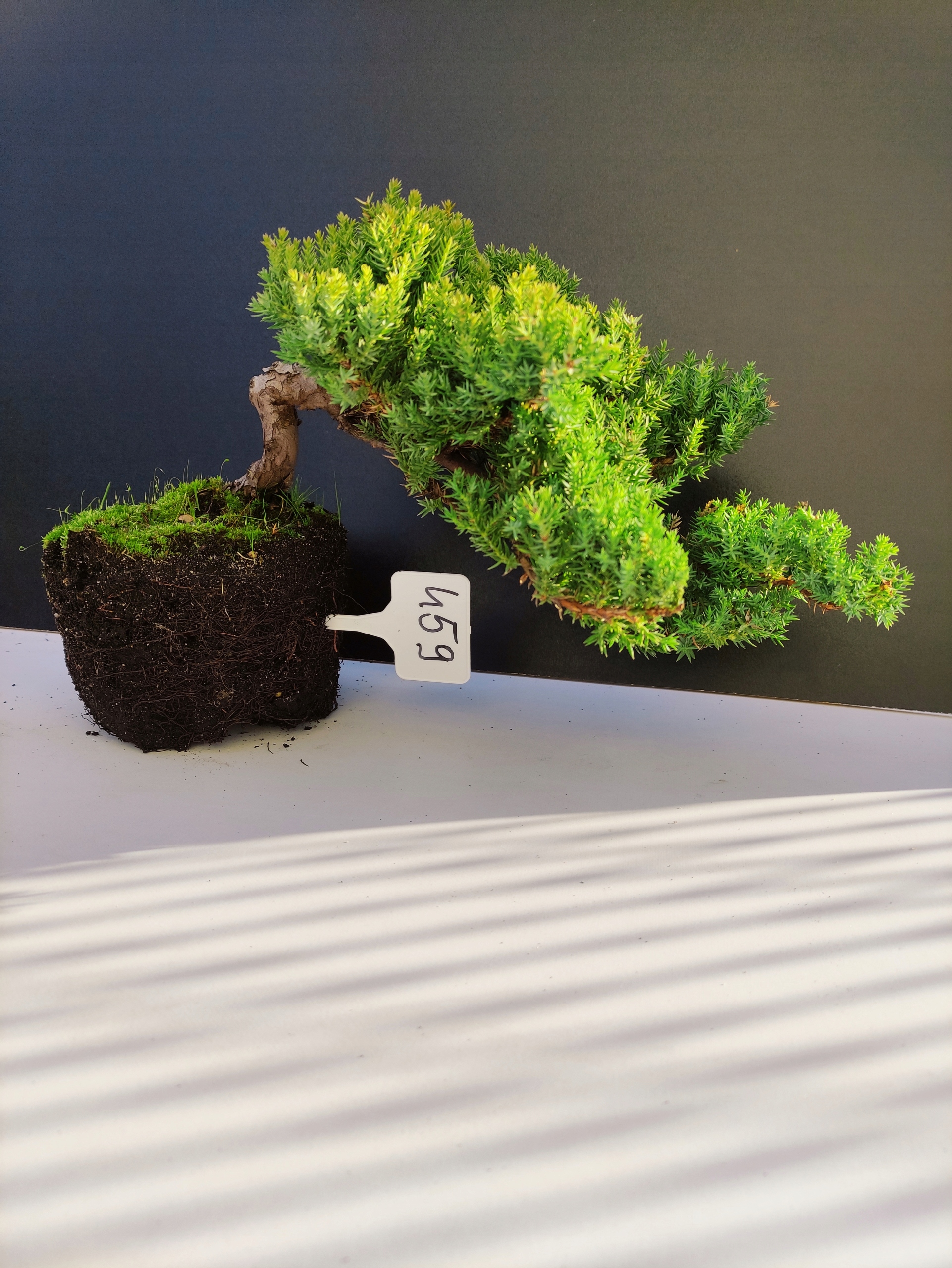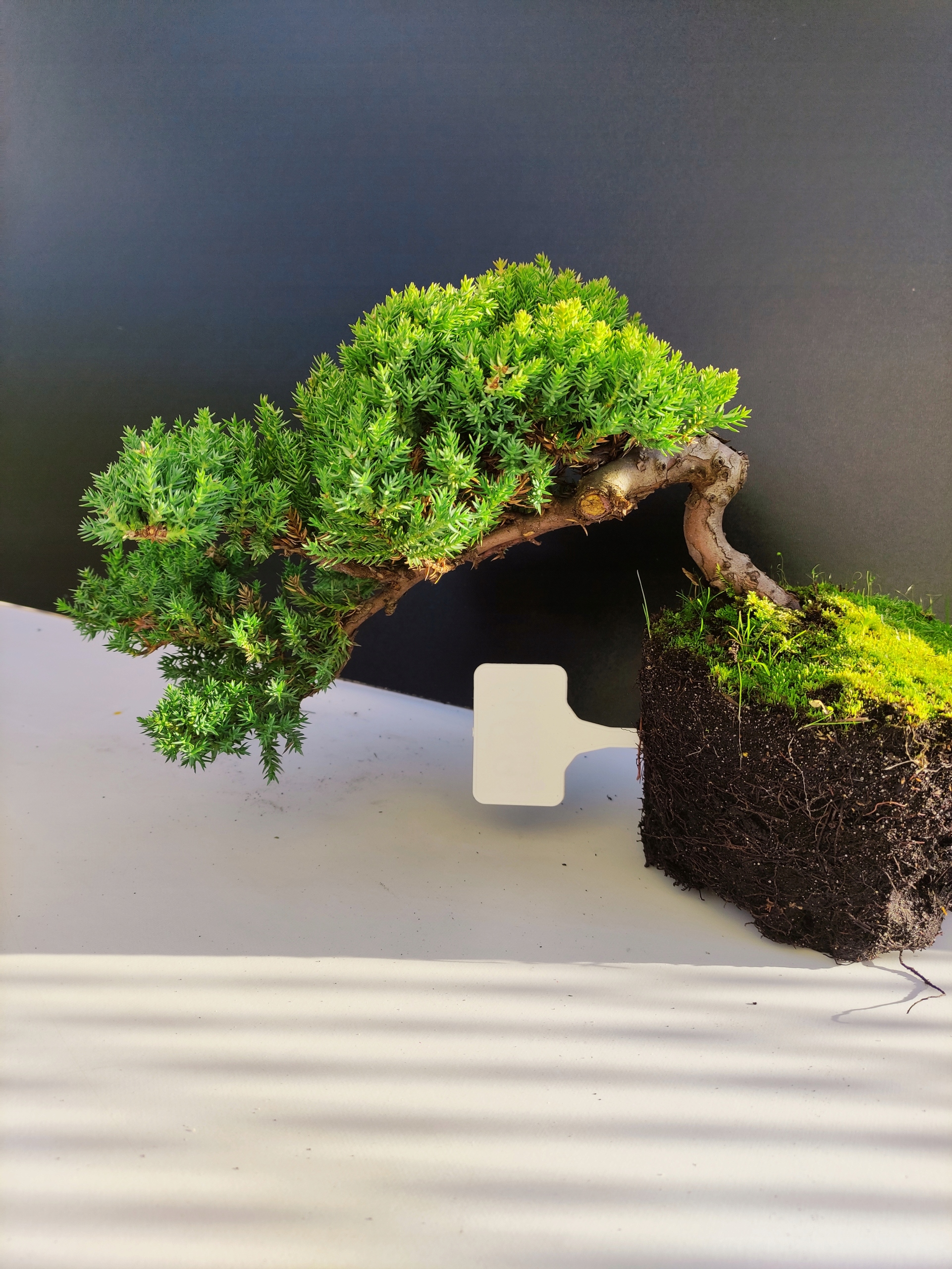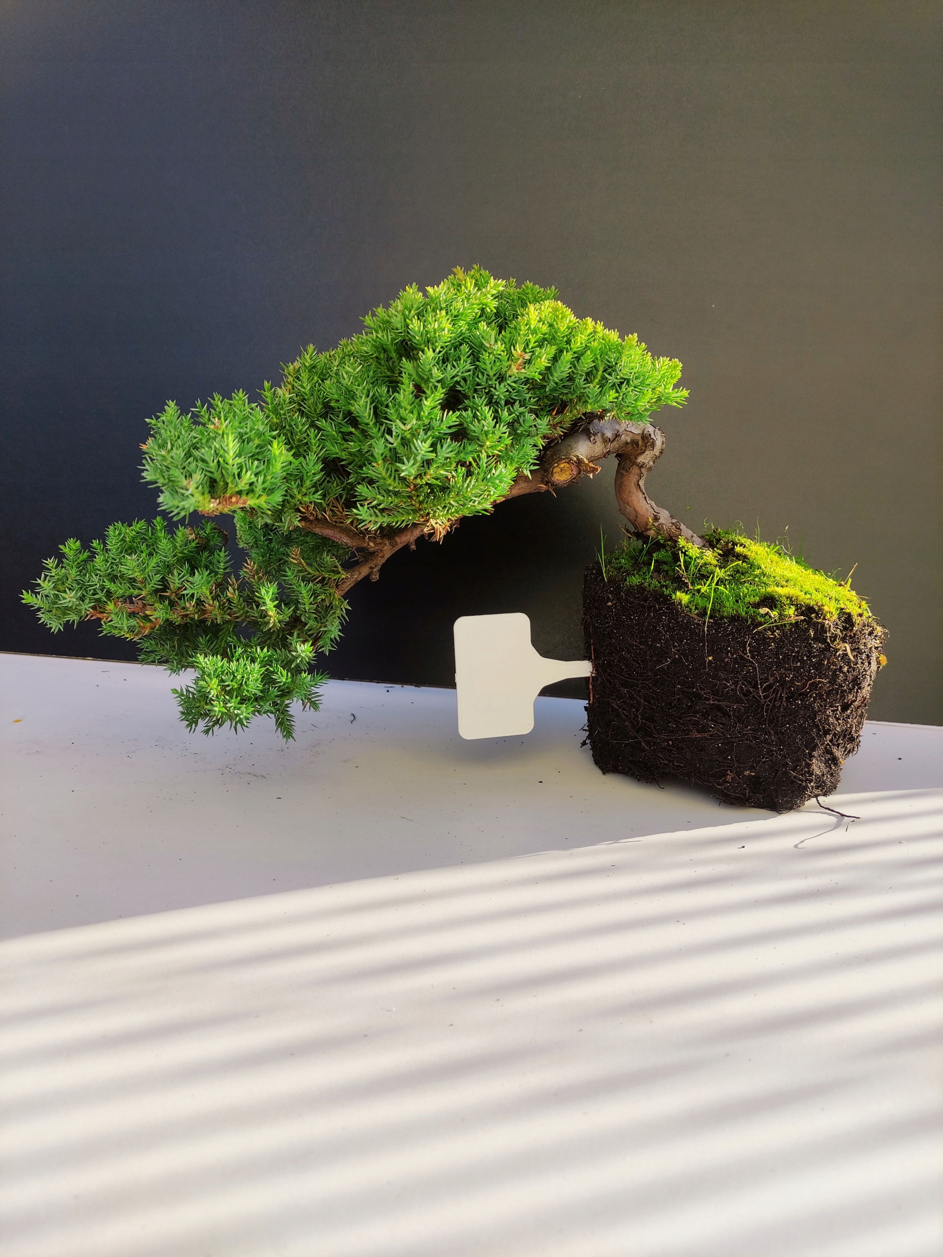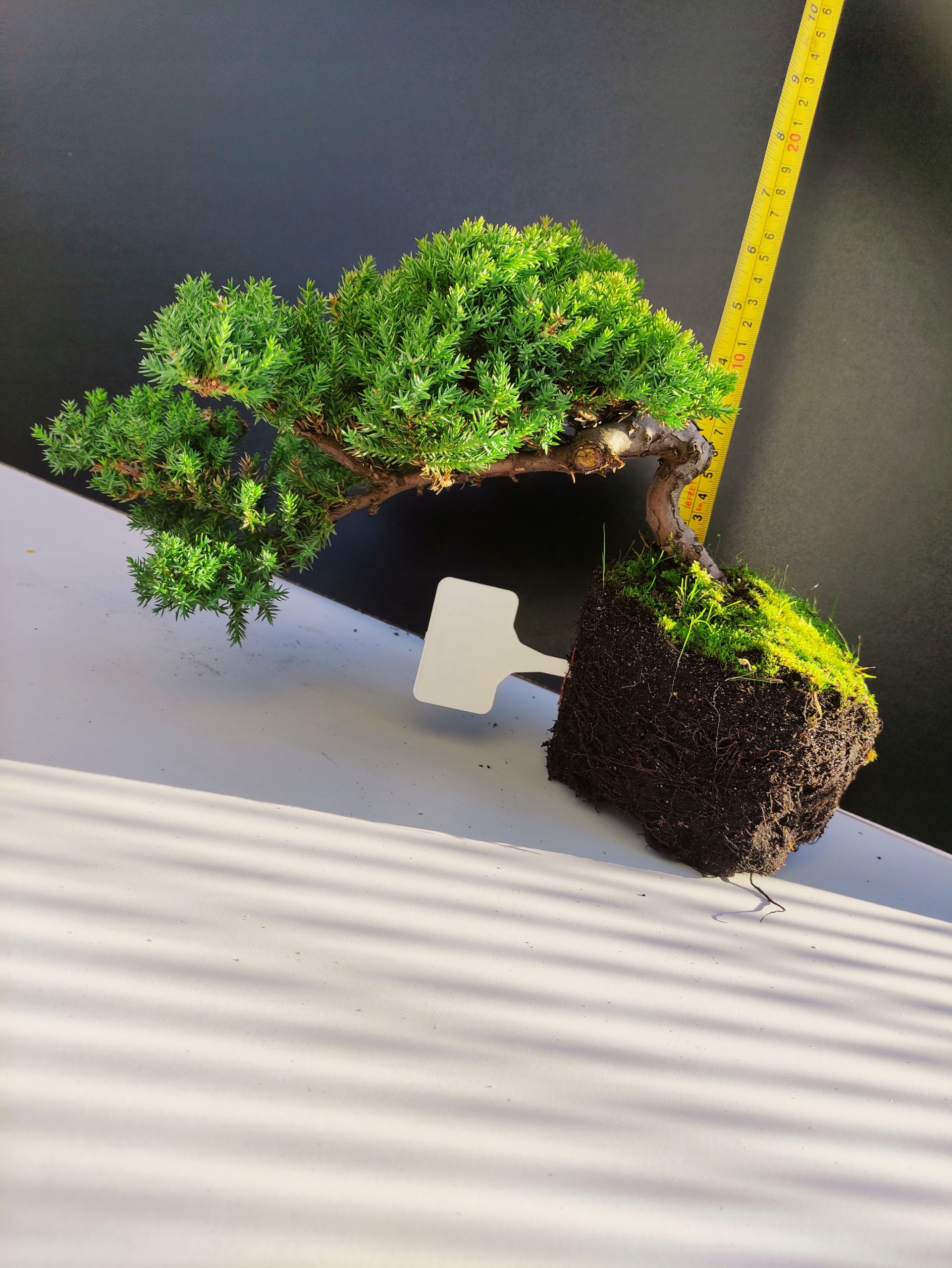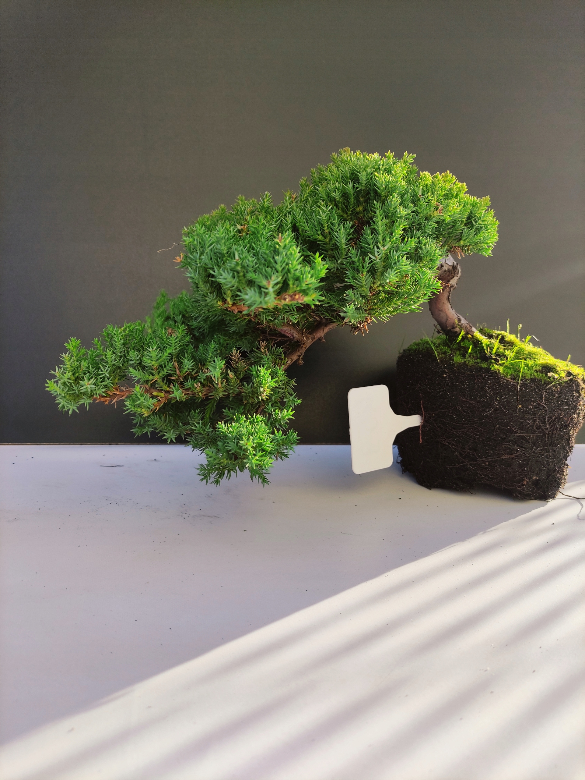 Każde nasze drzewko bonsai to unikalny egzemplarz, dlatego każde zostaje wystawione osobno, ponieważ traktujemy każde indywidualnie – od formowania po pielęgnację. Jałowce te są w naszych rękach od 2021 roku i obecnie mają już 10 lat, dzięki czemu prezentują się wyjątkowo dojrzale i stabilnie.