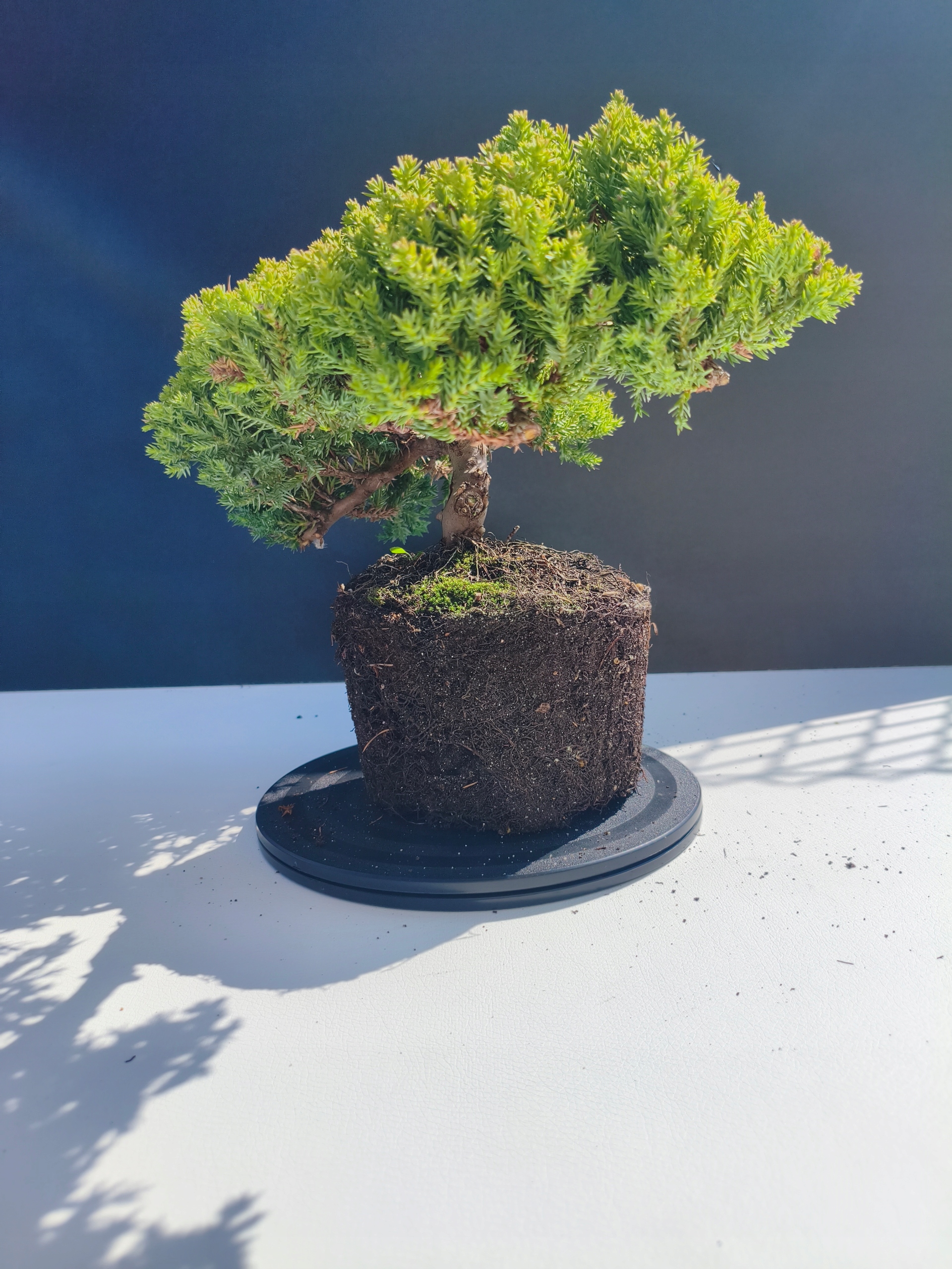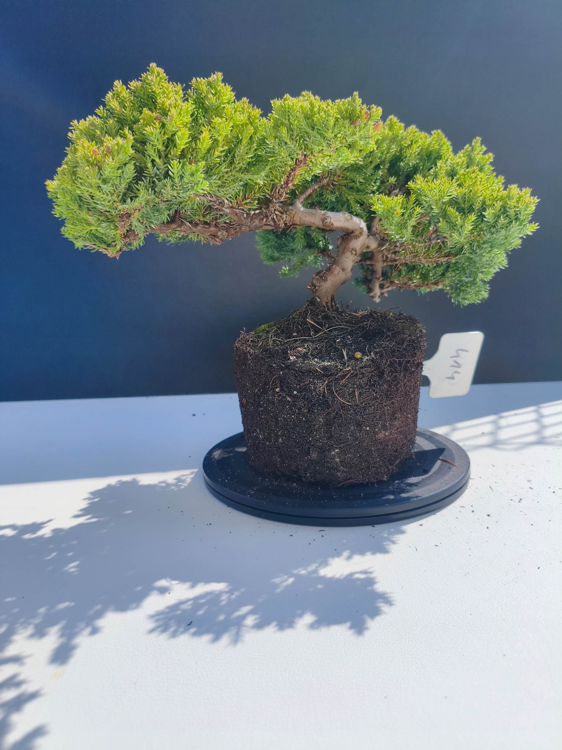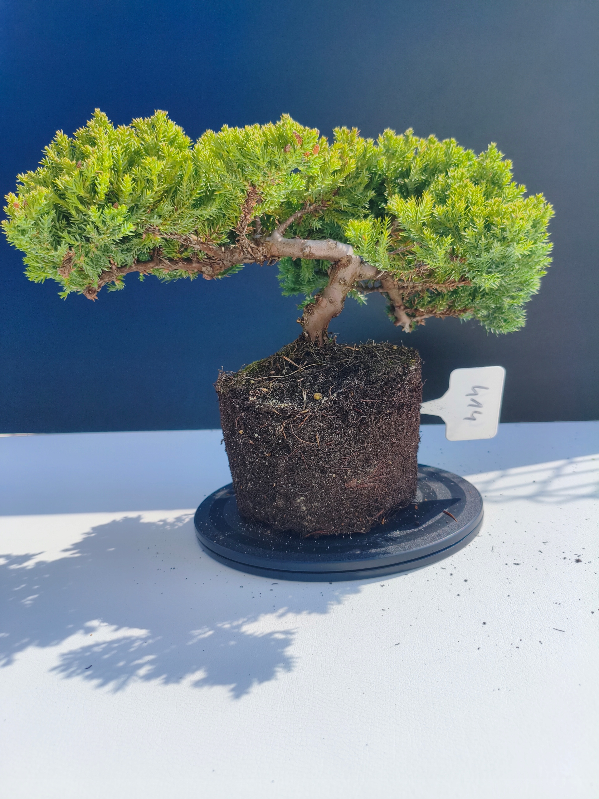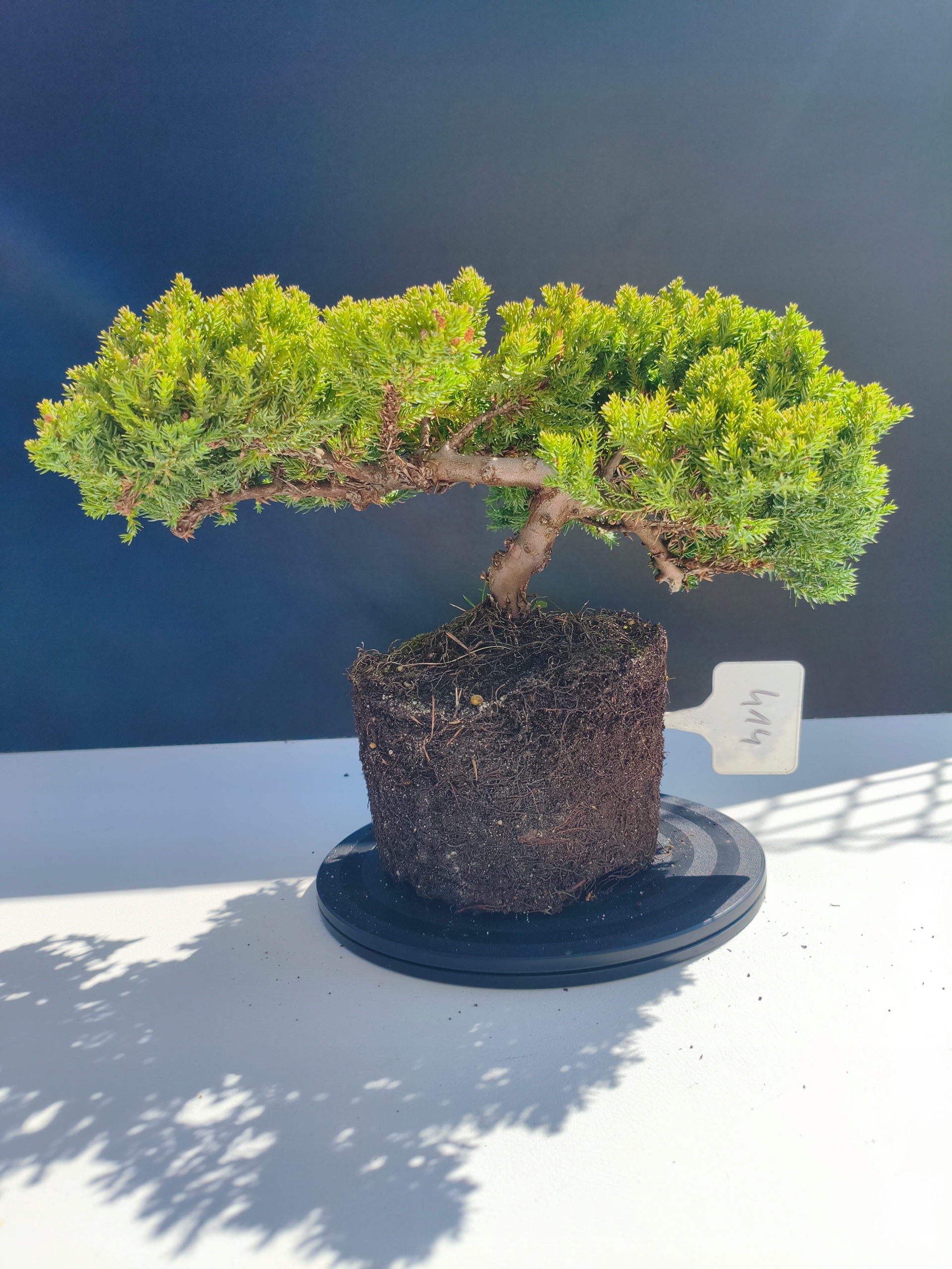Każde nasze drzewko bonsai to unikalny egzemplarz, dlatego każde zostaje wystawione osobno, ponieważ traktujemy każde indywidualnie – od formowania po pielęgnację. Jałowce te są w naszych rękach od 2021 roku i obecnie mają już 11 lat, dzięki czemu prezentują się wyjątkowo dojrzale i stabilnie.