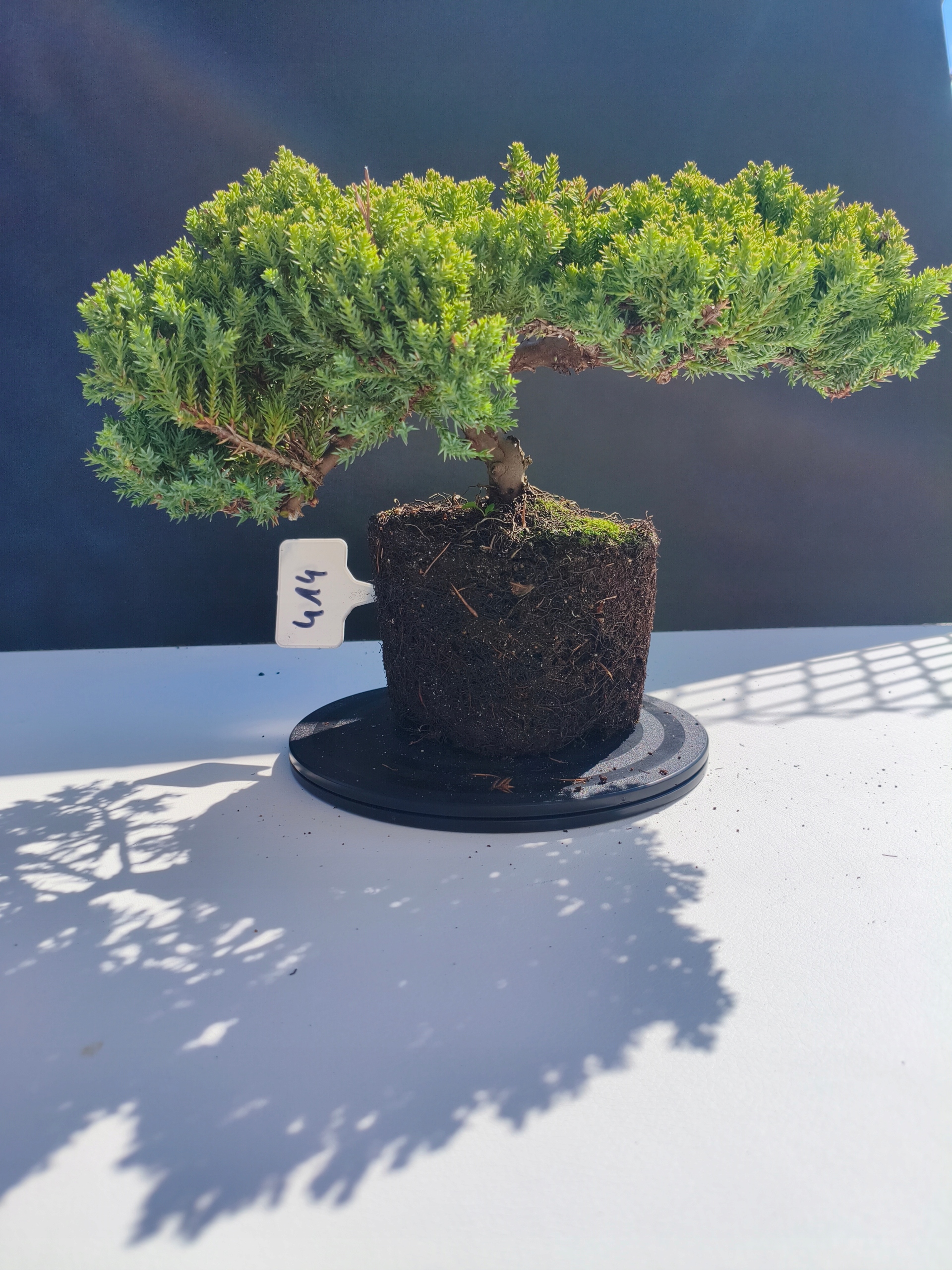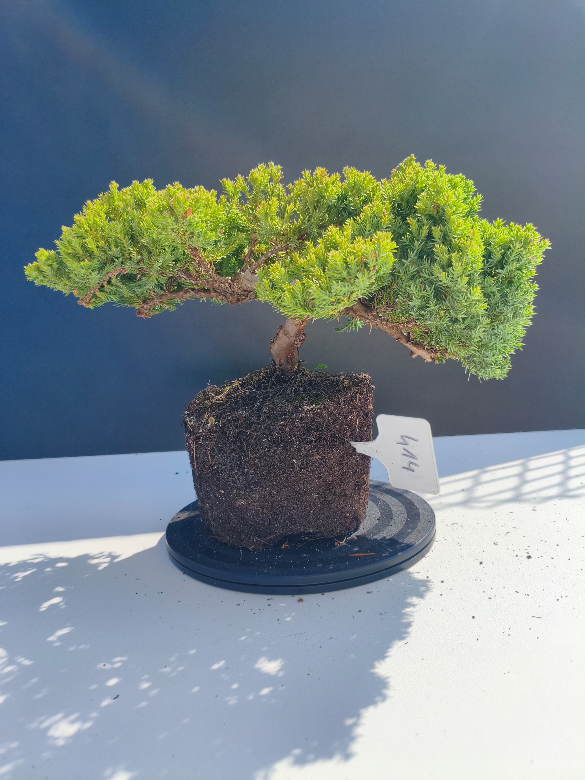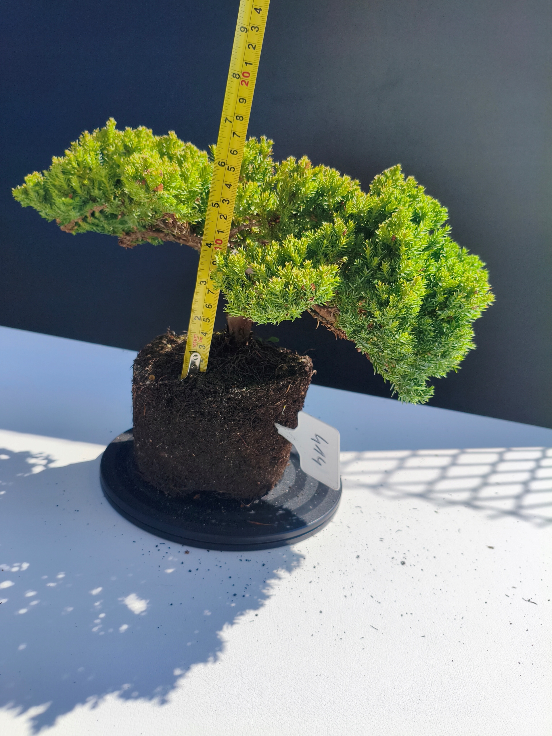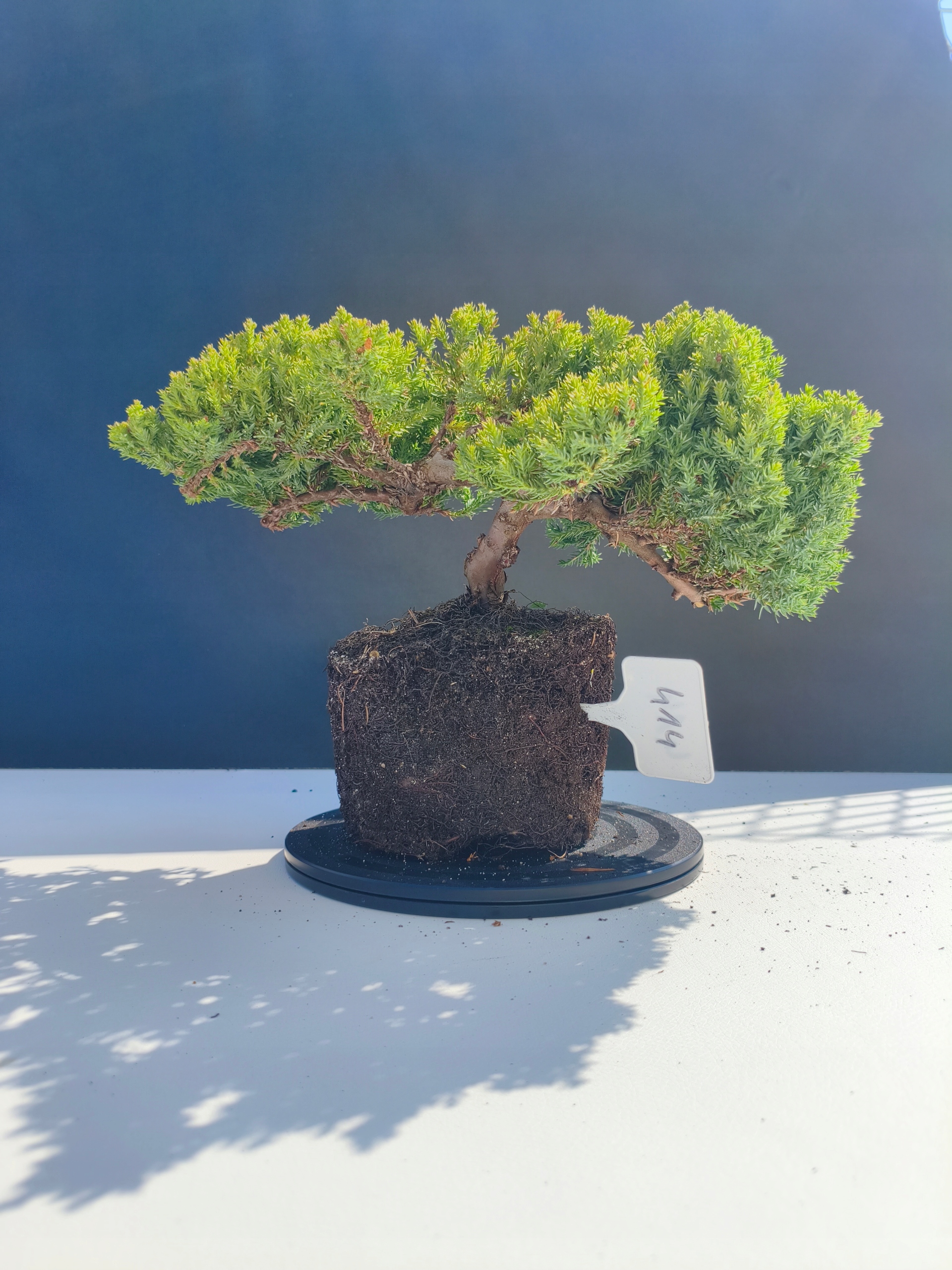 Każde nasze drzewko bonsai to unikalny egzemplarz, dlatego każde zostaje wystawione osobno, ponieważ traktujemy każde indywidualnie – od formowania po pielęgnację. Jałowce te są w naszych rękach od 2021 roku i obecnie mają już 11 lat, dzięki czemu prezentują się wyjątkowo dojrzale i stabilnie.