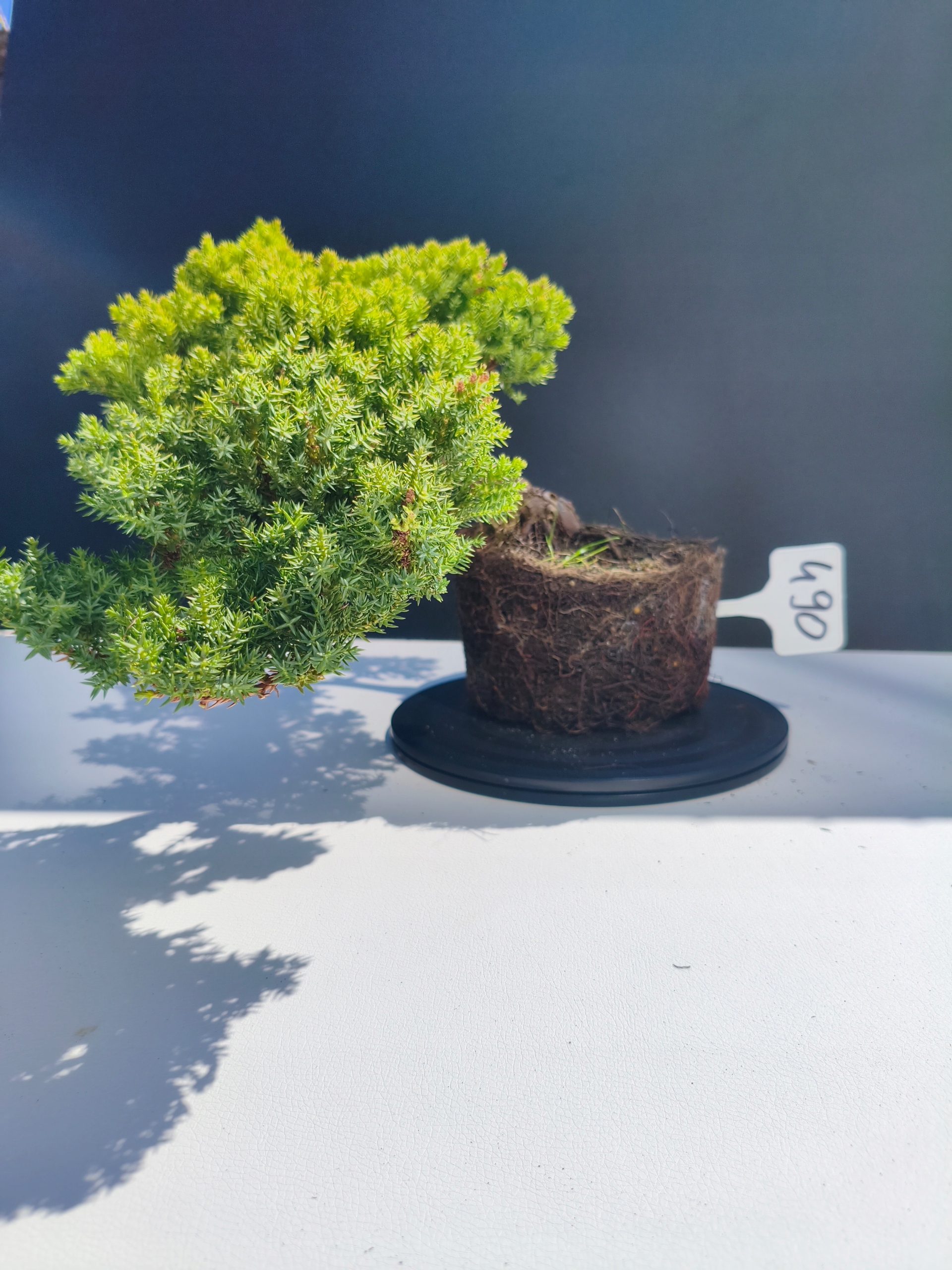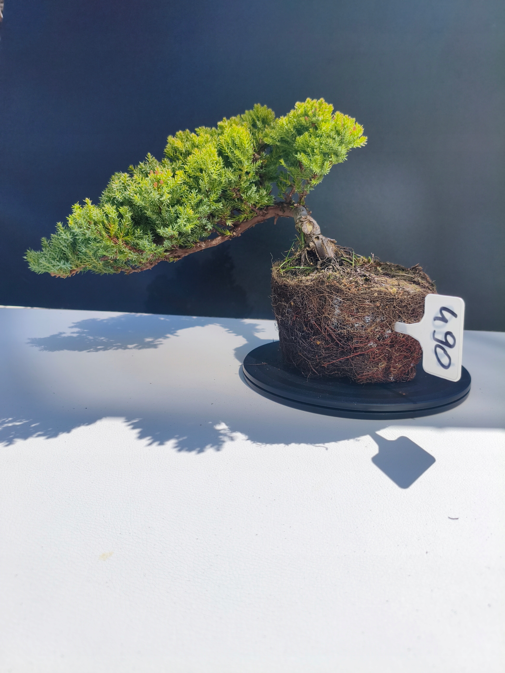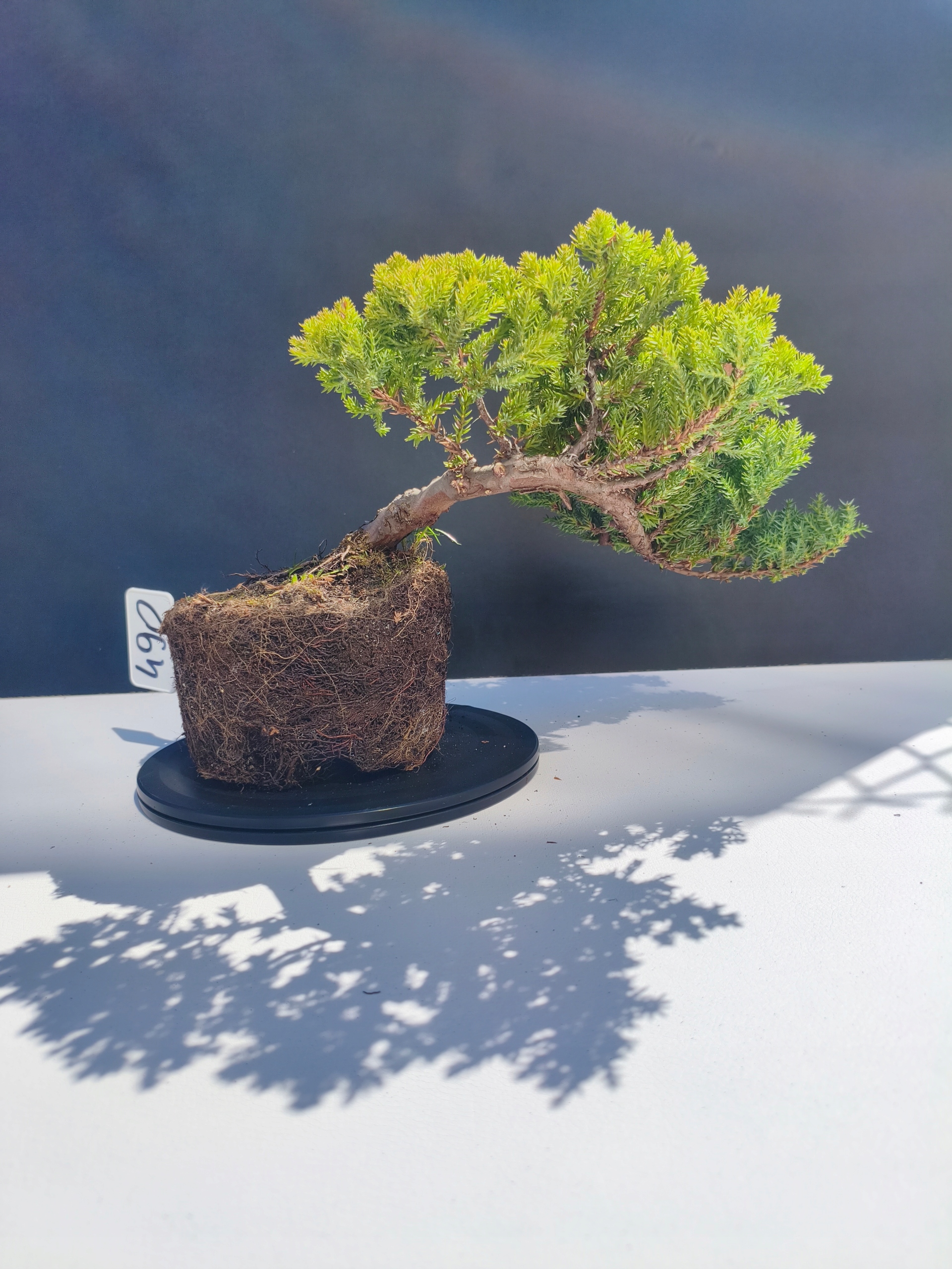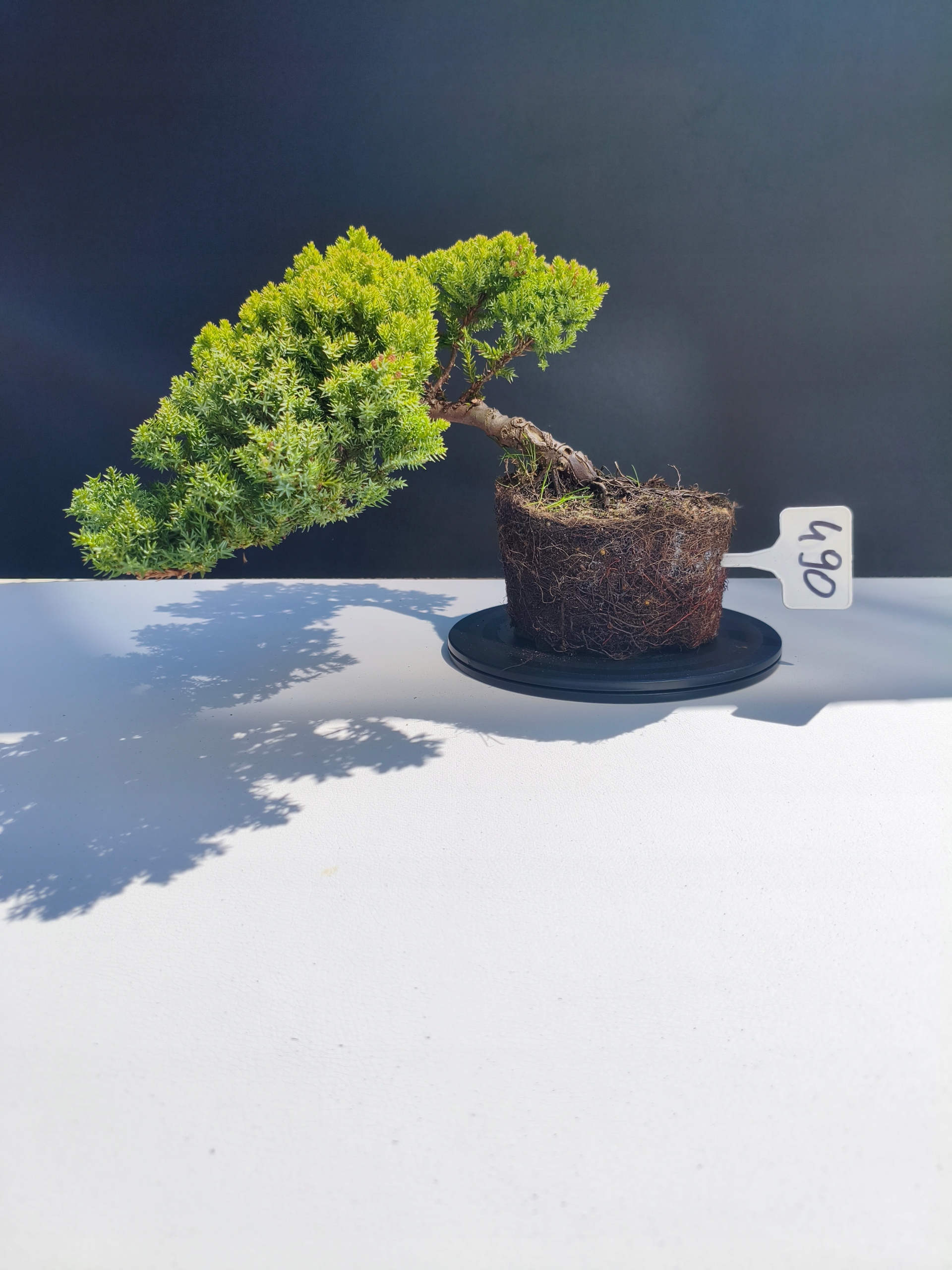 Każde nasze drzewko bonsai to unikalny egzemplarz, dlatego każde zostaje wystawione osobno, ponieważ traktujemy każde indywidualnie – od formowania po pielęgnację. Jałowce te są w naszych rękach od 2021 roku i obecnie mają już 11 lat, dzięki czemu prezentują się wyjątkowo dojrzale i stabilnie.