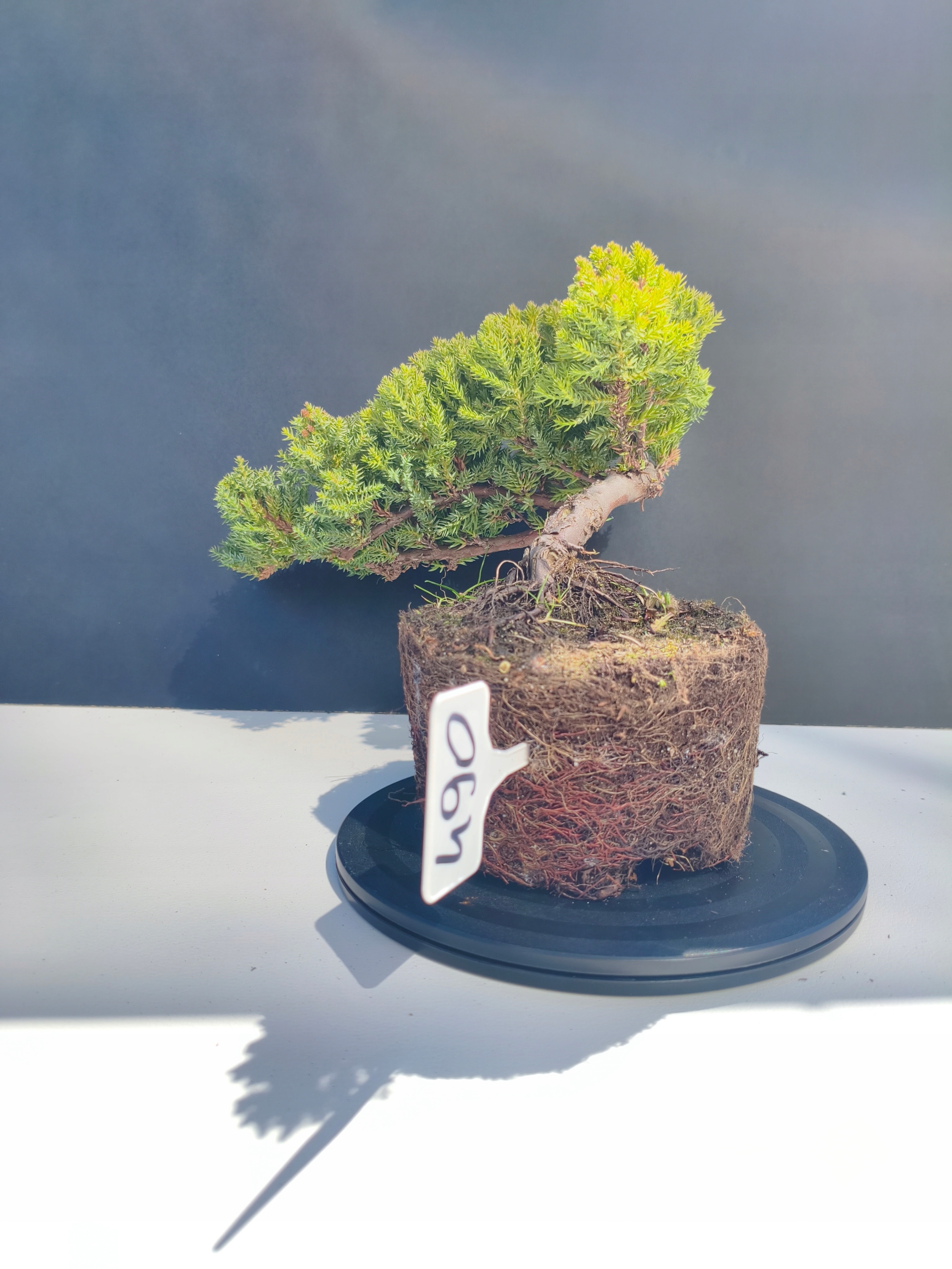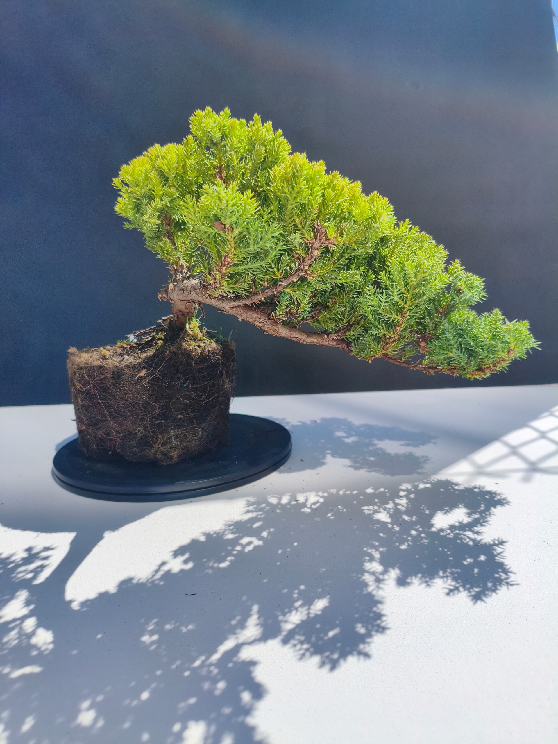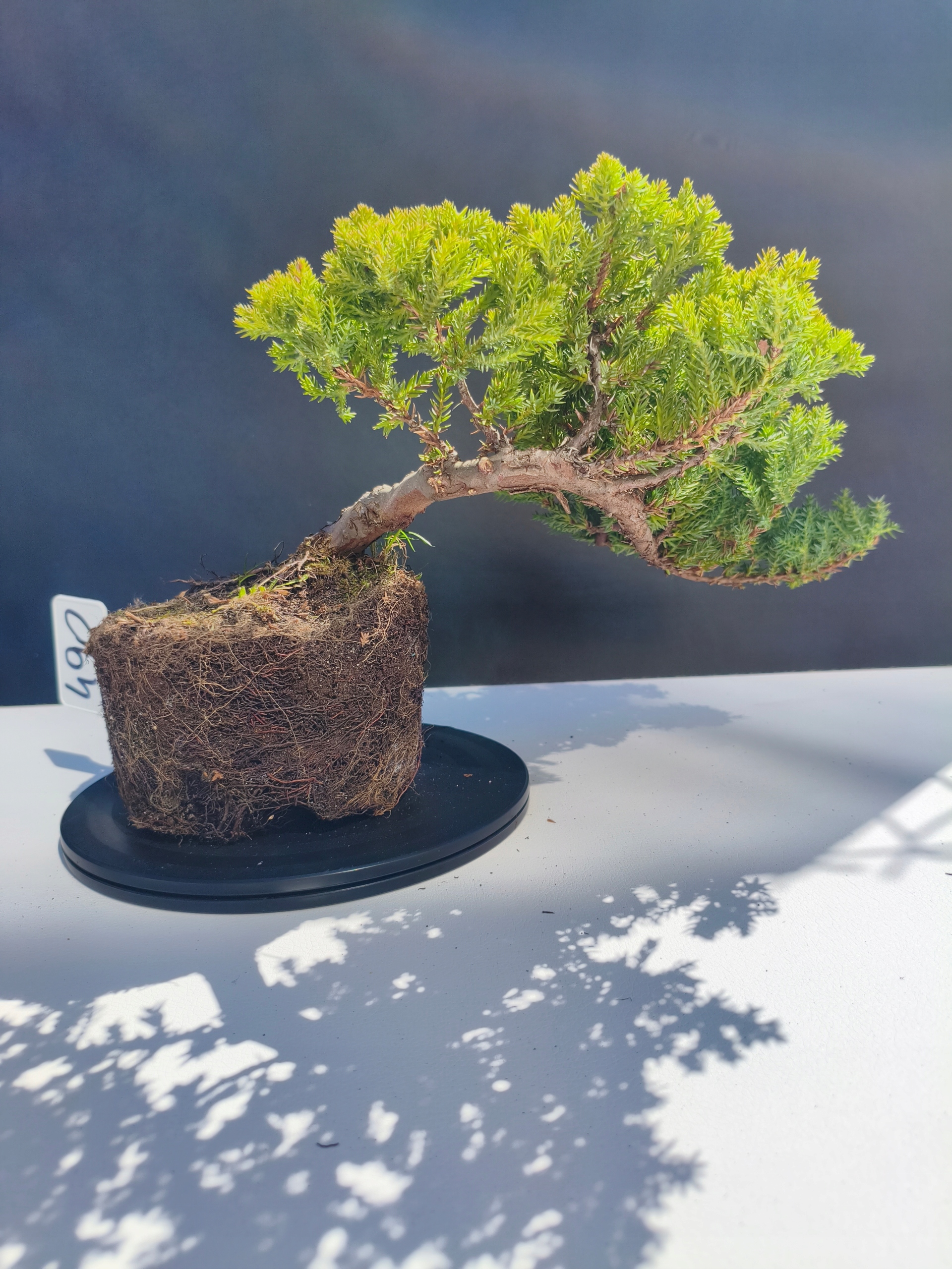 Każde nasze drzewko bonsai to unikalny egzemplarz, dlatego każde zostaje wystawione osobno, ponieważ traktujemy każde indywidualnie – od formowania po pielęgnację. Jałowce te są w naszych rękach od 2021 roku i obecnie mają już 11 lat, dzięki czemu prezentują się wyjątkowo dojrzale i stabilnie.