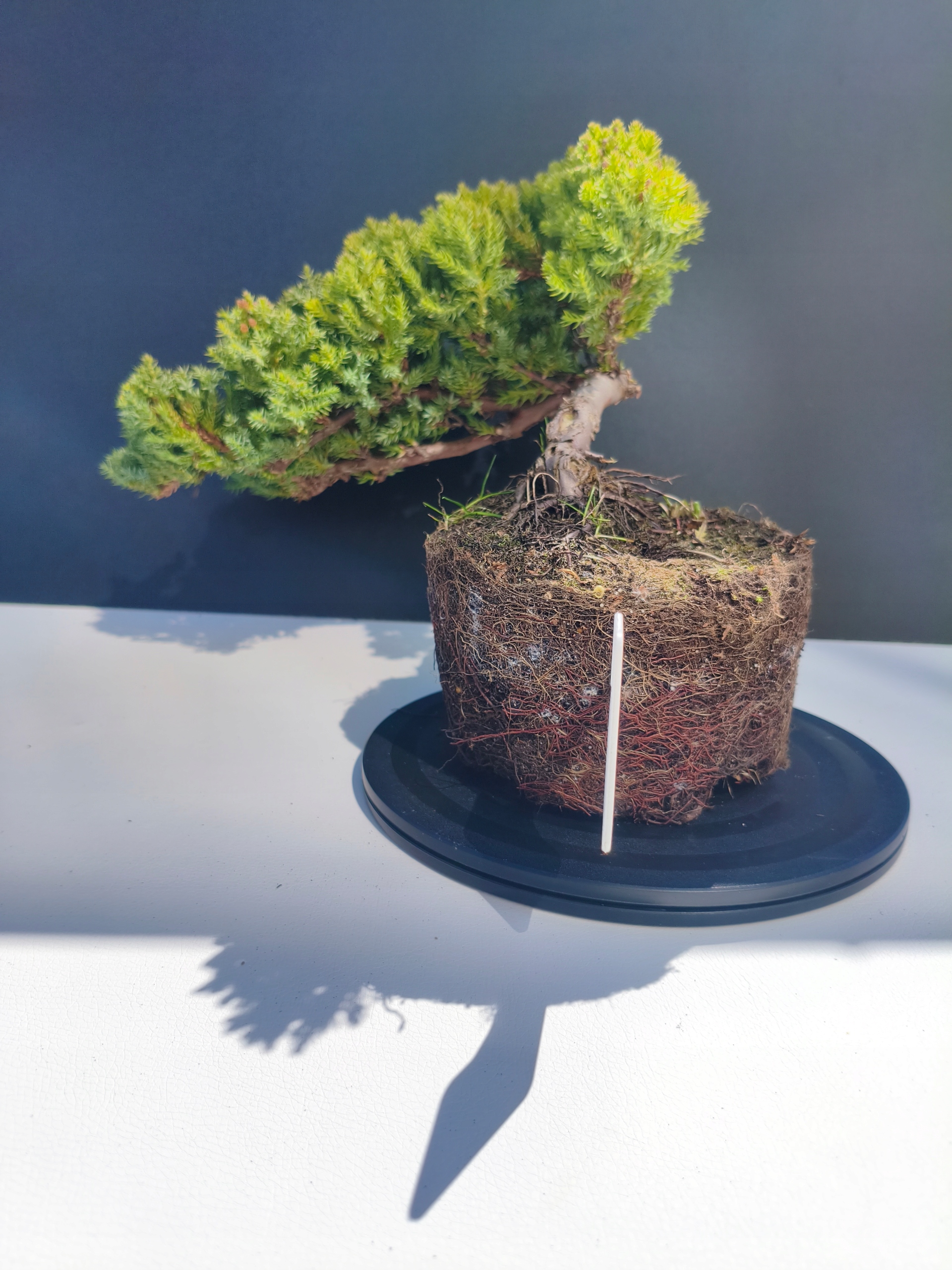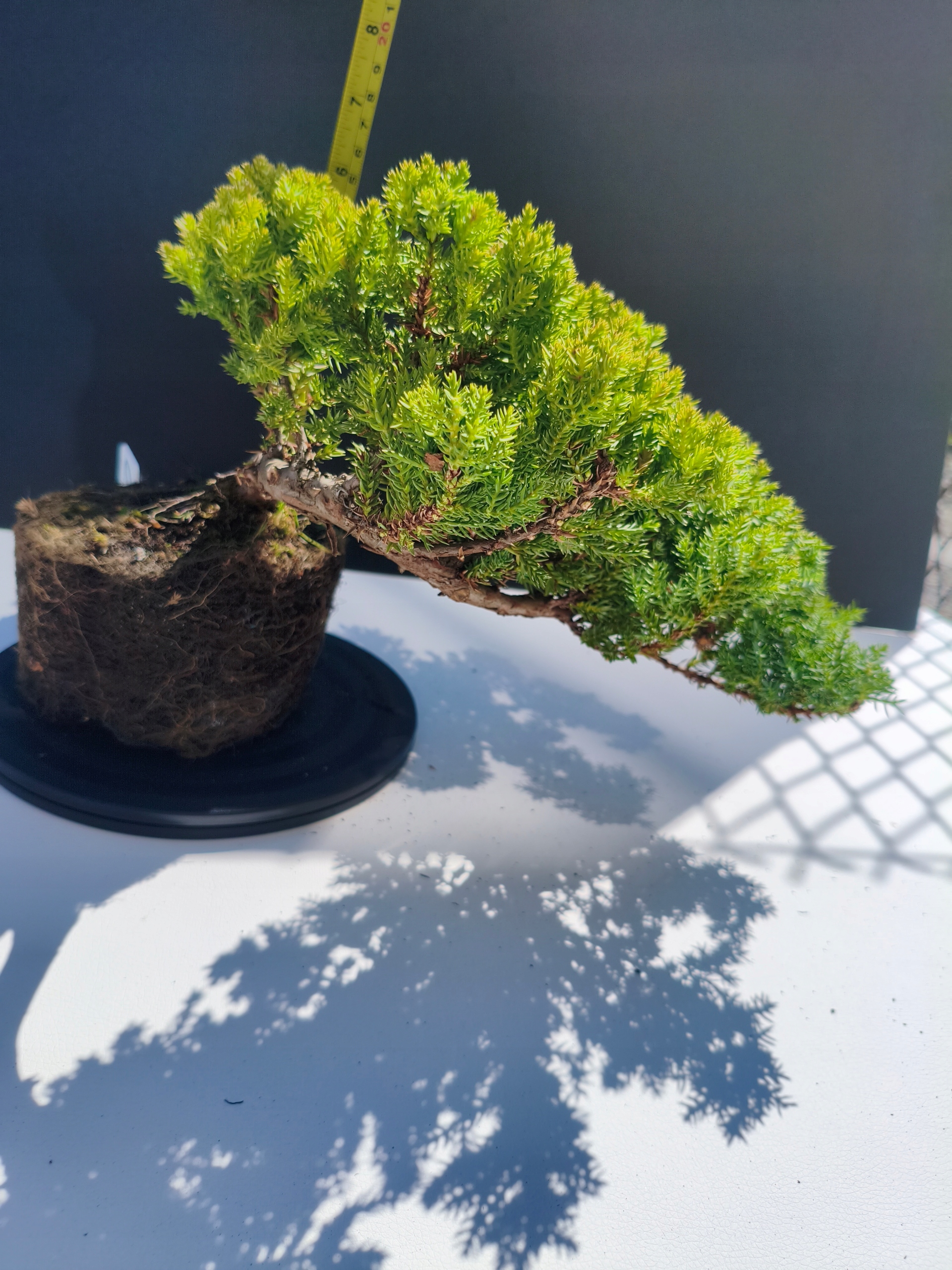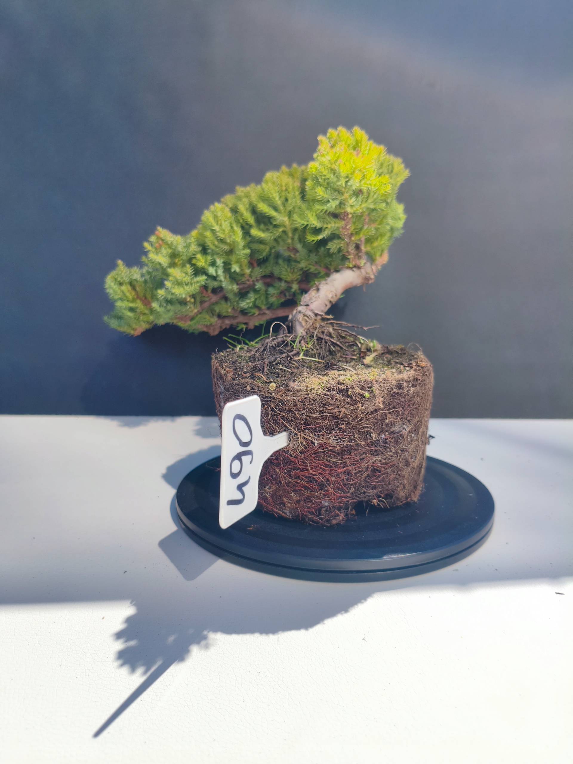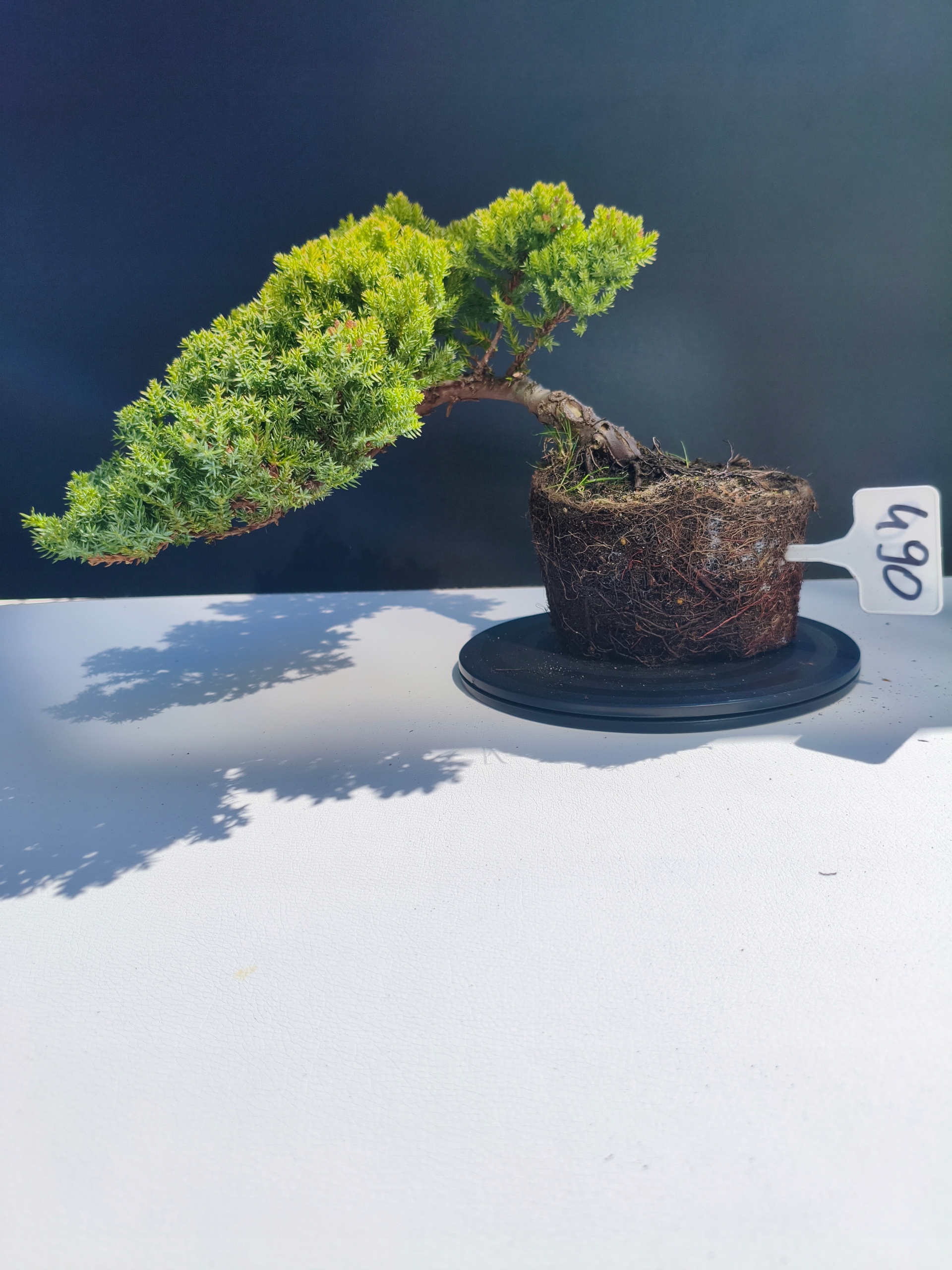 Każde nasze drzewko bonsai to unikalny egzemplarz, dlatego każde zostaje wystawione osobno, ponieważ traktujemy każde indywidualnie – od formowania po pielęgnację. Jałowce te są w naszych rękach od 2021 roku i obecnie mają już 11 lat, dzięki czemu prezentują się wyjątkowo dojrzale i stabilnie.