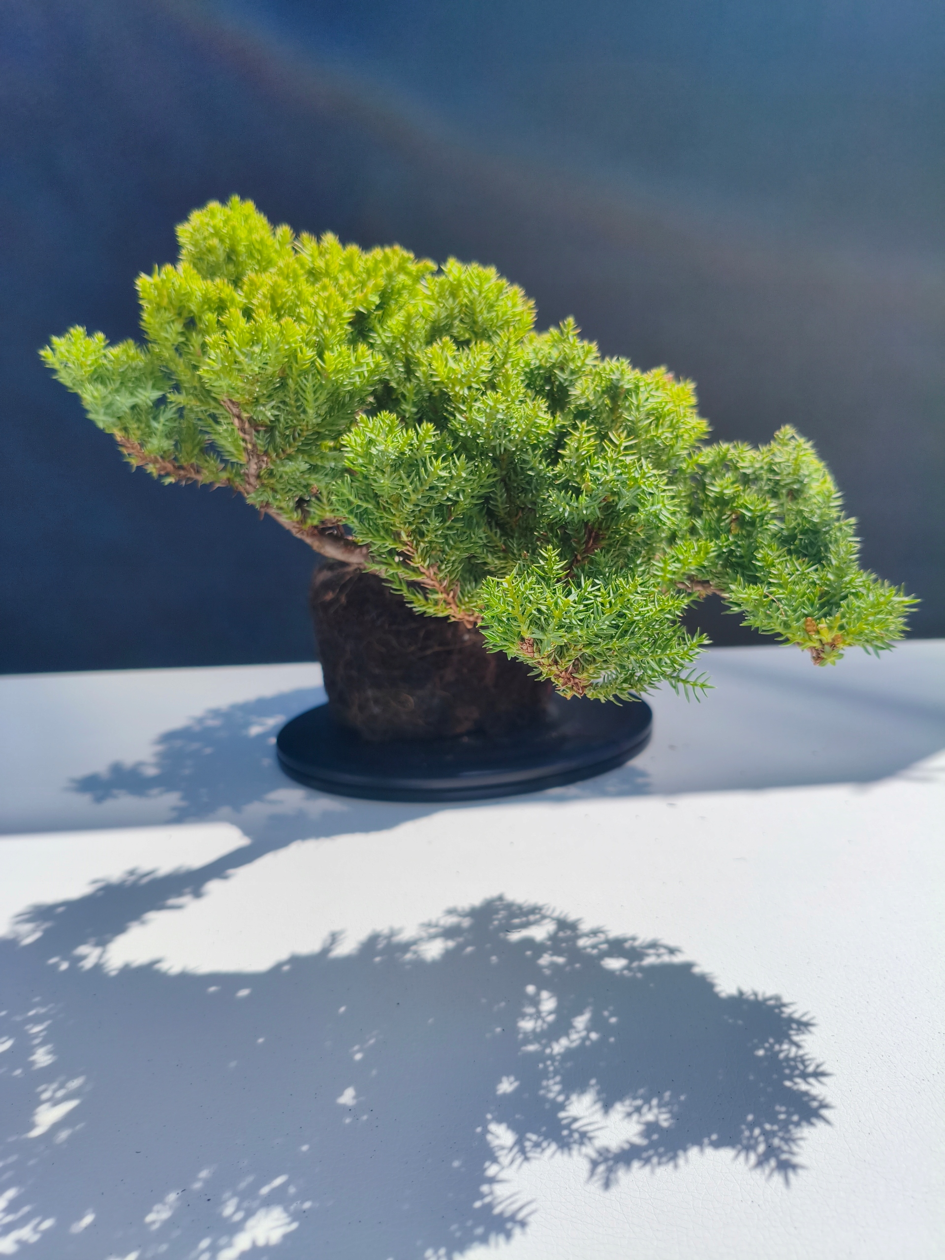 Jałowiec (Juniperus procumbens) to klasyczne bonsai z rodziny zimozielonych – zachowuje igły przez cały rok, nawet zimą. Dzięki temu cieszy oko niezależnie od pory roku, prezentując się elegancko i stabilnie przez cały sezon.