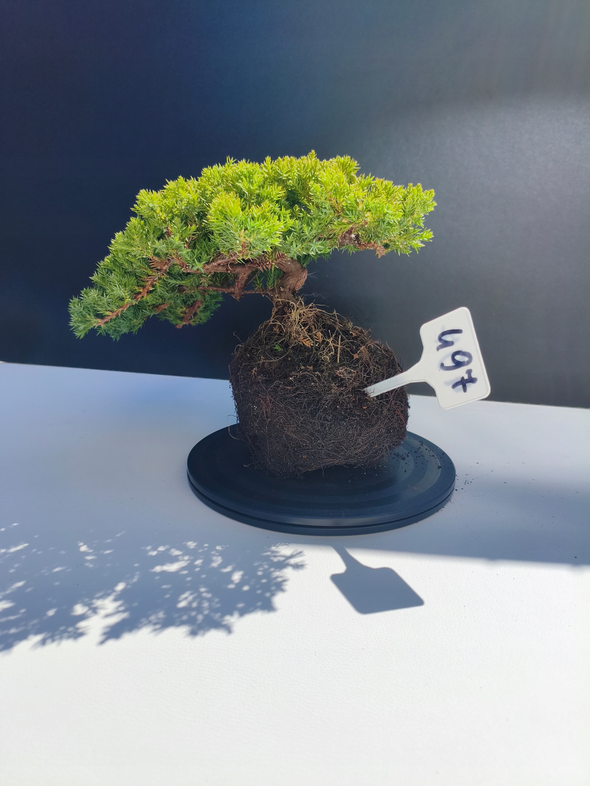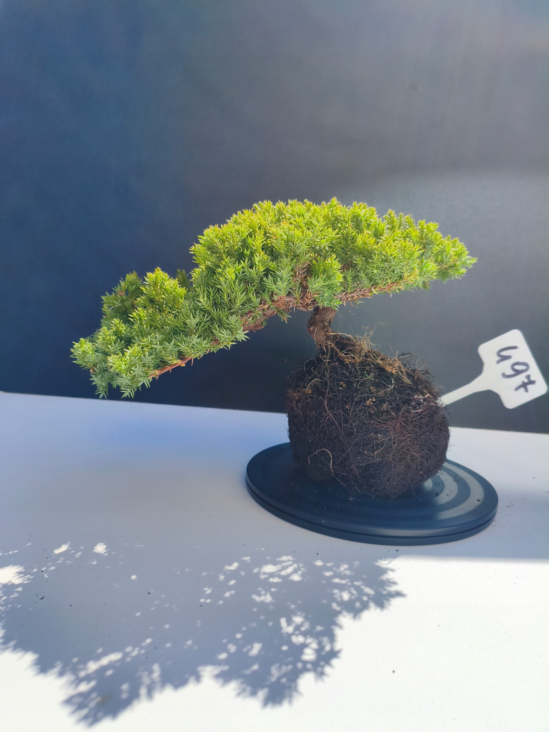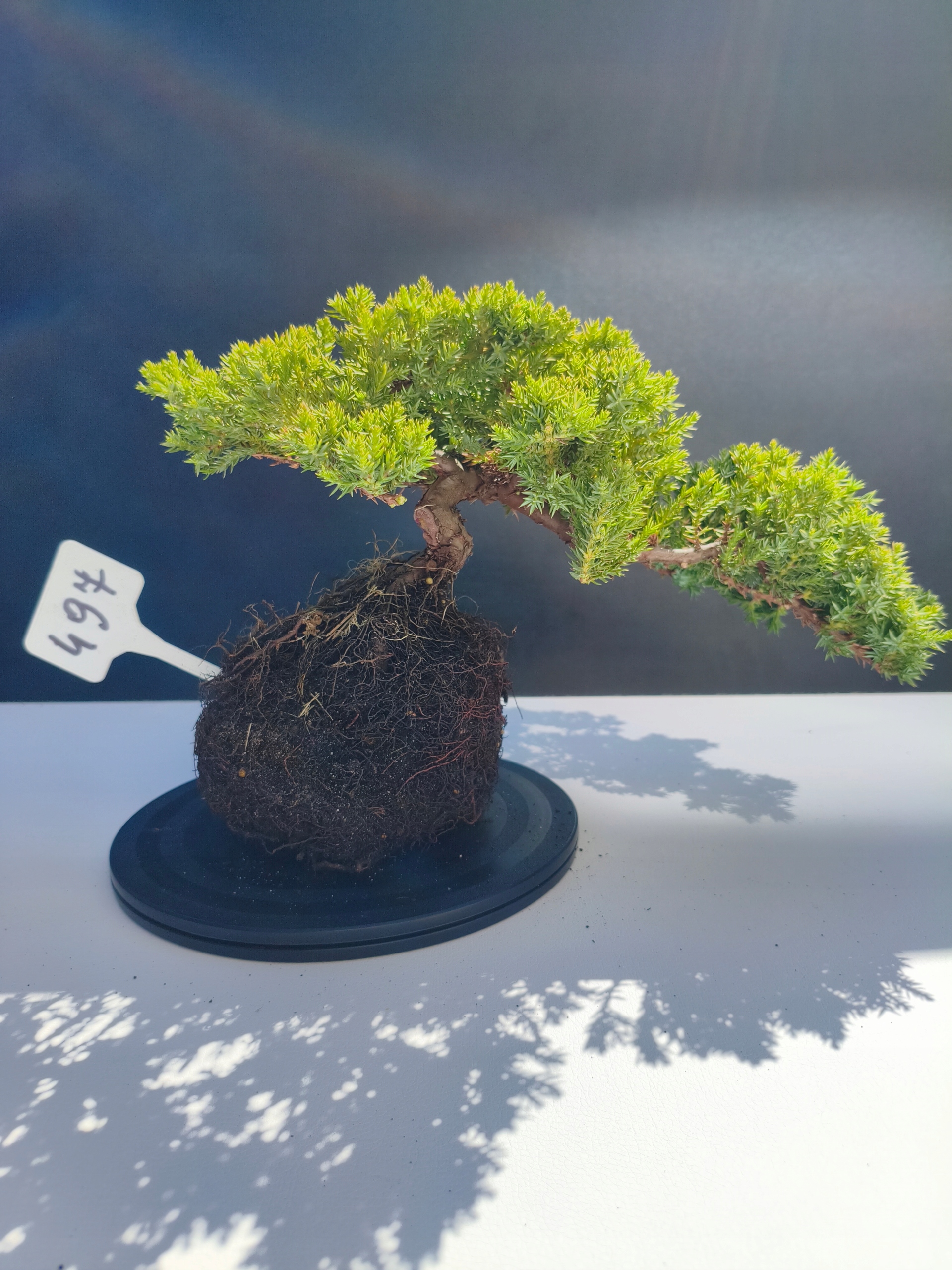 Każde nasze drzewko bonsai to unikalny egzemplarz, dlatego każde zostaje wystawione osobno, ponieważ traktujemy każde indywidualnie – od formowania po pielęgnację. Jałowce te są w naszych rękach od 2021 roku i obecnie mają już 11 lat, dzięki czemu prezentują się wyjątkowo dojrzale i stabilnie.