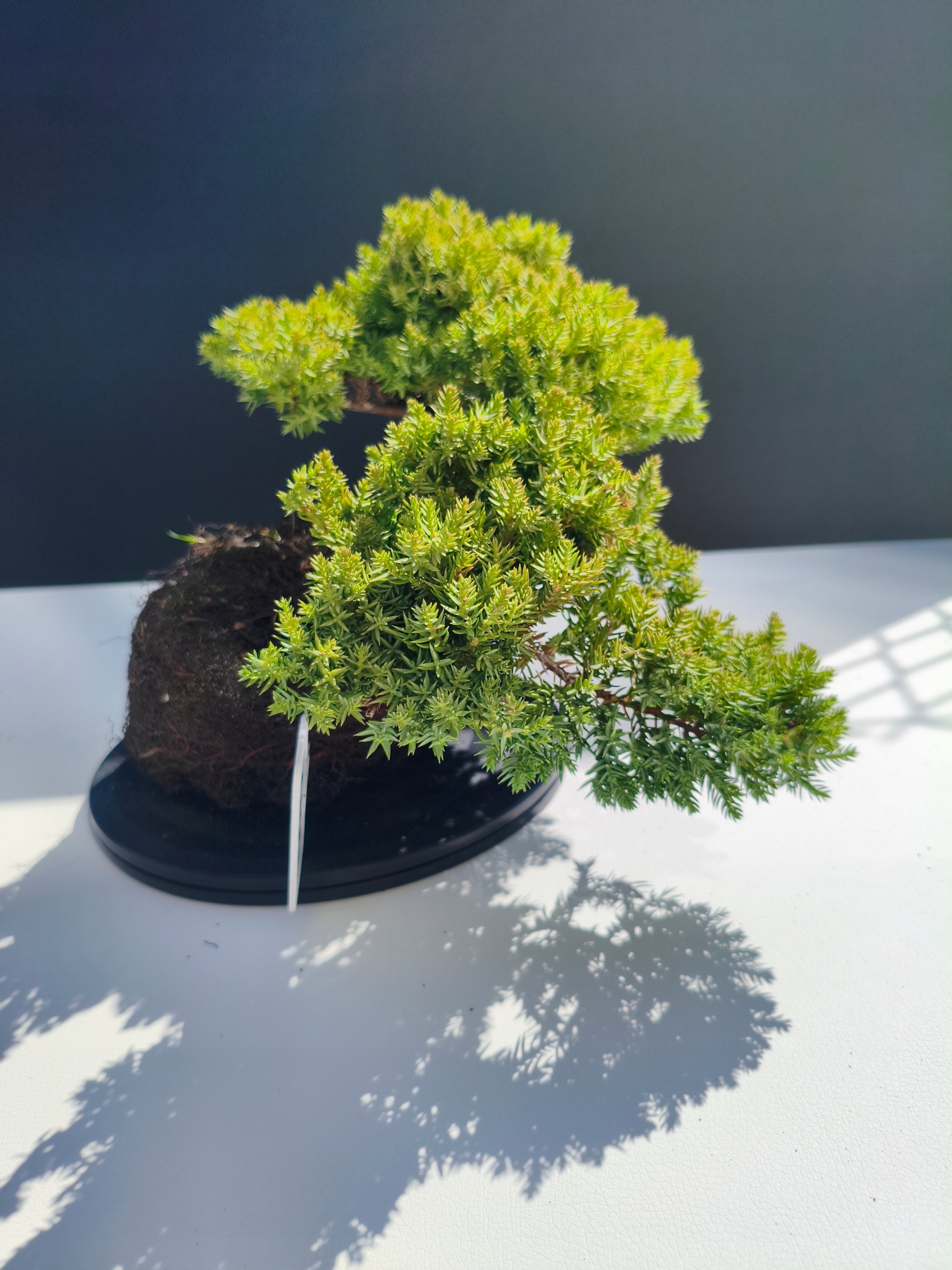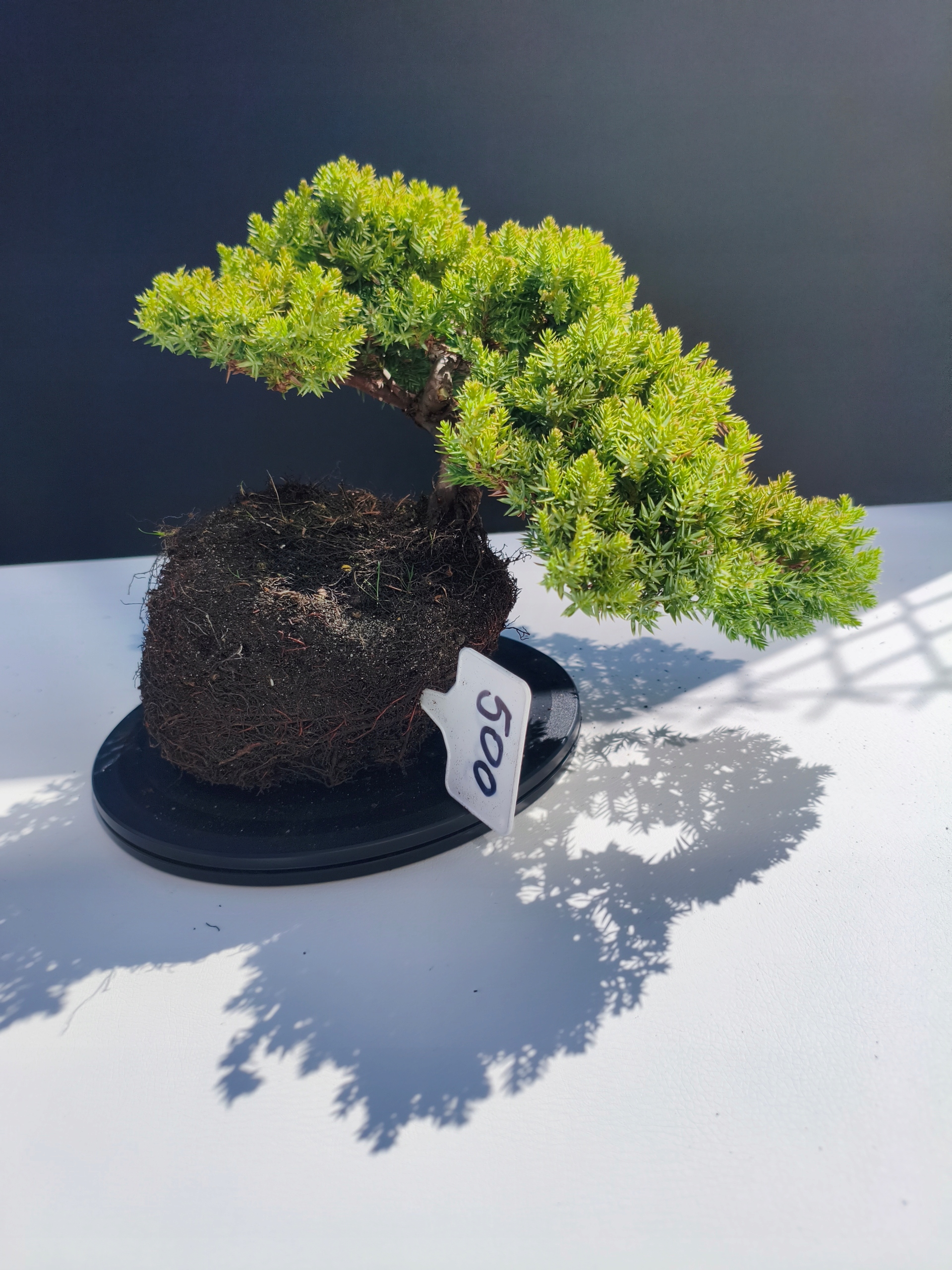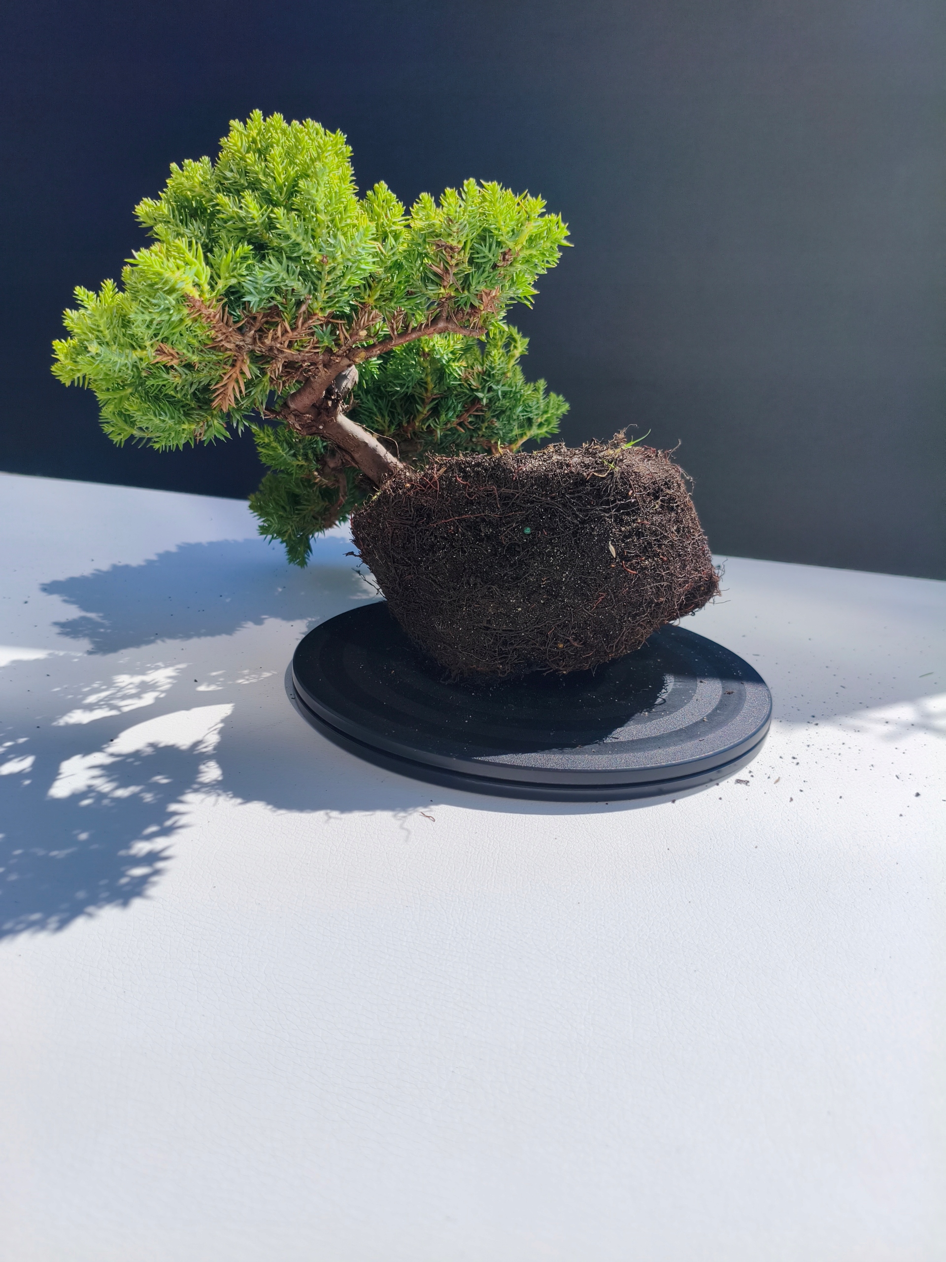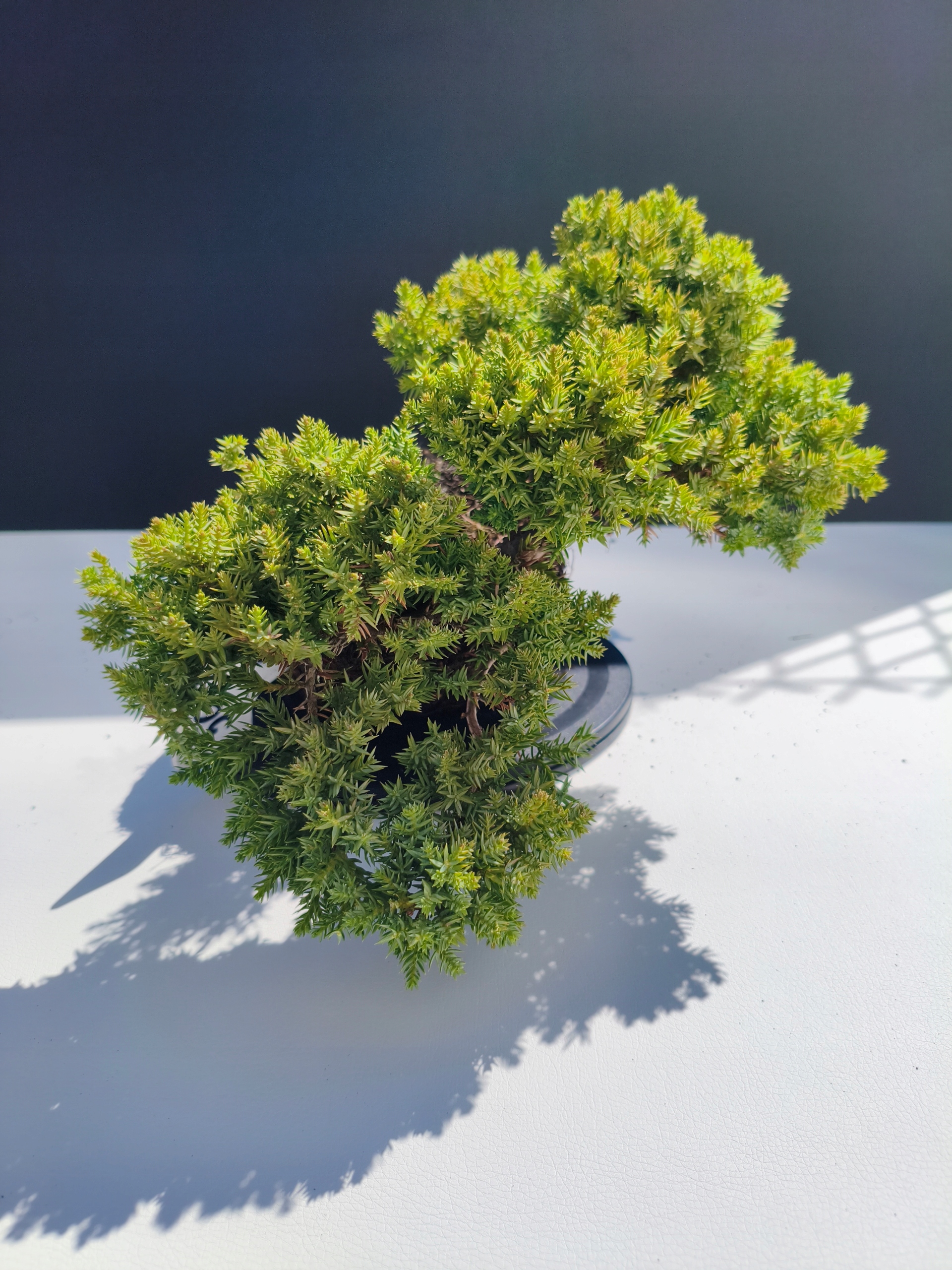 Każde nasze drzewko bonsai to unikalny egzemplarz, dlatego każde zostaje wystawione osobno, ponieważ traktujemy każde indywidualnie – od formowania po pielęgnację. Jałowce te są w naszych rękach od 2021 roku i obecnie mają już 11 lat, dzięki czemu prezentują się wyjątkowo dojrzale i stabilnie.
