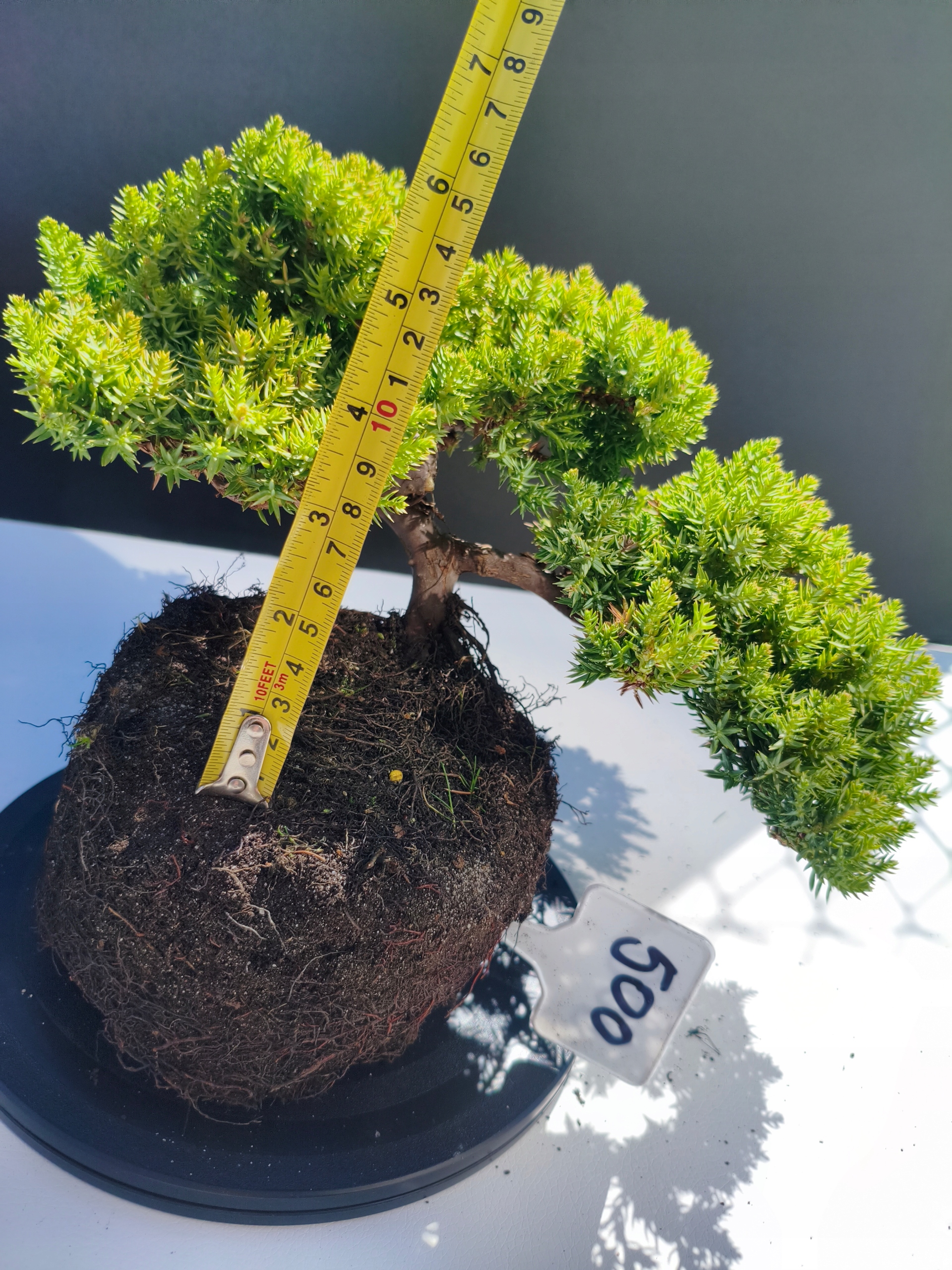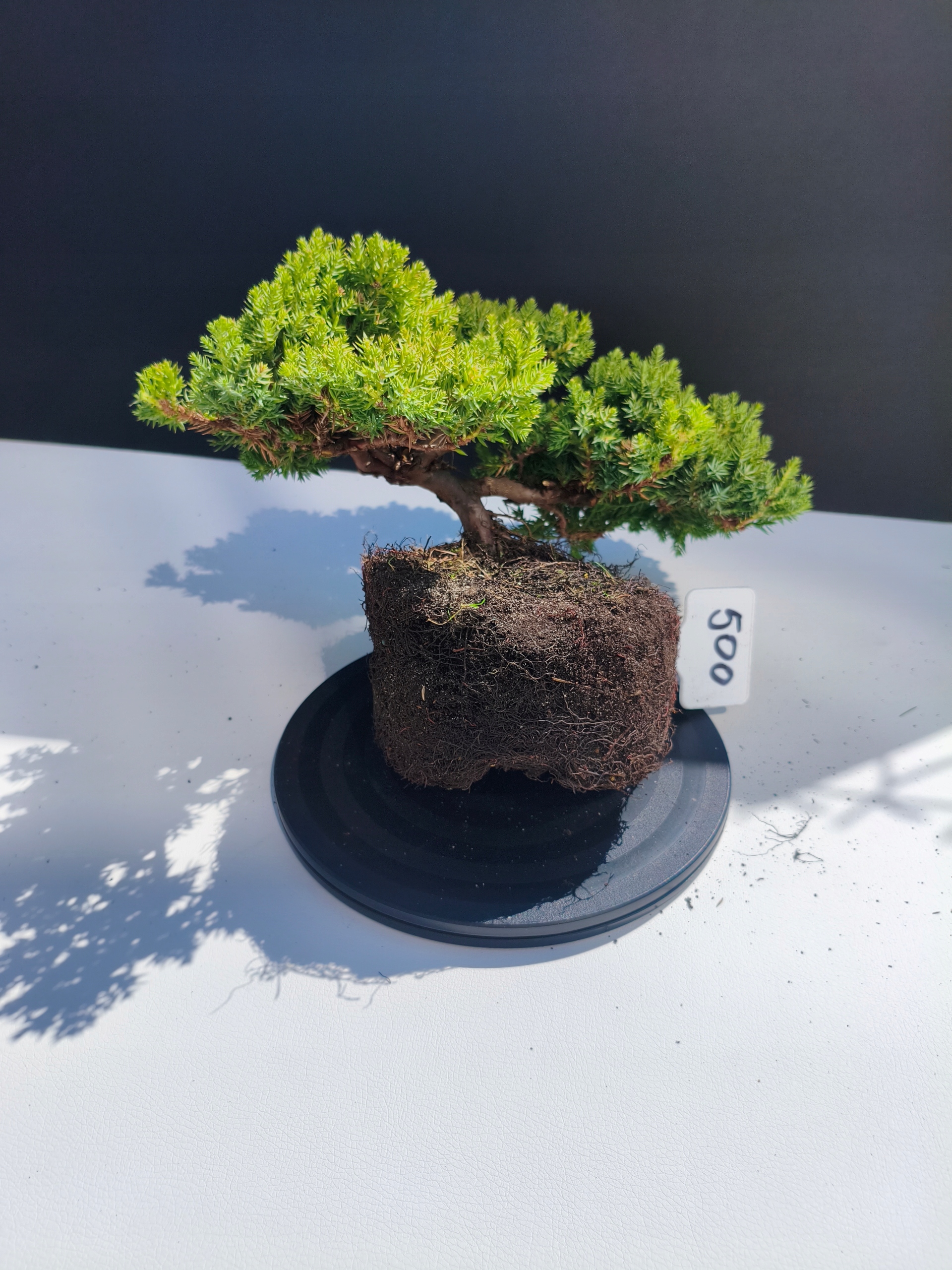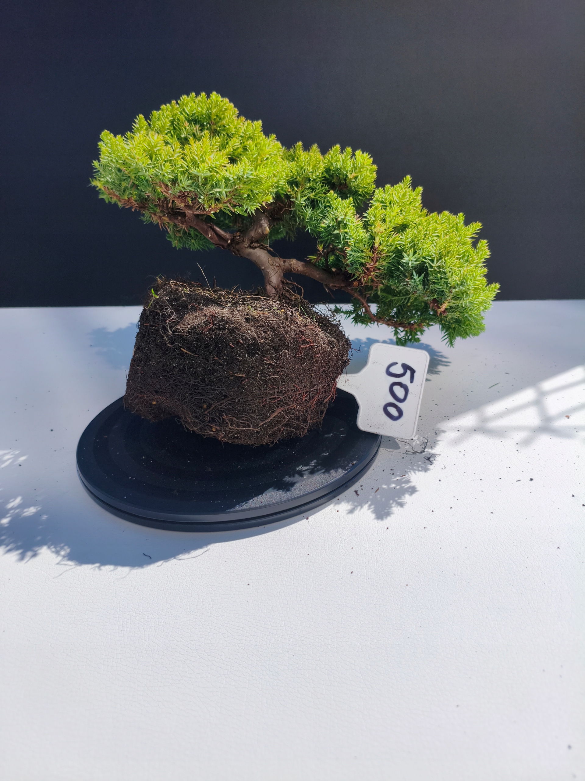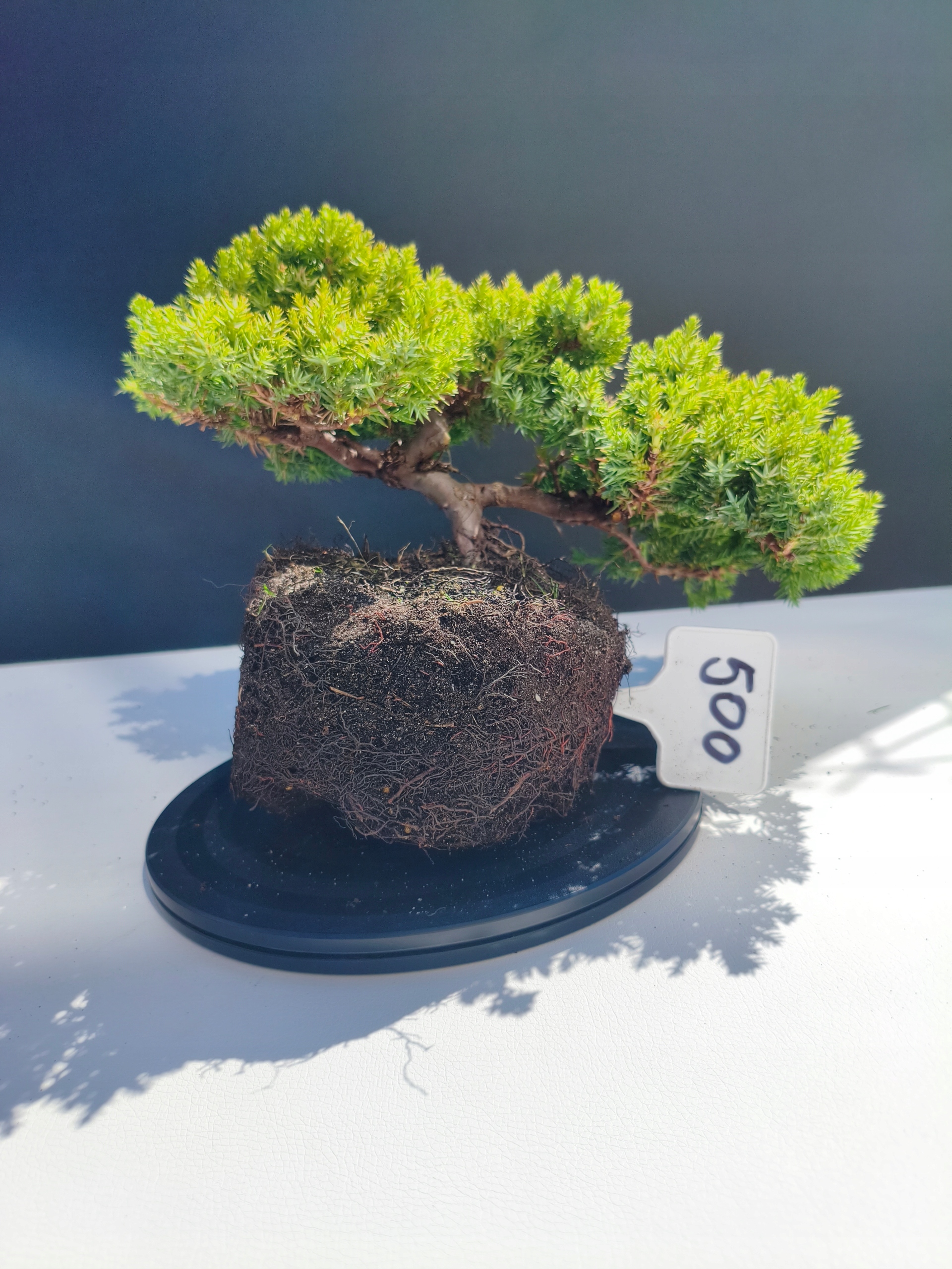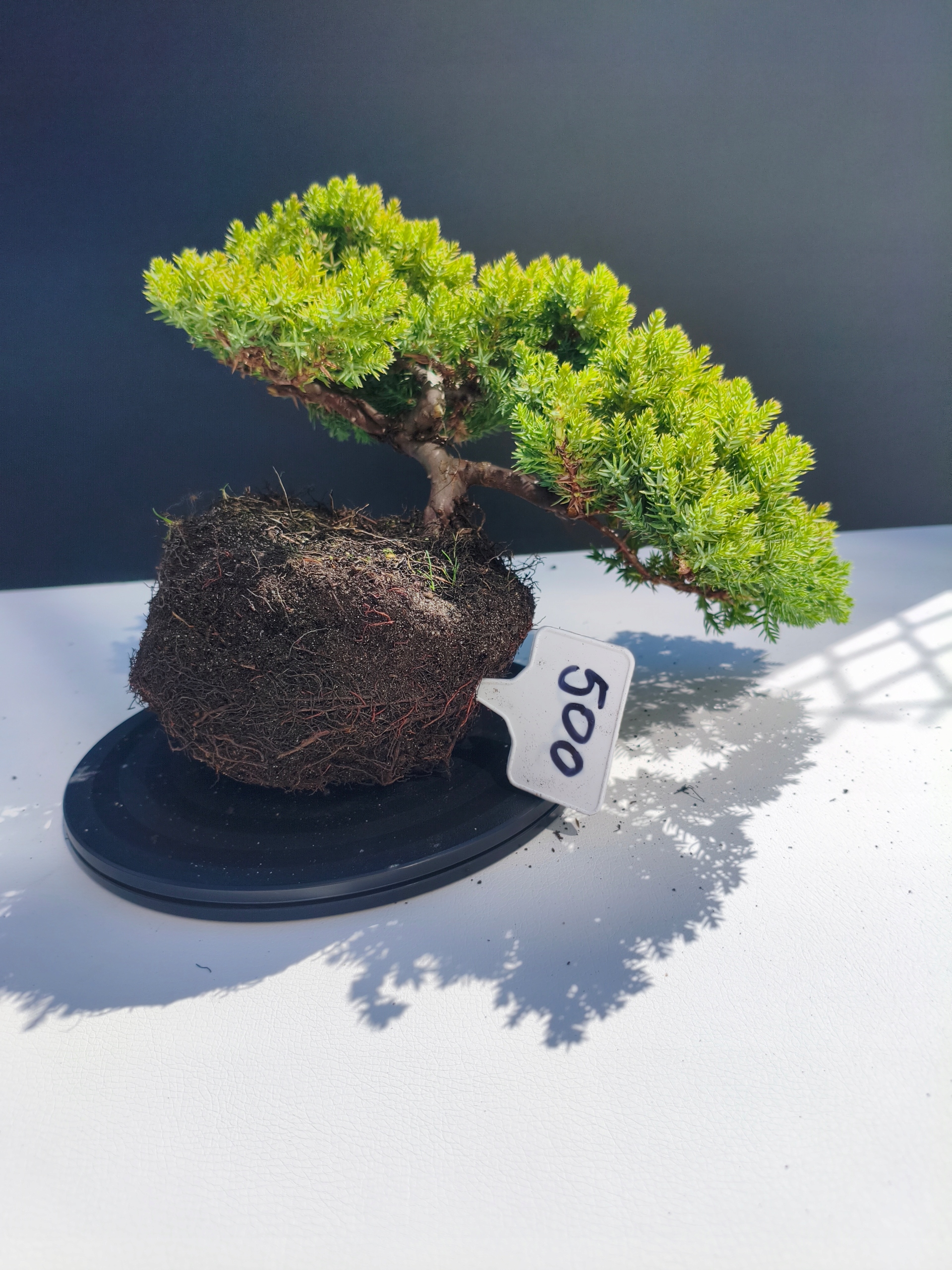 Każde nasze drzewko bonsai to unikalny egzemplarz, dlatego każde zostaje wystawione osobno, ponieważ traktujemy każde indywidualnie – od formowania po pielęgnację. Jałowce te są w naszych rękach od 2021 roku i obecnie mają już 11 lat, dzięki czemu prezentują się wyjątkowo dojrzale i stabilnie.