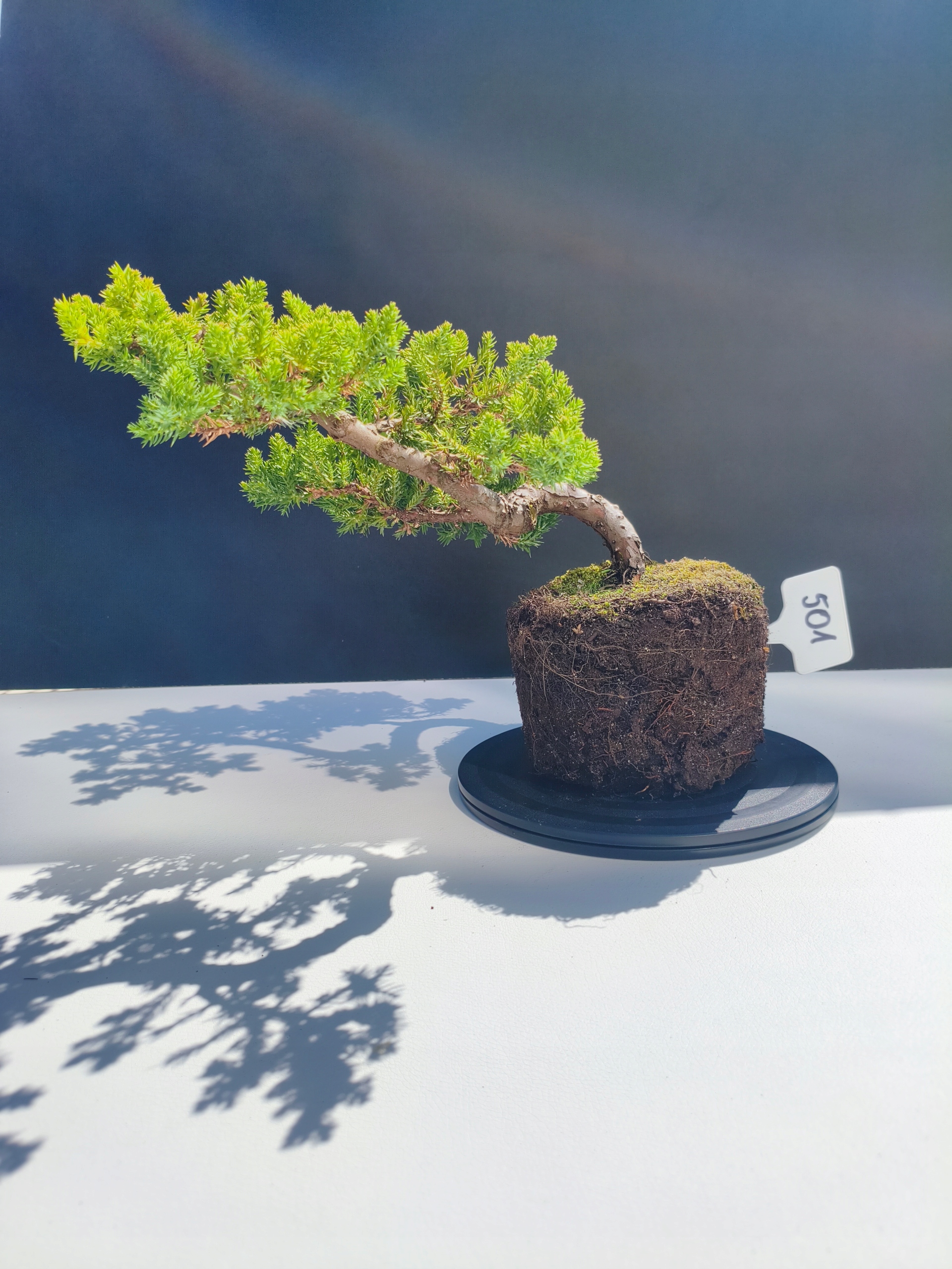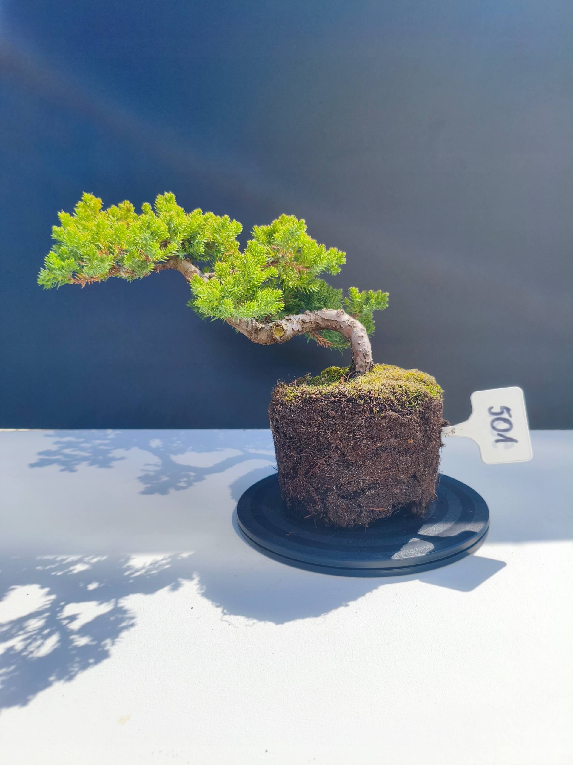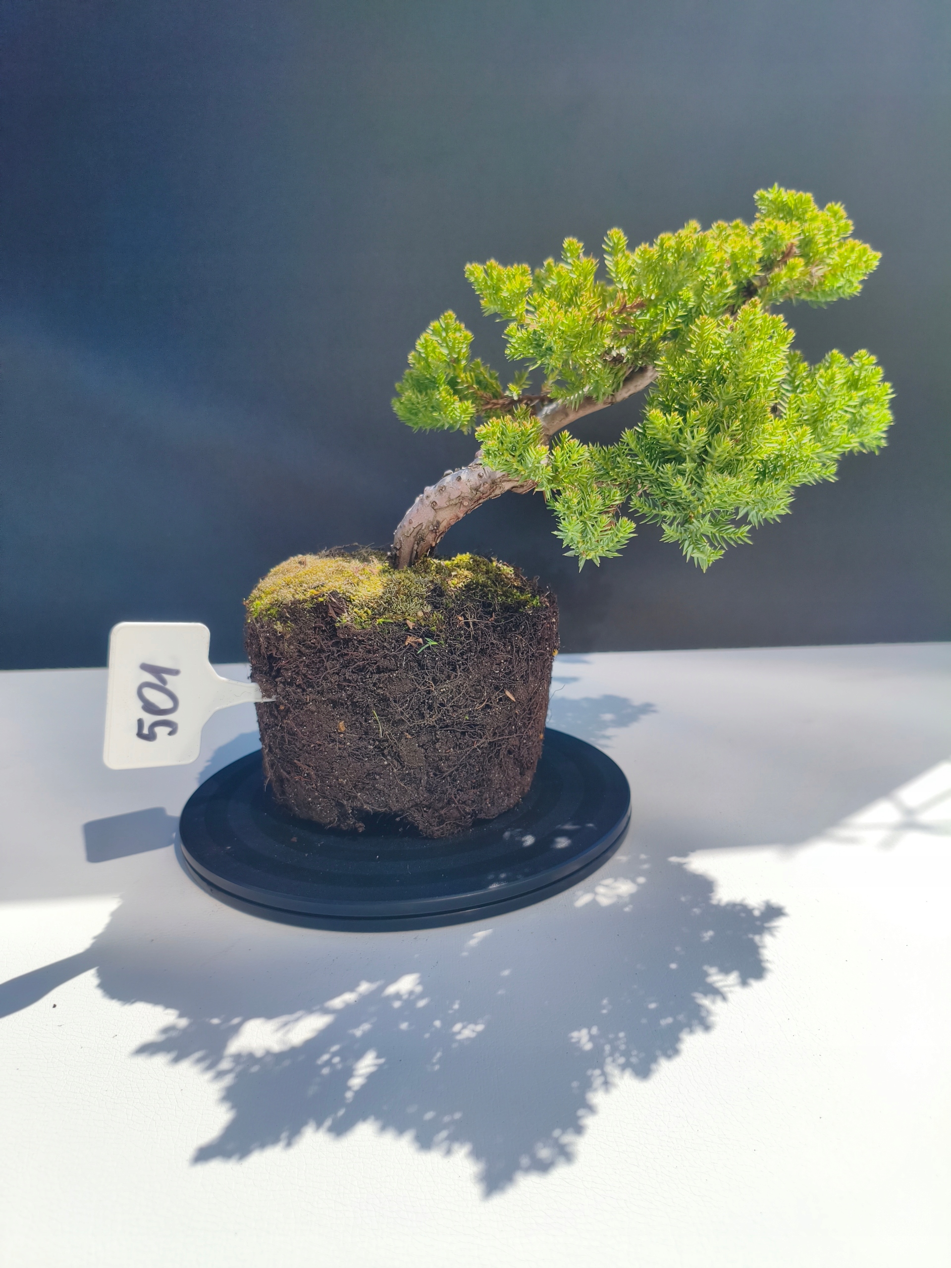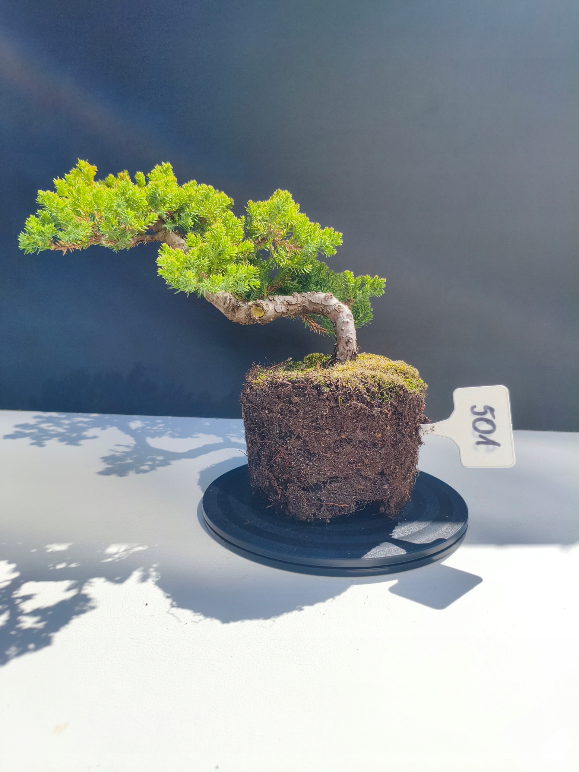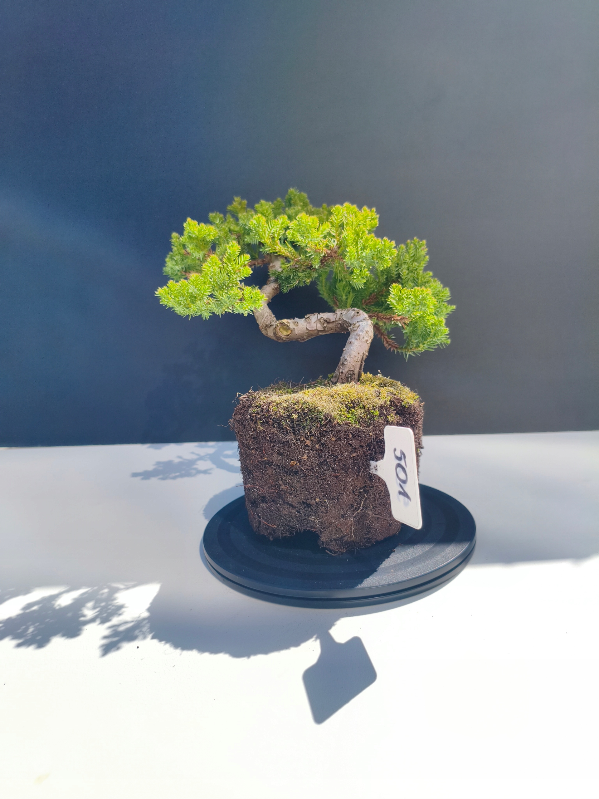 Każde nasze drzewko bonsai to unikalny egzemplarz, dlatego każde zostaje wystawione osobno, ponieważ traktujemy każde indywidualnie – od formowania po pielęgnację. Jałowce te są w naszych rękach od 2021 roku i obecnie mają już 11 lat, dzięki czemu prezentują się wyjątkowo dojrzale i stabilnie.