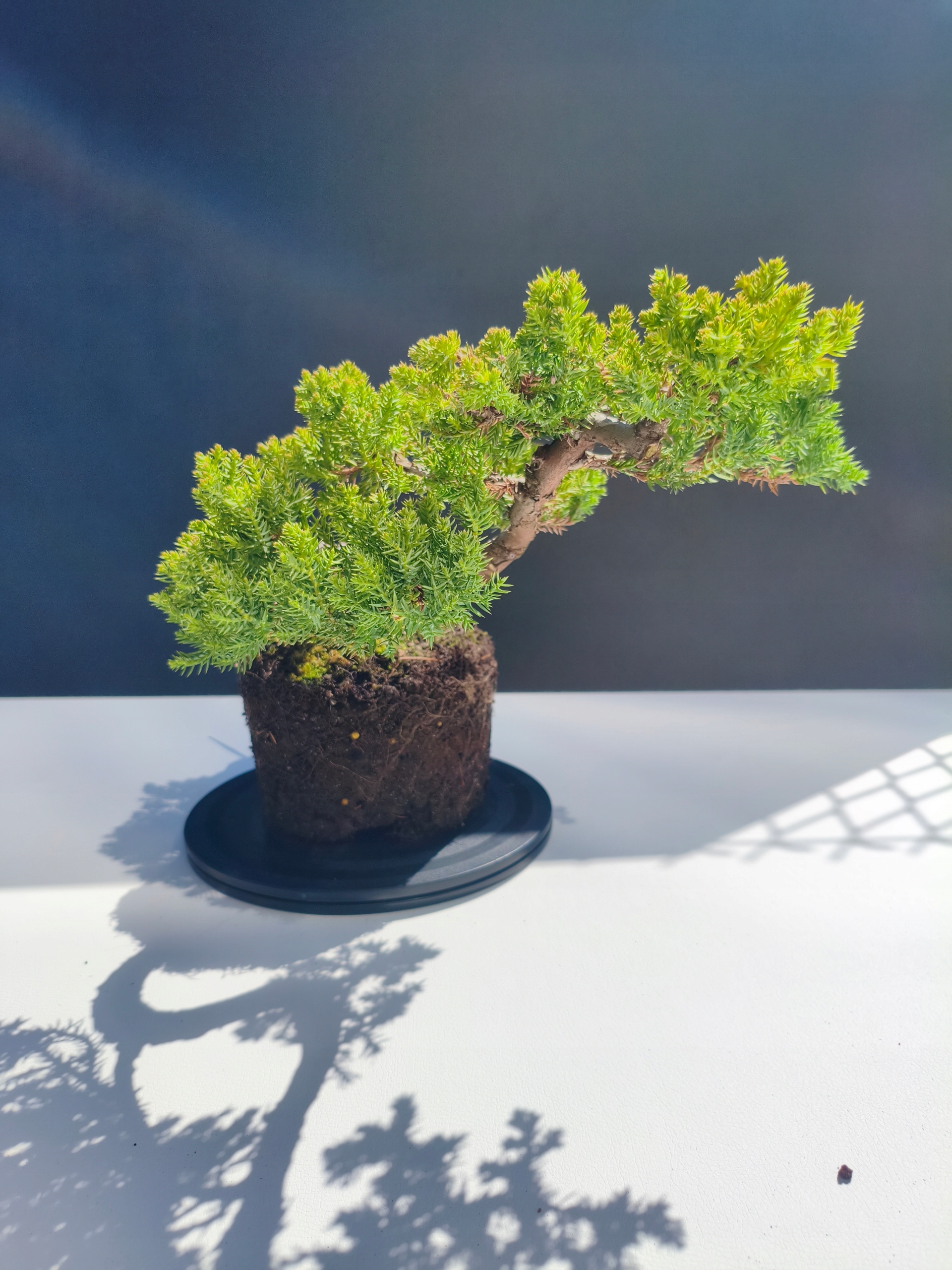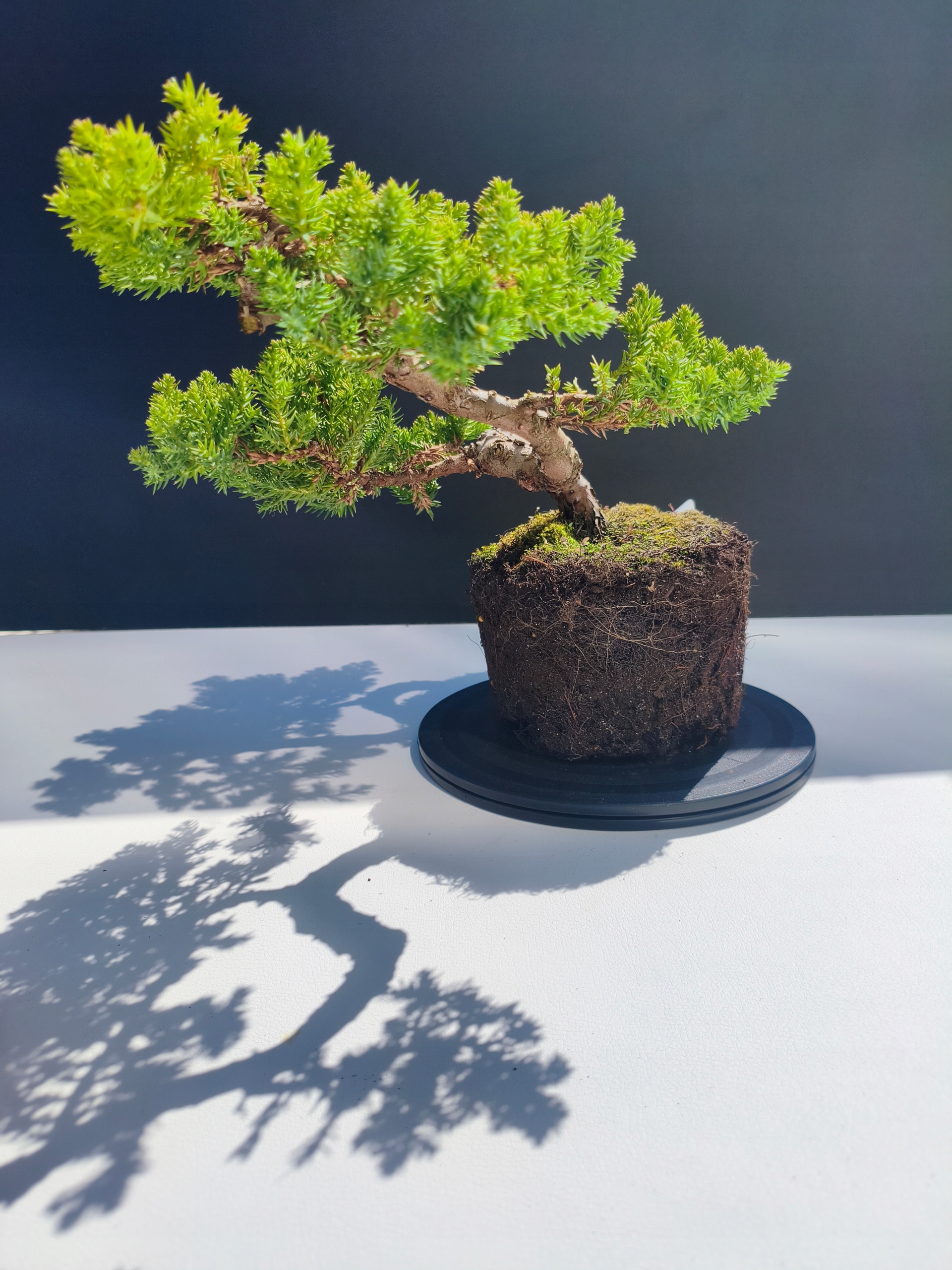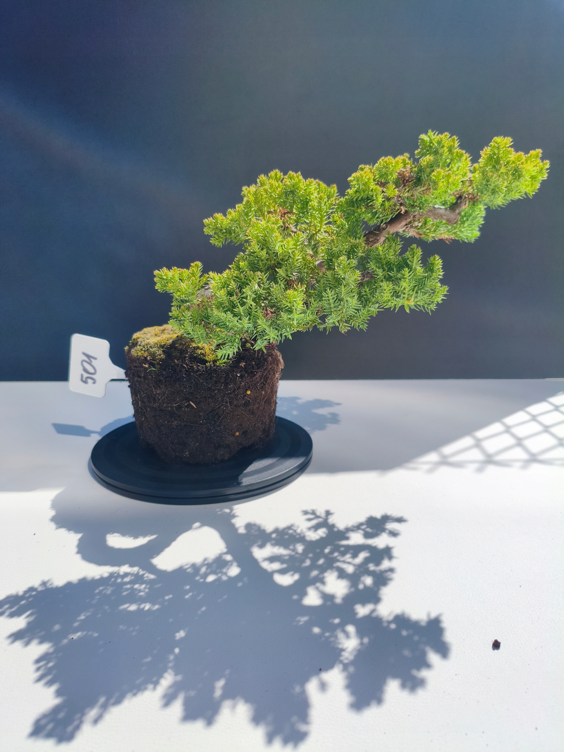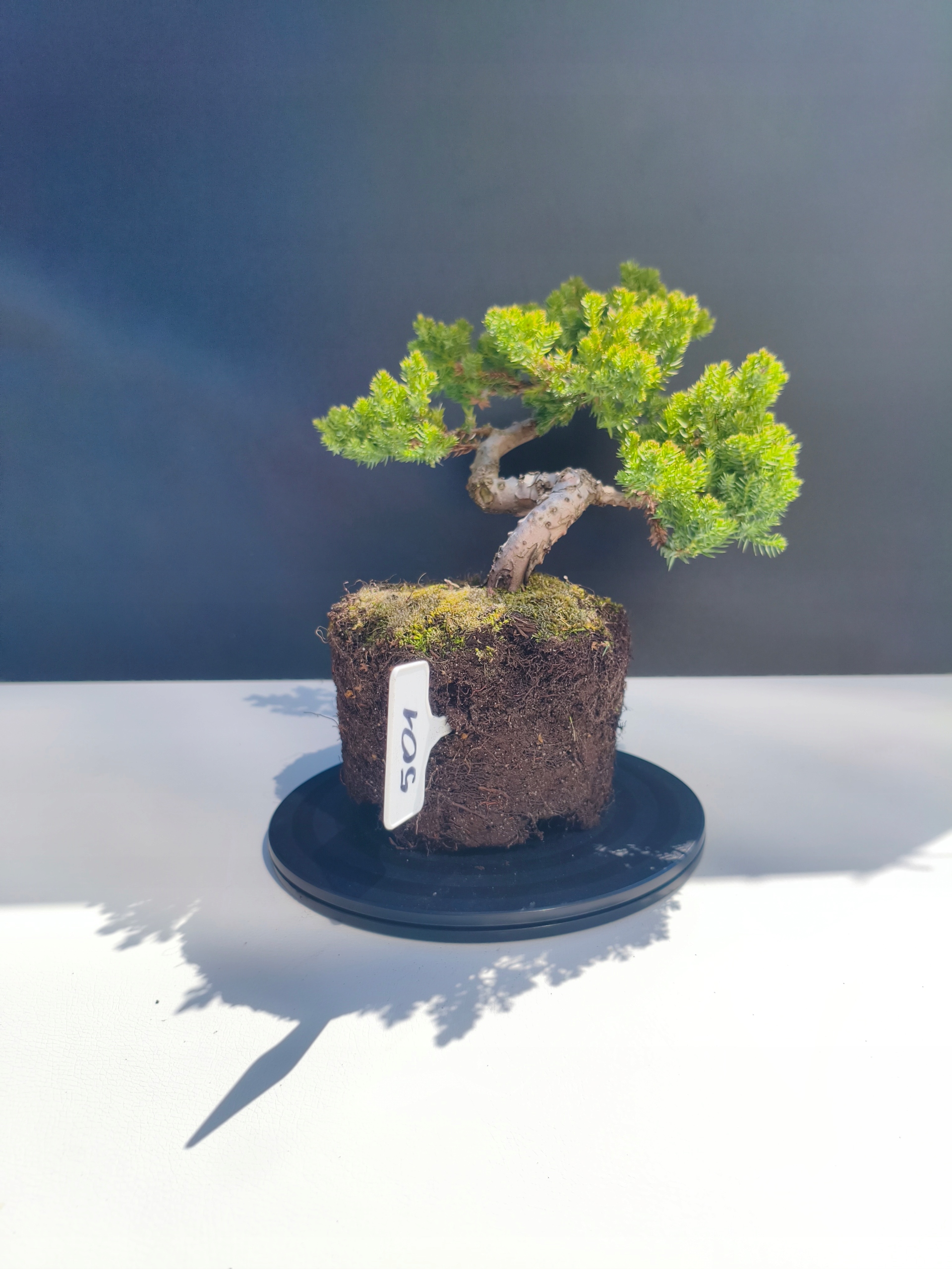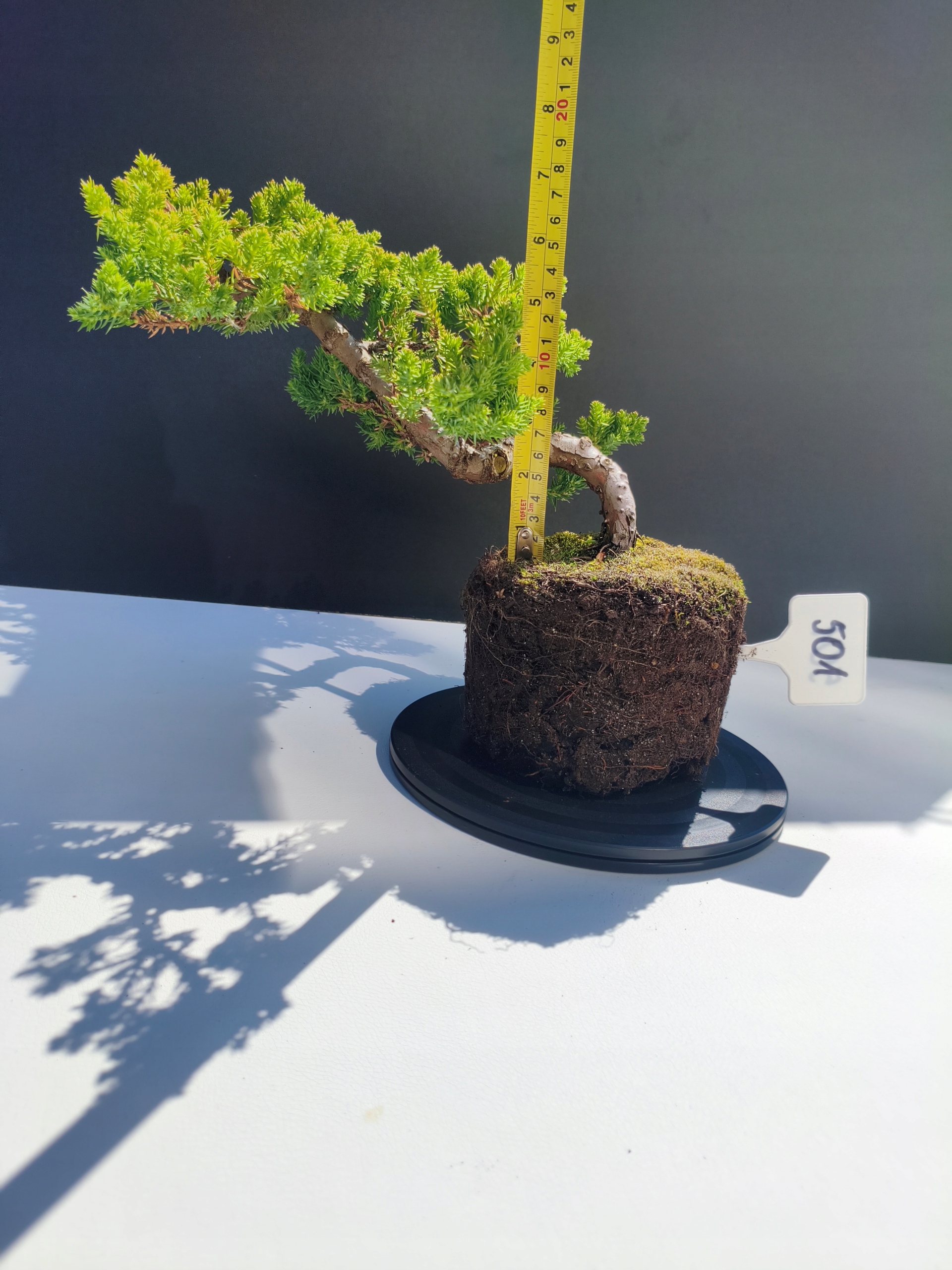 Każde nasze drzewko bonsai to unikalny egzemplarz, dlatego każde zostaje wystawione osobno, ponieważ traktujemy każde indywidualnie – od formowania po pielęgnację. Jałowce te są w naszych rękach od 2021 roku i obecnie mają już 11 lat, dzięki czemu prezentują się wyjątkowo dojrzale i stabilnie.