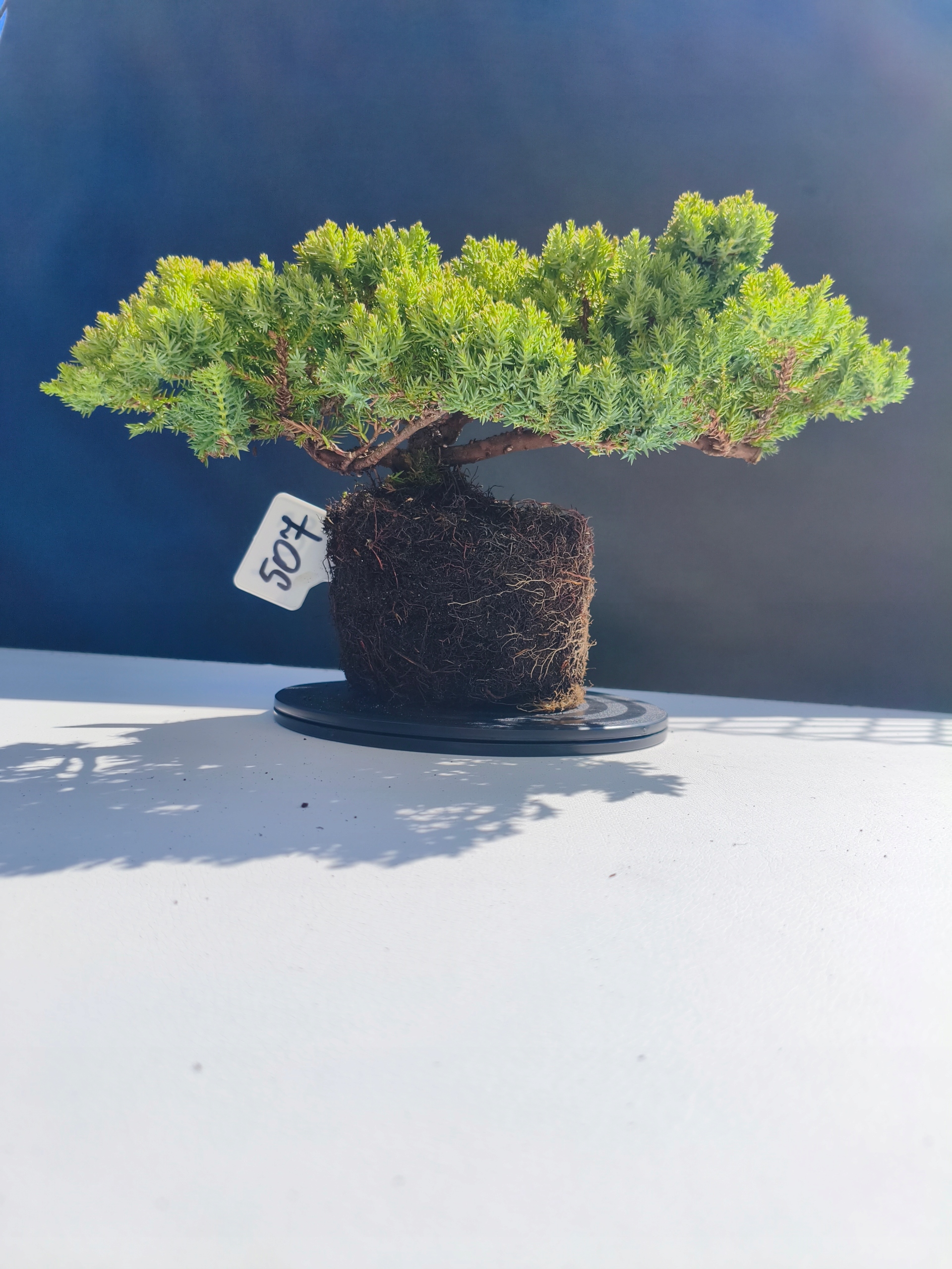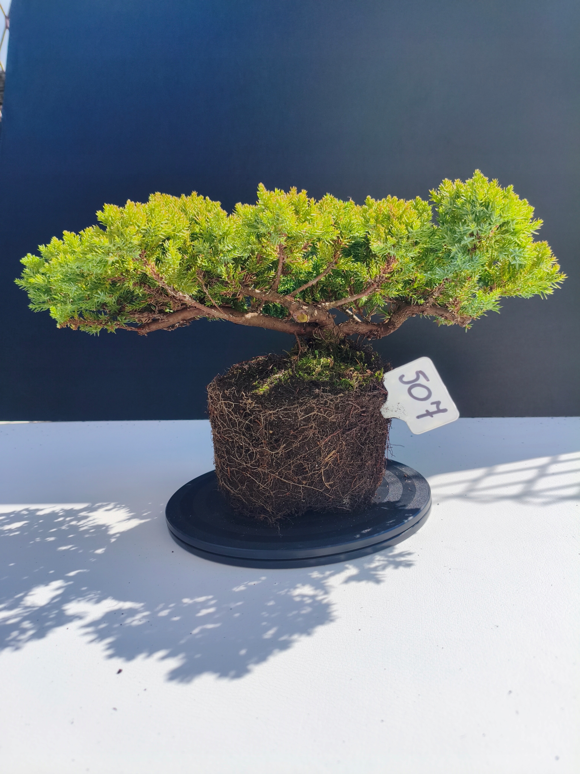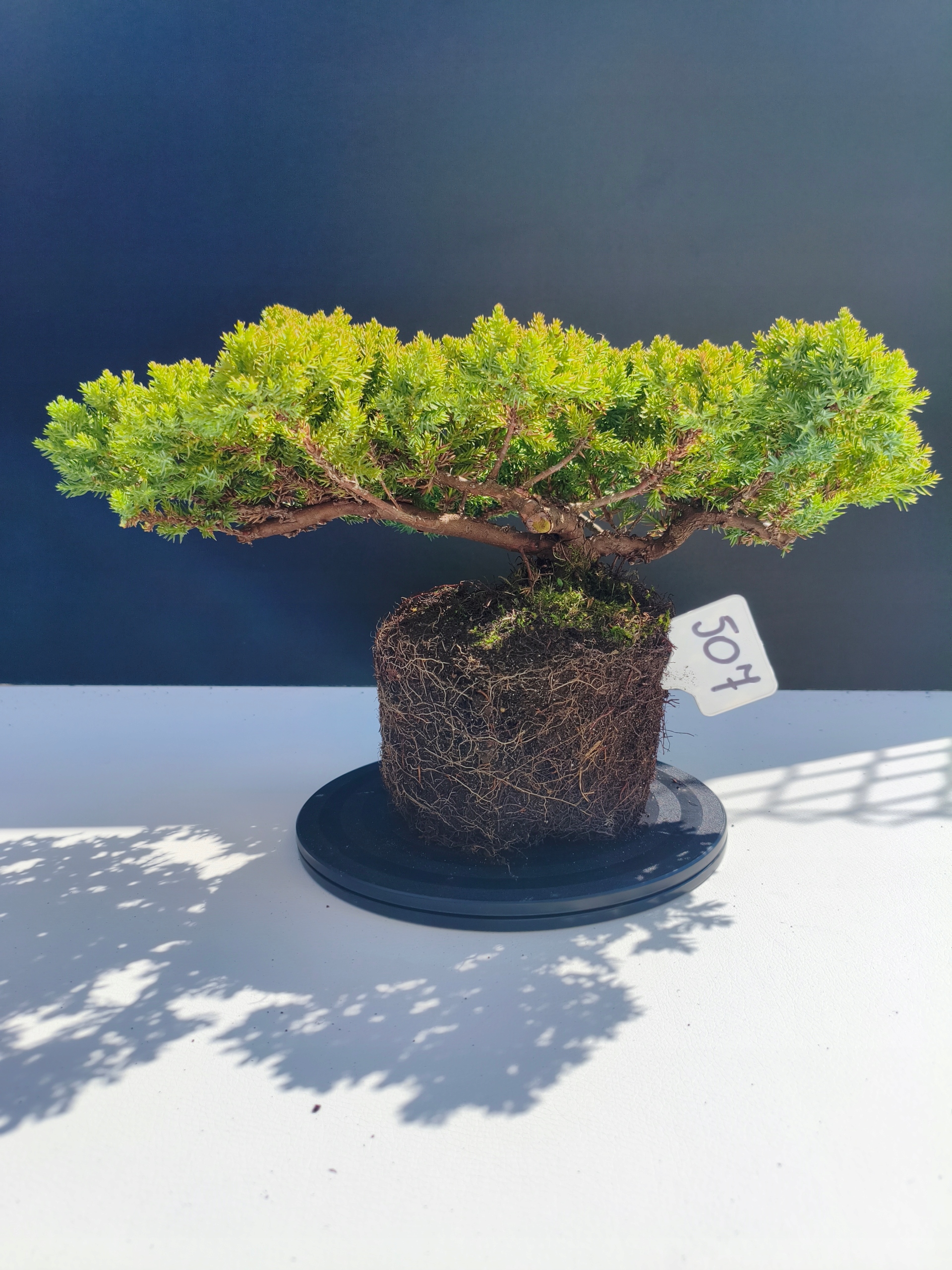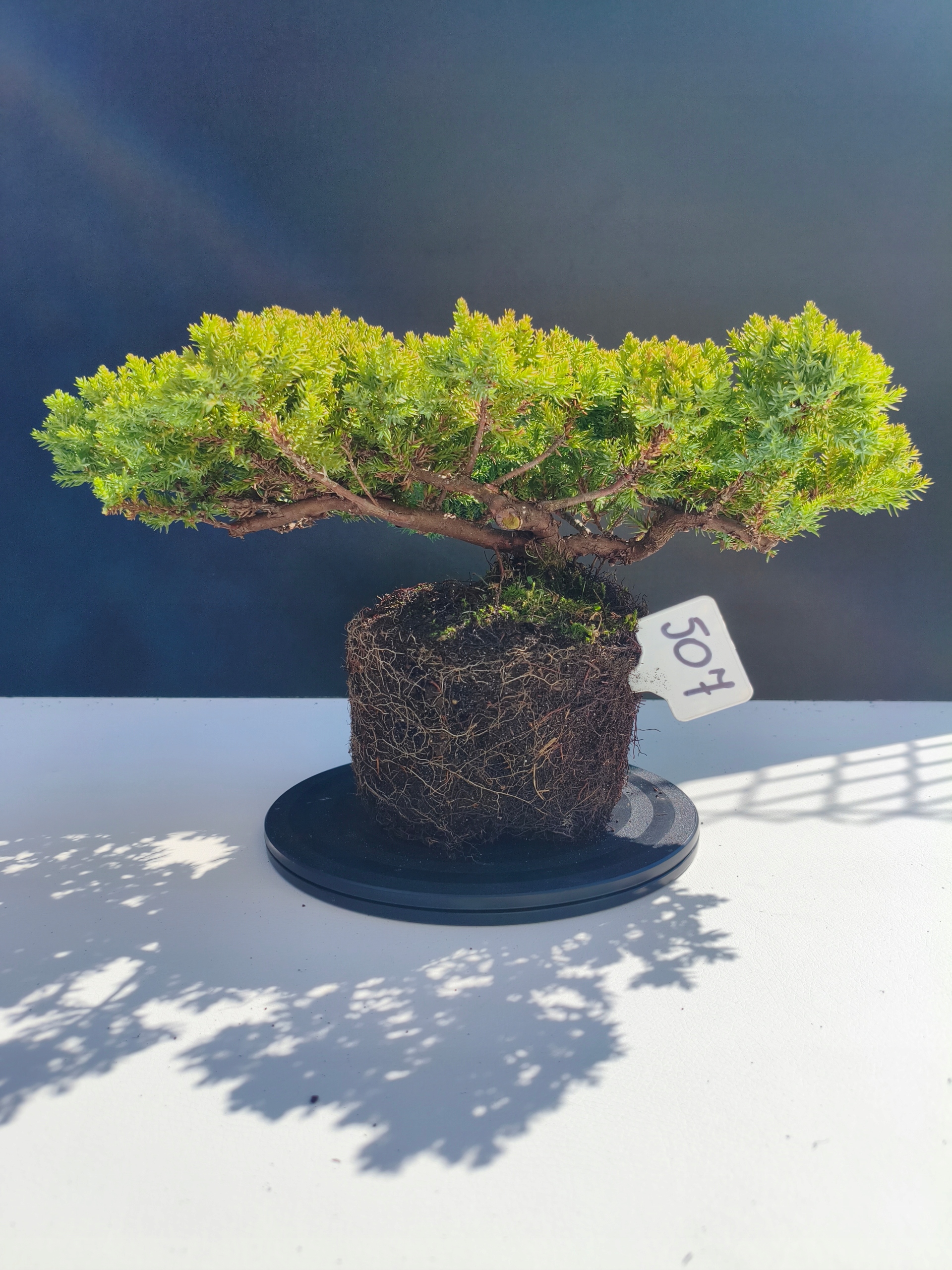 Każde nasze drzewko bonsai to unikalny egzemplarz, dlatego każde zostaje wystawione osobno, ponieważ traktujemy każde indywidualnie – od formowania po pielęgnację. Jałowce te są w naszych rękach od 2021 roku i obecnie mają już 11 lat, dzięki czemu prezentują się wyjątkowo dojrzale i stabilnie.