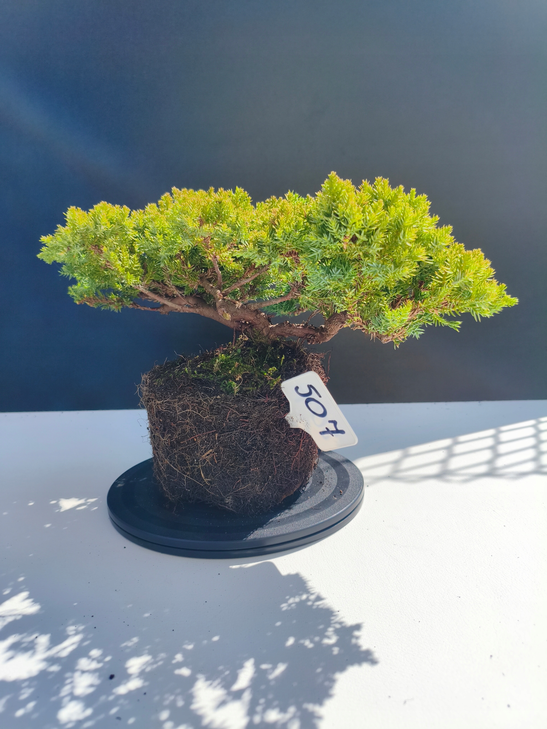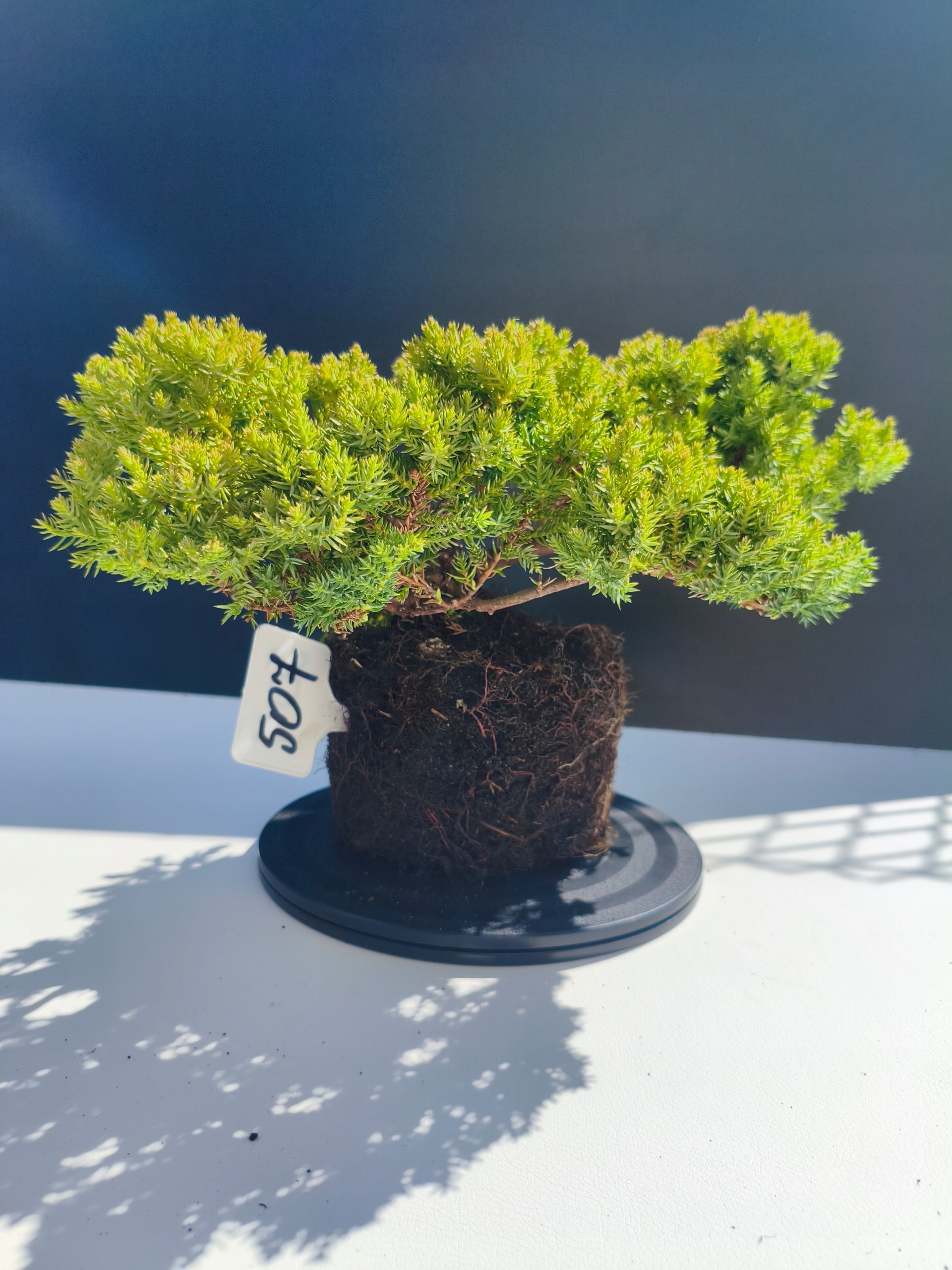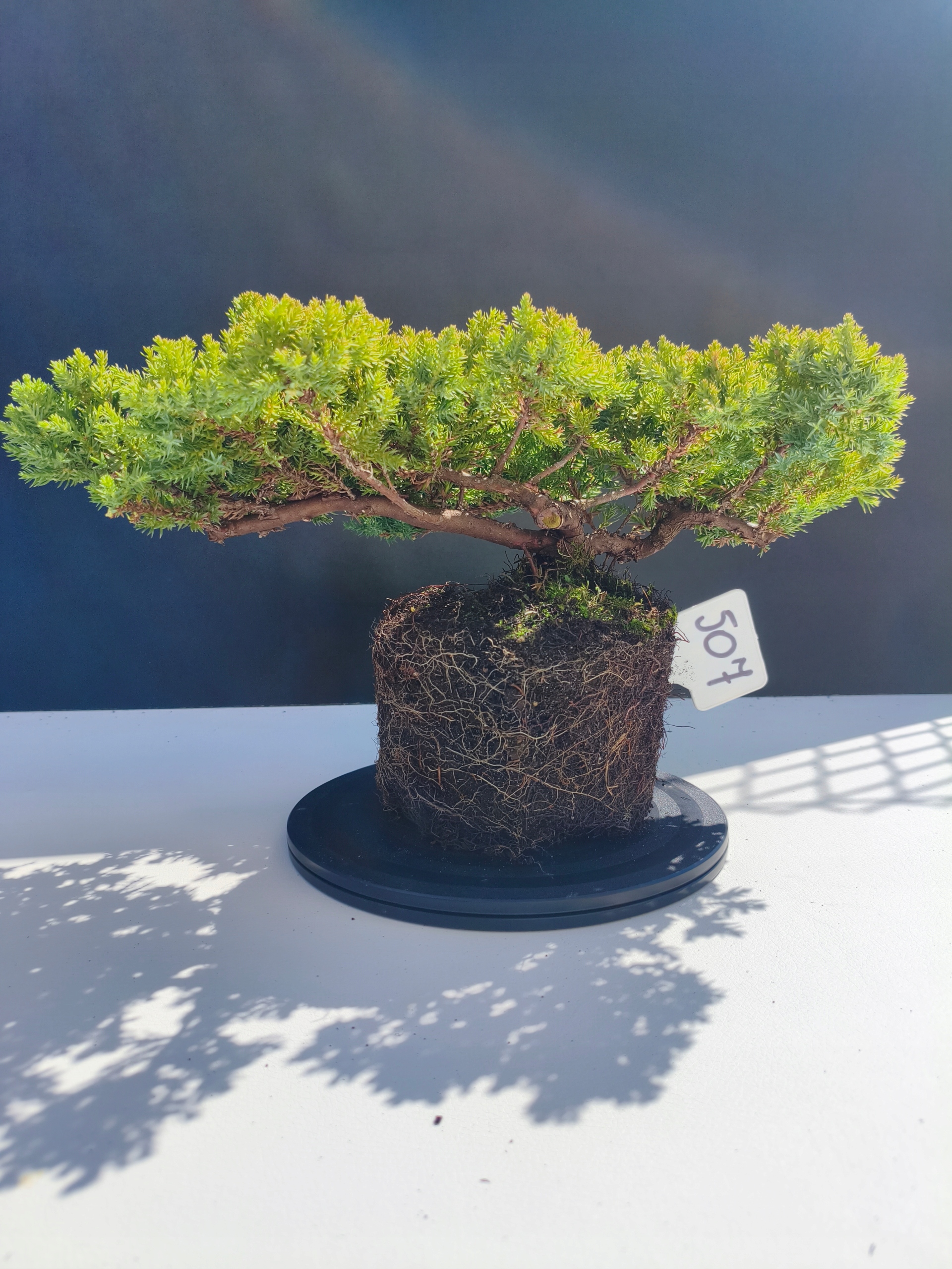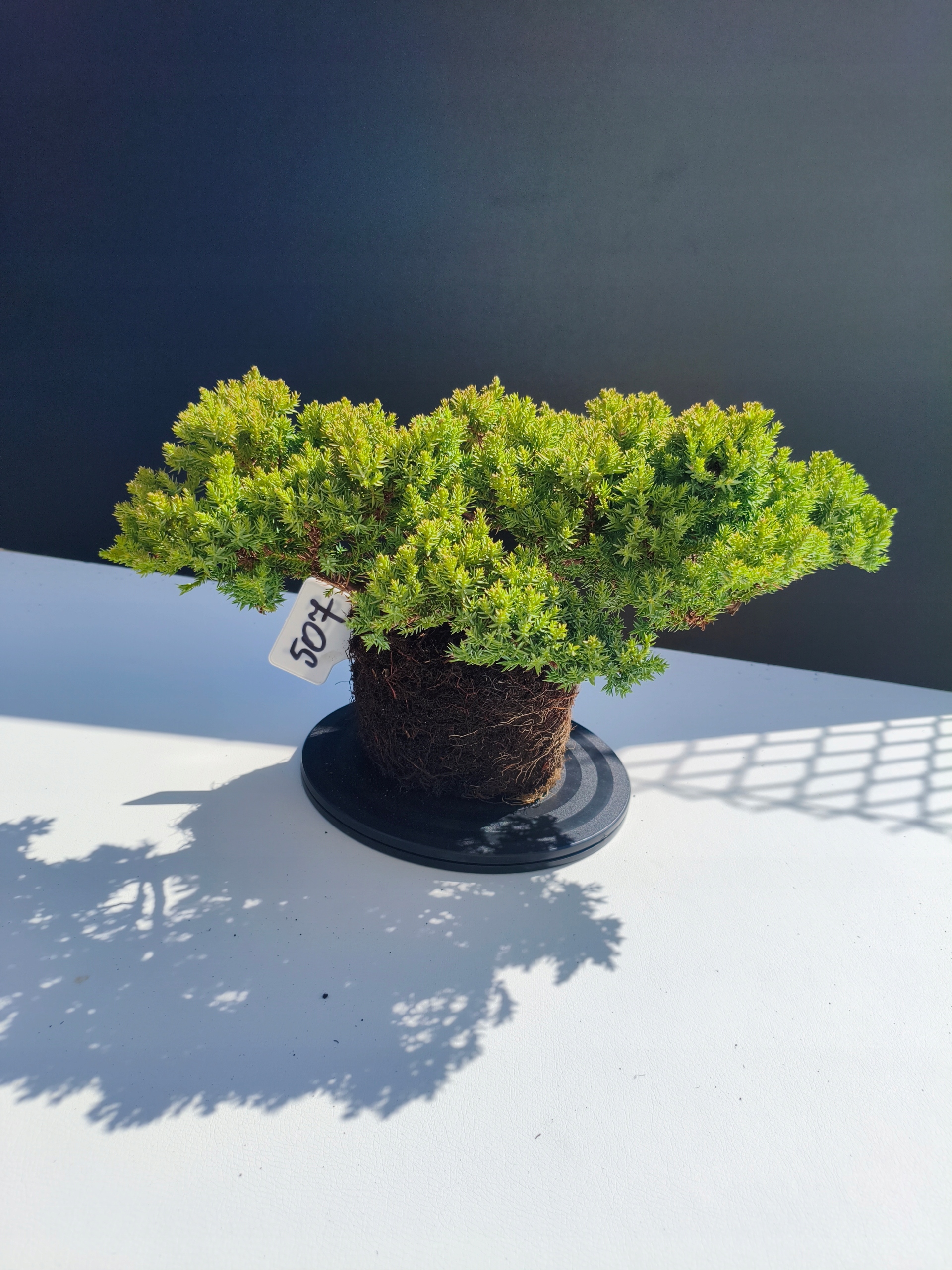 Każde nasze drzewko bonsai to unikalny egzemplarz, dlatego każde zostaje wystawione osobno, ponieważ traktujemy każde indywidualnie – od formowania po pielęgnację. Jałowce te są w naszych rękach od 2021 roku i obecnie mają już 11 lat, dzięki czemu prezentują się wyjątkowo dojrzale i stabilnie.