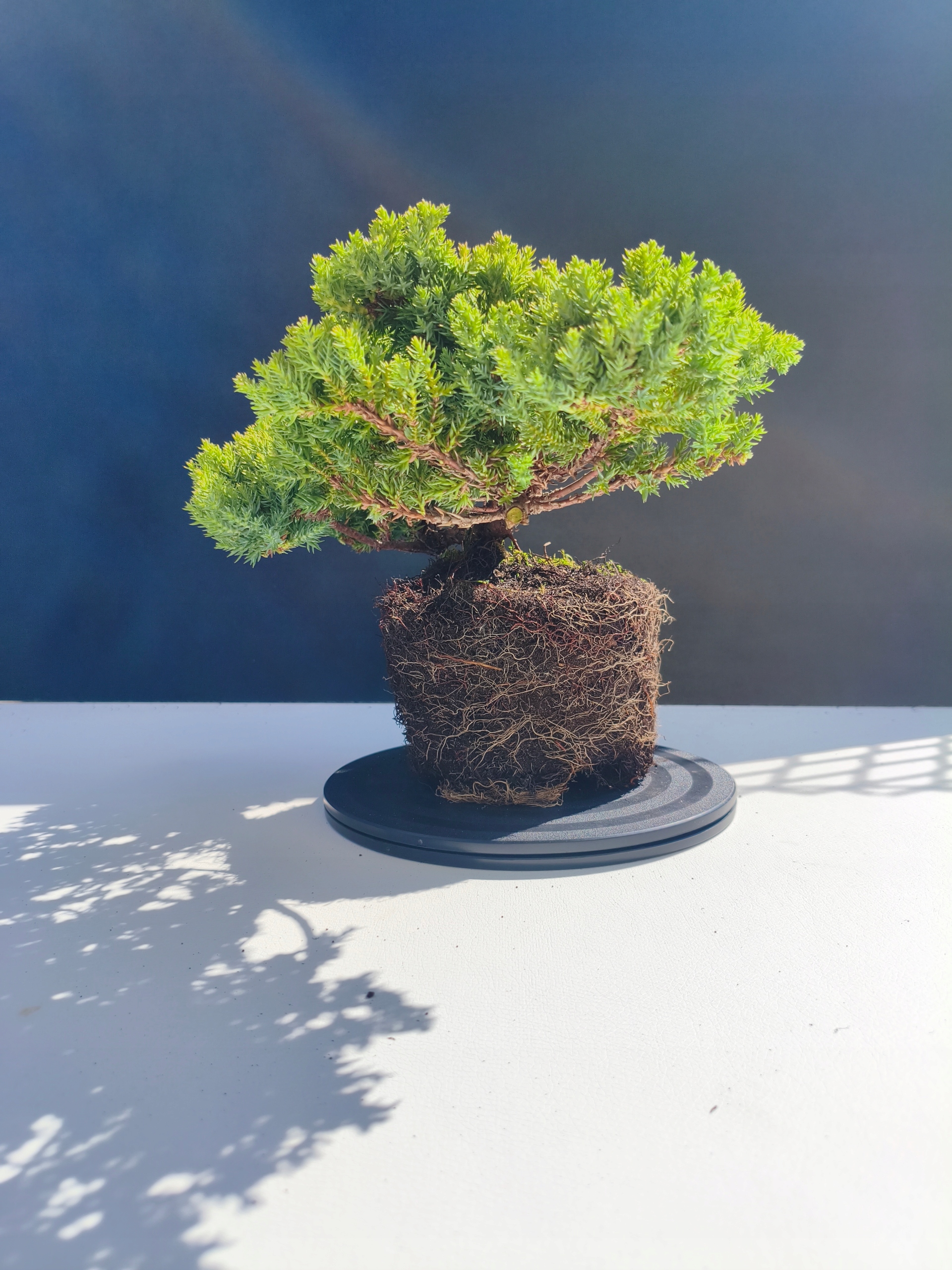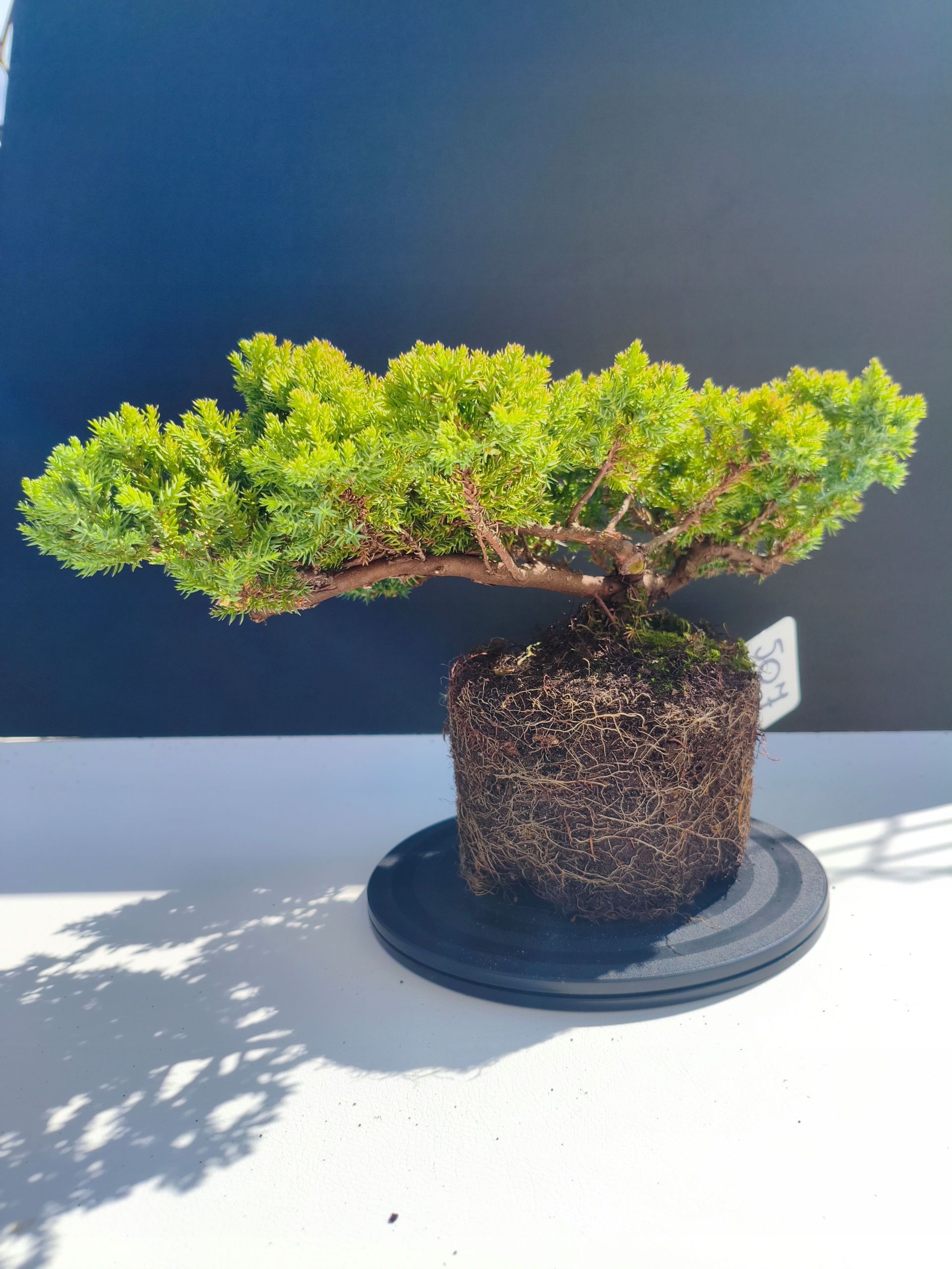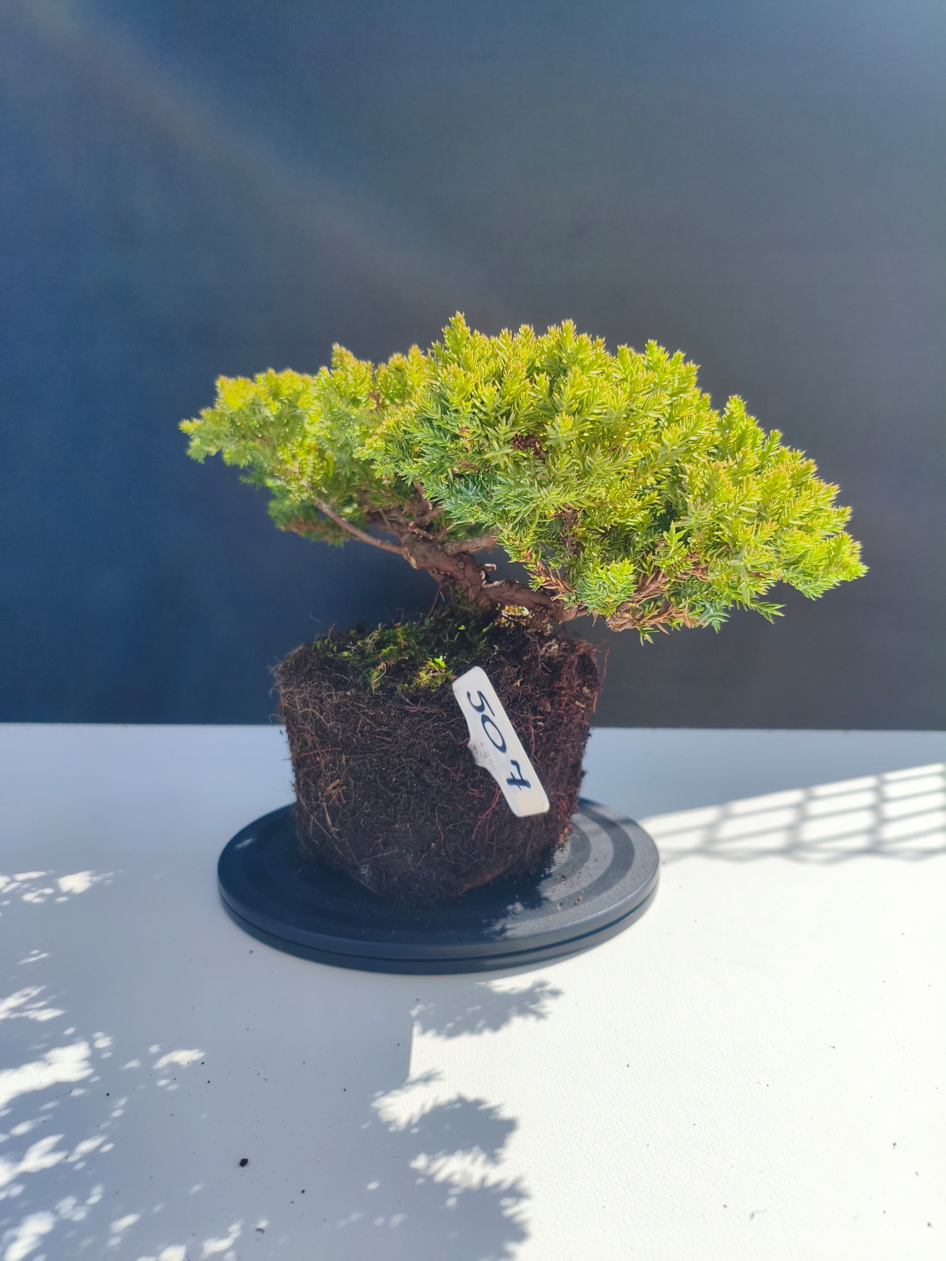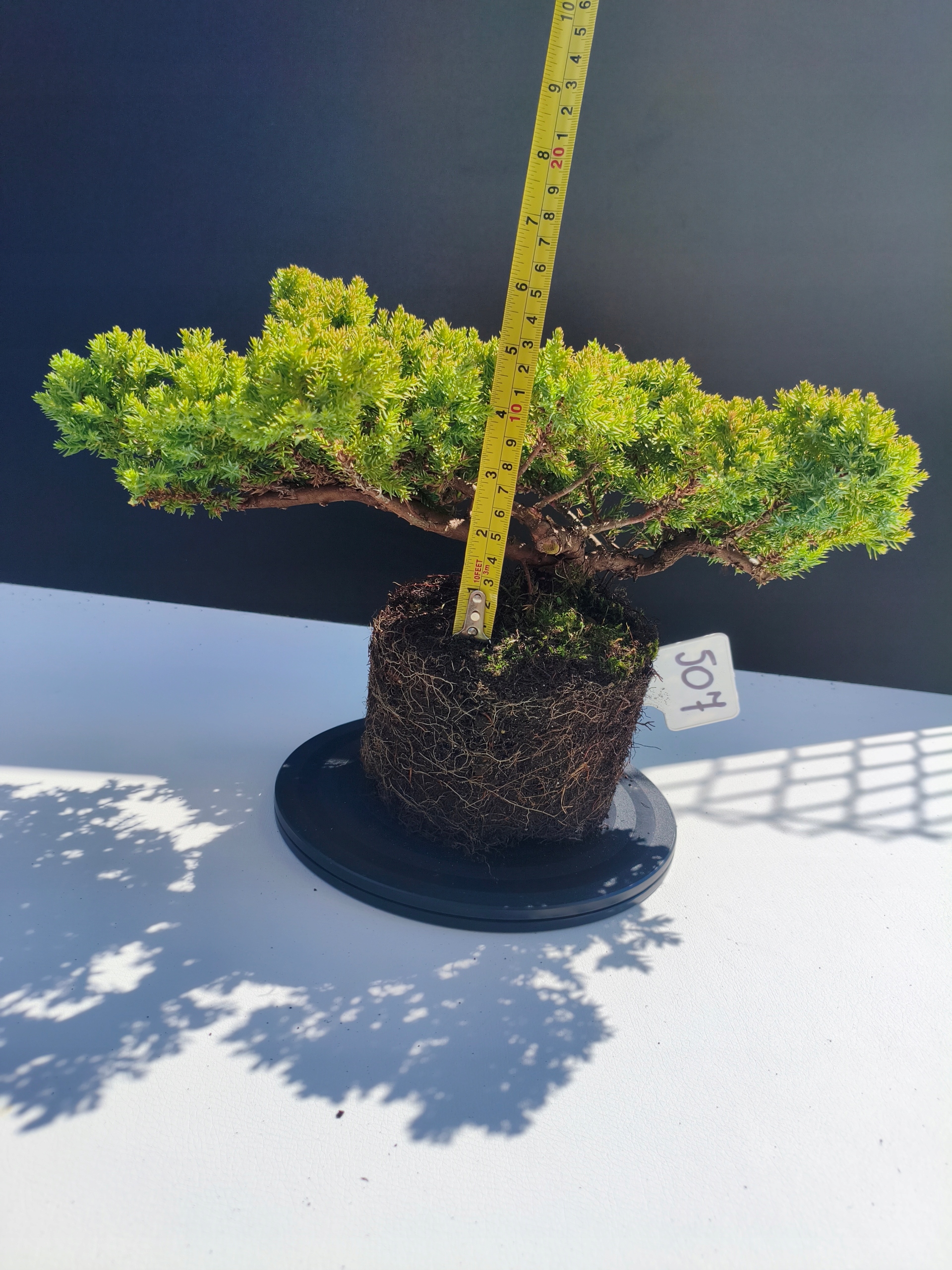Każde nasze drzewko bonsai to unikalny egzemplarz, dlatego każde zostaje wystawione osobno, ponieważ traktujemy każde indywidualnie – od formowania po pielęgnację. Jałowce te są w naszych rękach od 2021 roku i obecnie mają już 11 lat, dzięki czemu prezentują się wyjątkowo dojrzale i stabilnie.
