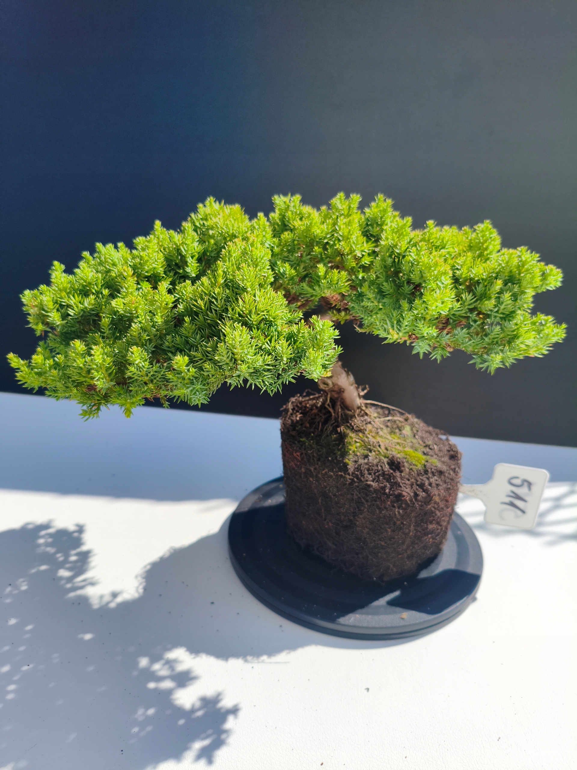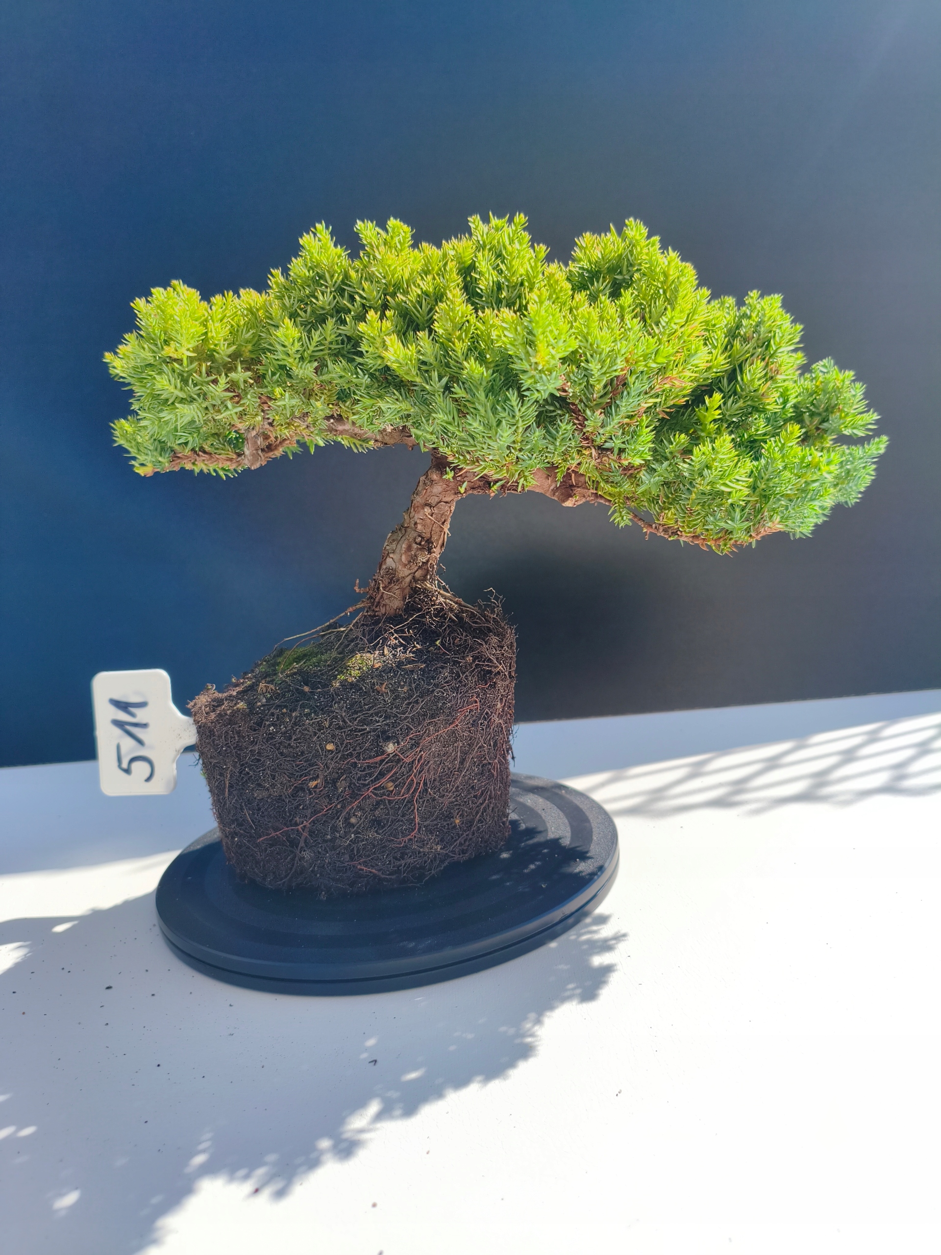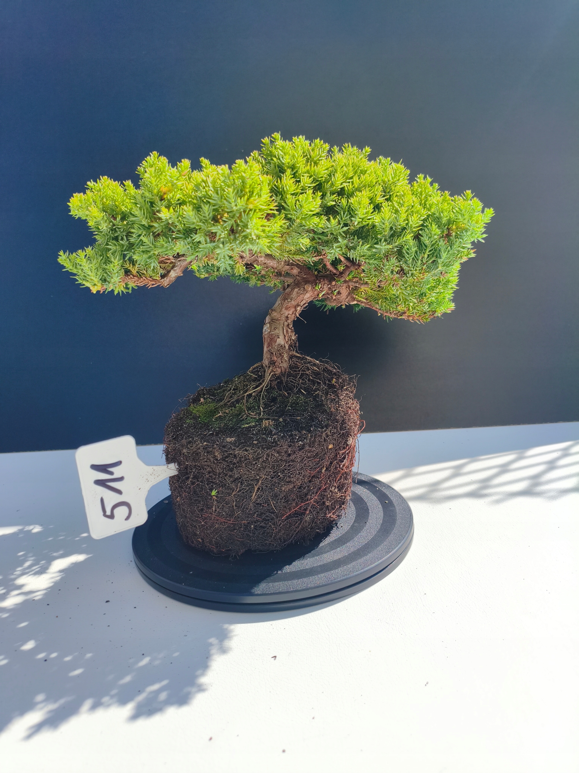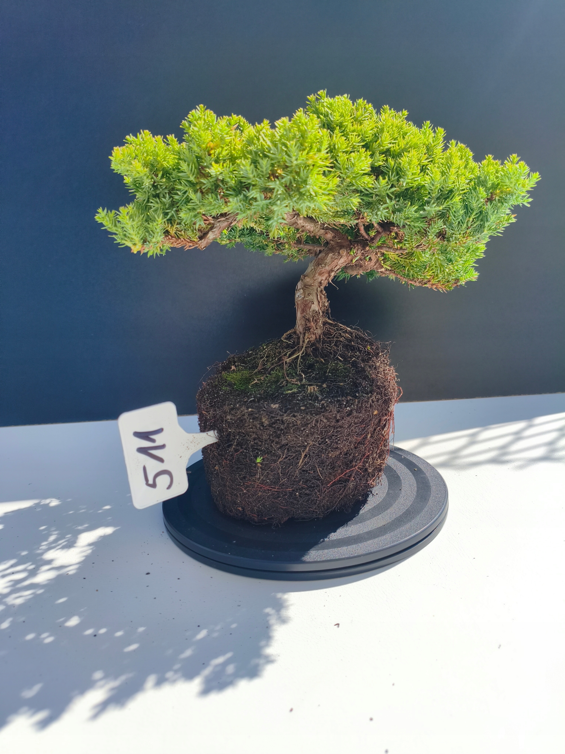 Każde nasze drzewko bonsai to unikalny egzemplarz, dlatego każde zostaje wystawione osobno, ponieważ traktujemy każde indywidualnie – od formowania po pielęgnację. Jałowce te są w naszych rękach od 2021 roku i obecnie mają już 11 lat, dzięki czemu prezentują się wyjątkowo dojrzale i stabilnie.