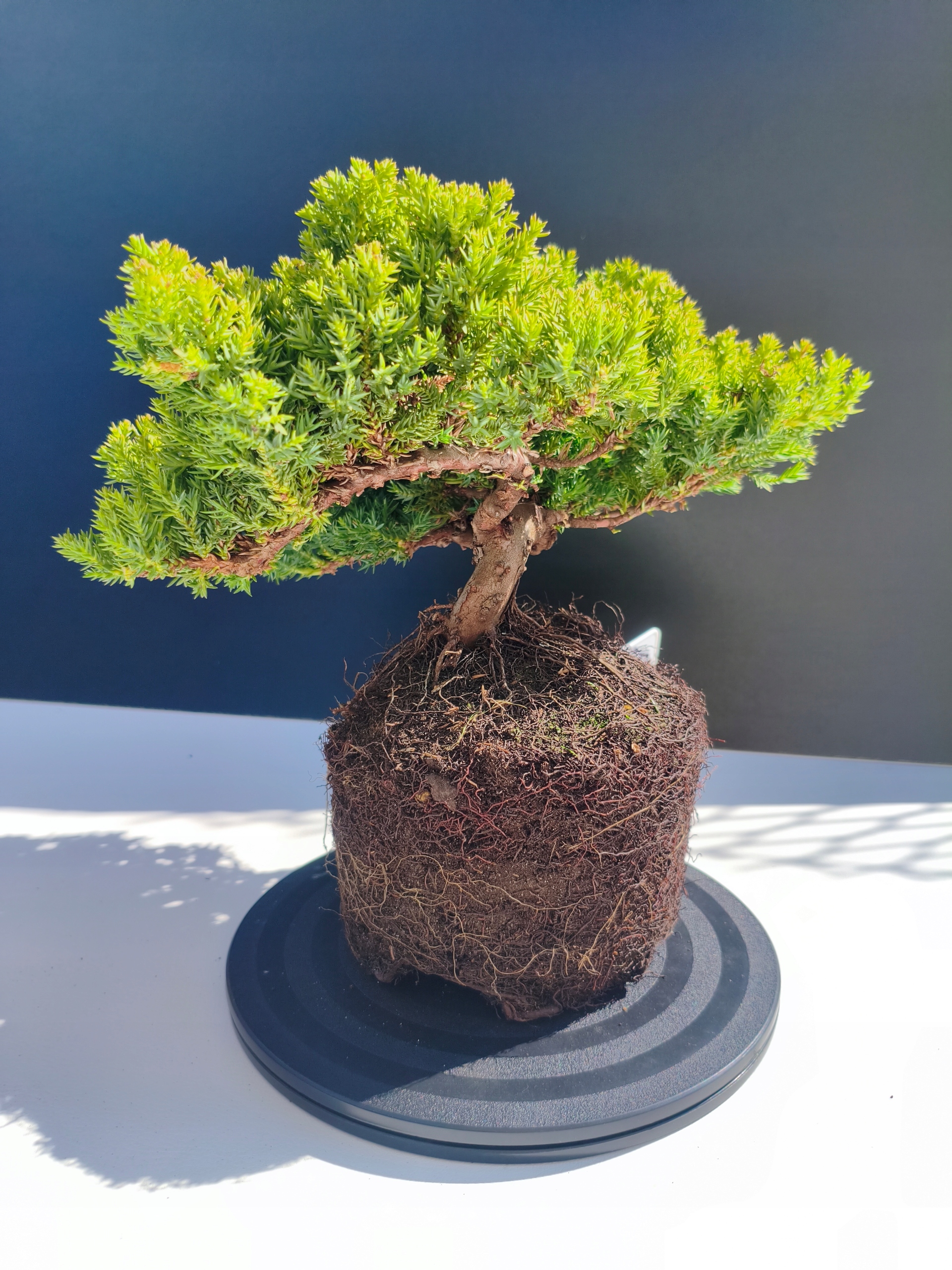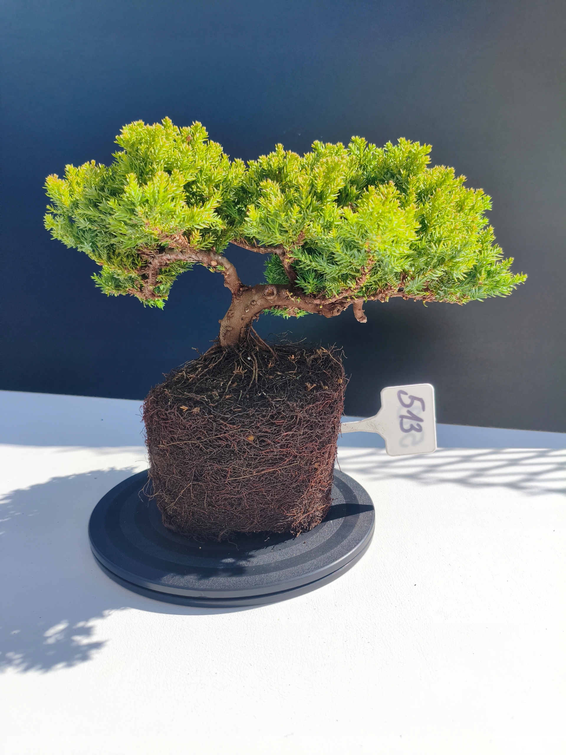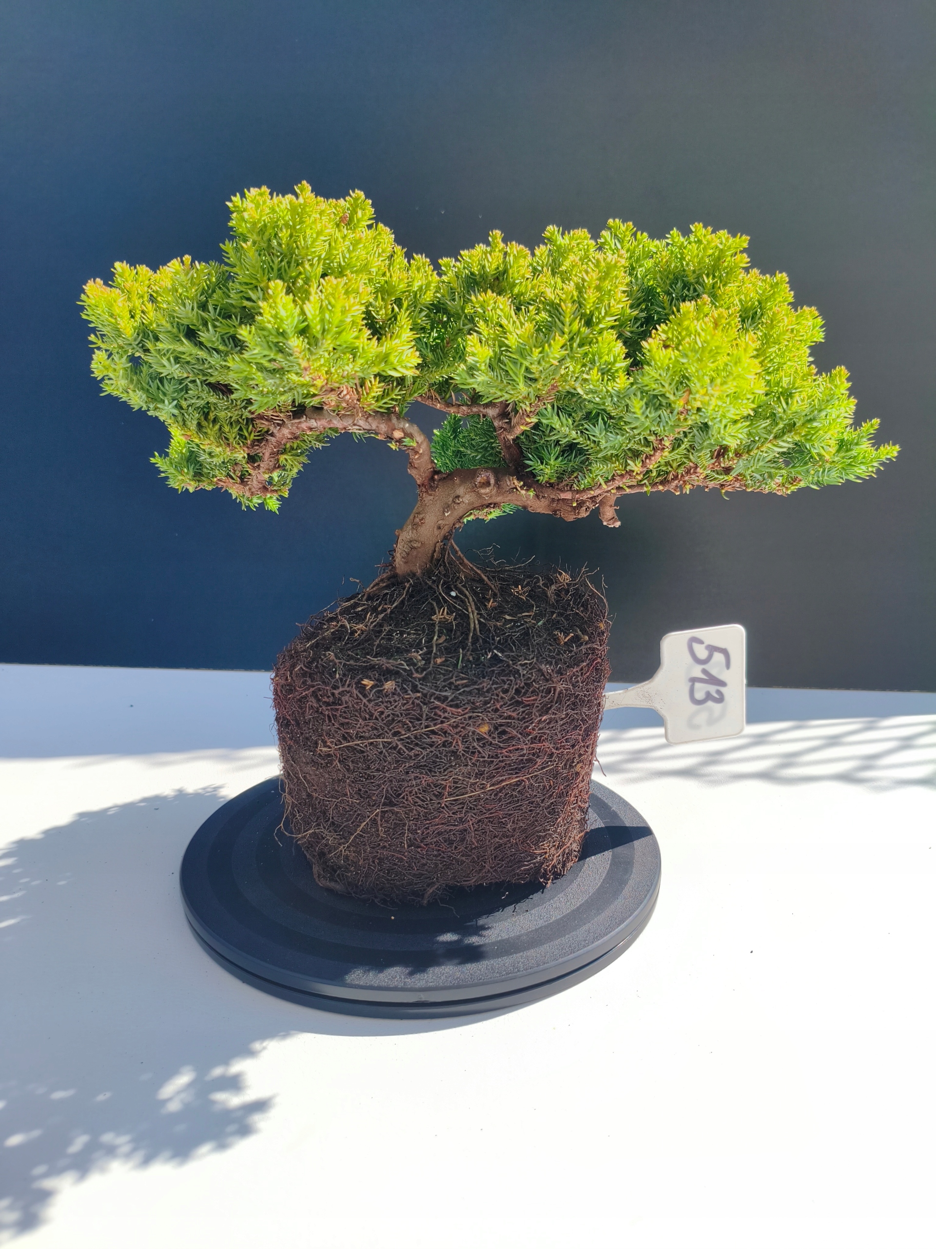 Każde nasze drzewko bonsai to unikalny egzemplarz, dlatego każde zostaje wystawione osobno, ponieważ traktujemy każde indywidualnie – od formowania po pielęgnację. Jałowce te są w naszych rękach od 2021 roku i obecnie mają już 11 lat, dzięki czemu prezentują się wyjątkowo dojrzale i stabilnie.