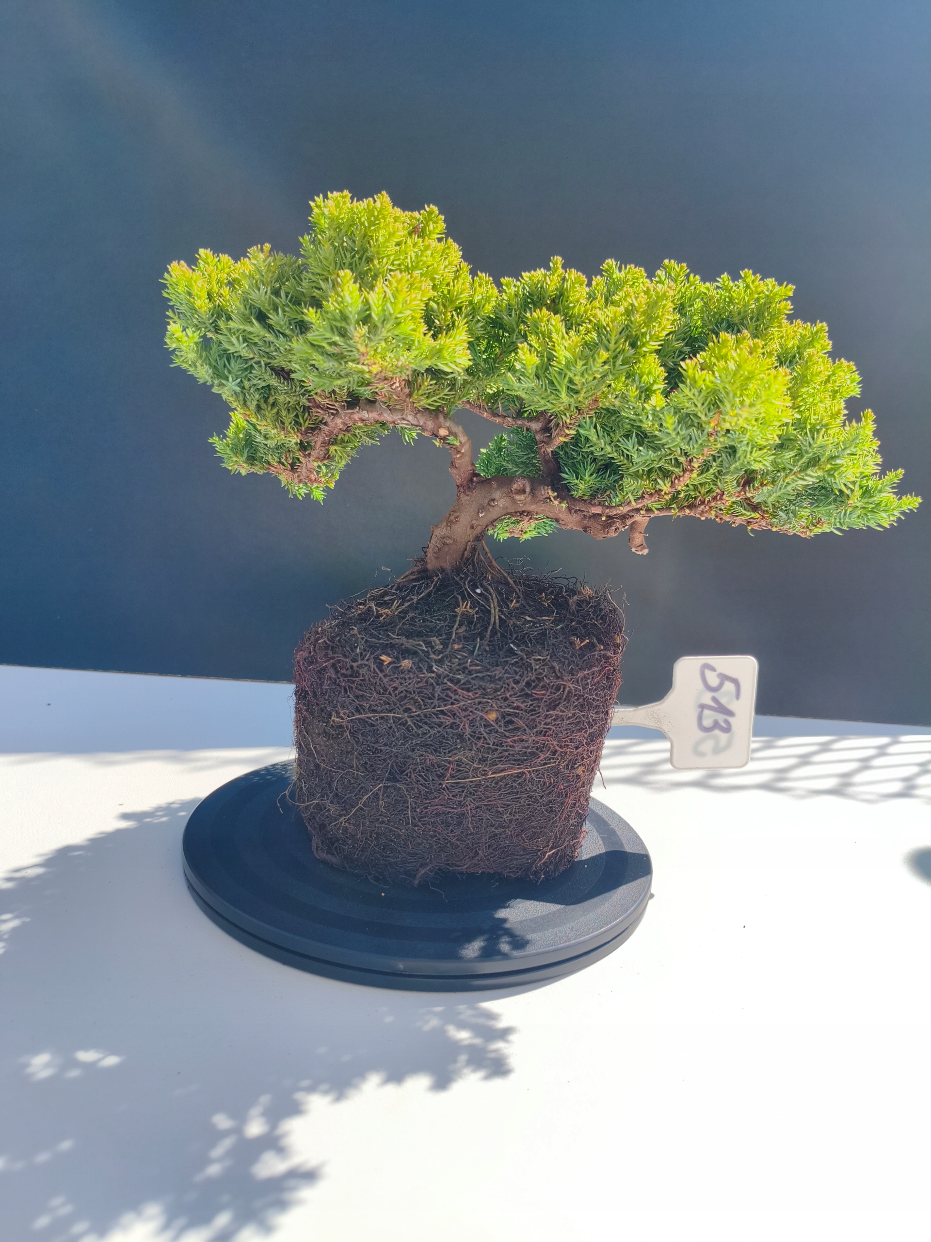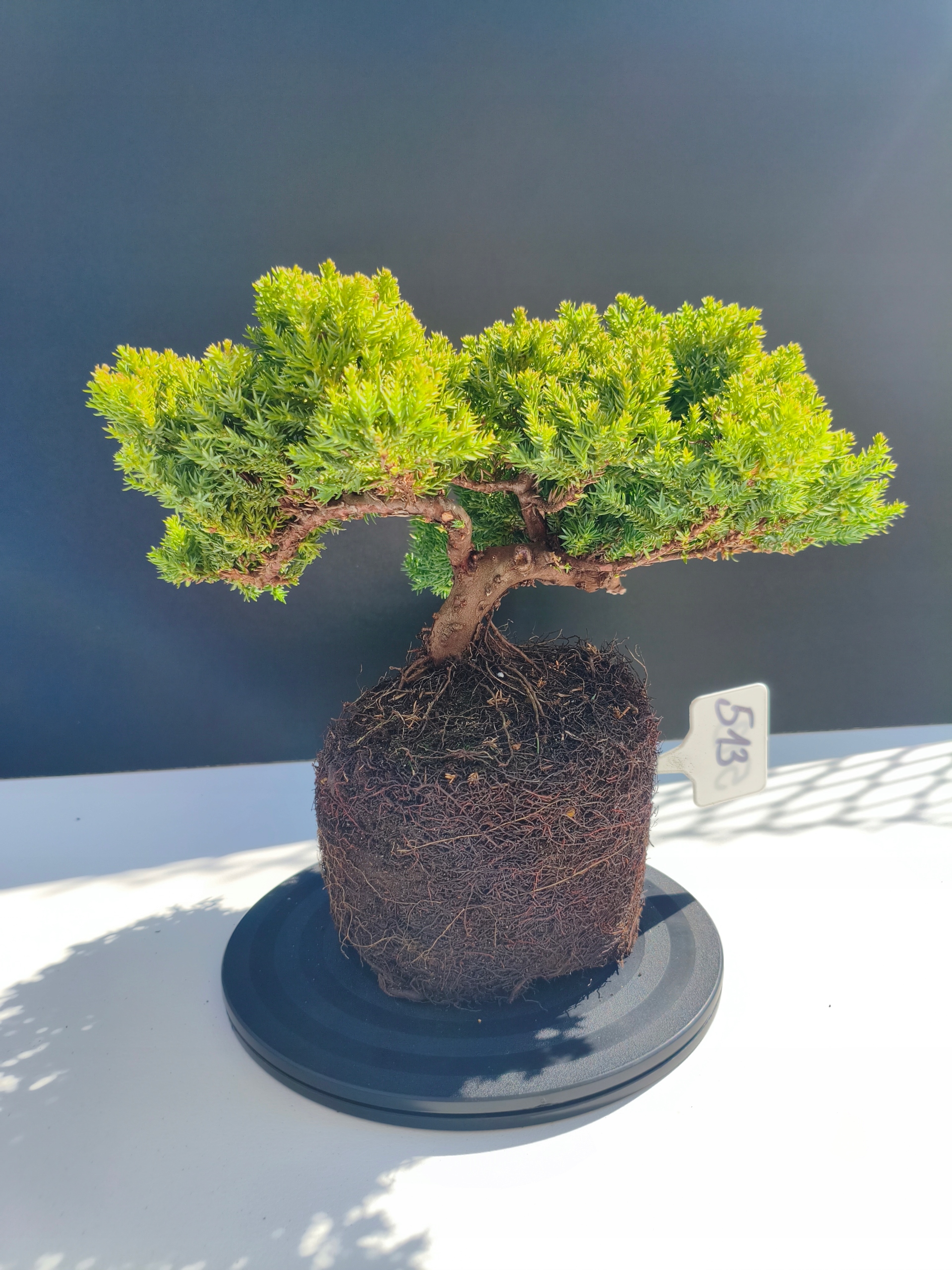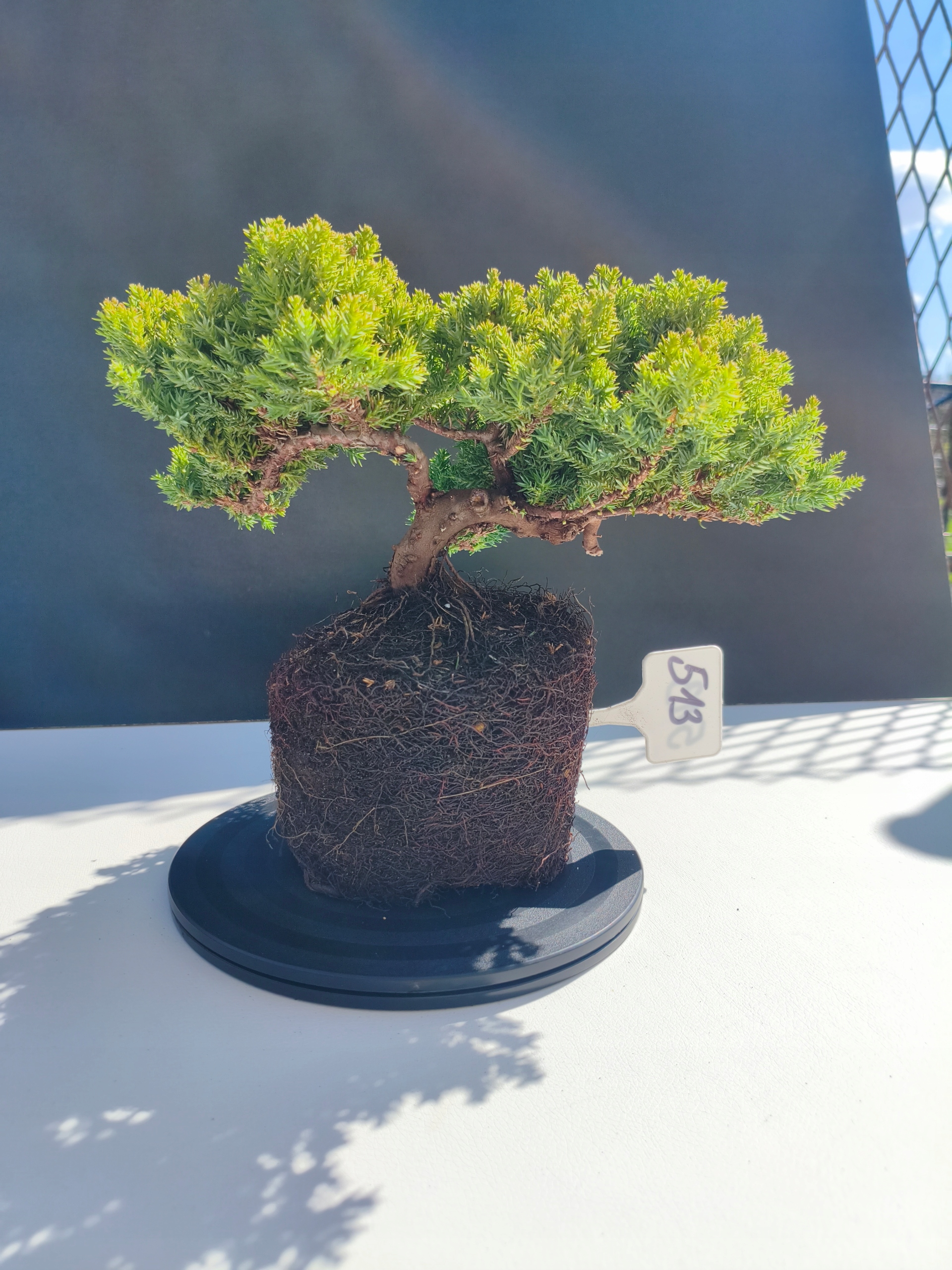 Każde nasze drzewko bonsai to unikalny egzemplarz, dlatego każde zostaje wystawione osobno, ponieważ traktujemy każde indywidualnie – od formowania po pielęgnację. Jałowce te są w naszych rękach od 2021 roku i obecnie mają już 11 lat, dzięki czemu prezentują się wyjątkowo dojrzale i stabilnie.