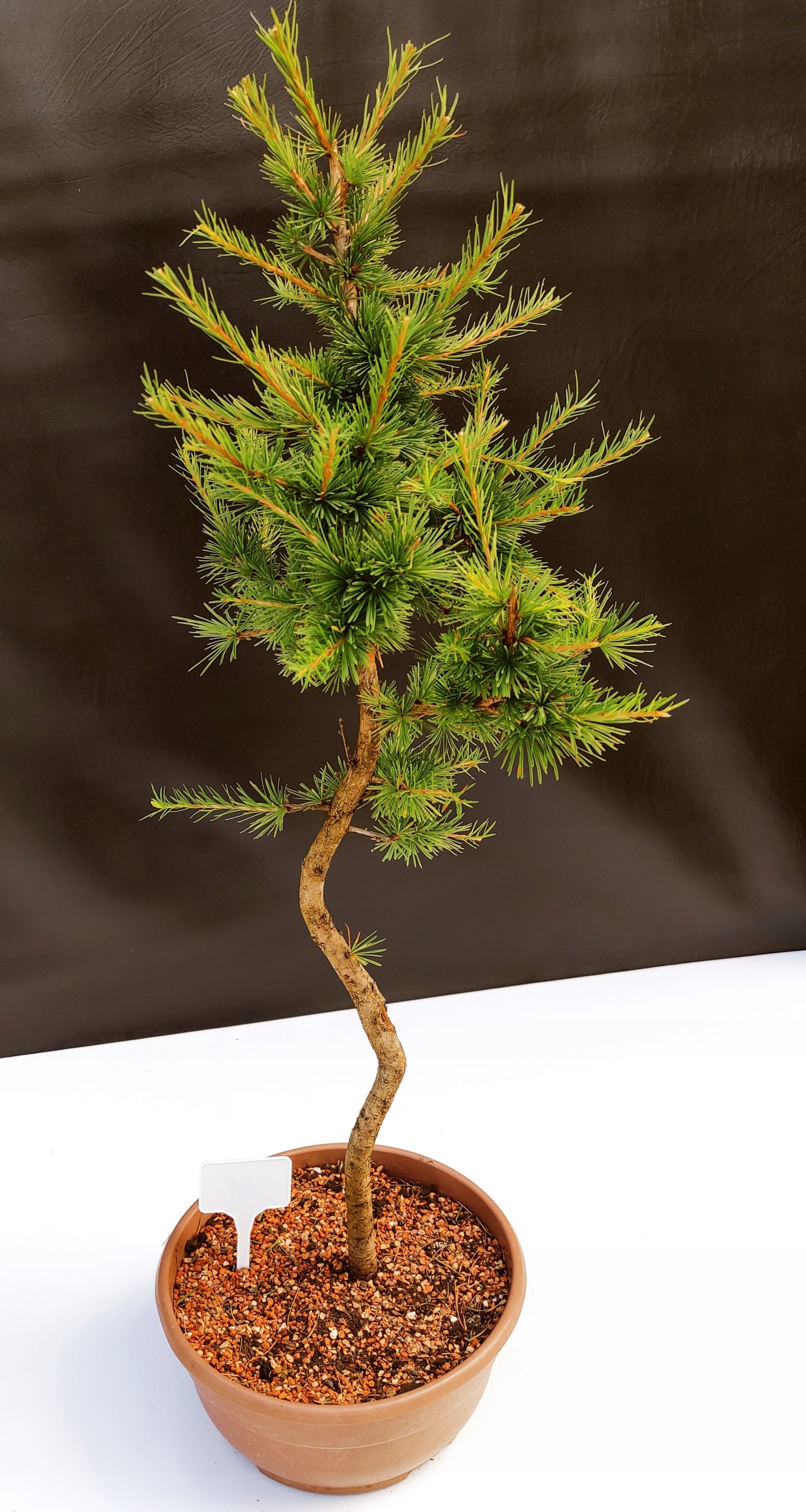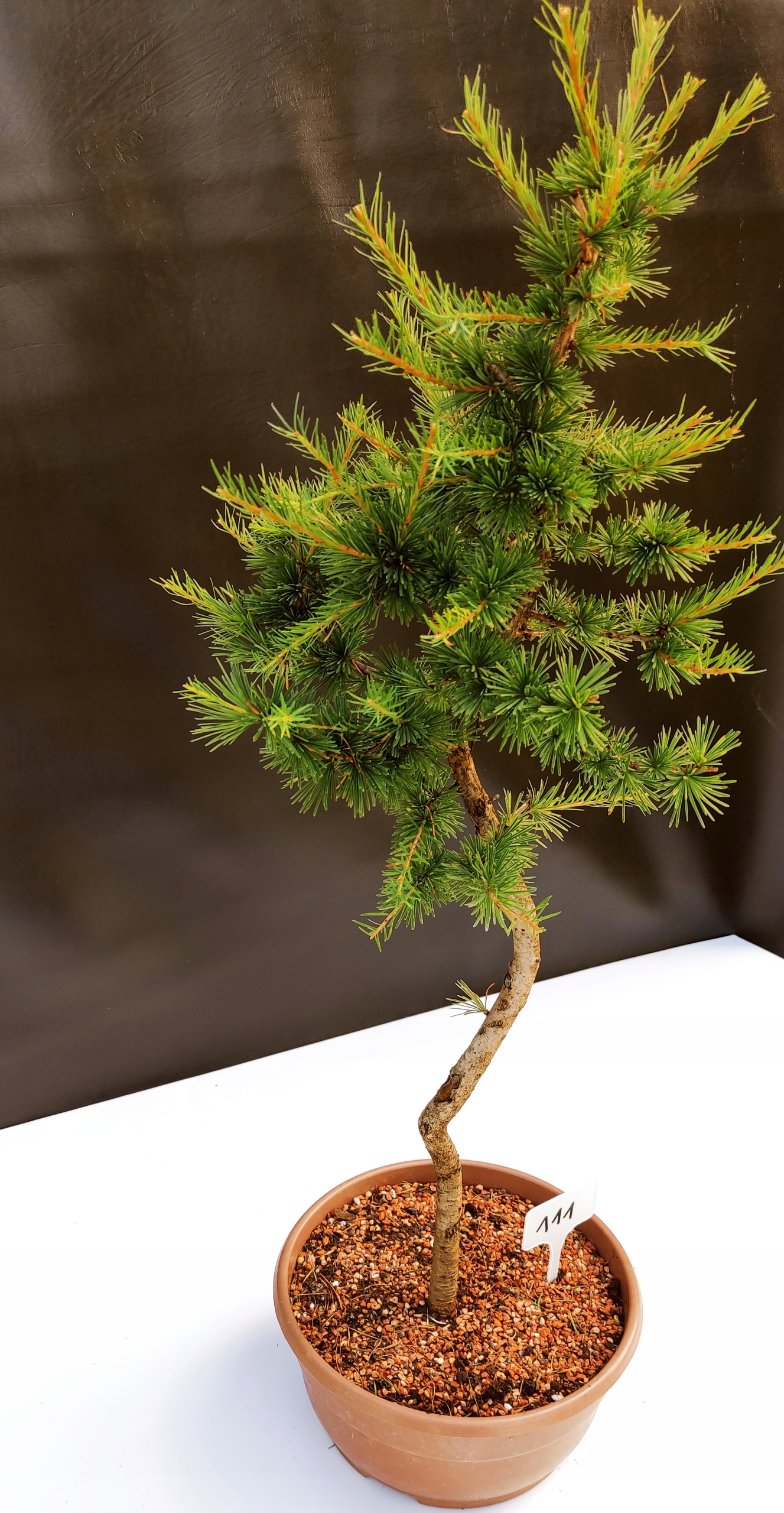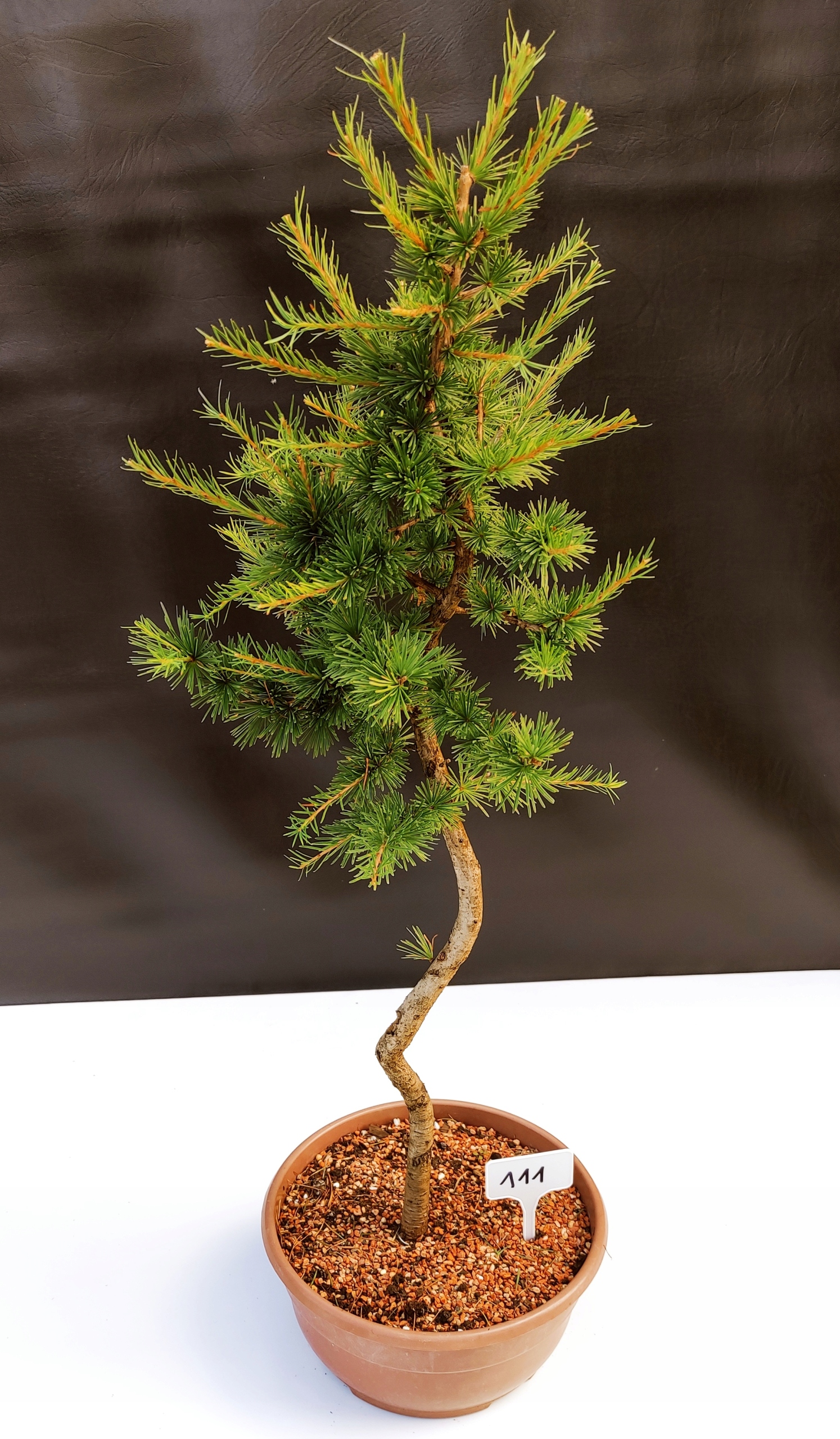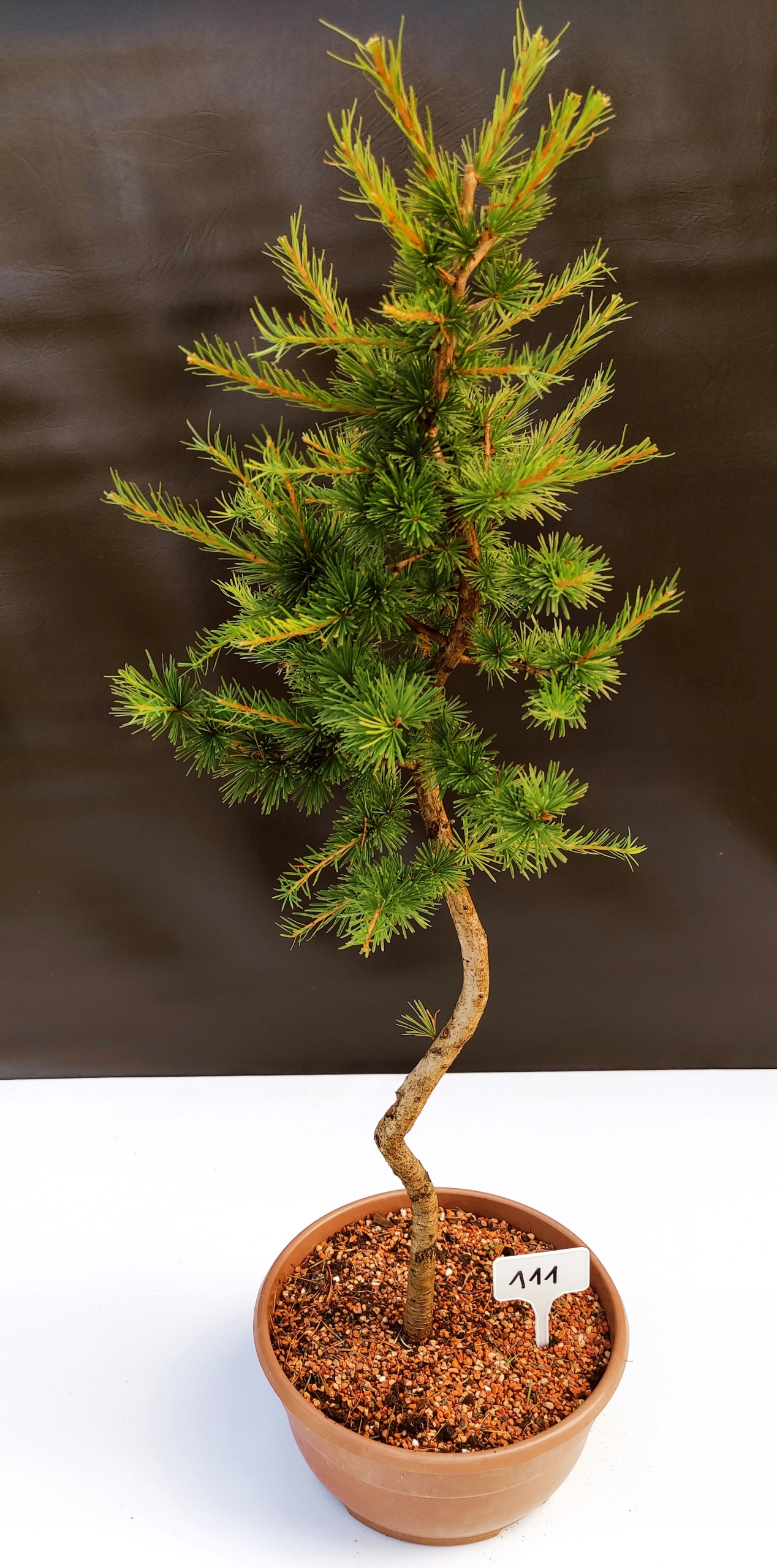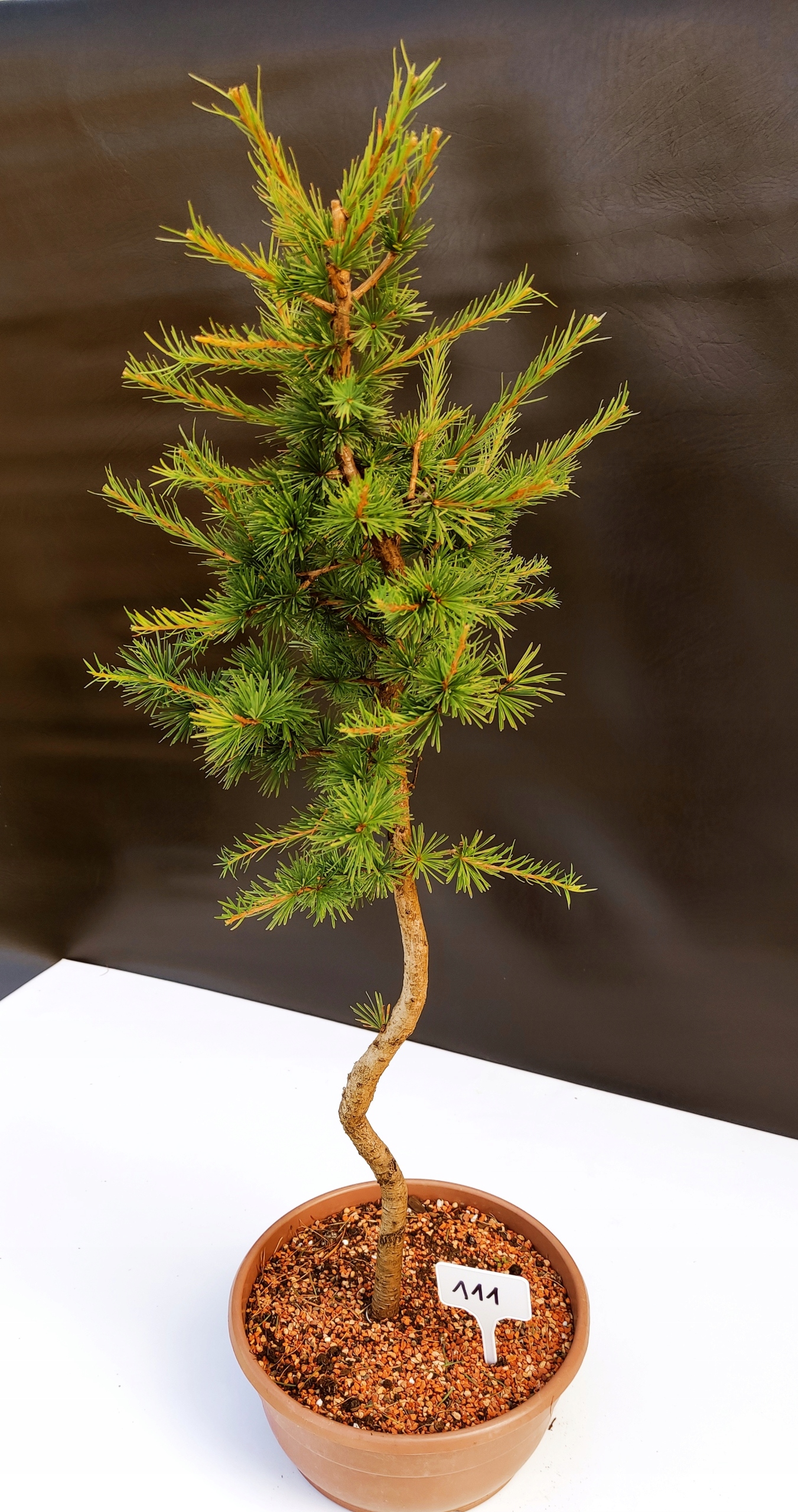 Każde nasze drzewko bonsai to unikalny egzemplarz, dlatego każde zostaje wystawione osobno, ponieważ traktujemy każde indywidualnie – od formowania po pielęgnację. Modrzewie te są w naszych rękach od 2021 roku i obecnie mają już 10 lat, dzięki czemu prezentują się wyjątkowo dojrzale i stabilnie.