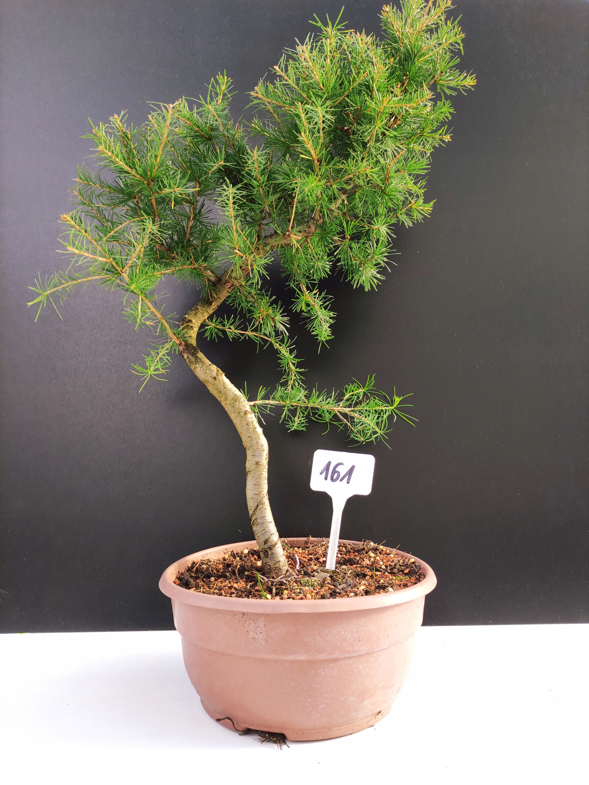 Każde nasze drzewko bonsai to unikalny egzemplarz, dlatego każde zostaje wystawione osobno, ponieważ traktujemy każde indywidualnie – od formowania po pielęgnację. Modrzewie te są w naszych rękach od 2021 roku i obecnie mają już 10 lat, dzięki czemu prezentują się wyjątkowo dojrzale i stabilnie.