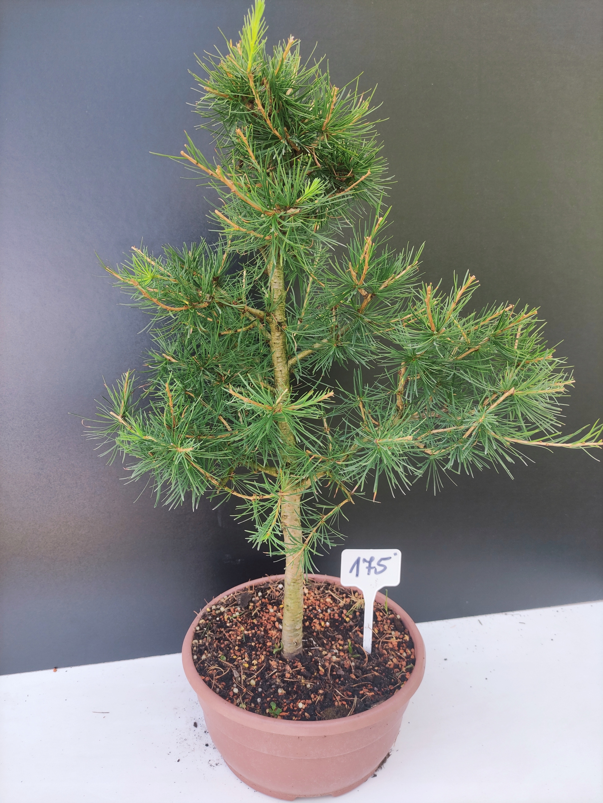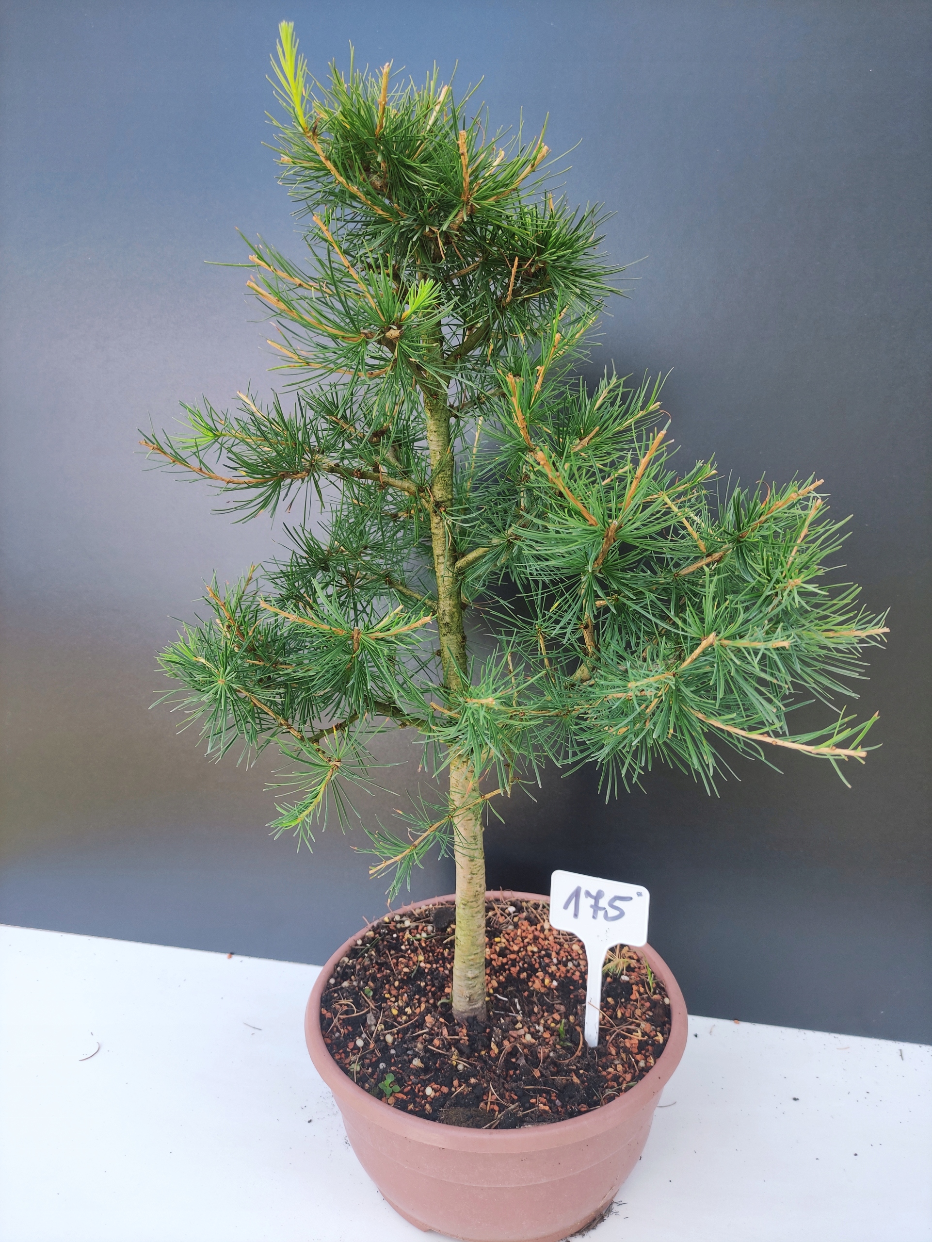 Każde nasze drzewko bonsai to unikalny egzemplarz, dlatego każde zostaje wystawione osobno, ponieważ traktujemy każde indywidualnie – od formowania po pielęgnację. Modrzewie te są w naszych rękach od 2021 roku i obecnie mają już 10 lat, dzięki czemu prezentują się wyjątkowo dojrzale i stabilnie.