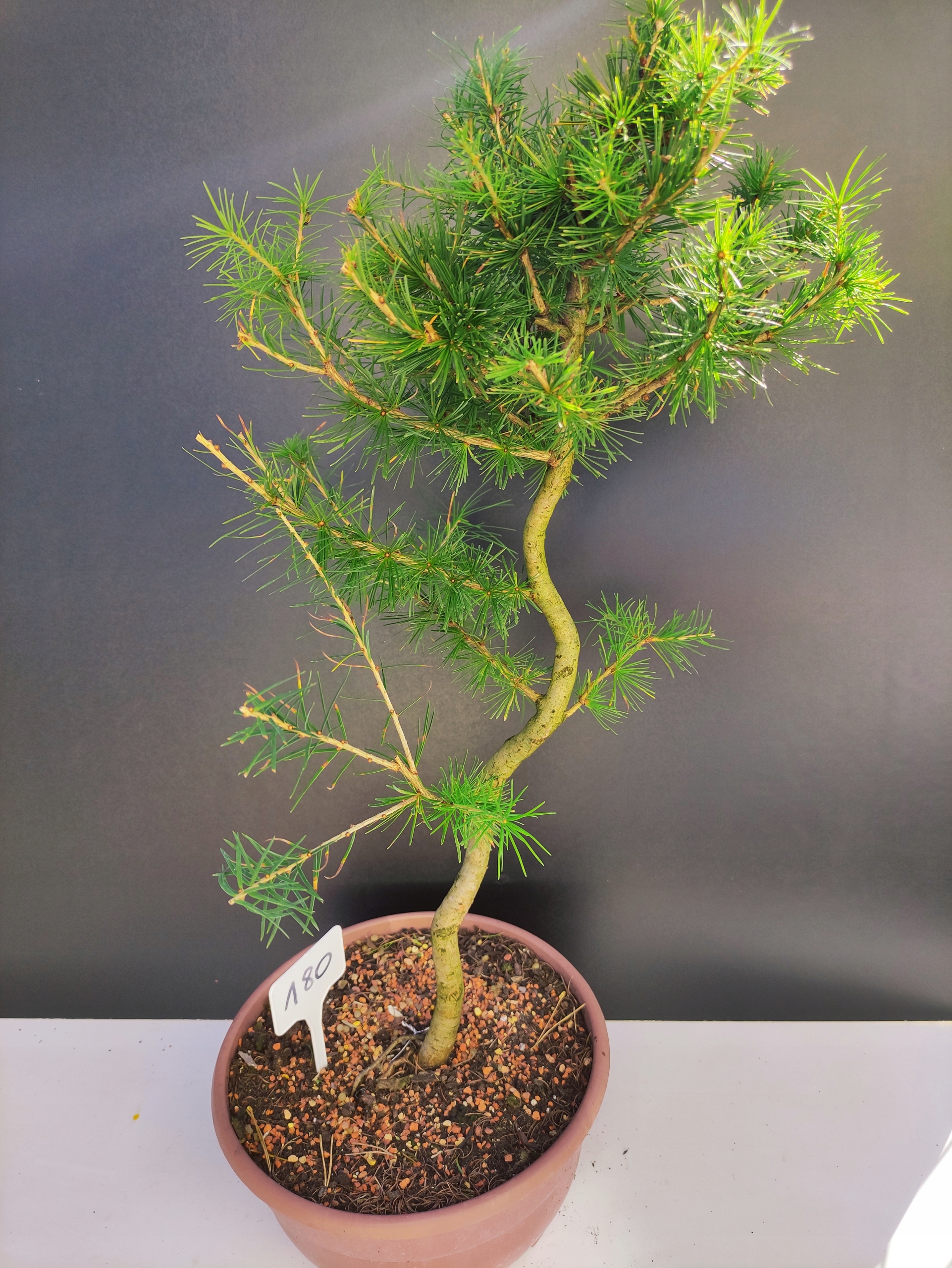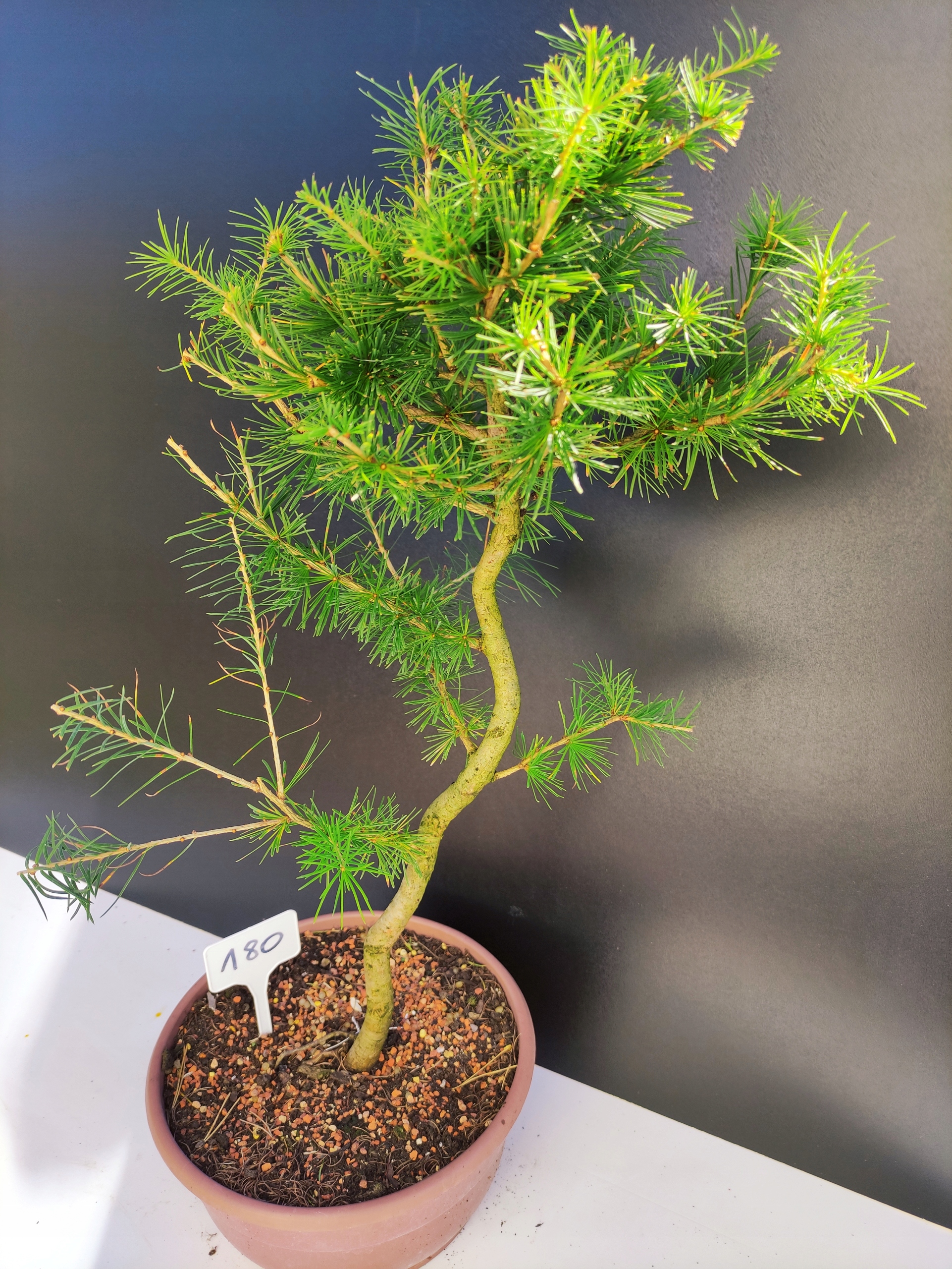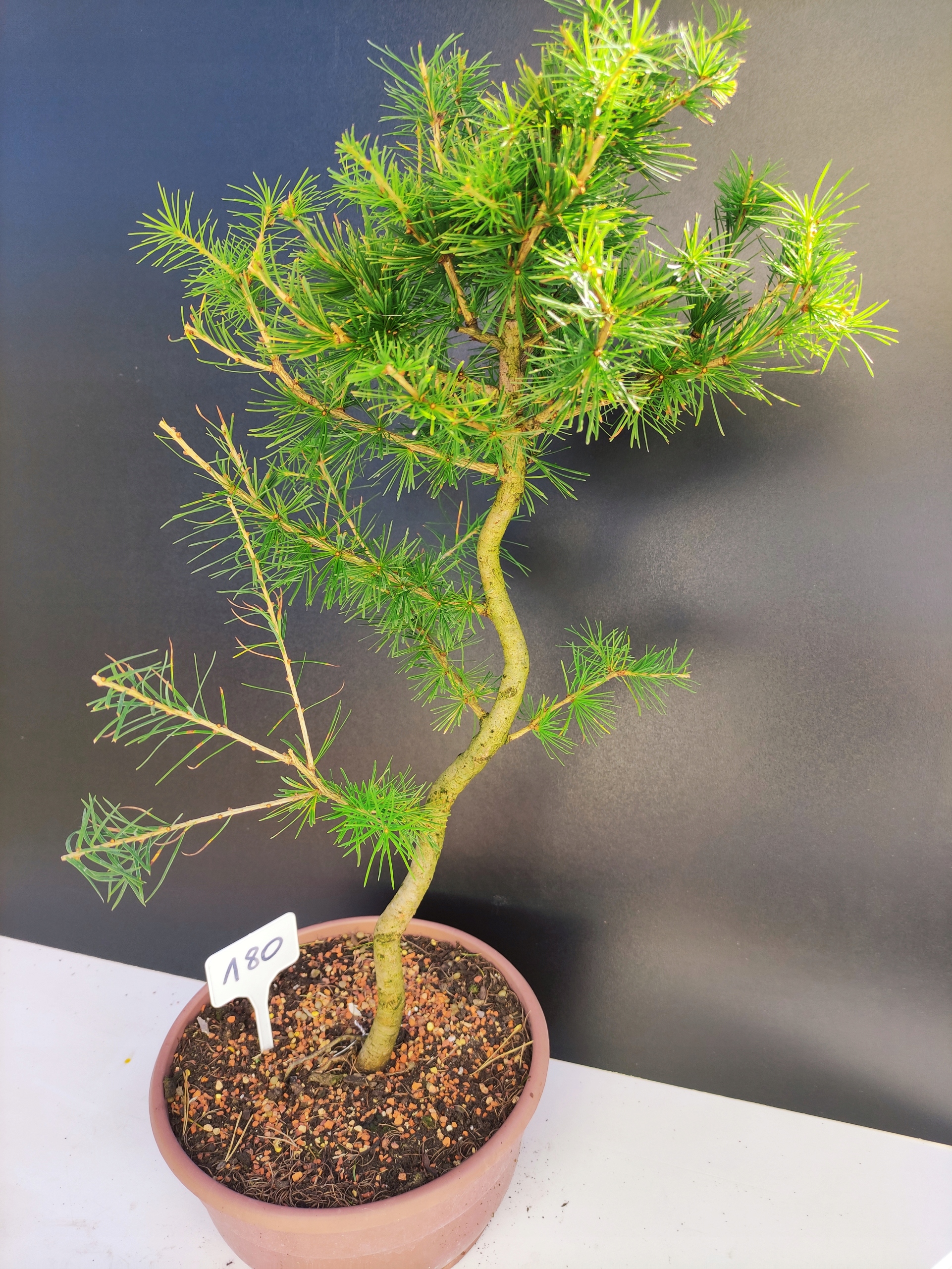 Każde nasze drzewko bonsai to unikalny egzemplarz, dlatego każde zostaje wystawione osobno, ponieważ traktujemy każde indywidualnie – od formowania po pielęgnację. Modrzewie te są w naszych rękach od 2021 roku i obecnie mają już 10 lat, dzięki czemu prezentują się wyjątkowo dojrzale i stabilnie.
