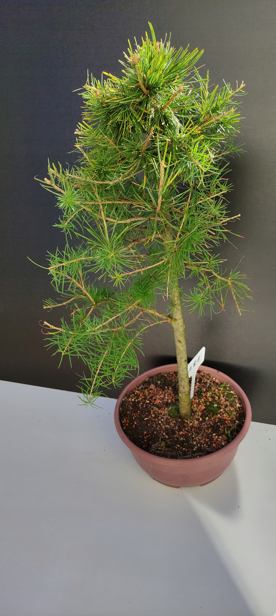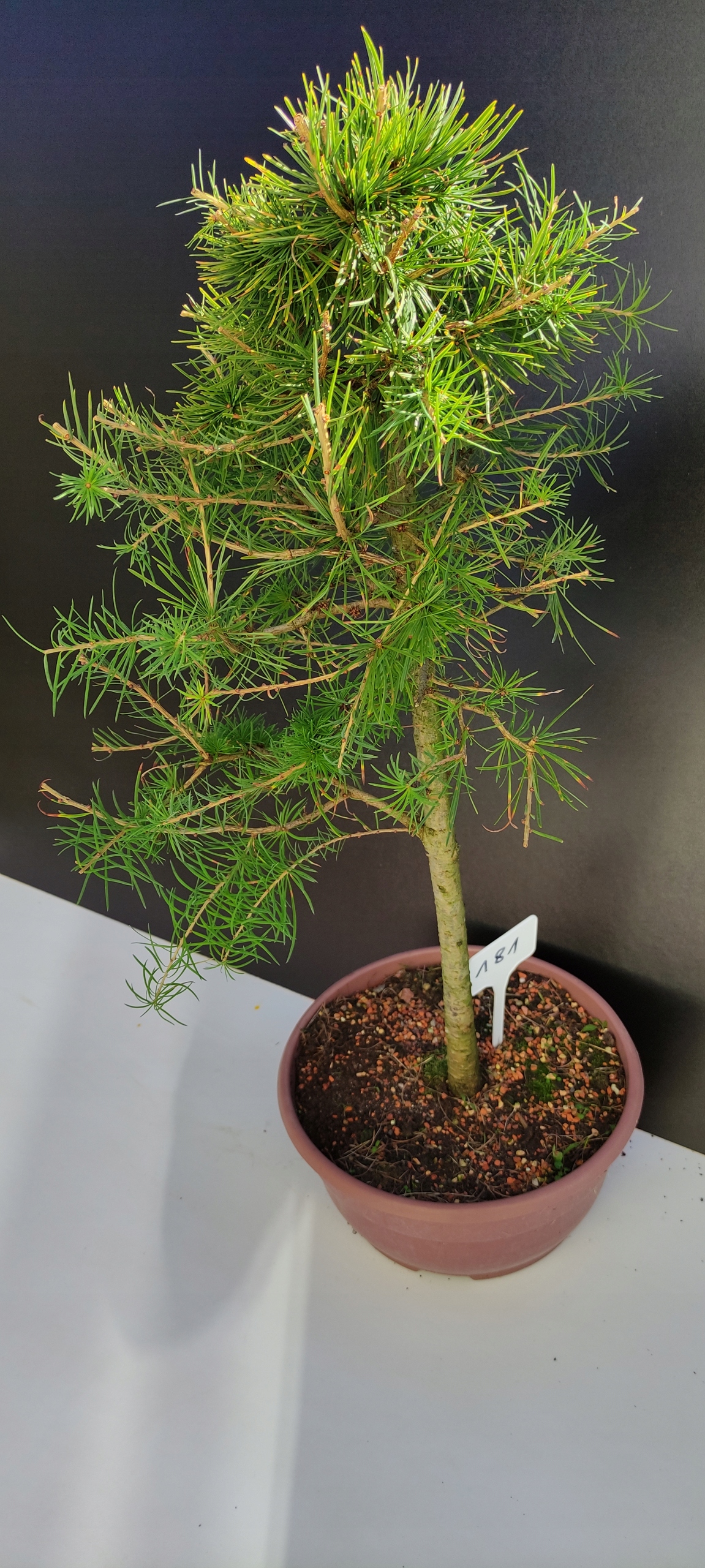 Każde nasze drzewko bonsai to unikalny egzemplarz, dlatego każde zostaje wystawione osobno, ponieważ traktujemy każde indywidualnie – od formowania po pielęgnację. Modrzewie te są w naszych rękach od 2021 roku i obecnie mają już 10 lat, dzięki czemu prezentują się wyjątkowo dojrzale i stabilnie.