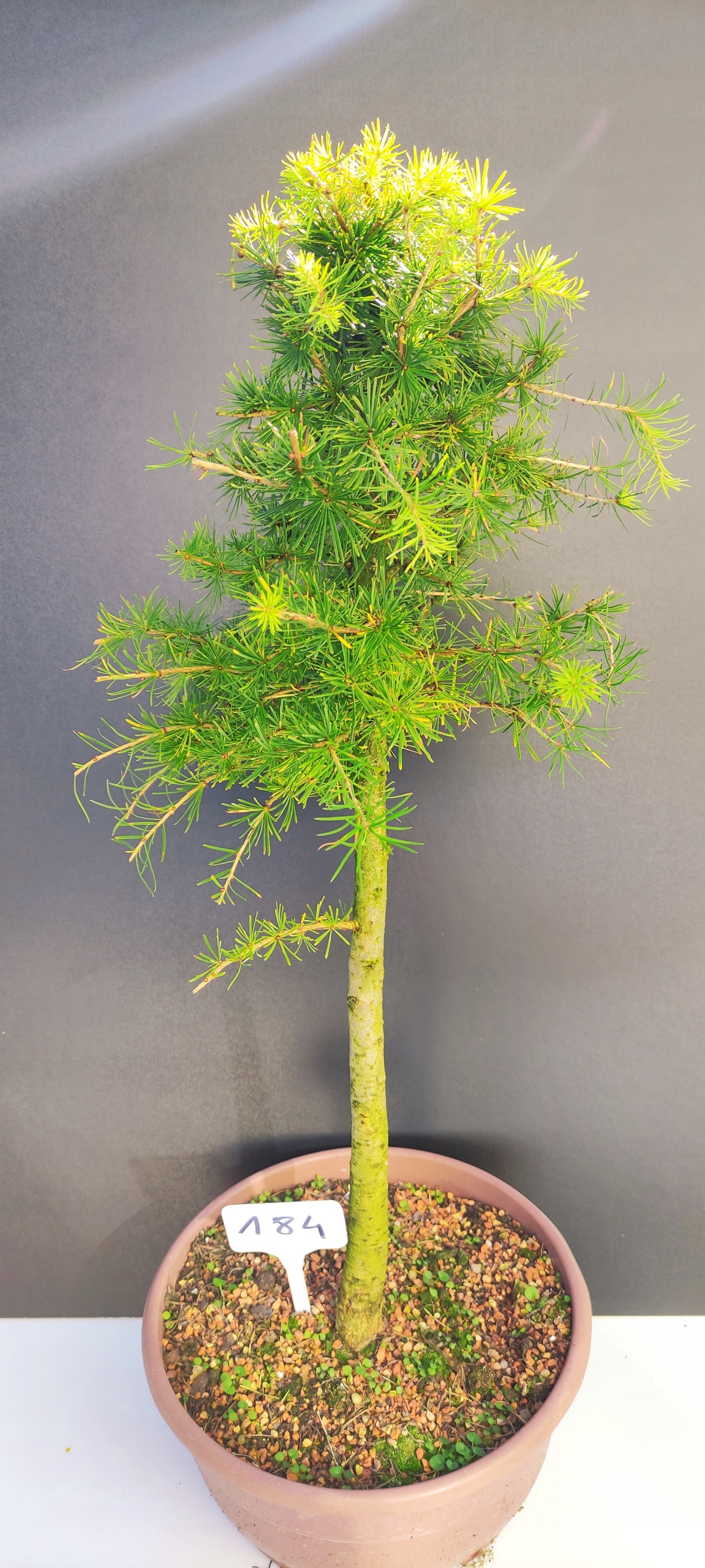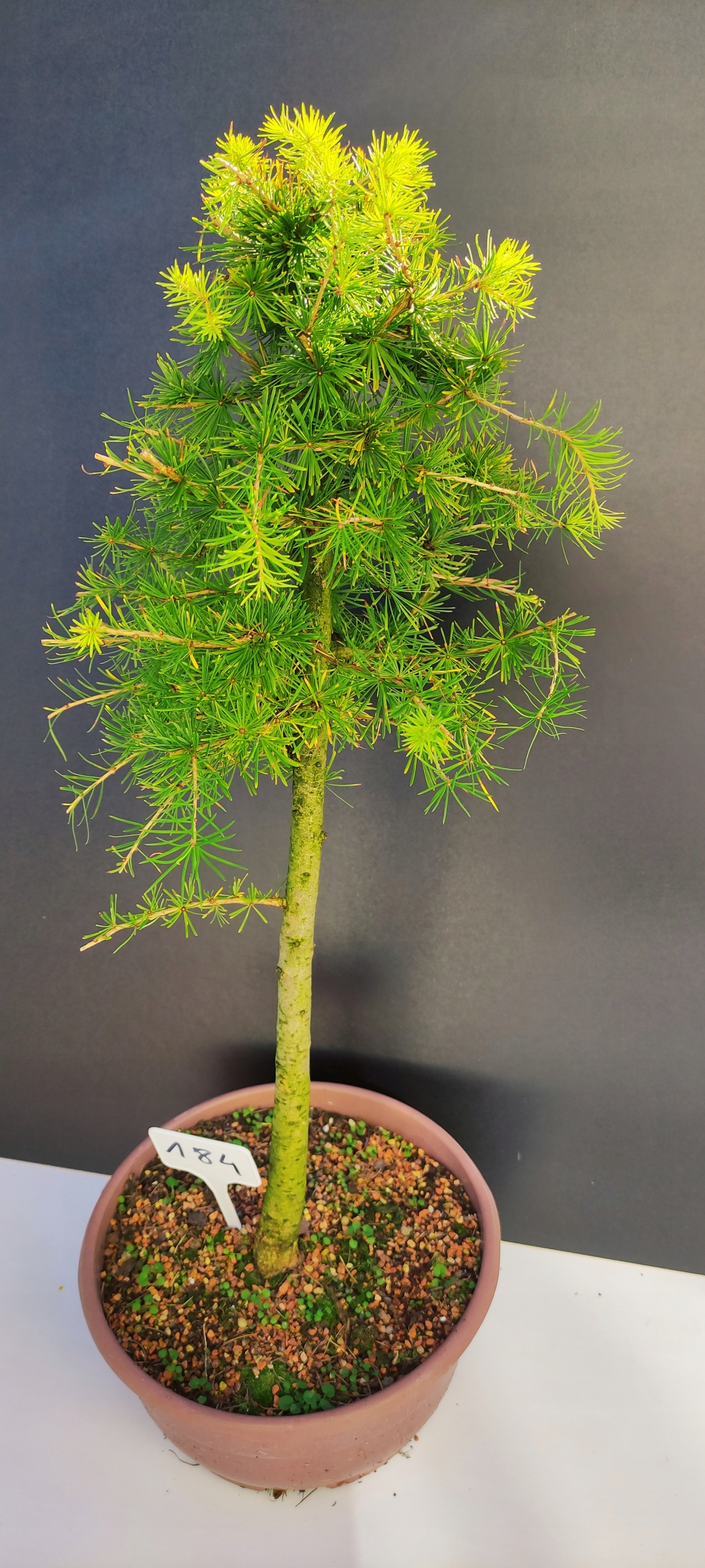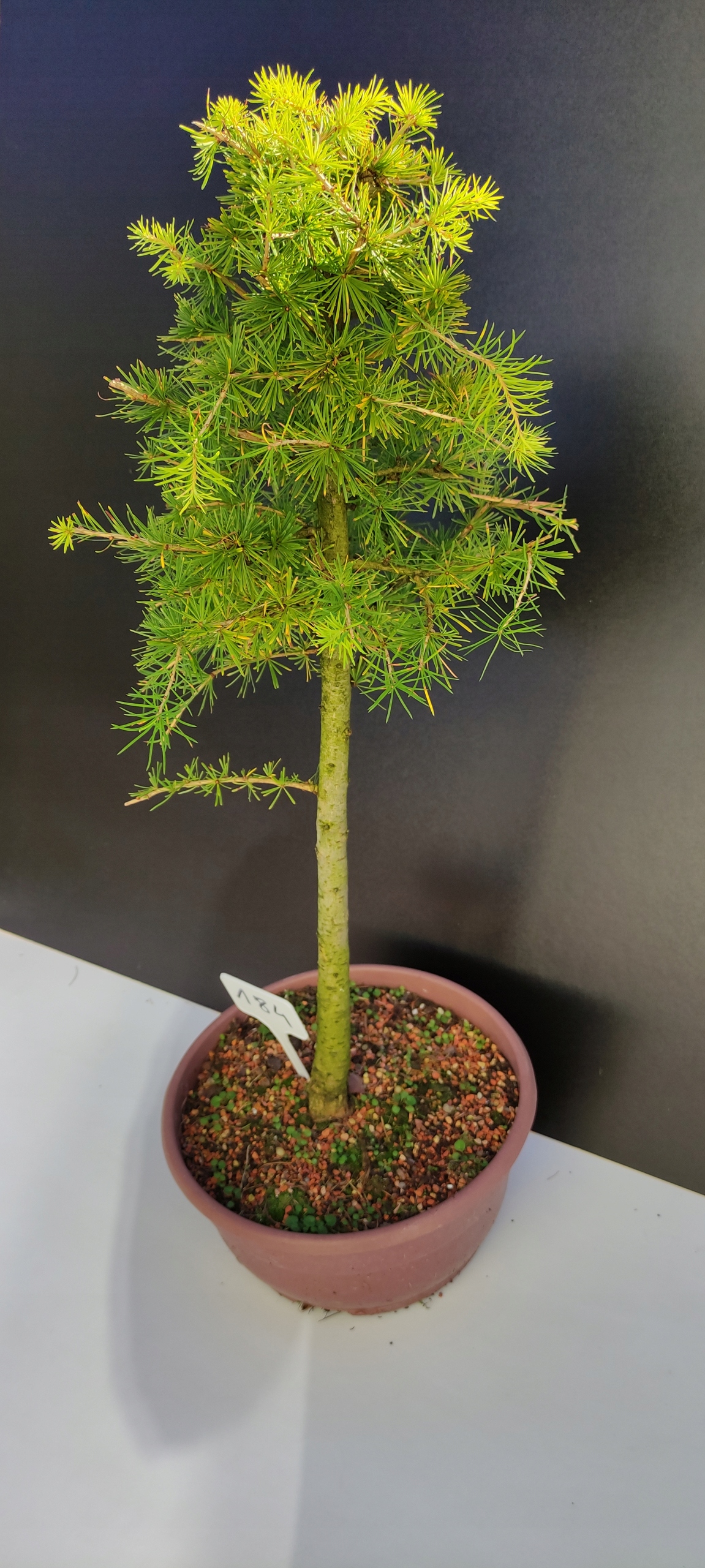 Każde nasze drzewko bonsai to unikalny egzemplarz, dlatego każde zostaje wystawione osobno, ponieważ traktujemy każde indywidualnie – od formowania po pielęgnację. Modrzewie te są w naszych rękach od 2021 roku i obecnie mają już 10 lat, dzięki czemu prezentują się wyjątkowo dojrzale i stabilnie.