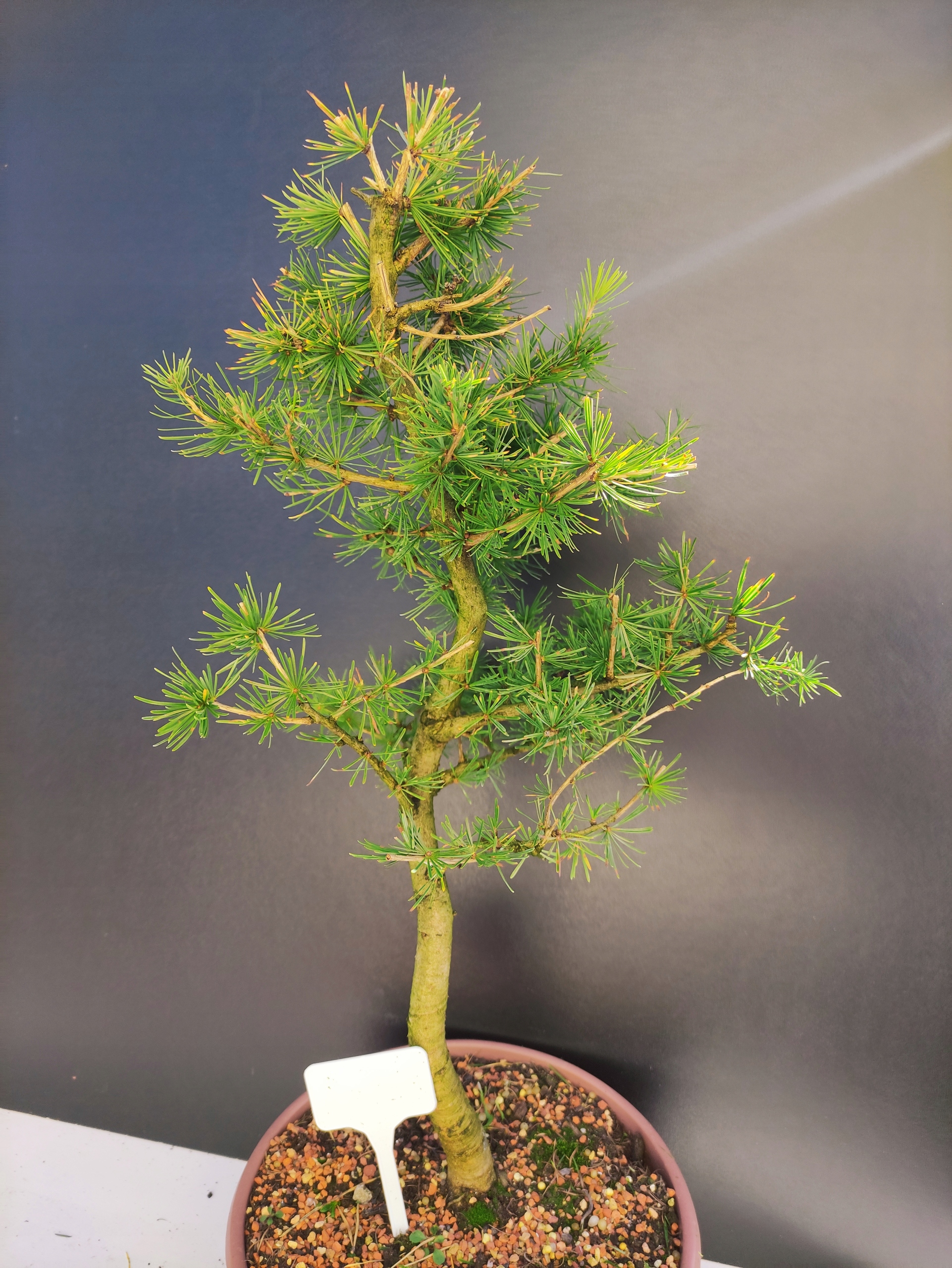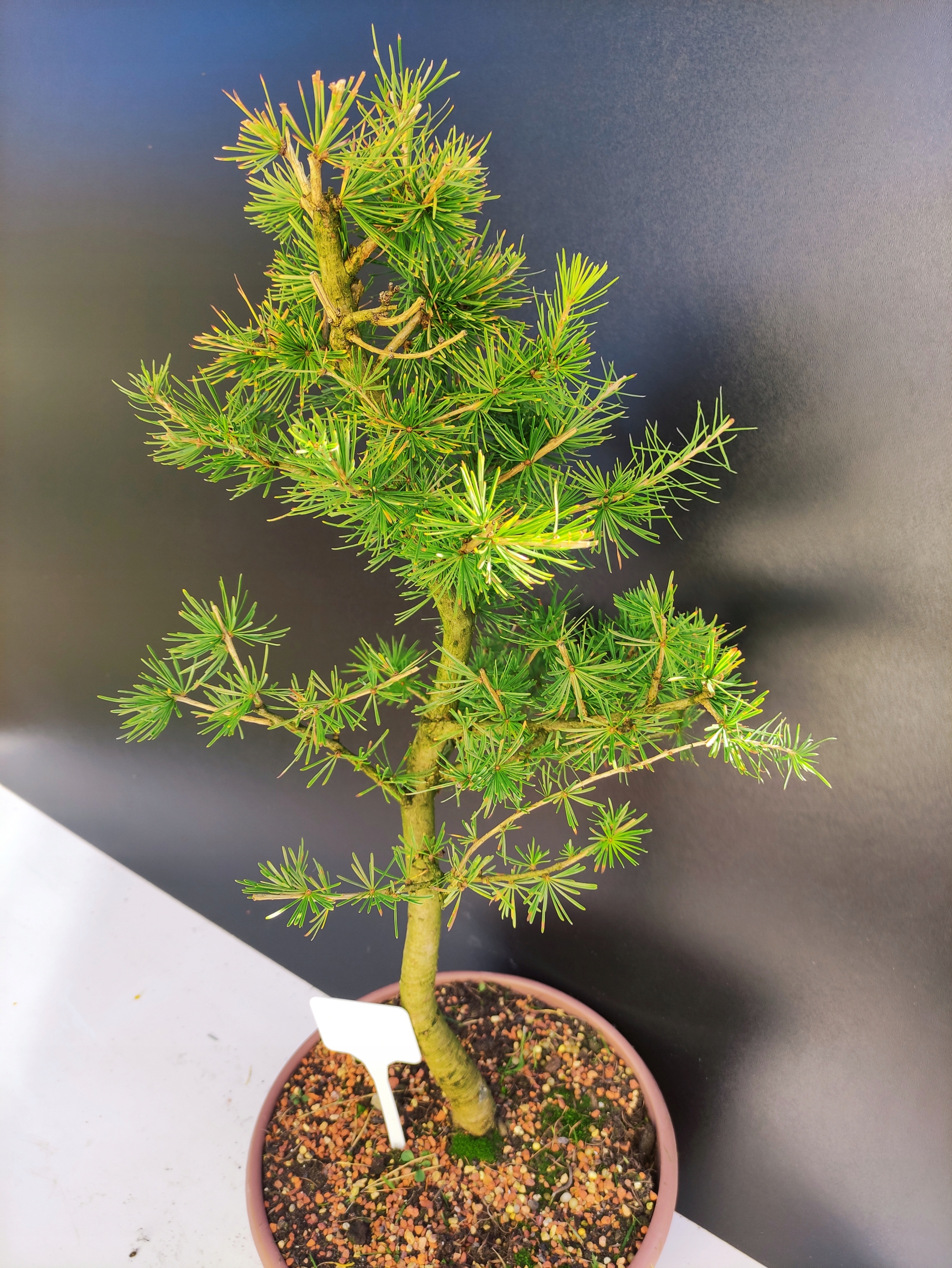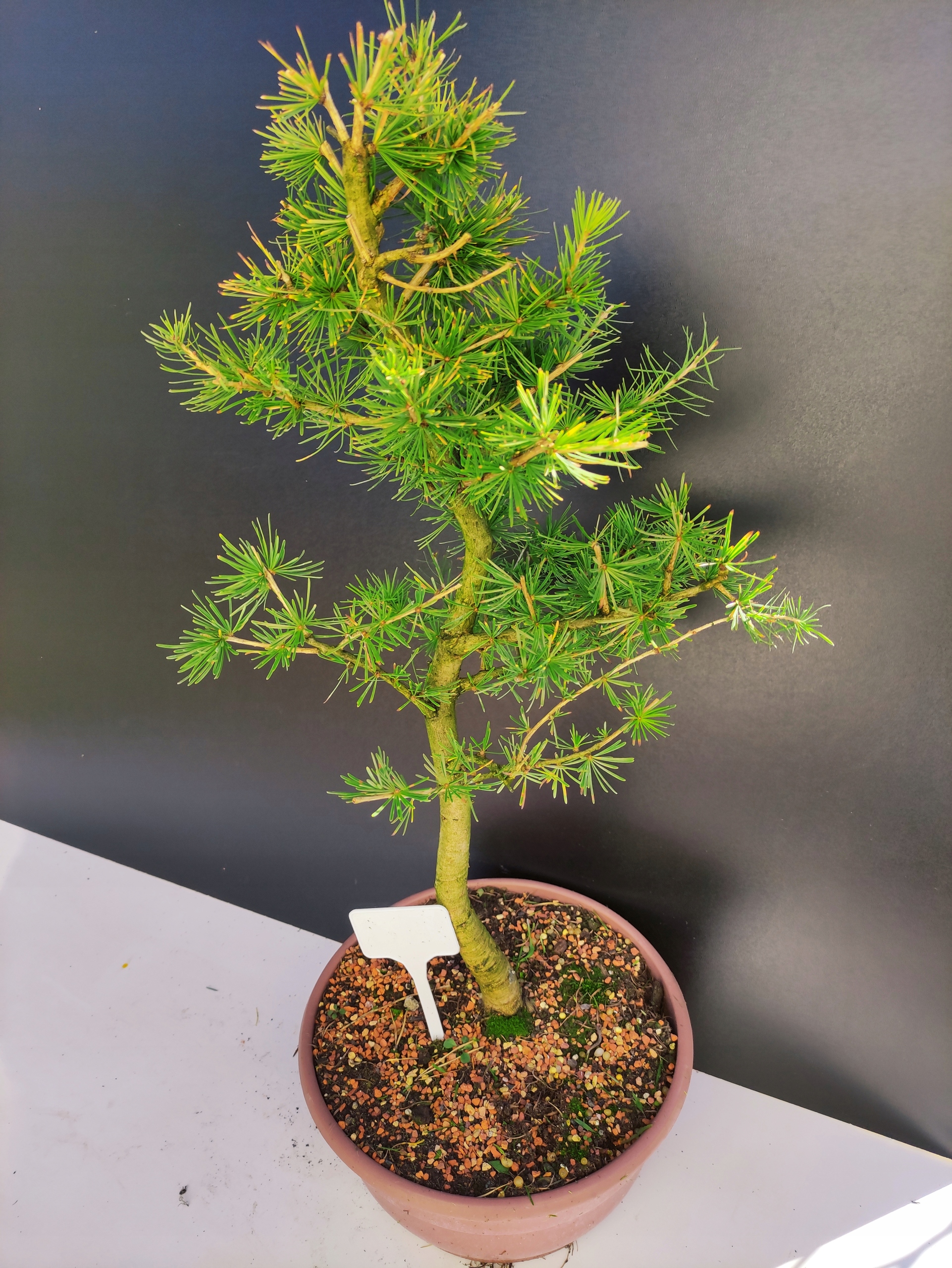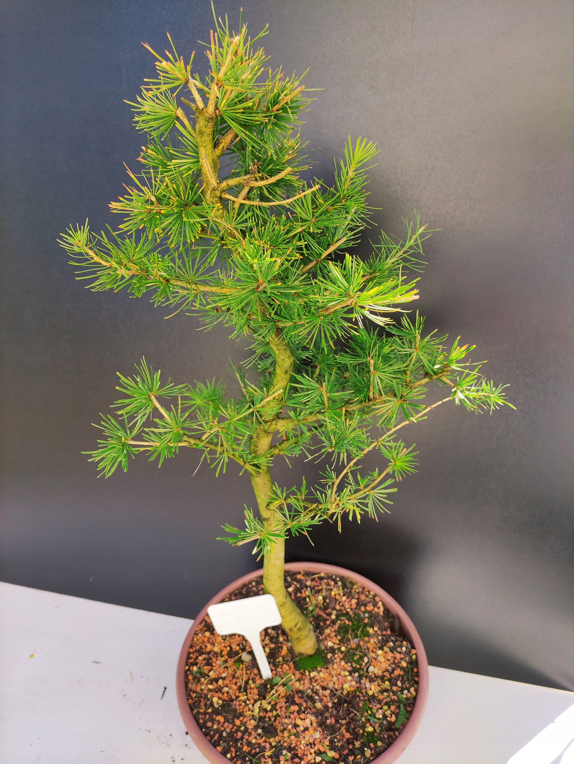 Każde nasze drzewko bonsai to unikalny egzemplarz, dlatego każde zostaje wystawione osobno, ponieważ traktujemy każde indywidualnie – od formowania po pielęgnację. Modrzewie te są w naszych rękach od 2021 roku i obecnie mają już 10 lat, dzięki czemu prezentują się wyjątkowo dojrzale i stabilnie.