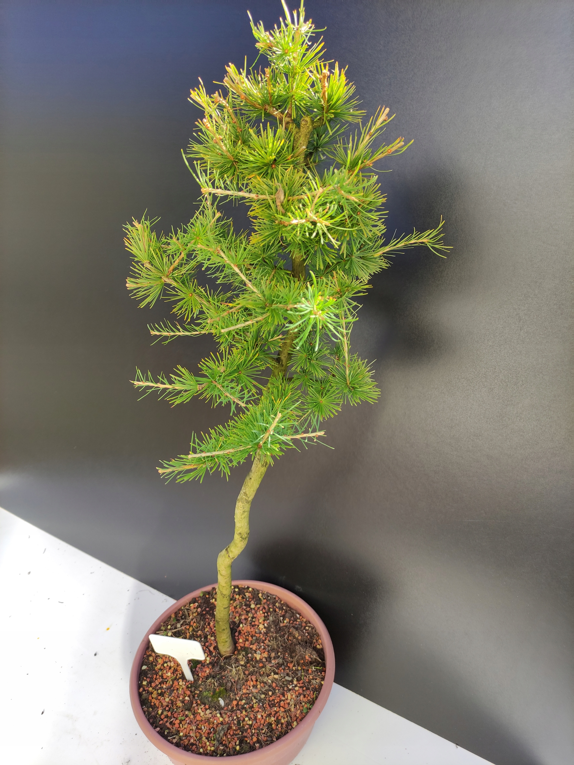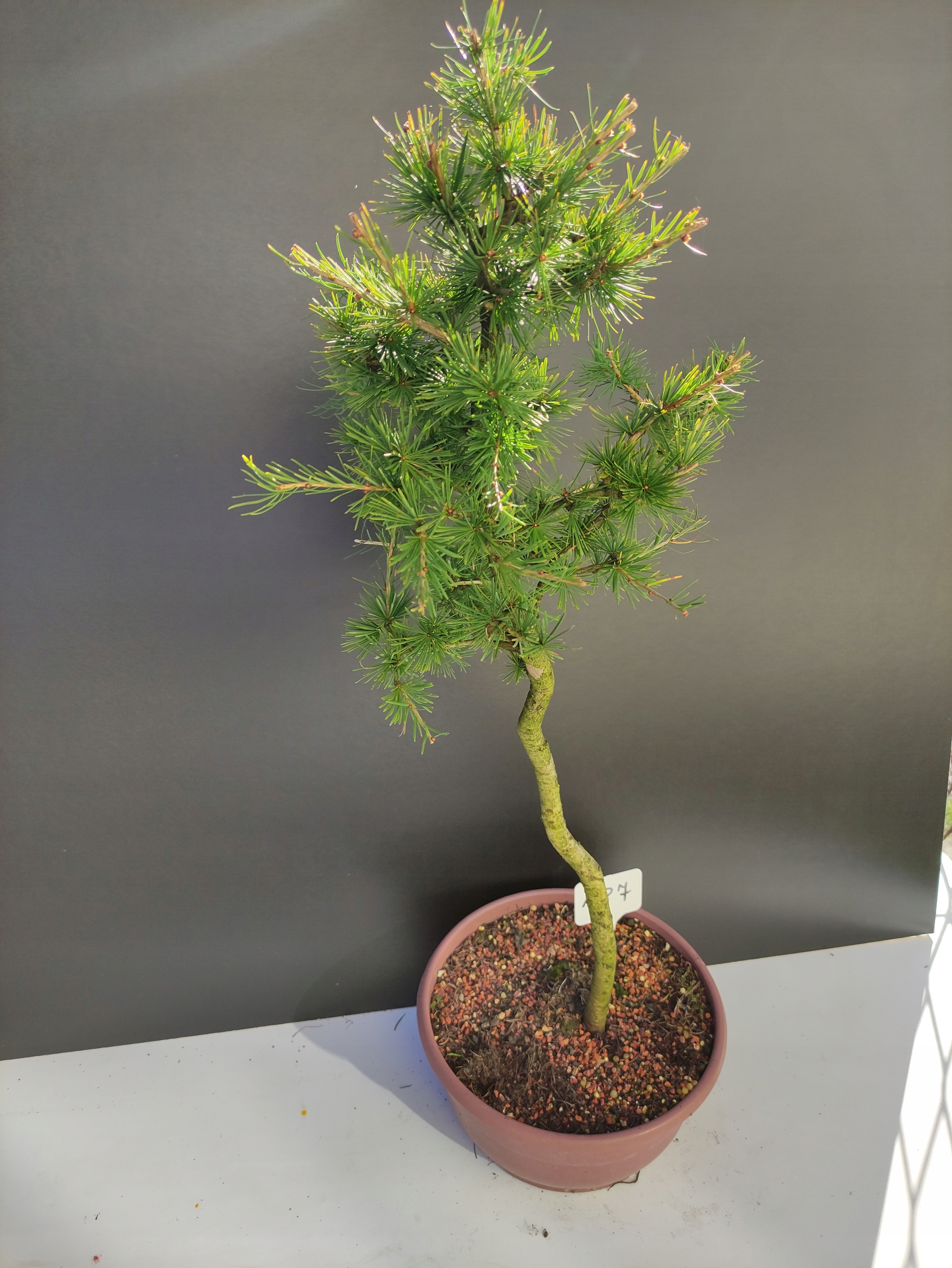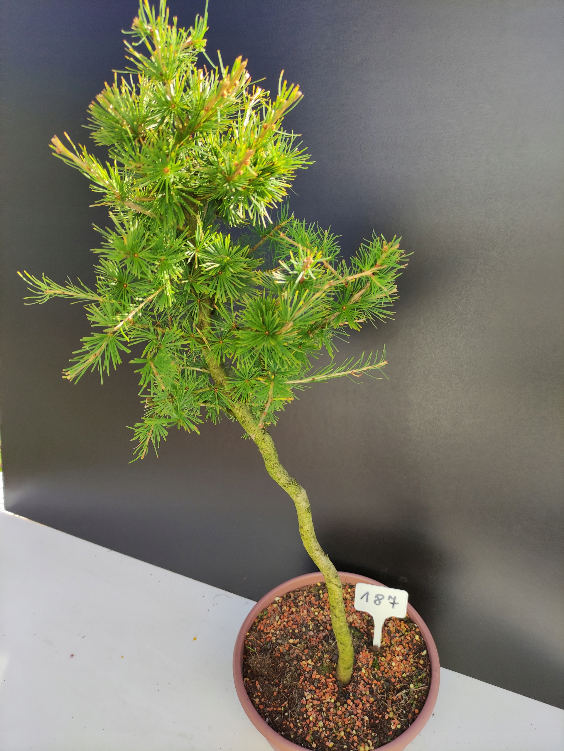 Każde nasze drzewko bonsai to unikalny egzemplarz, dlatego każde zostaje wystawione osobno, ponieważ traktujemy każde indywidualnie – od formowania po pielęgnację. Modrzewie te są w naszych rękach od 2021 roku i obecnie mają już 10 lat, dzięki czemu prezentują się wyjątkowo dojrzale i stabilnie.