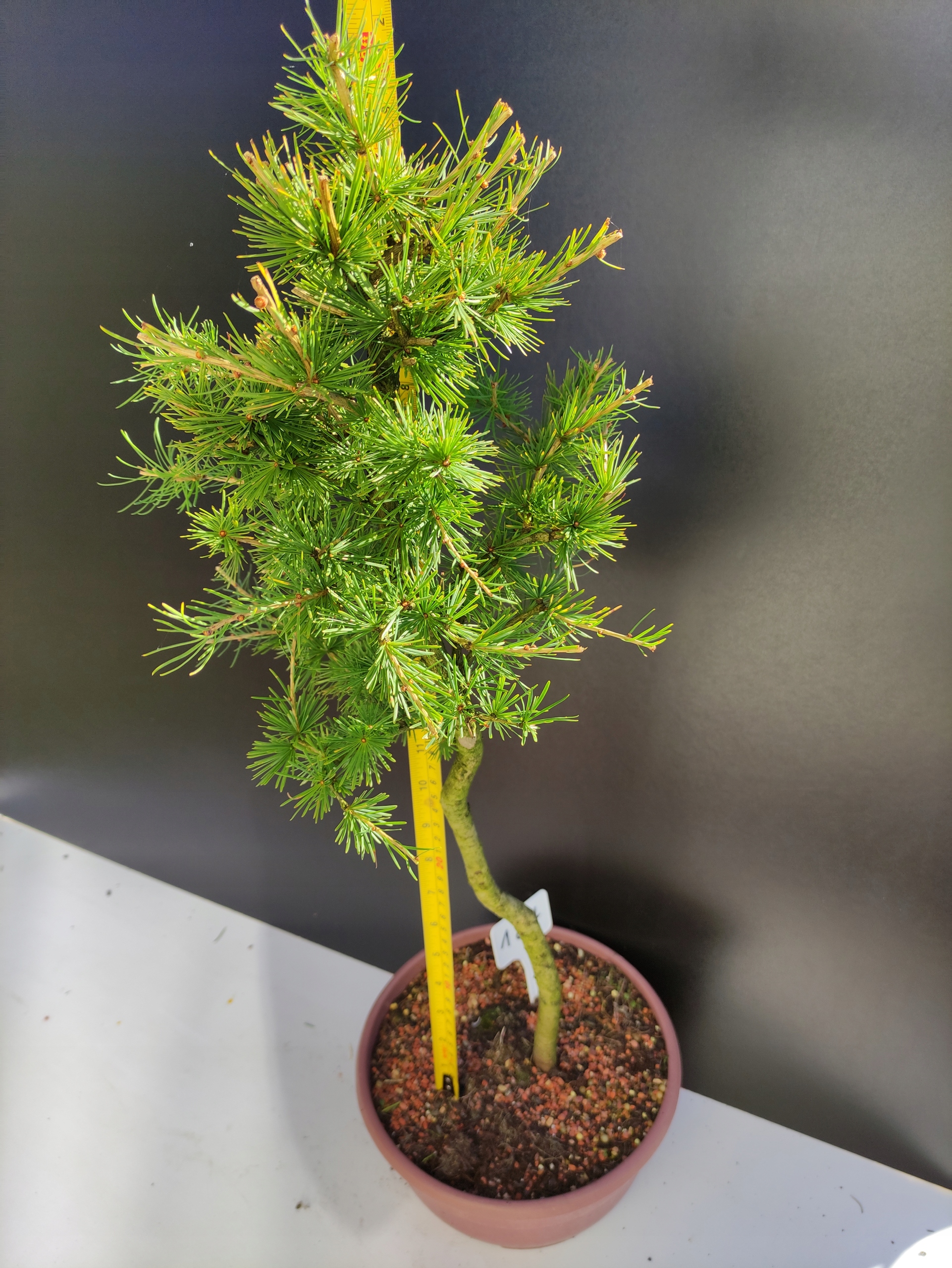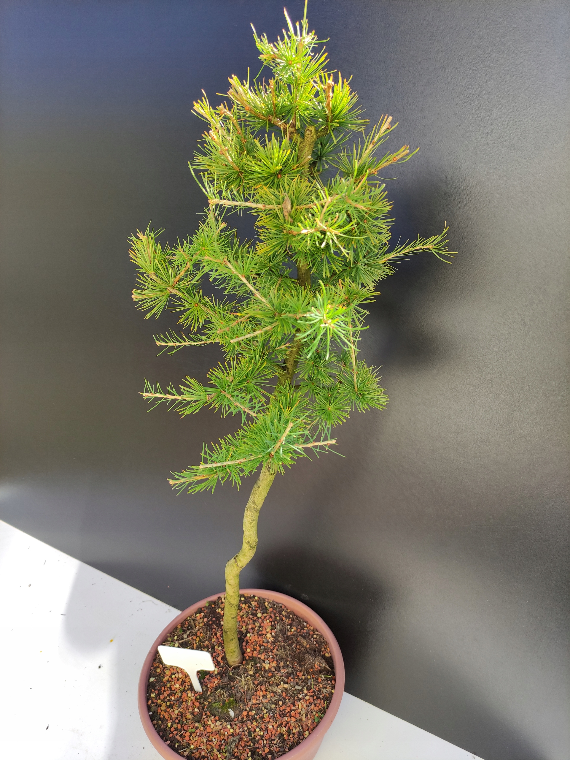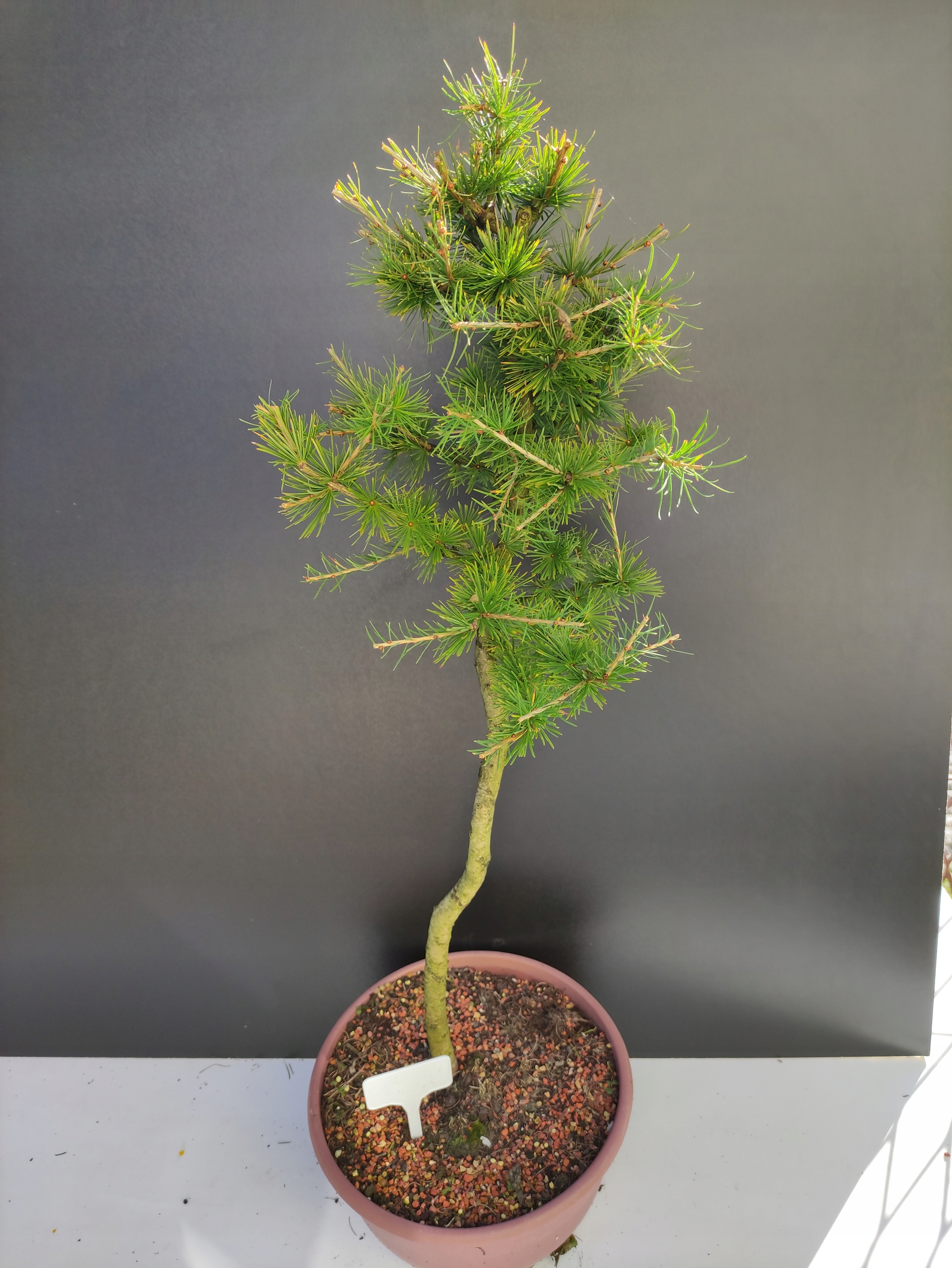 Każde nasze drzewko bonsai to unikalny egzemplarz, dlatego każde zostaje wystawione osobno, ponieważ traktujemy każde indywidualnie – od formowania po pielęgnację. Modrzewie te są w naszych rękach od 2021 roku i obecnie mają już 10 lat, dzięki czemu prezentują się wyjątkowo dojrzale i stabilnie.