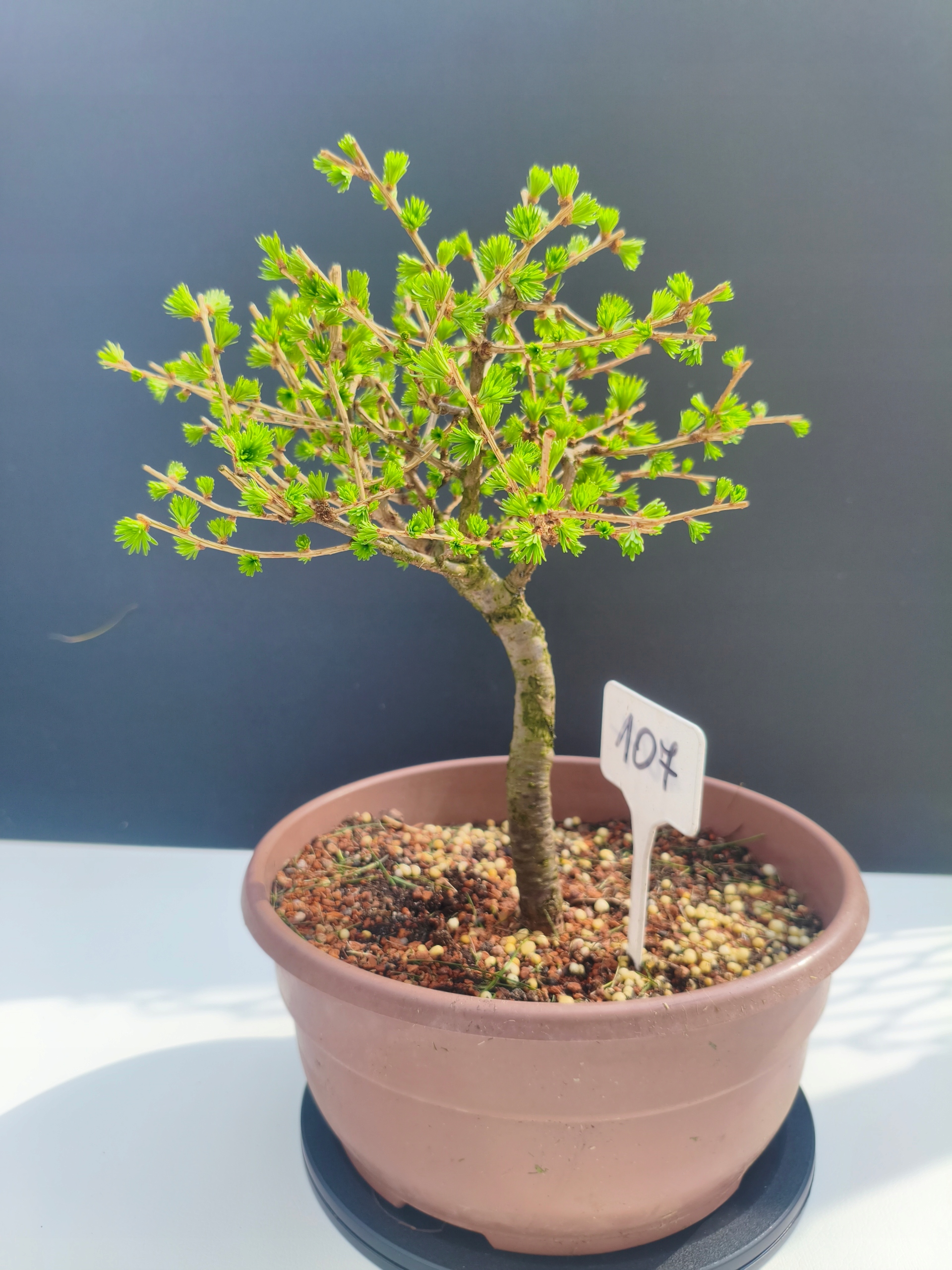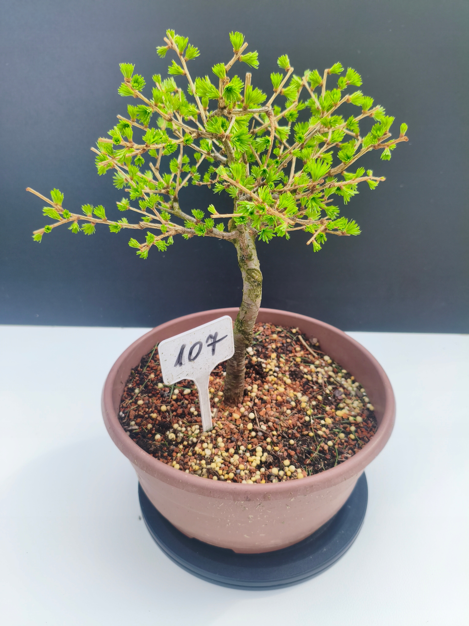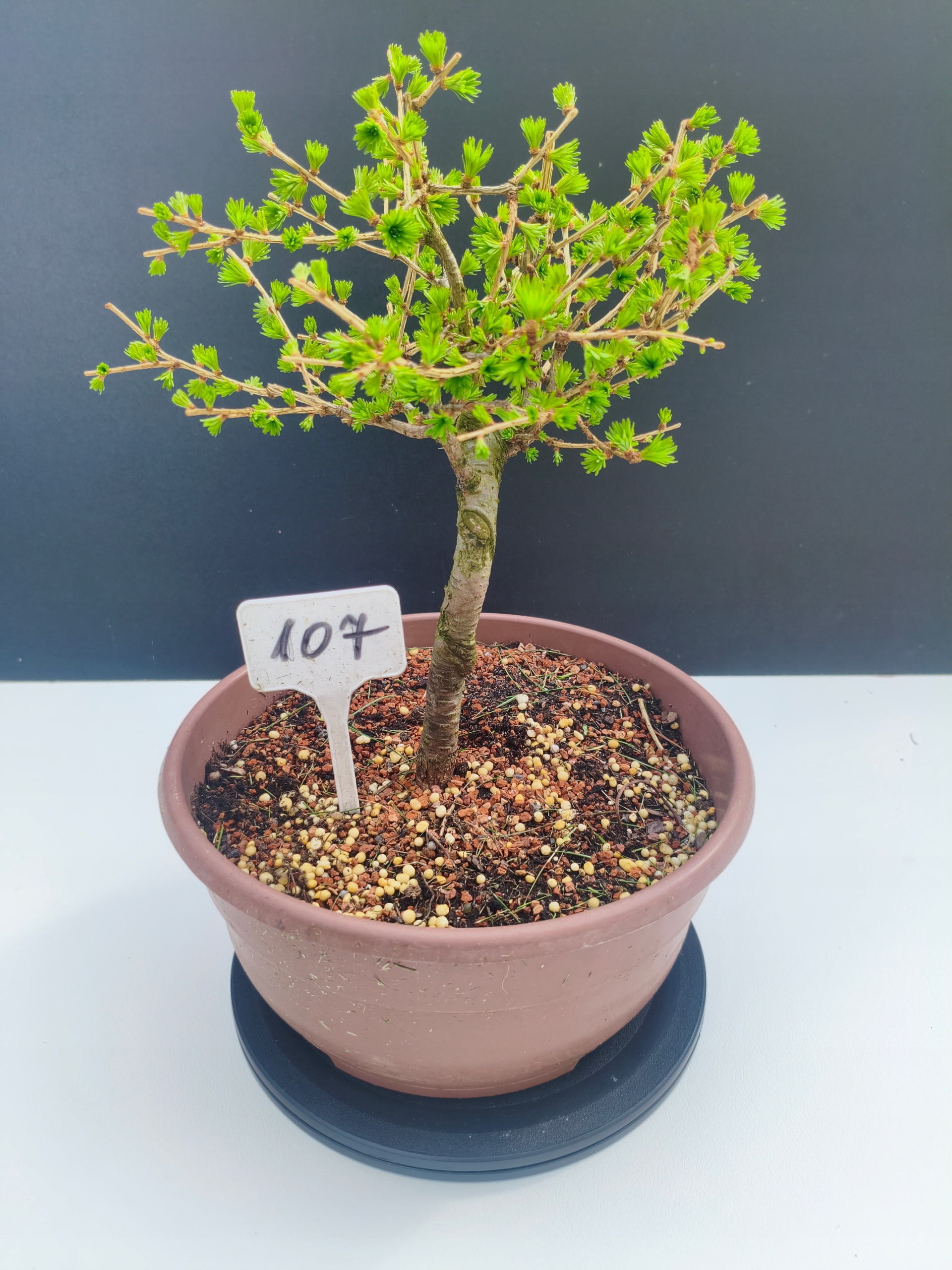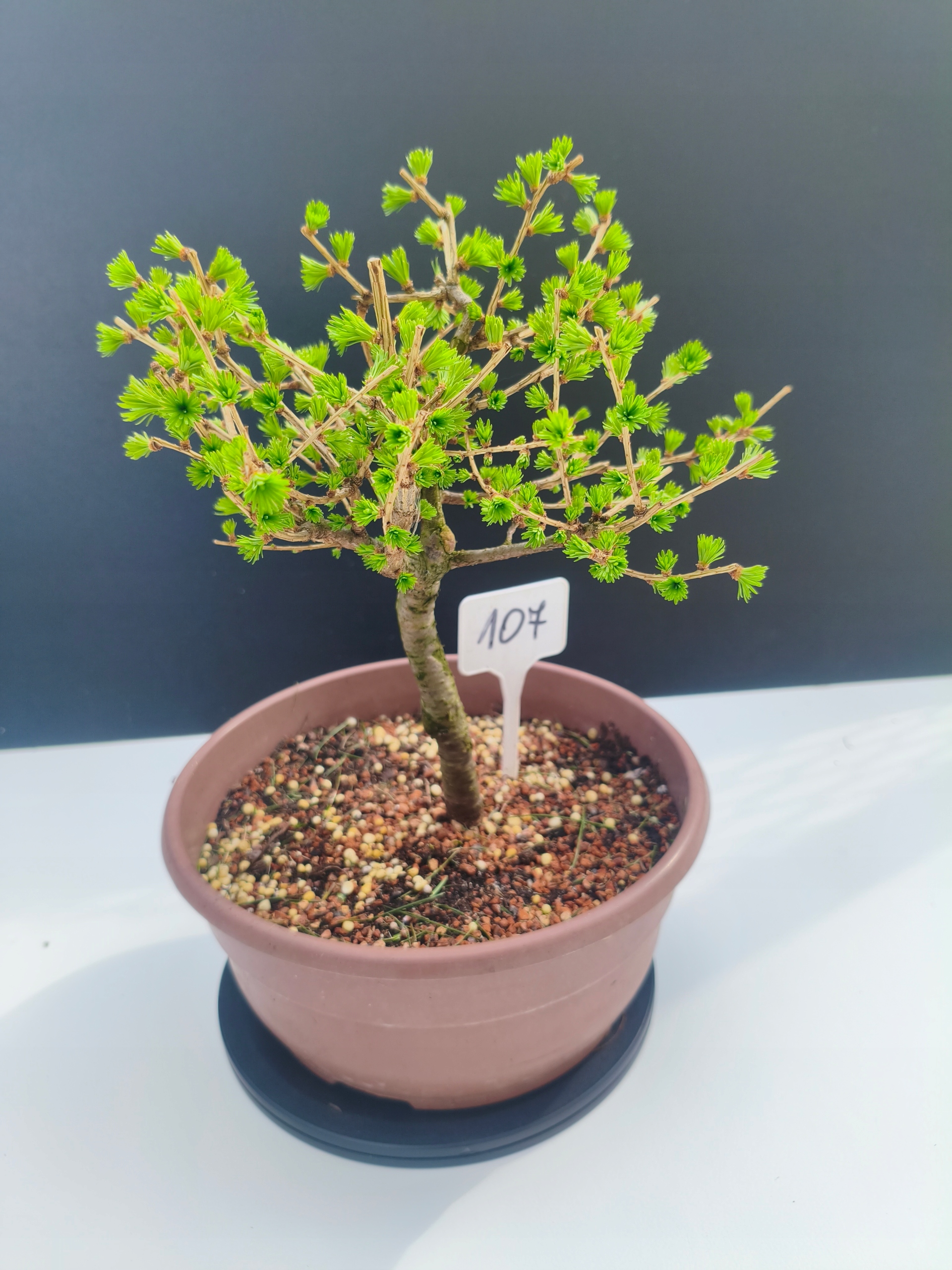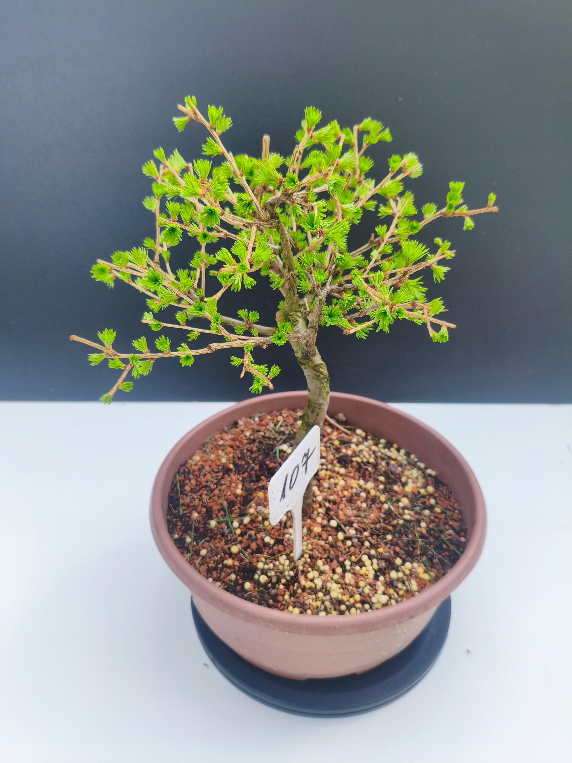 Każde nasze drzewko bonsai to unikalny egzemplarz, dlatego każde zostaje wystawione osobno, ponieważ traktujemy każde indywidualnie – od formowania po pielęgnację. Modrzewie te są w naszych rękach od 2021 roku i obecnie mają już 11 lat, dzięki czemu prezentują się wyjątkowo dojrzale i stabilnie.