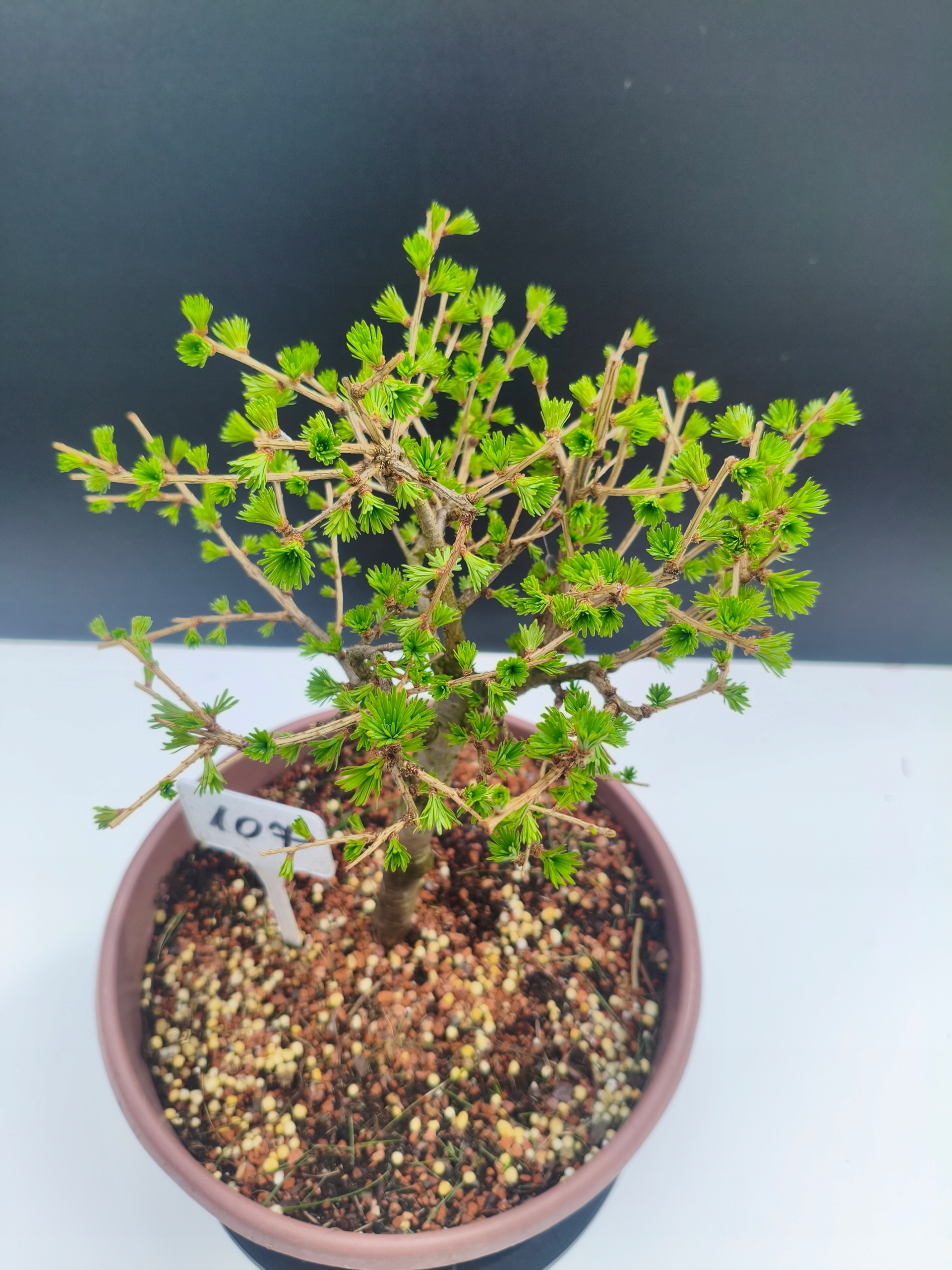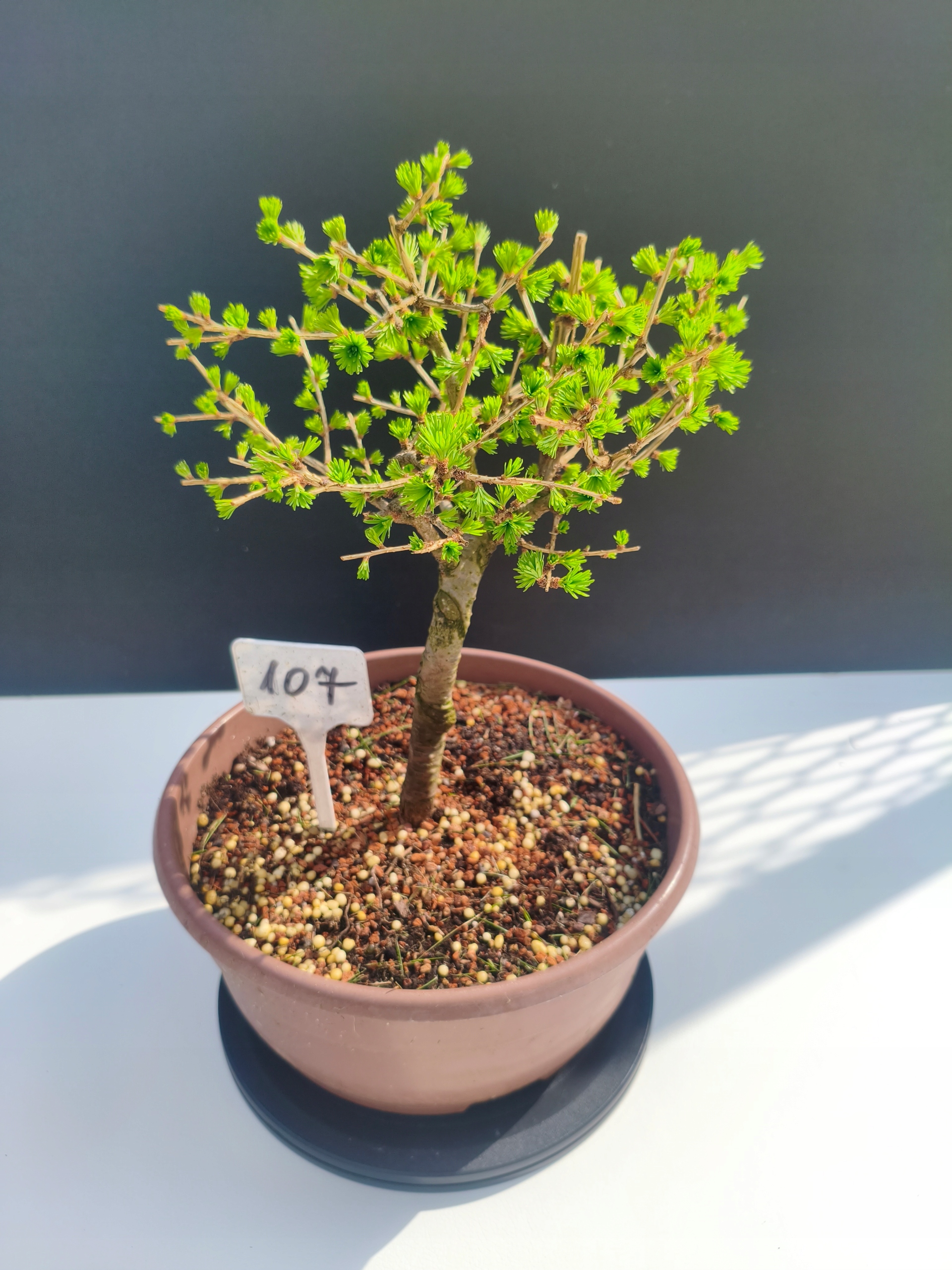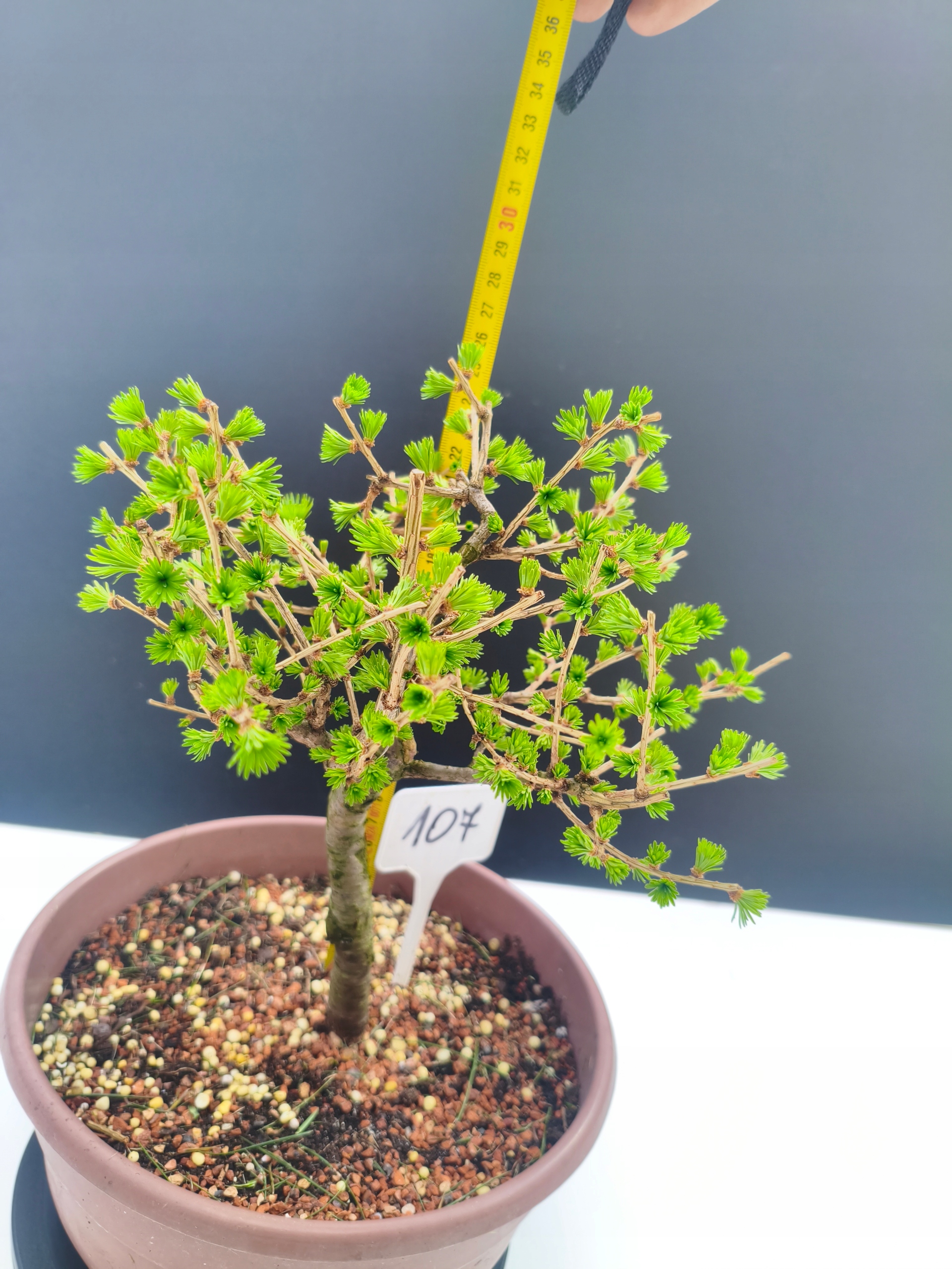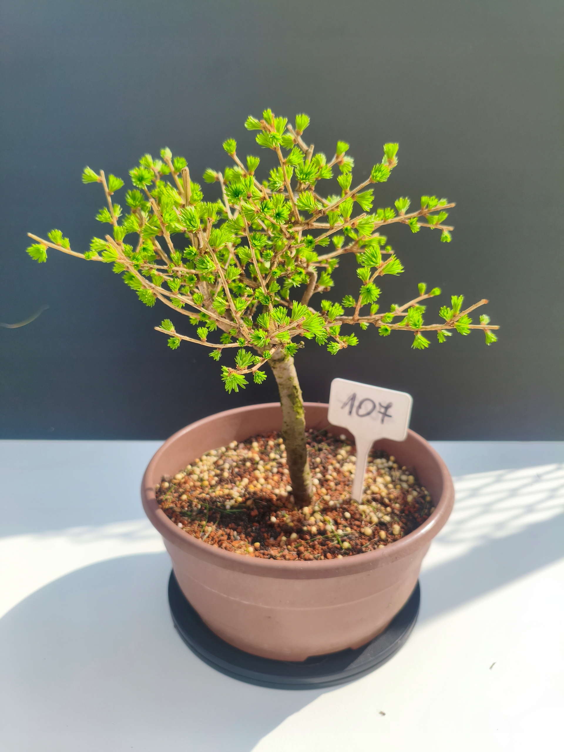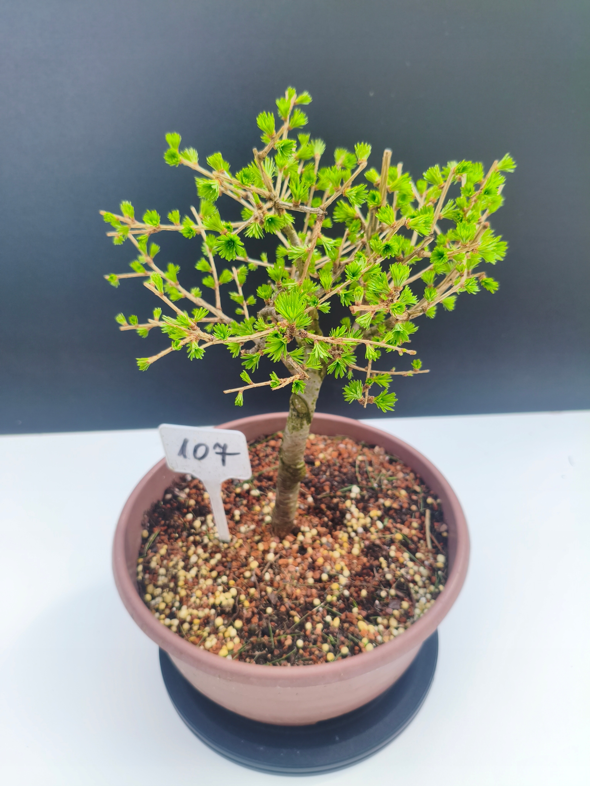 Każde nasze drzewko bonsai to unikalny egzemplarz, dlatego każde zostaje wystawione osobno, ponieważ traktujemy każde indywidualnie – od formowania po pielęgnację. Modrzewie te są w naszych rękach od 2021 roku i obecnie mają już 11 lat, dzięki czemu prezentują się wyjątkowo dojrzale i stabilnie.