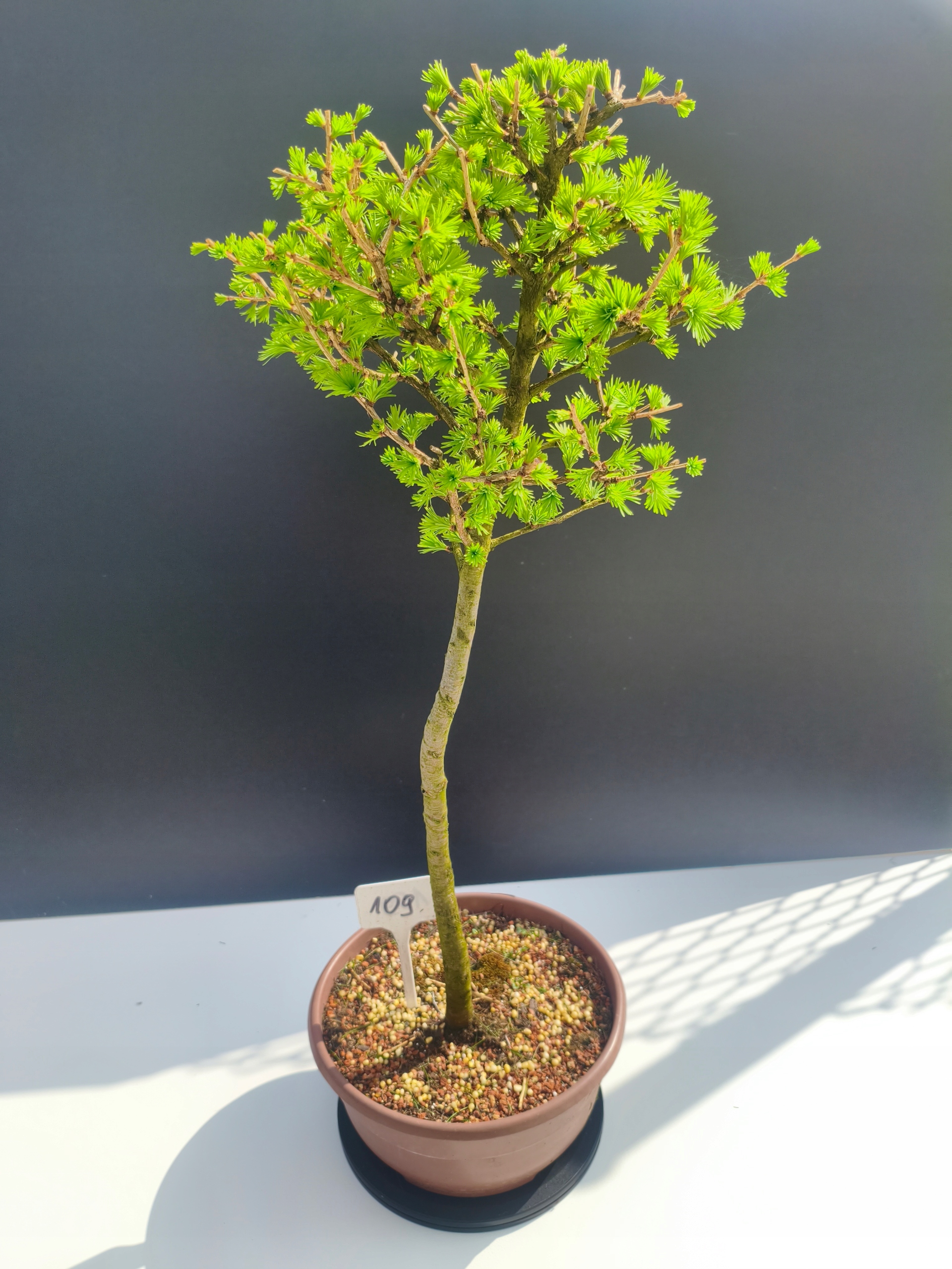 Każde nasze drzewko bonsai to unikalny egzemplarz, dlatego każde zostaje wystawione osobno, ponieważ traktujemy każde indywidualnie – od formowania po pielęgnację. Modrzewie te są w naszych rękach od 2021 roku i obecnie mają już 11 lat, dzięki czemu prezentują się wyjątkowo dojrzale i stabilnie.