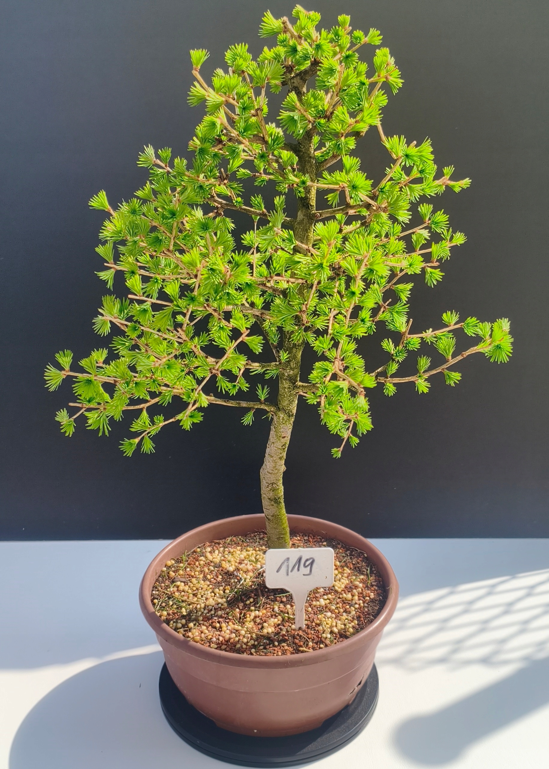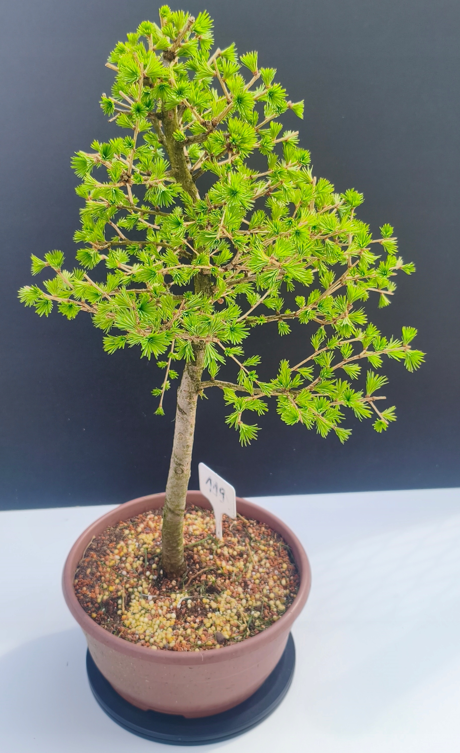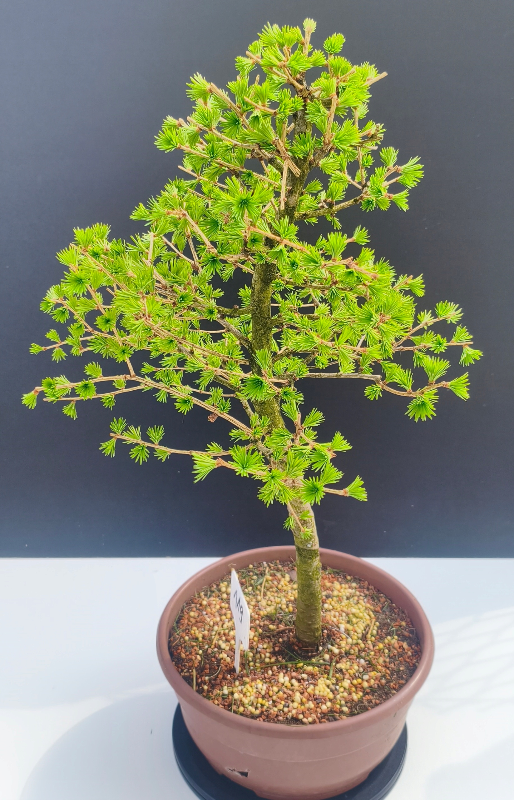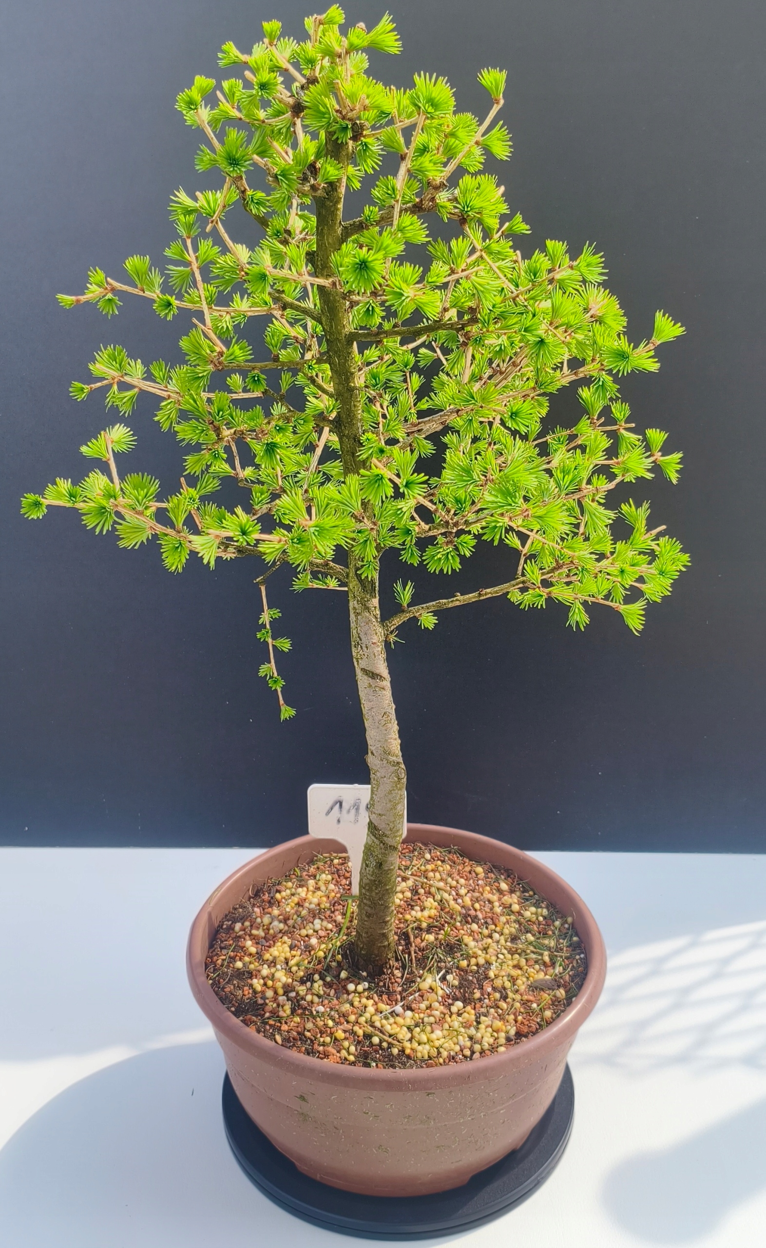 Każde nasze drzewko bonsai to unikalny egzemplarz, dlatego każde zostaje wystawione osobno, ponieważ traktujemy każde indywidualnie – od formowania po pielęgnację. Modrzewie te są w naszych rękach od 2021 roku i obecnie mają już 11 lat, dzięki czemu prezentują się wyjątkowo dojrzale i stabilnie.