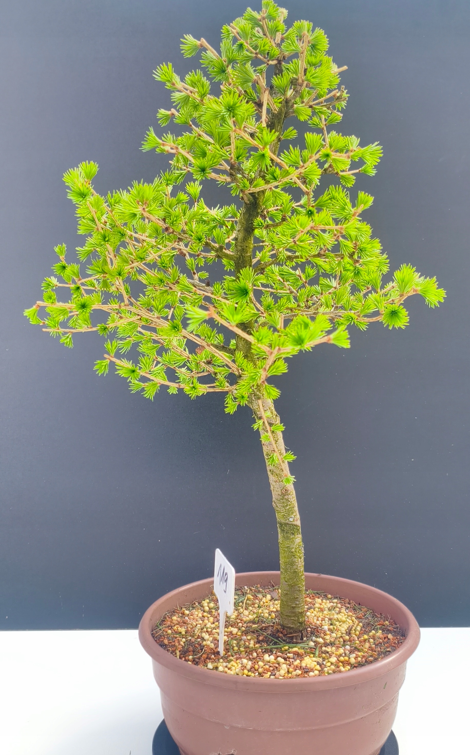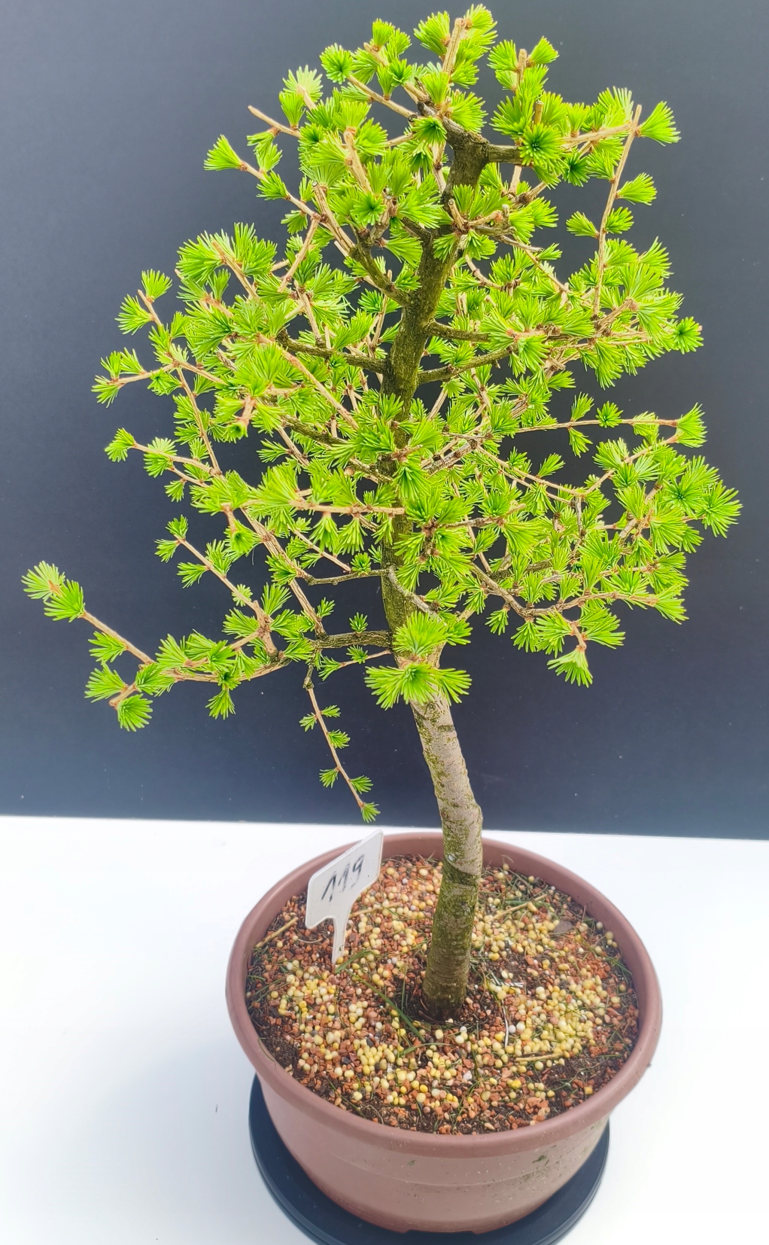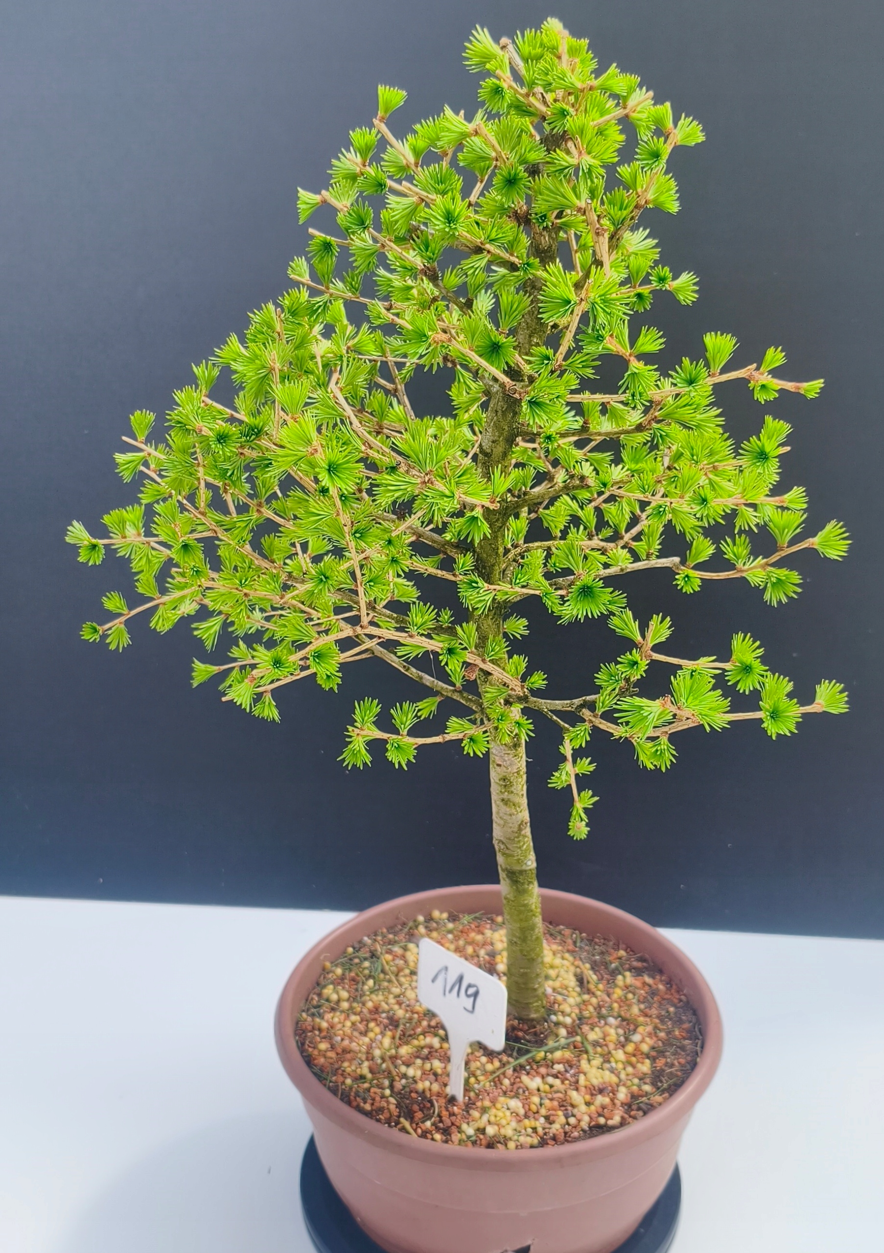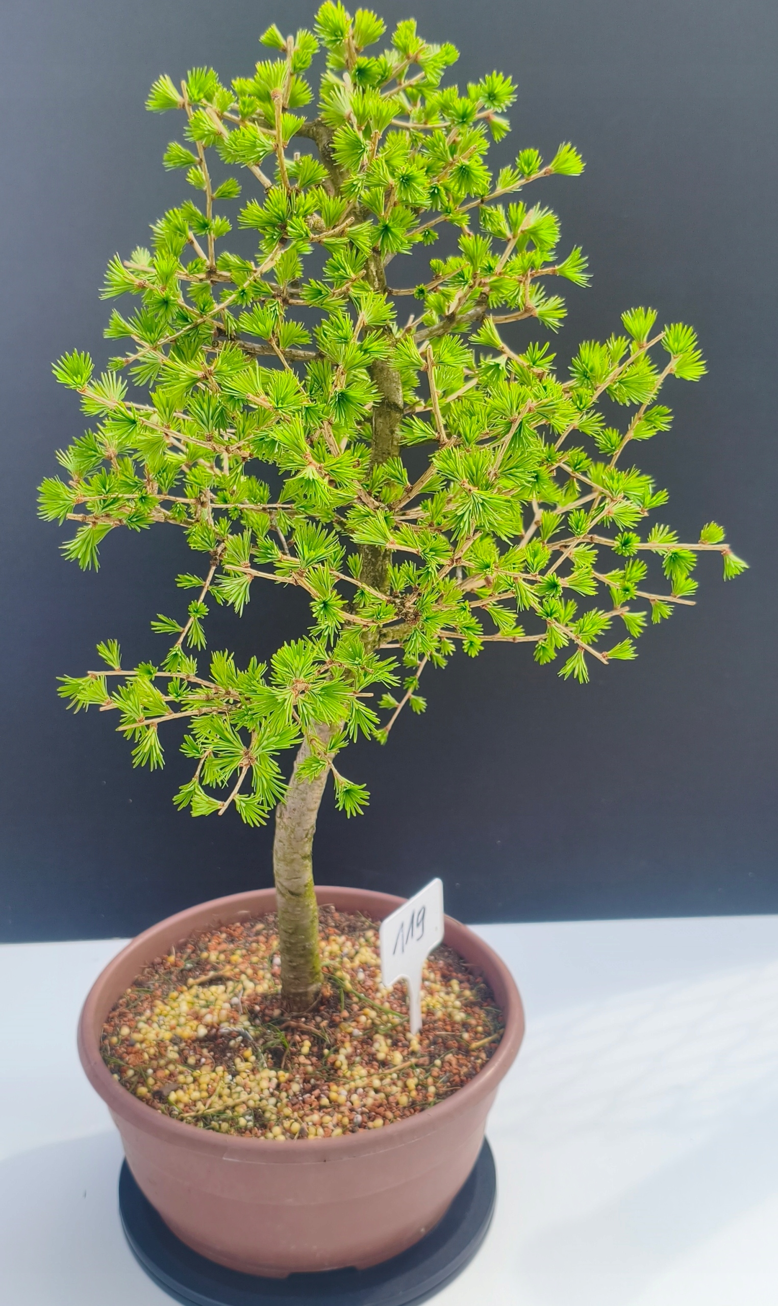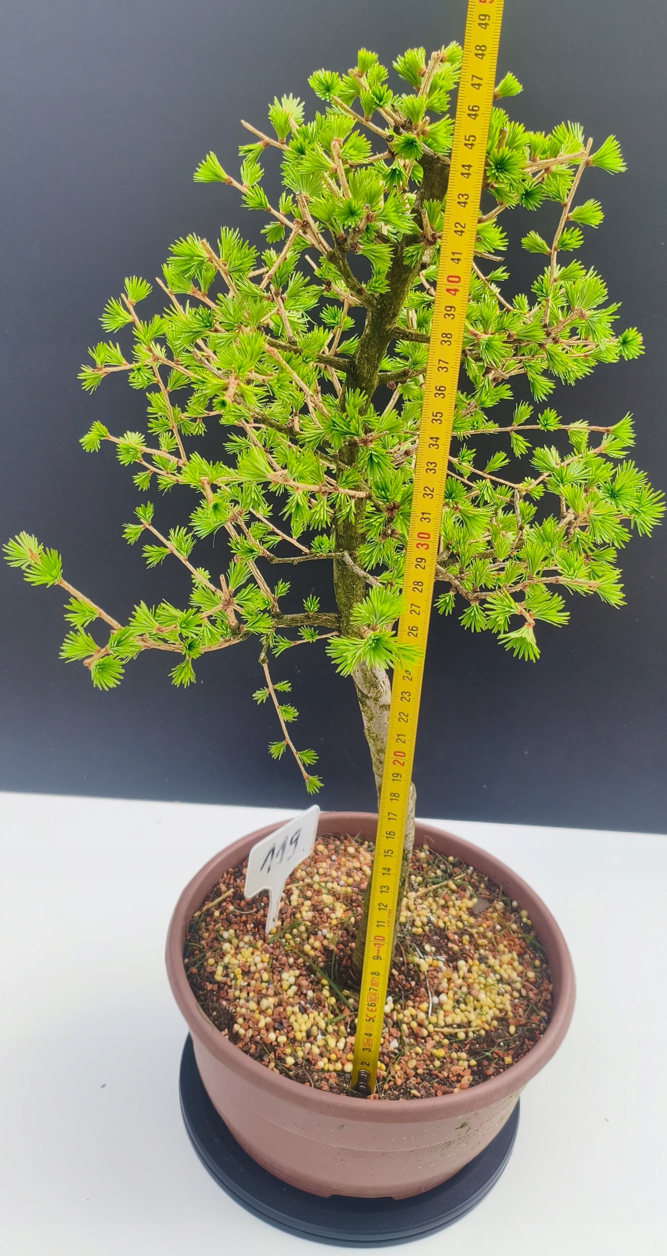 Każde nasze drzewko bonsai to unikalny egzemplarz, dlatego każde zostaje wystawione osobno, ponieważ traktujemy każde indywidualnie – od formowania po pielęgnację. Modrzewie te są w naszych rękach od 2021 roku i obecnie mają już 11 lat, dzięki czemu prezentują się wyjątkowo dojrzale i stabilnie.