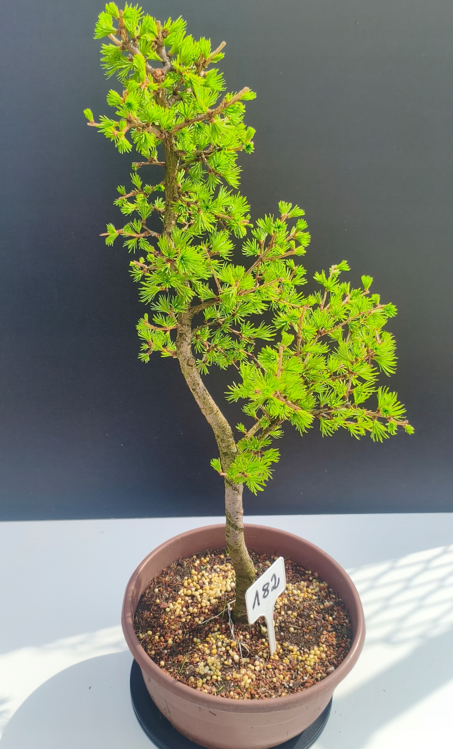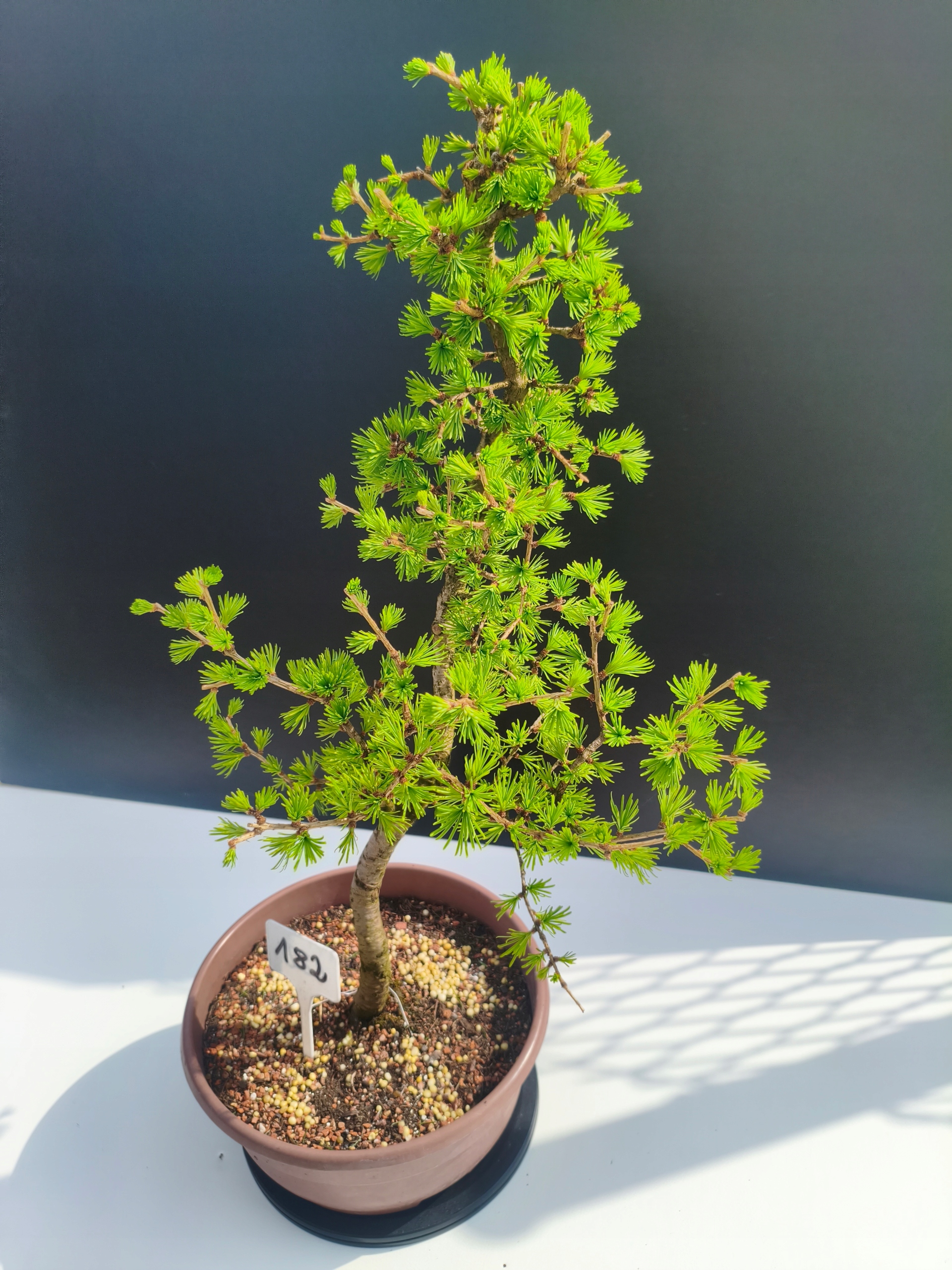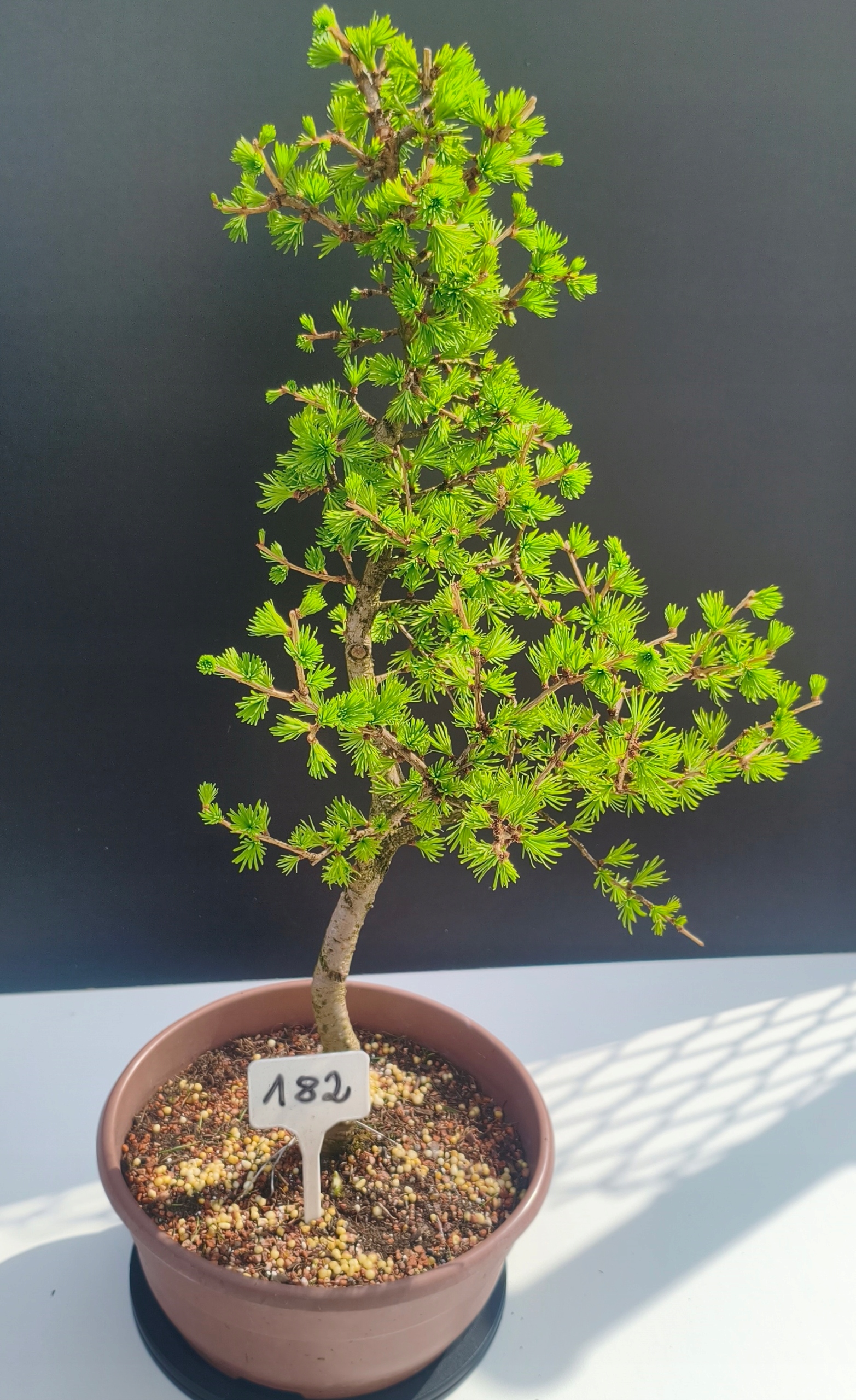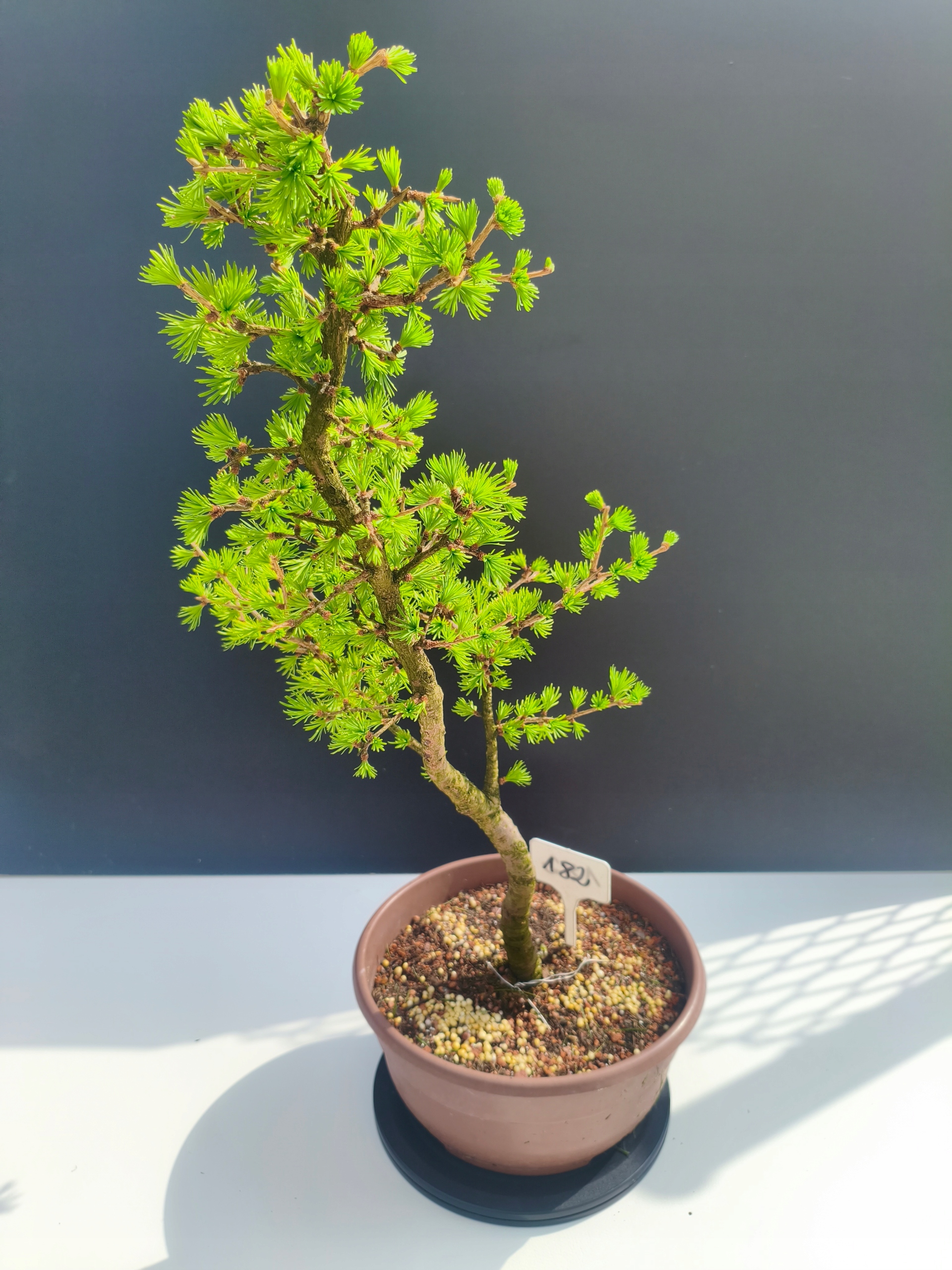 Każde nasze drzewko bonsai to unikalny egzemplarz, dlatego każde zostaje wystawione osobno, ponieważ traktujemy każde indywidualnie – od formowania po pielęgnację. Modrzewie te są w naszych rękach od 2021 roku i obecnie mają już 11 lat, dzięki czemu prezentują się wyjątkowo dojrzale i stabilnie.