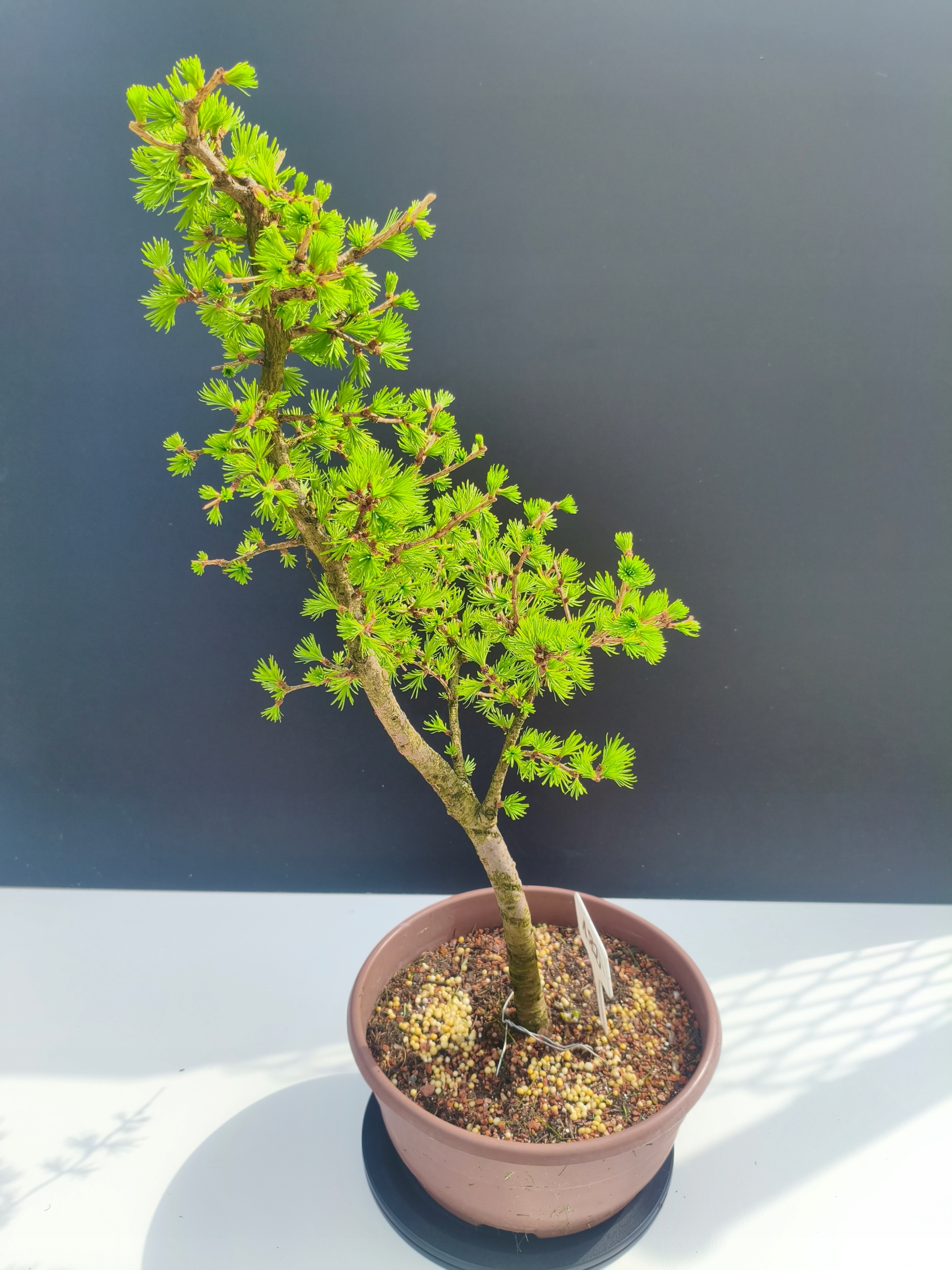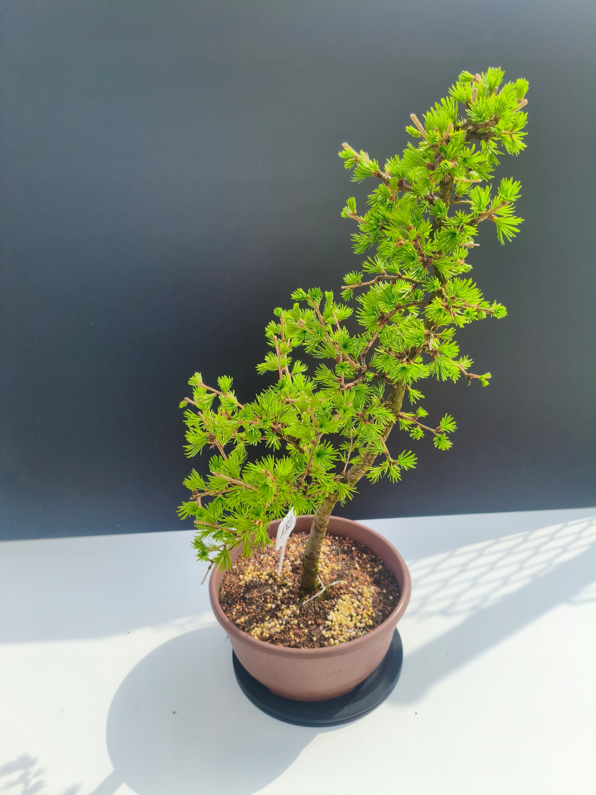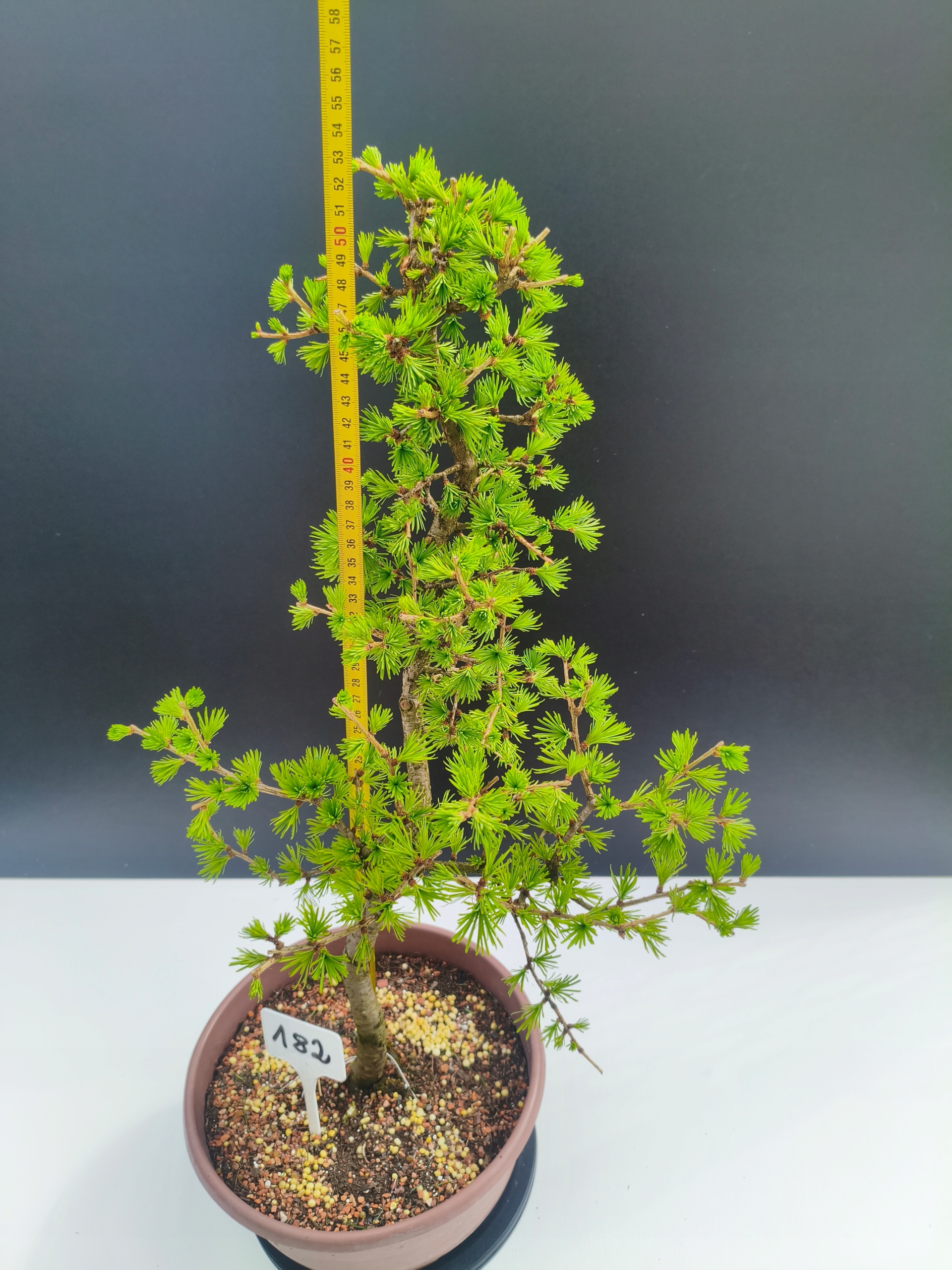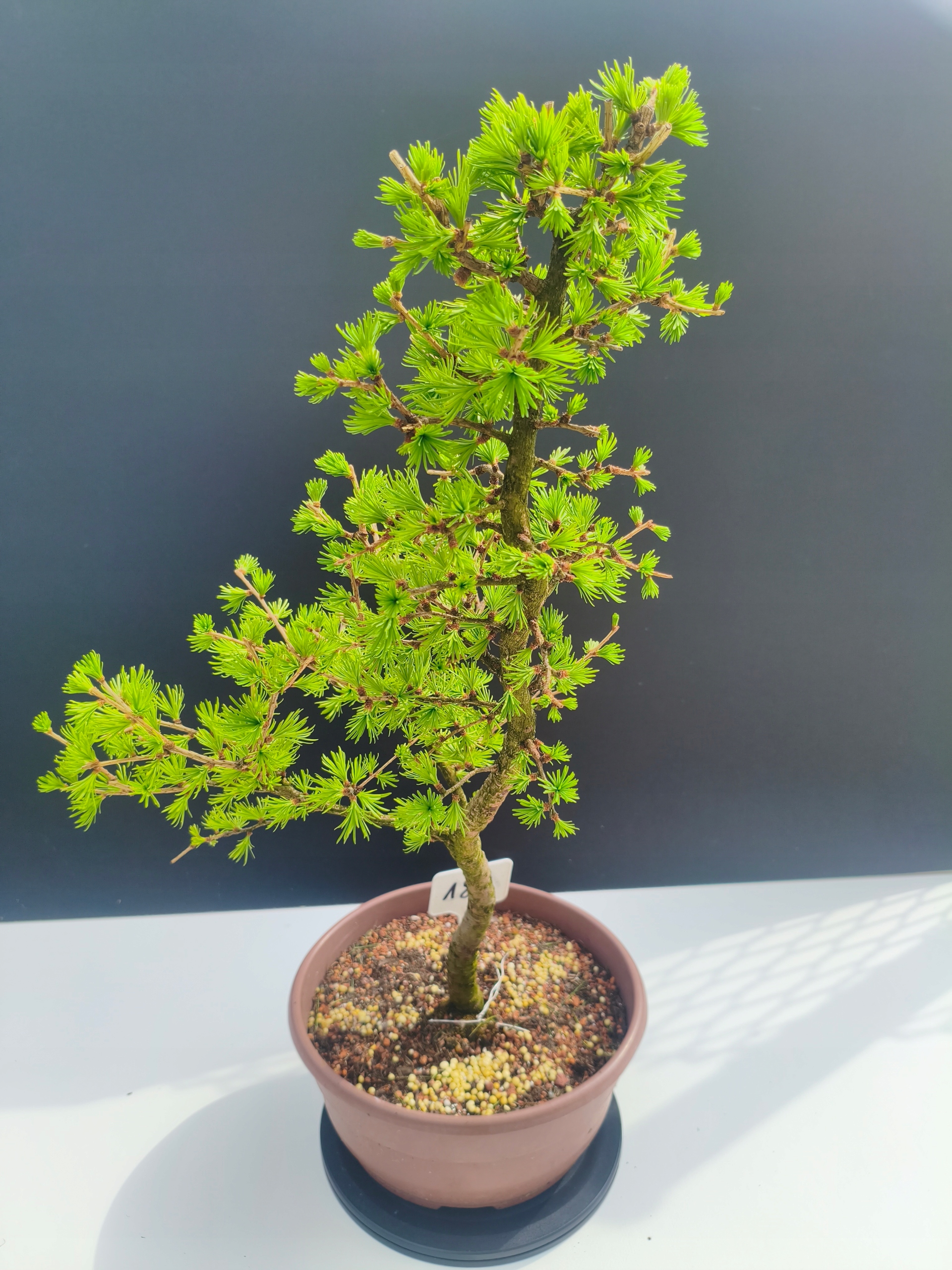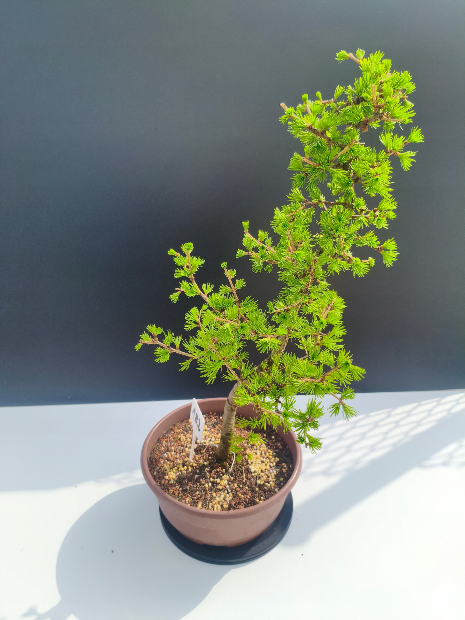 Każde nasze drzewko bonsai to unikalny egzemplarz, dlatego każde zostaje wystawione osobno, ponieważ traktujemy każde indywidualnie – od formowania po pielęgnację. Modrzewie te są w naszych rękach od 2021 roku i obecnie mają już 11 lat, dzięki czemu prezentują się wyjątkowo dojrzale i stabilnie.