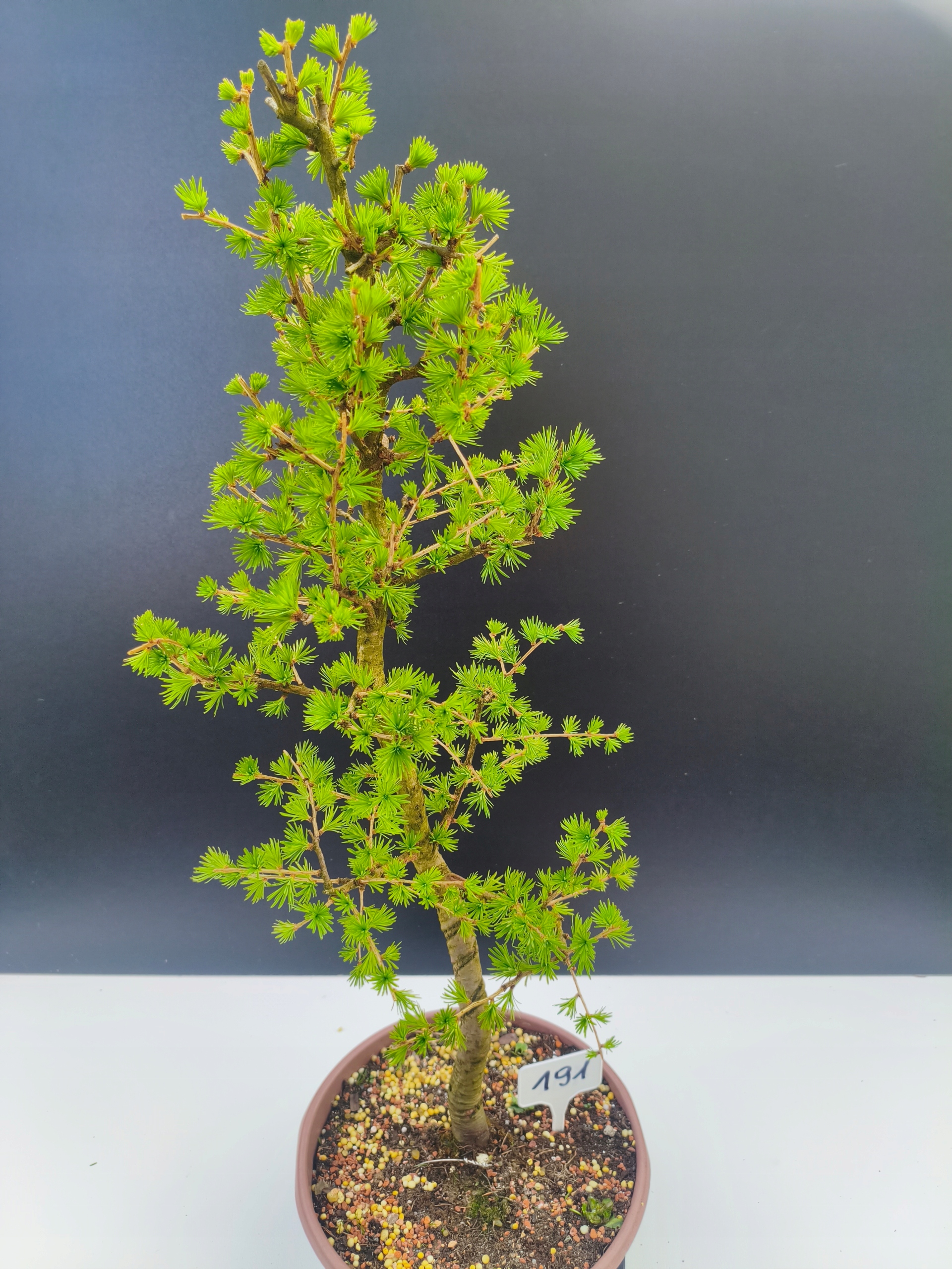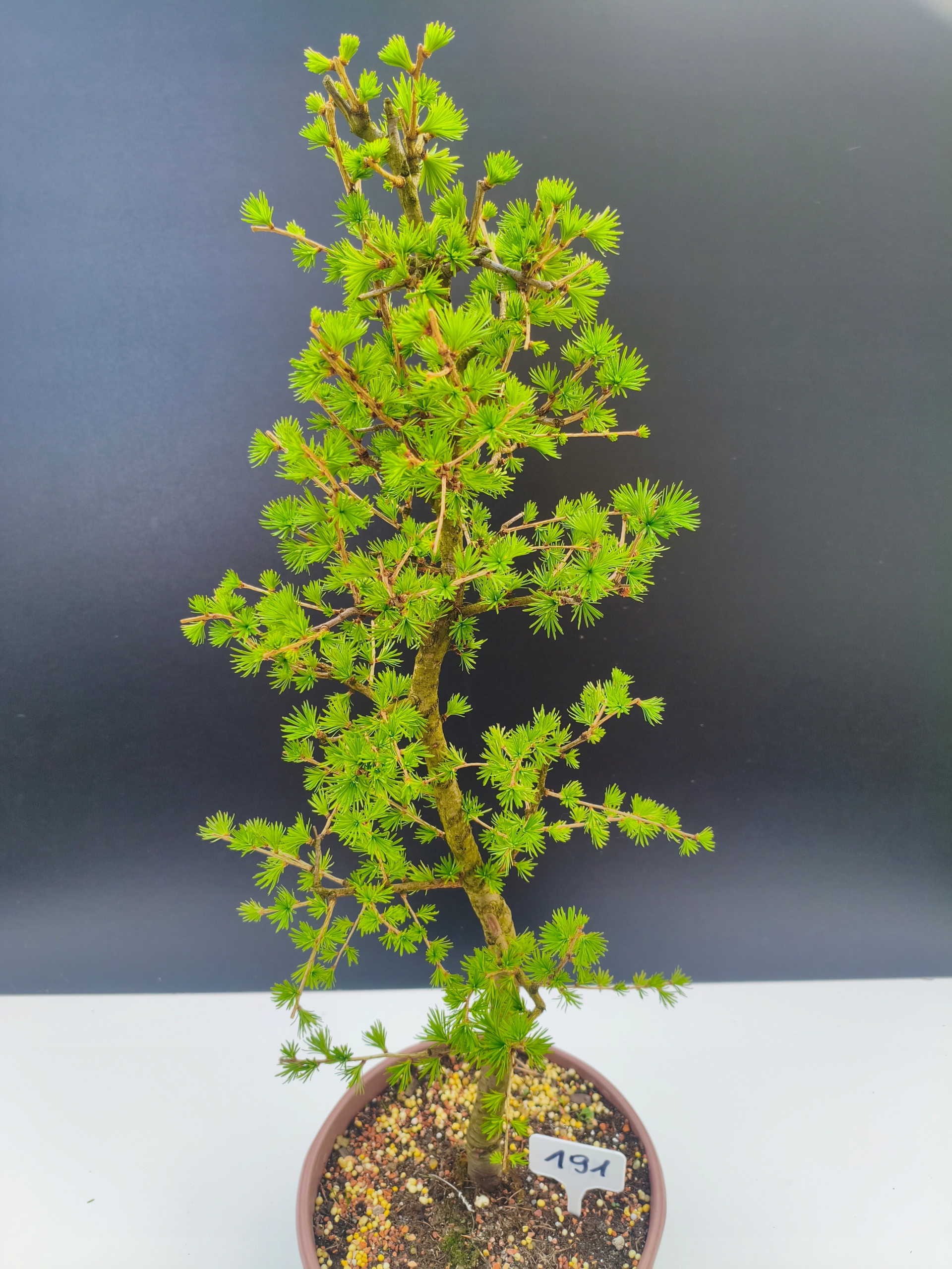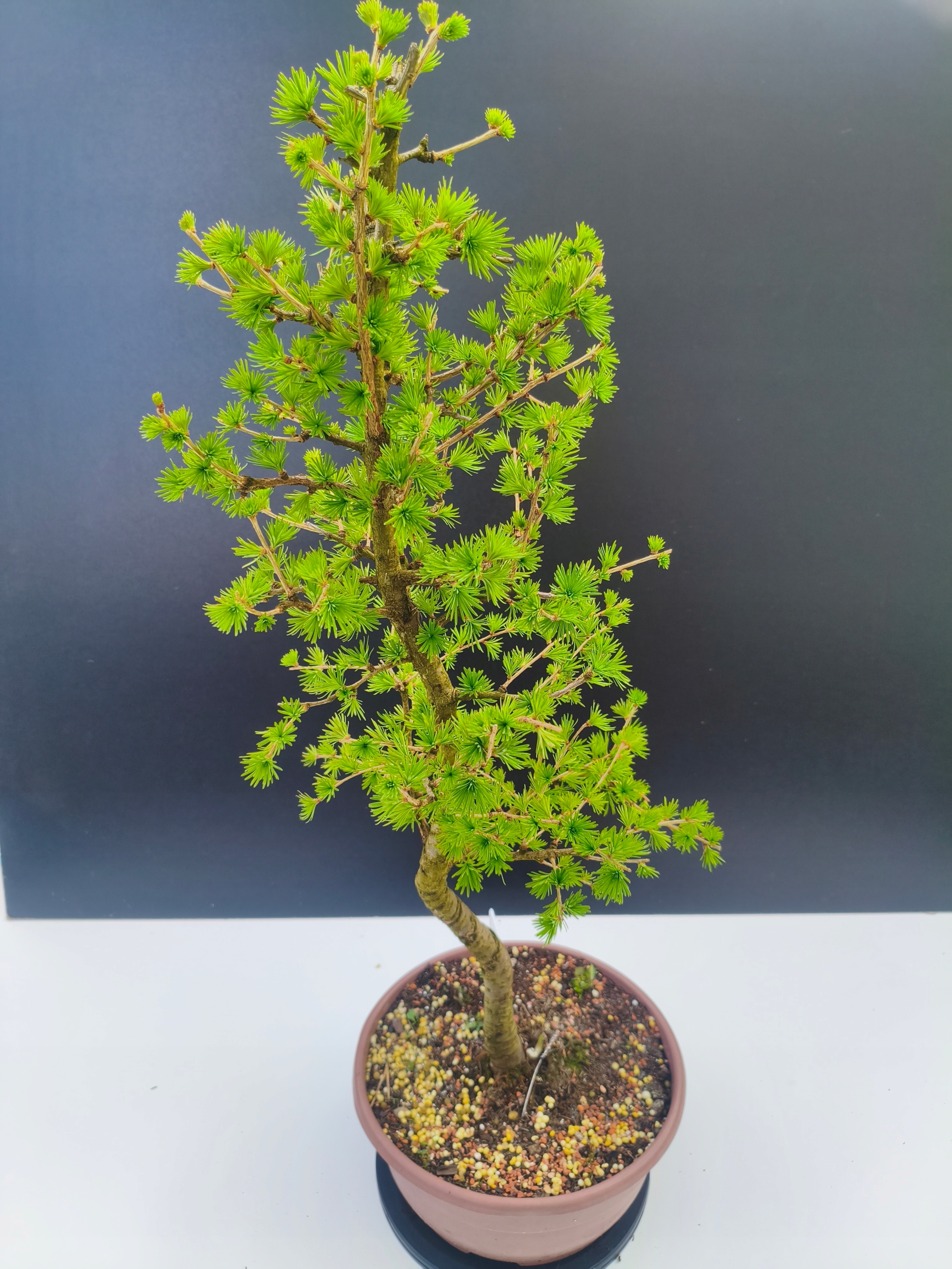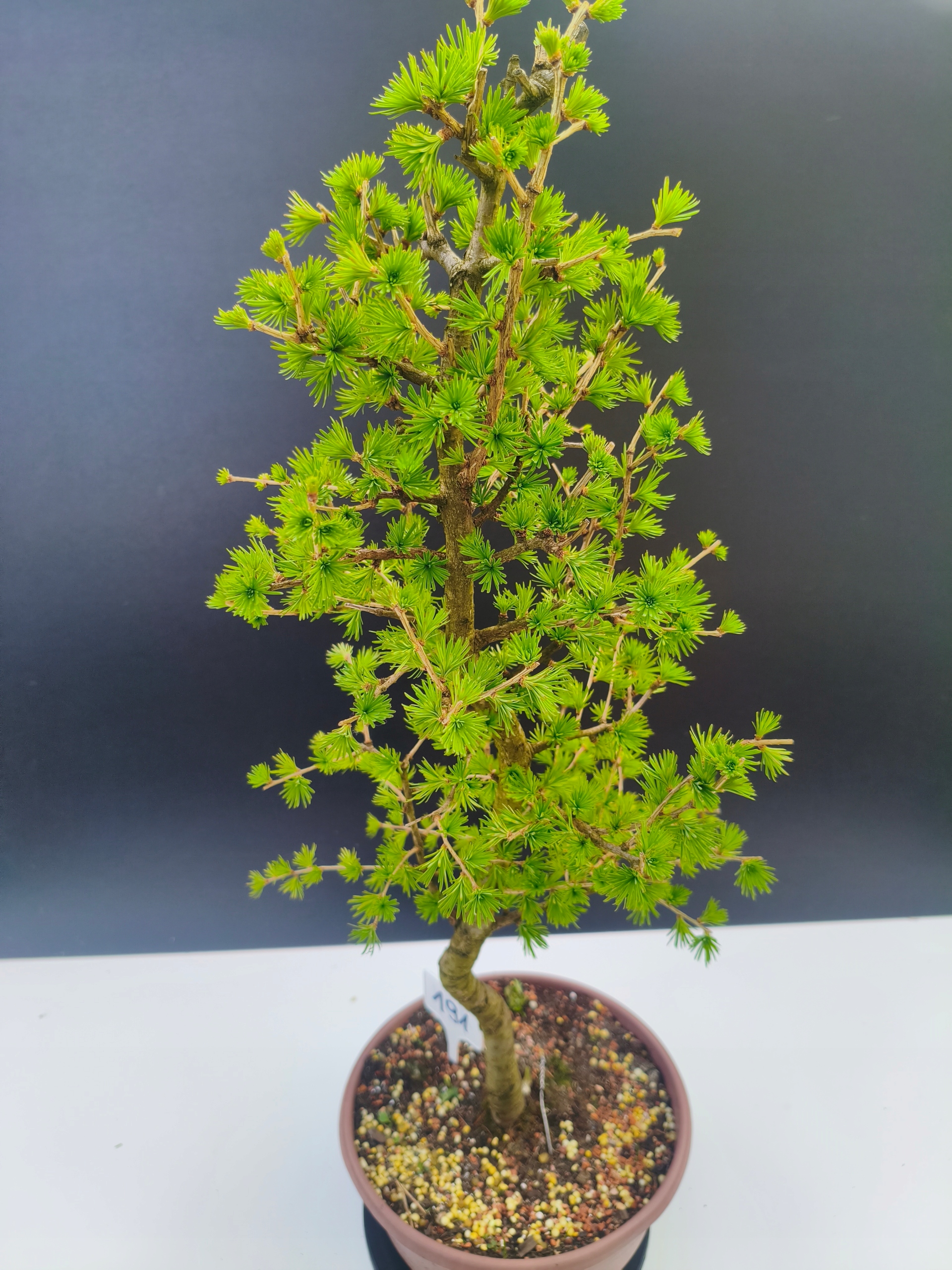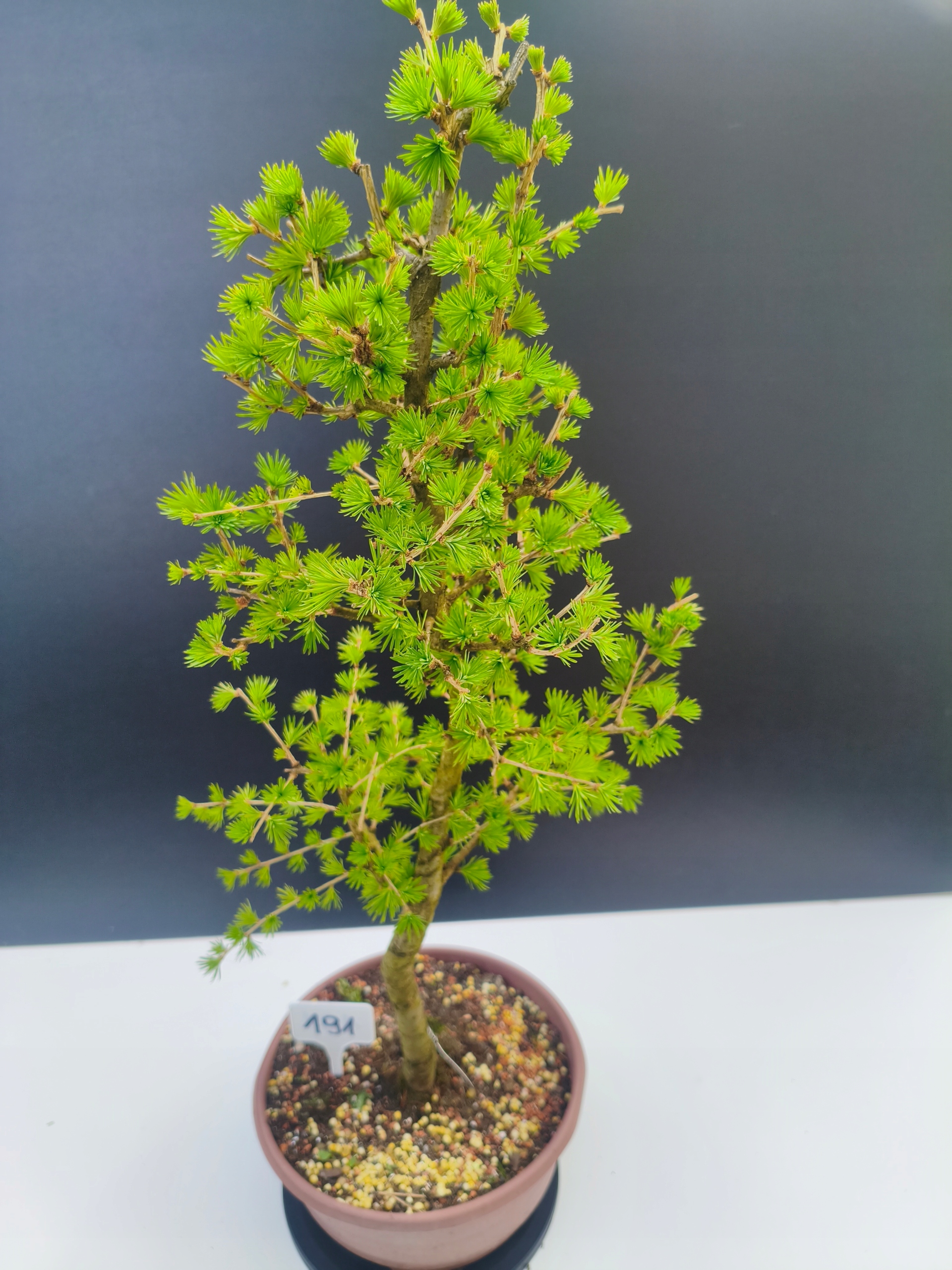 Każde nasze drzewko bonsai to unikalny egzemplarz, dlatego każde zostaje wystawione osobno, ponieważ traktujemy każde indywidualnie – od formowania po pielęgnację. Modrzewie te są w naszych rękach od 2021 roku i obecnie mają już 11 lat, dzięki czemu prezentują się wyjątkowo dojrzale i stabilnie.