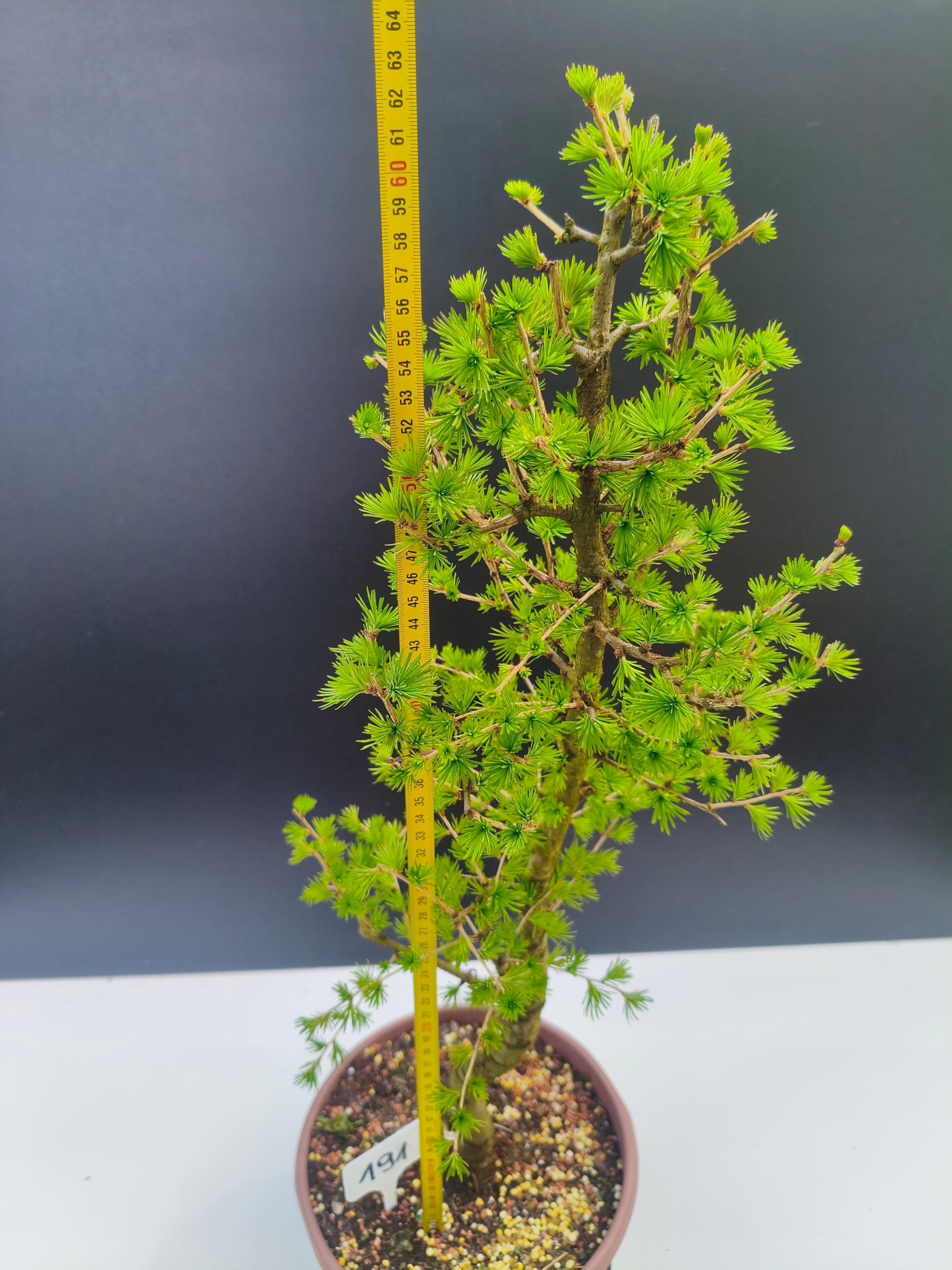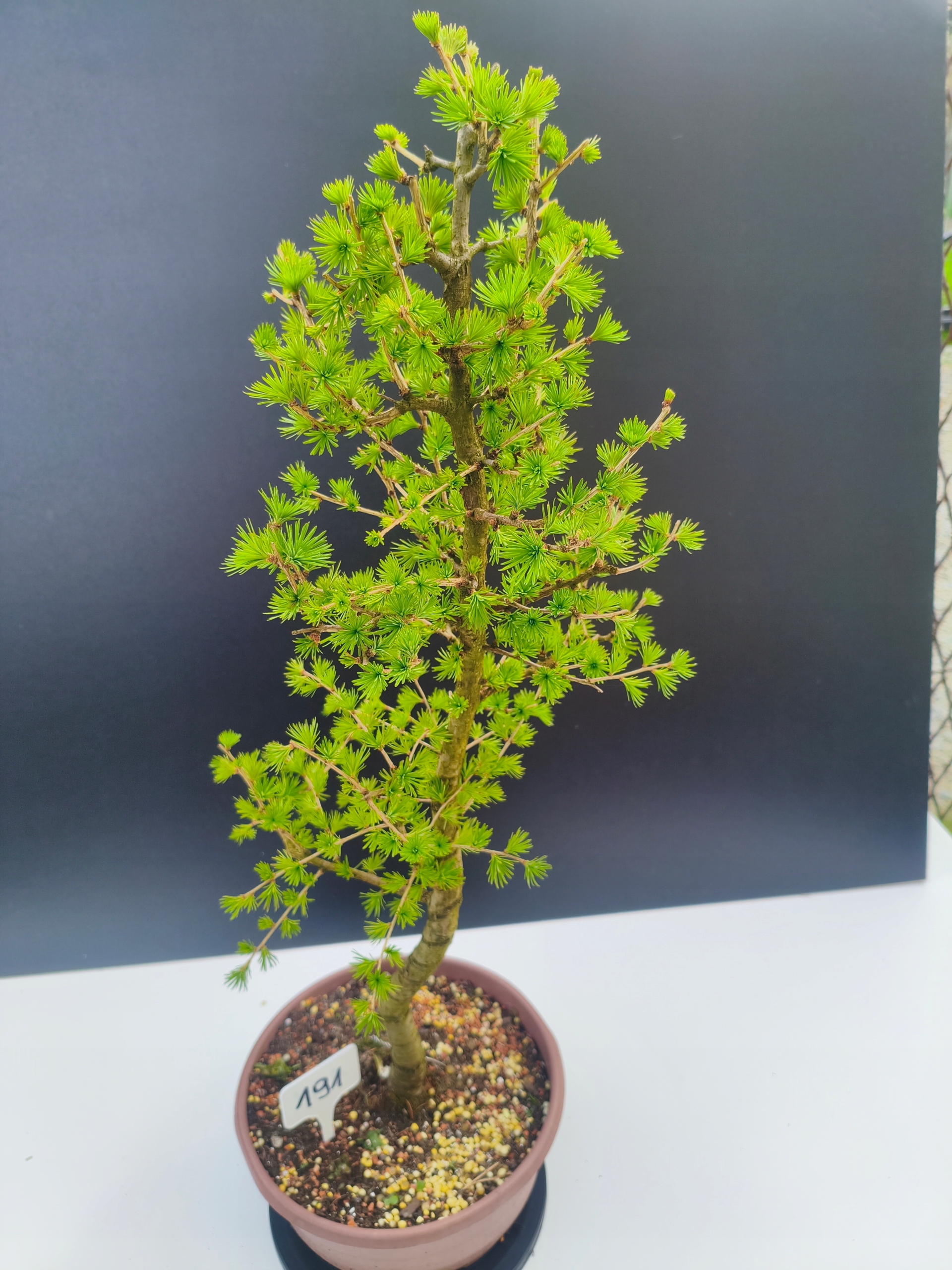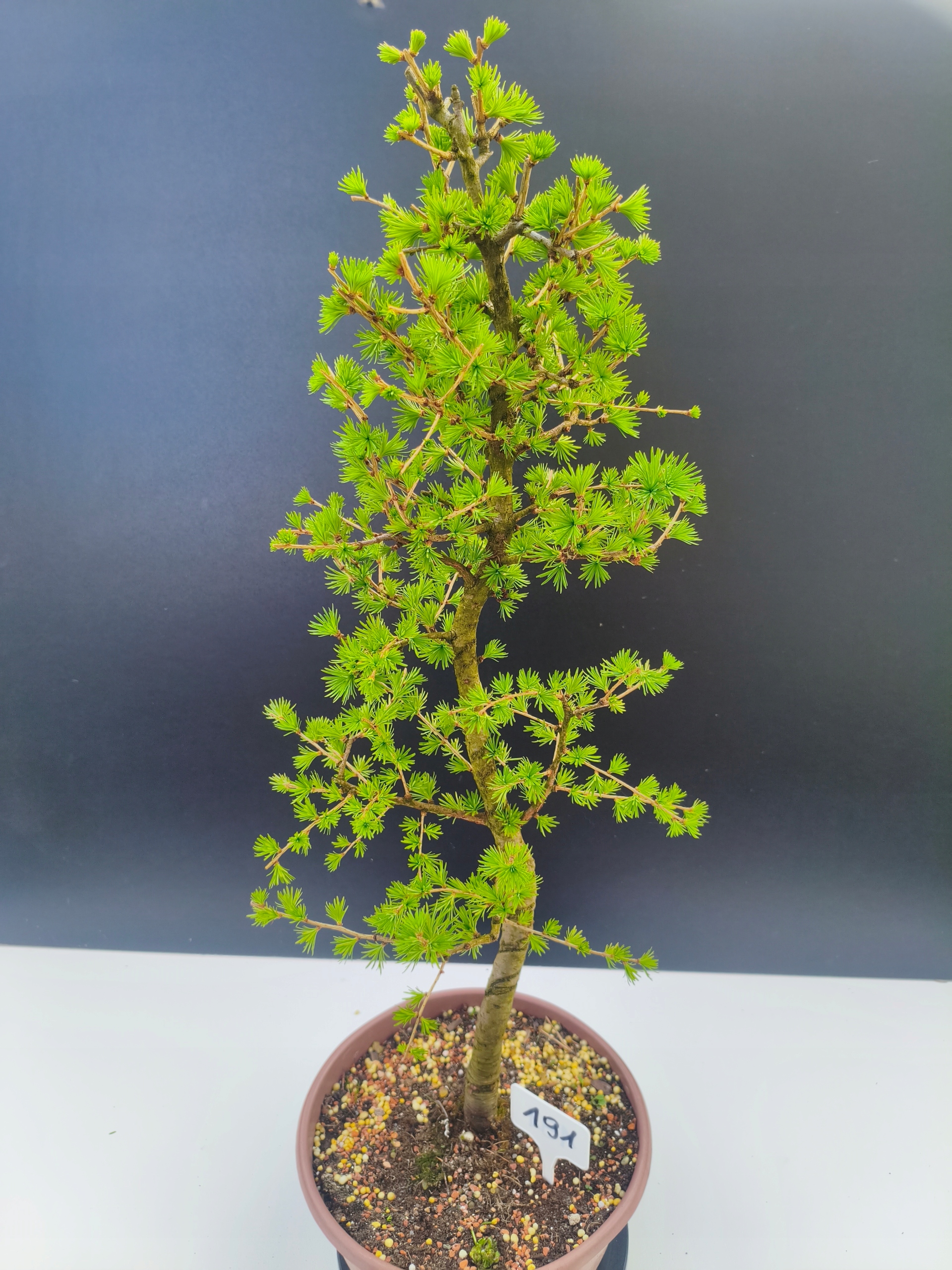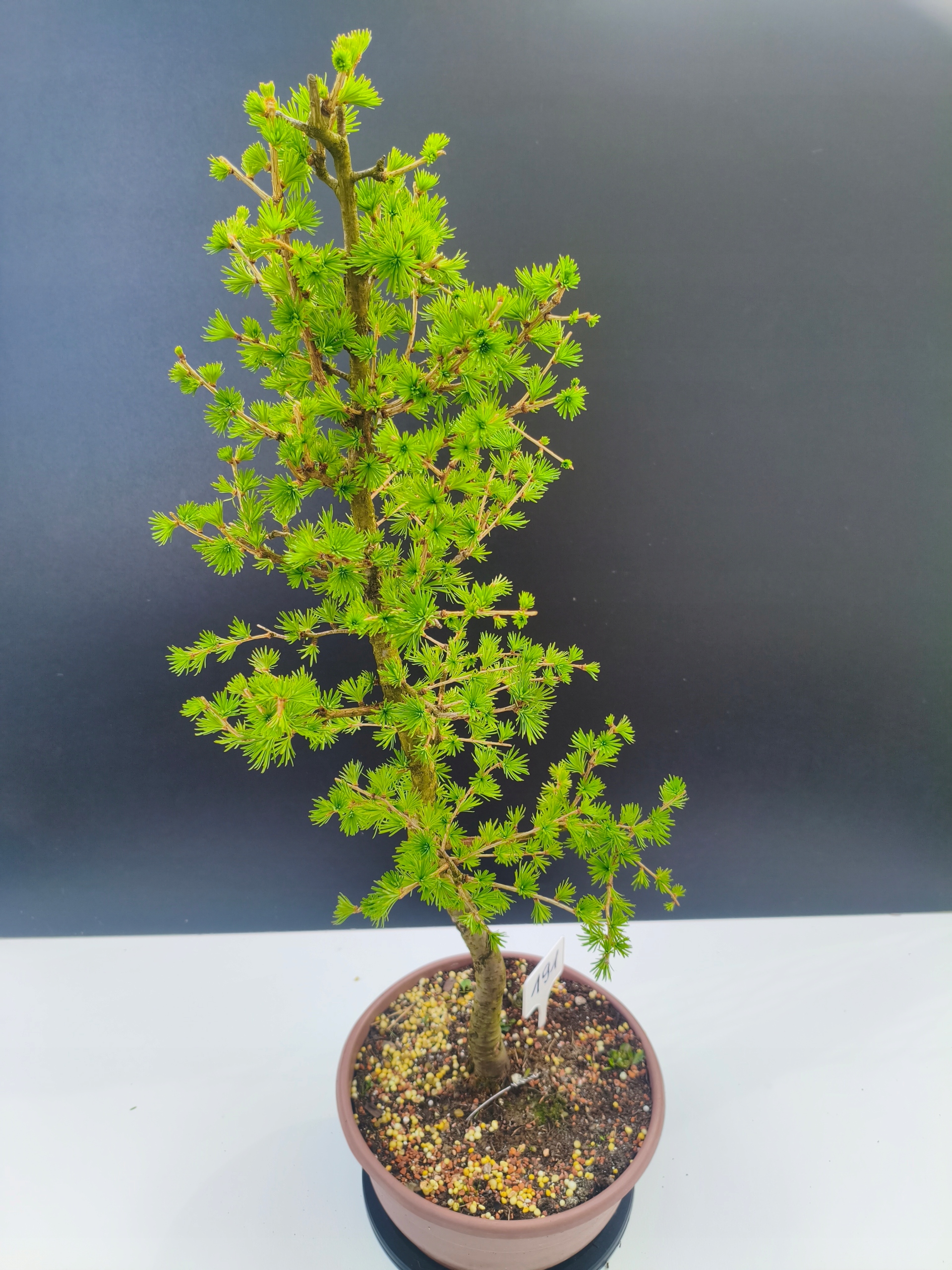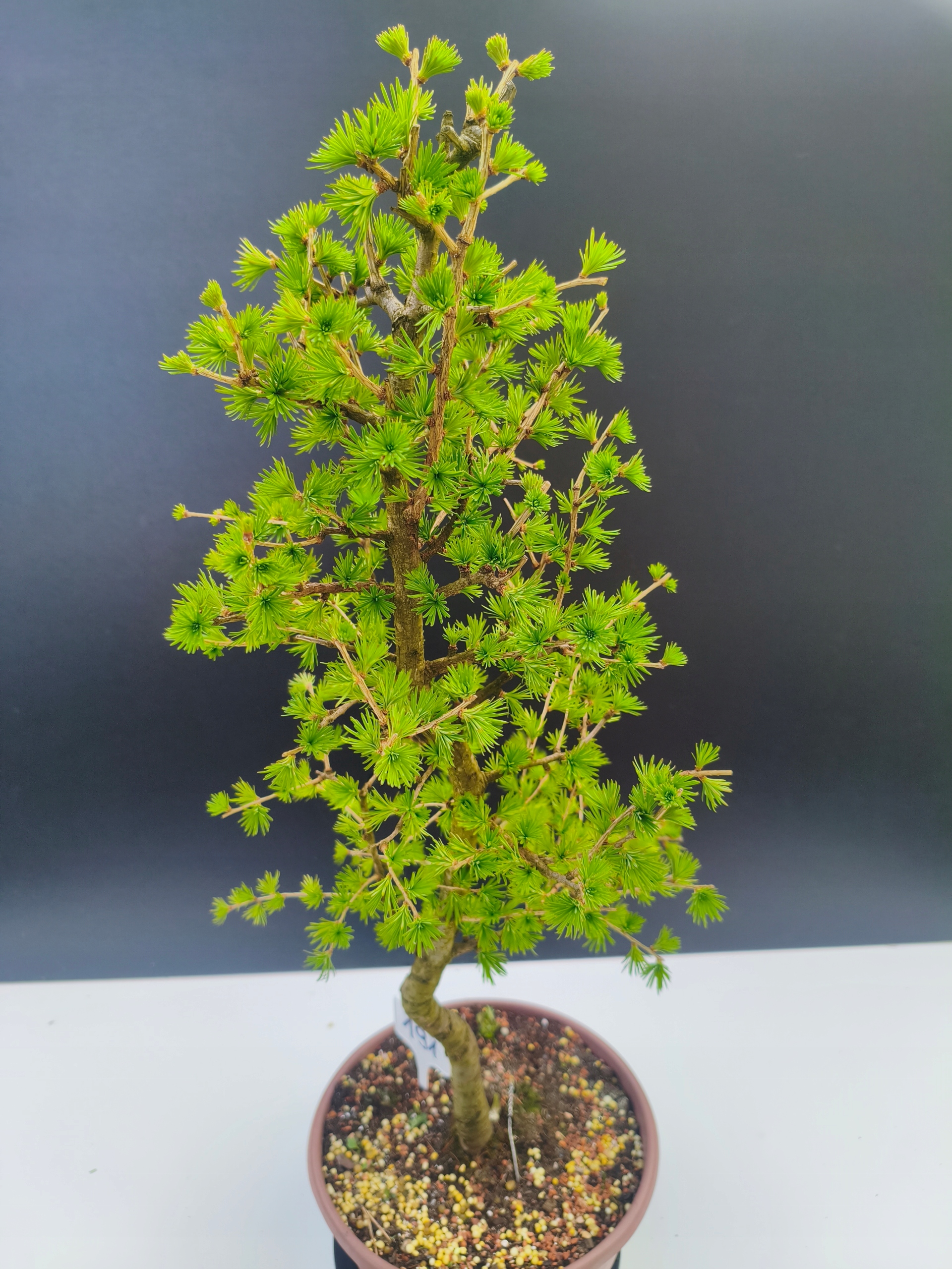 Każde nasze drzewko bonsai to unikalny egzemplarz, dlatego każde zostaje wystawione osobno, ponieważ traktujemy każde indywidualnie – od formowania po pielęgnację. Modrzewie te są w naszych rękach od 2021 roku i obecnie mają już 11 lat, dzięki czemu prezentują się wyjątkowo dojrzale i stabilnie.