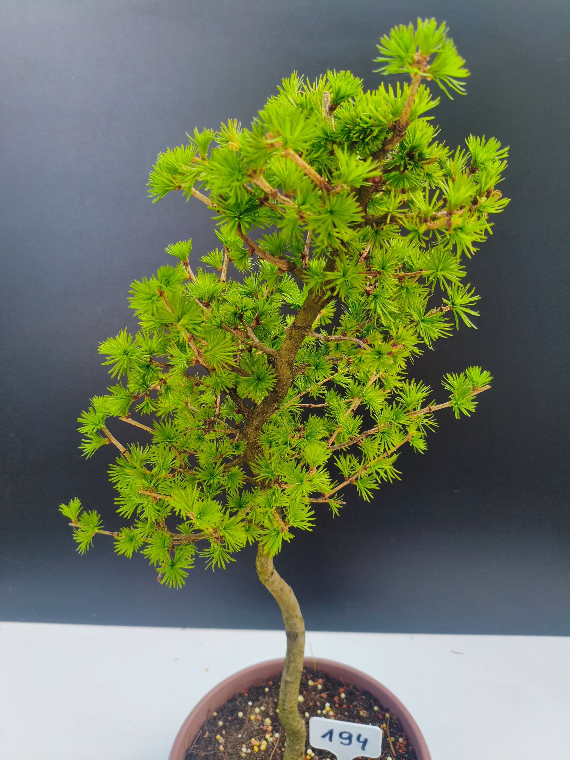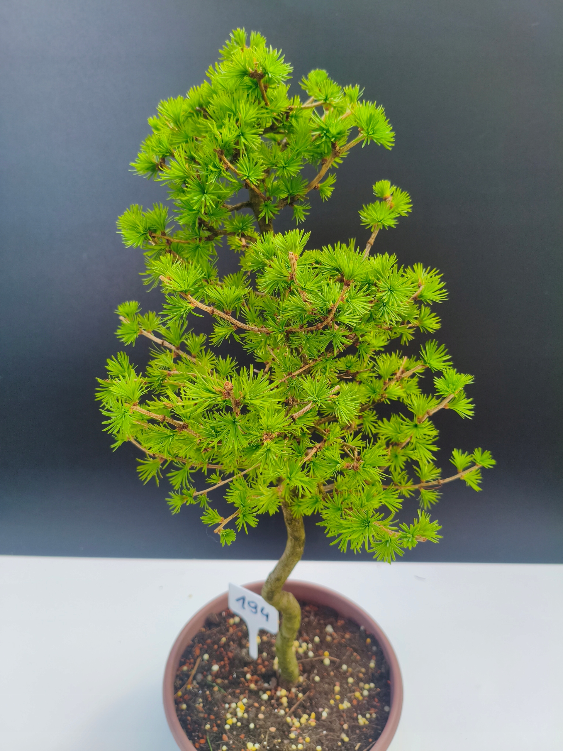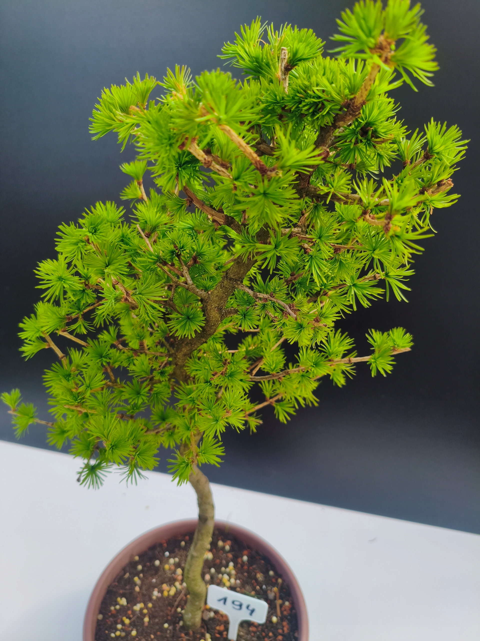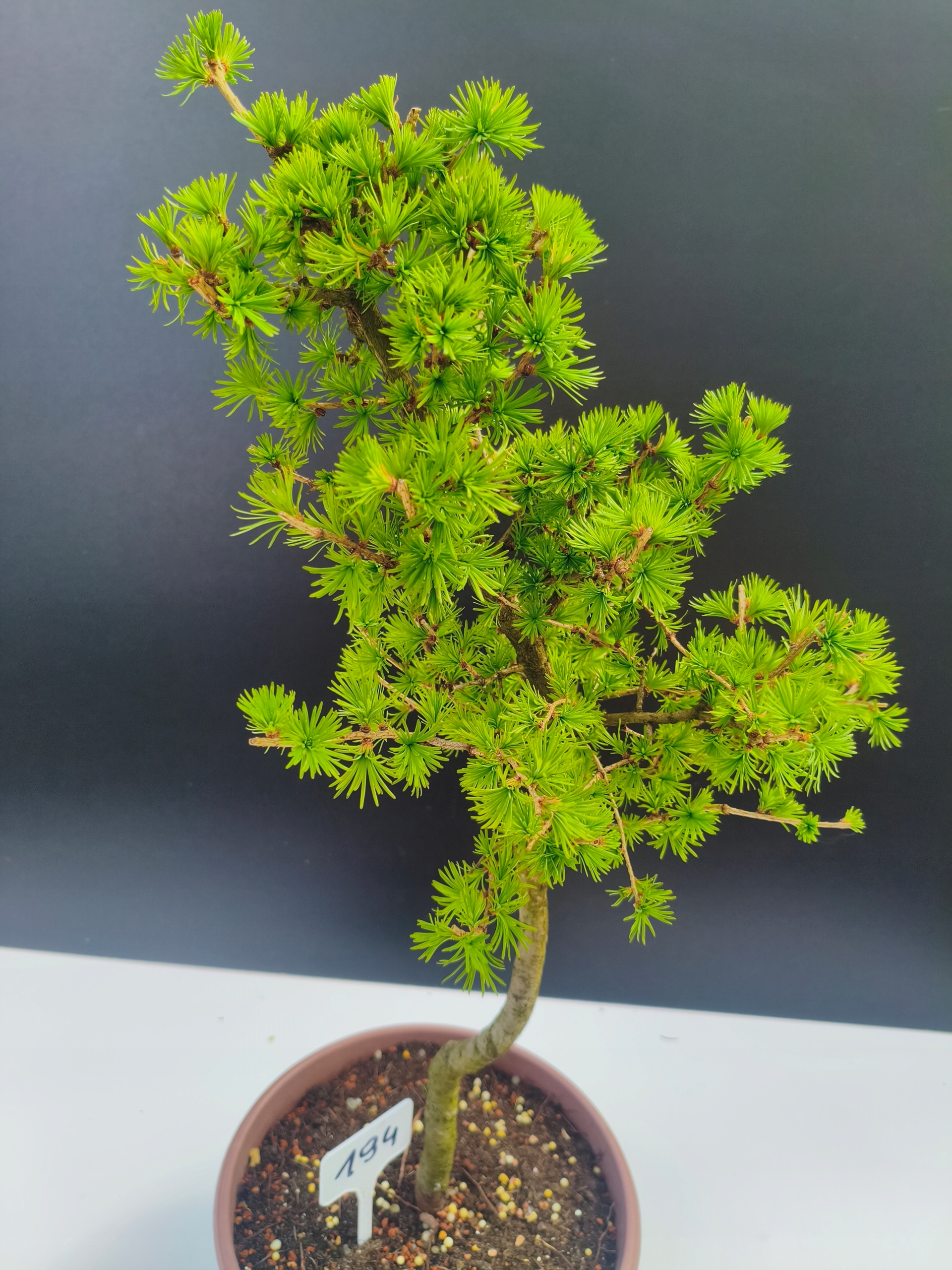 Każde nasze drzewko bonsai to unikalny egzemplarz, dlatego każde zostaje wystawione osobno, ponieważ traktujemy każde indywidualnie – od formowania po pielęgnację. Modrzewie te są w naszych rękach od 2021 roku i obecnie mają już 11 lat, dzięki czemu prezentują się wyjątkowo dojrzale i stabilnie.