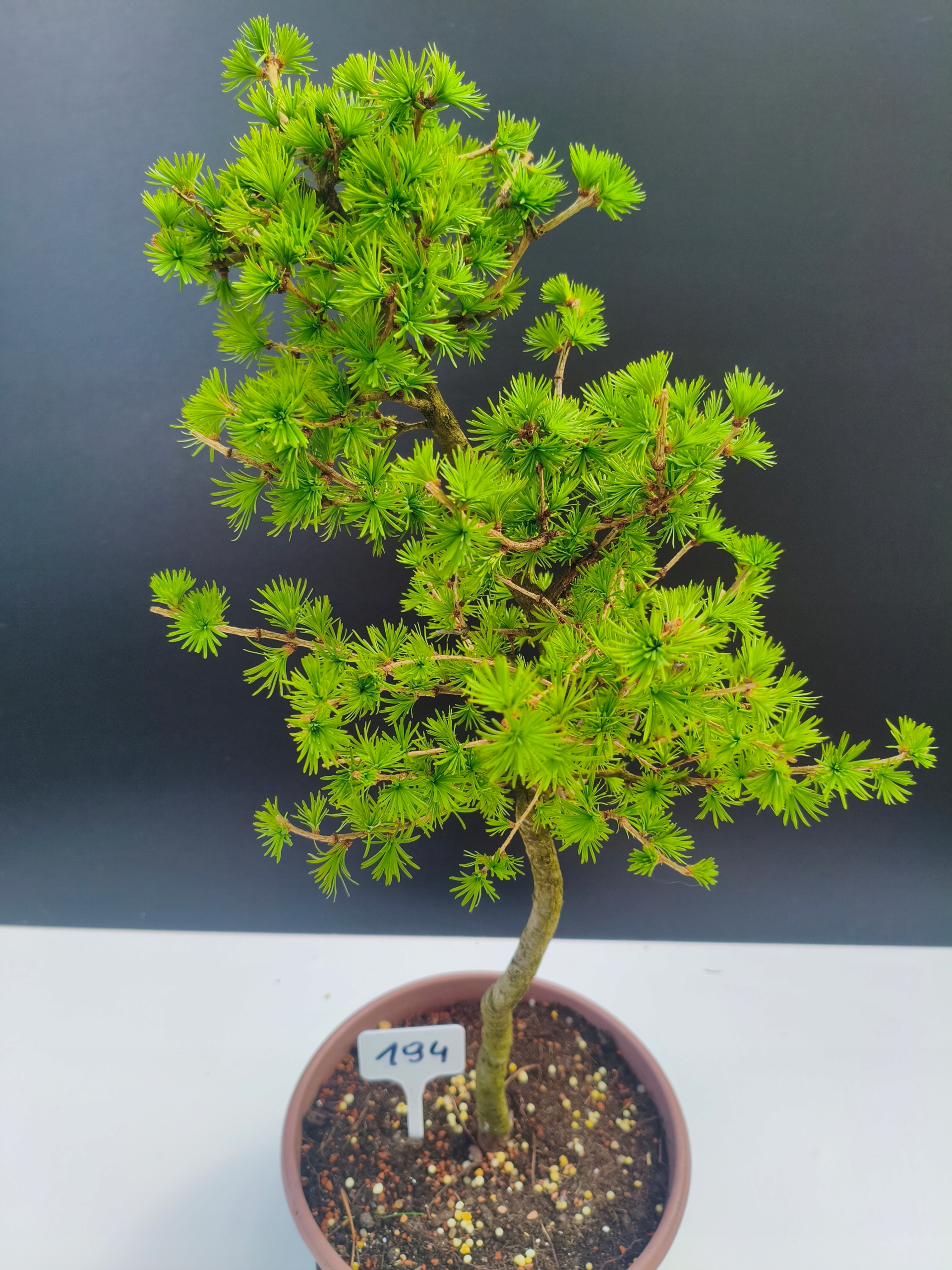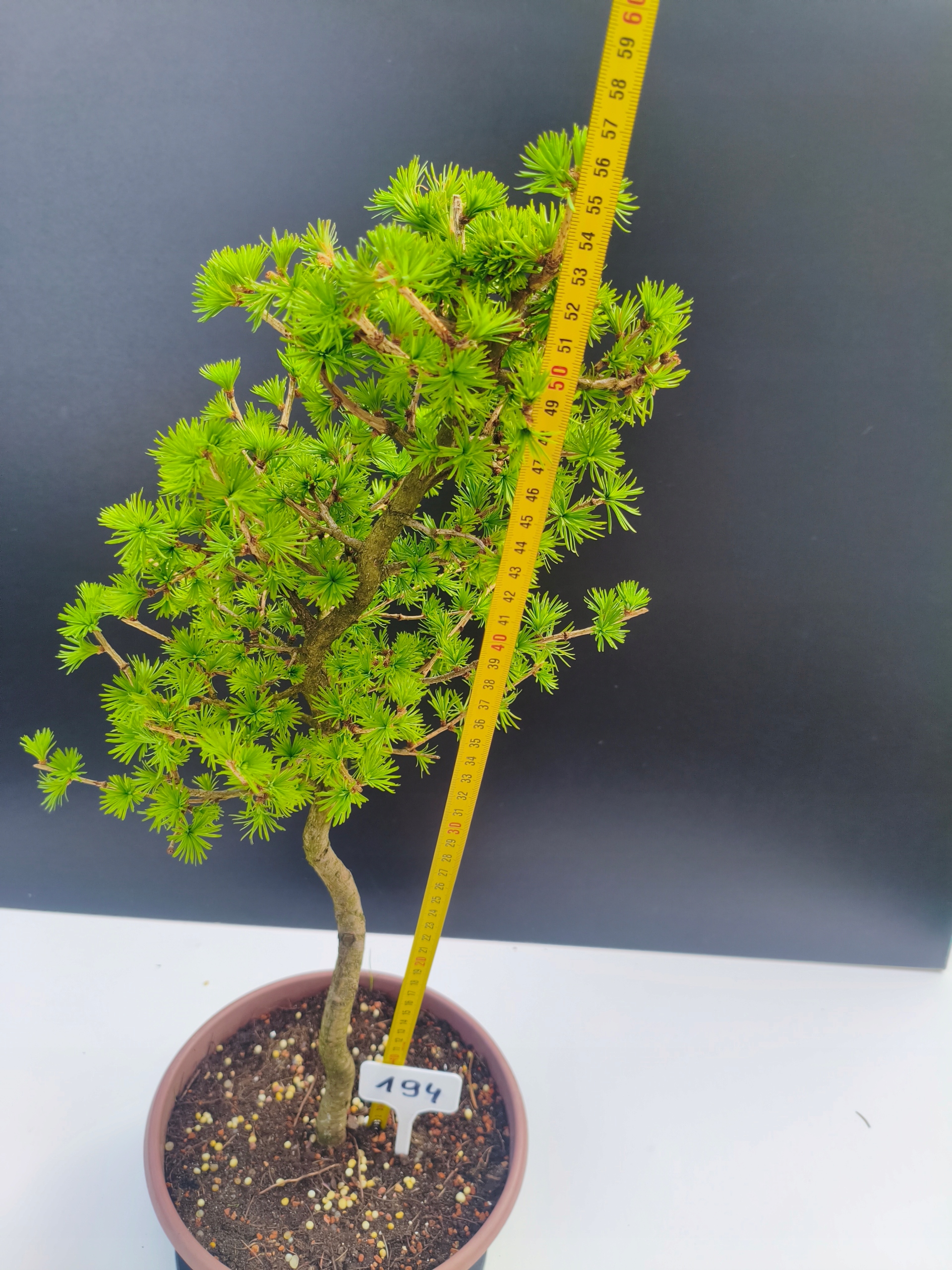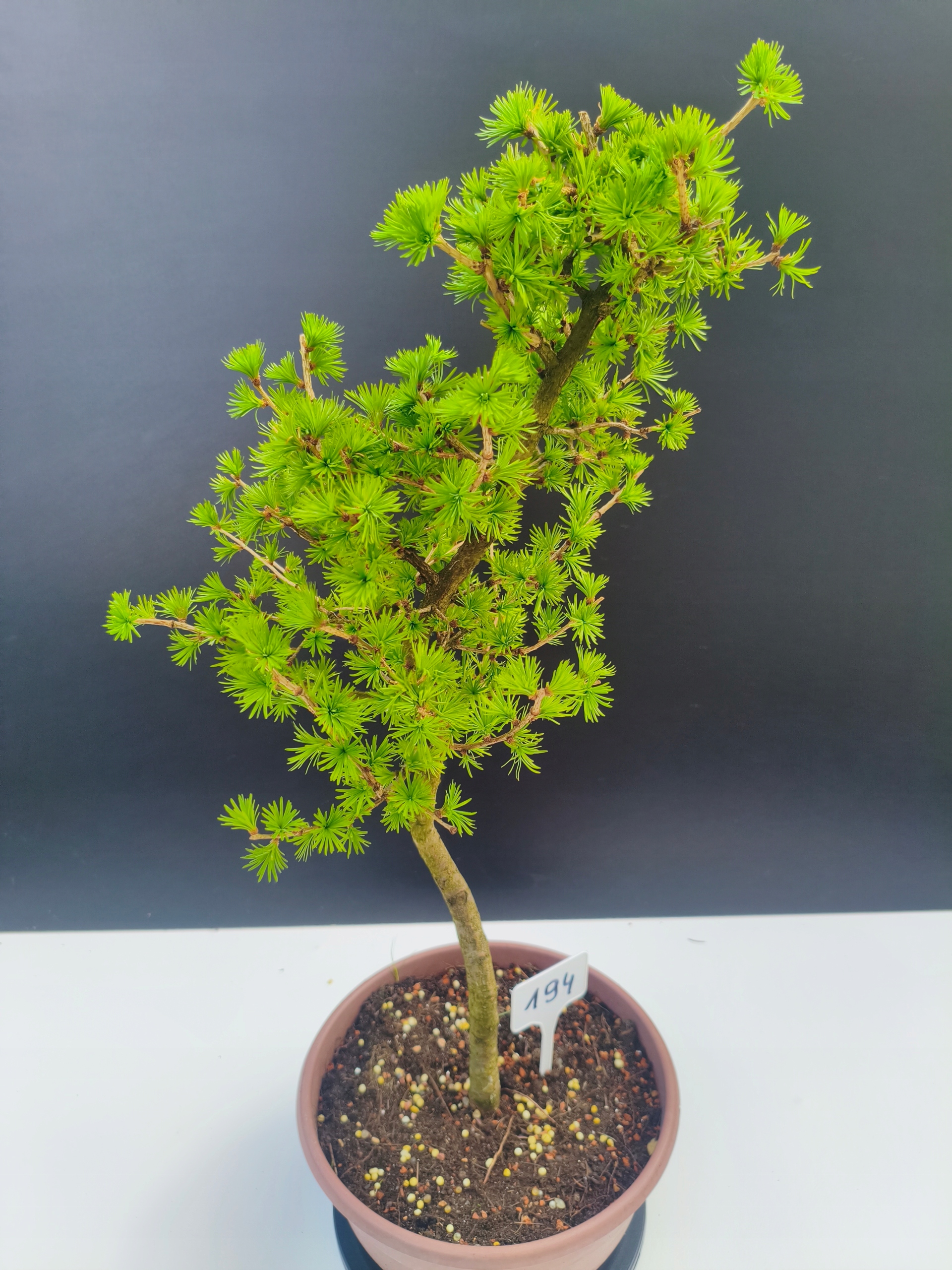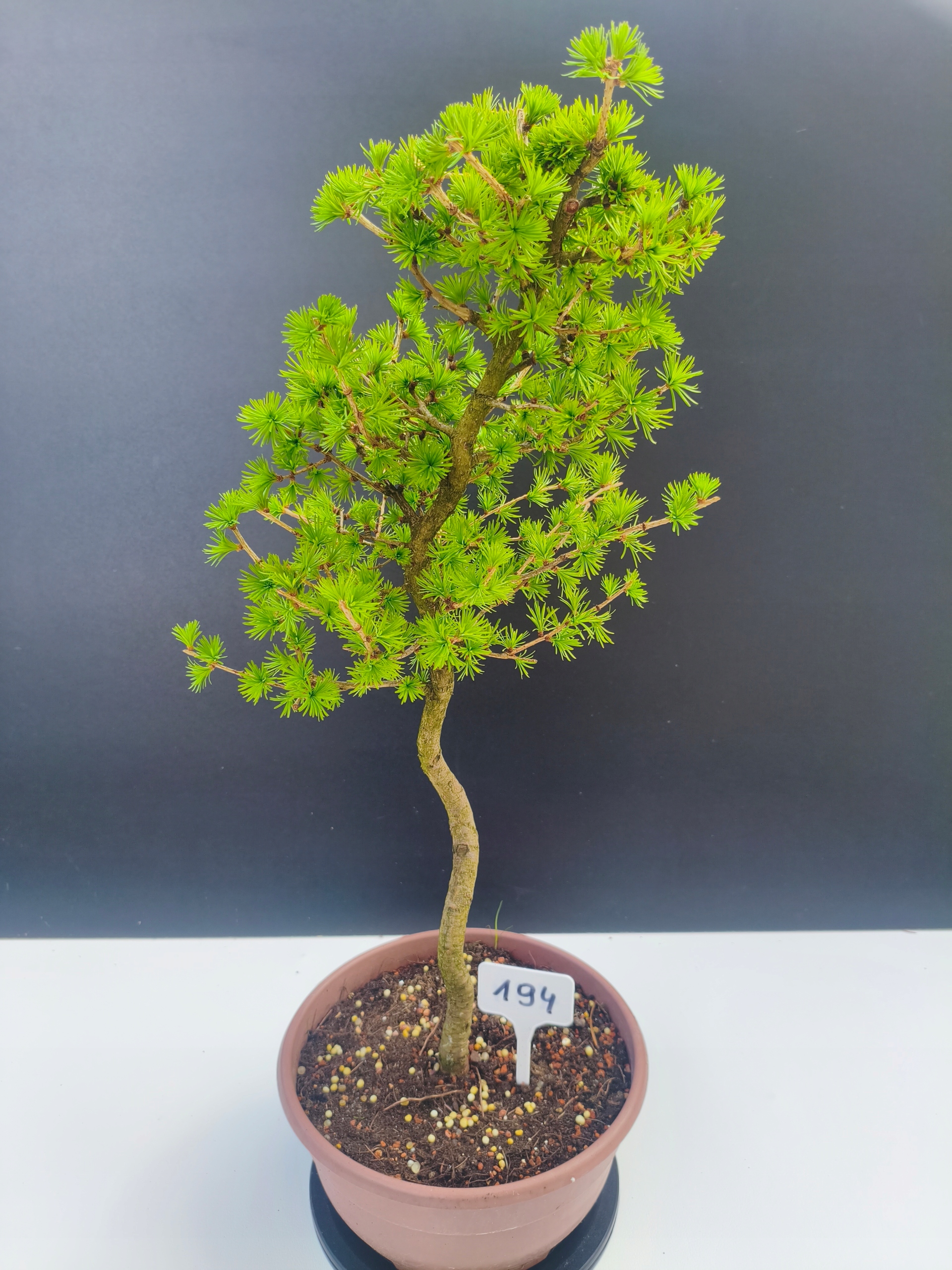 Każde nasze drzewko bonsai to unikalny egzemplarz, dlatego każde zostaje wystawione osobno, ponieważ traktujemy każde indywidualnie – od formowania po pielęgnację. Modrzewie te są w naszych rękach od 2021 roku i obecnie mają już 11 lat, dzięki czemu prezentują się wyjątkowo dojrzale i stabilnie.