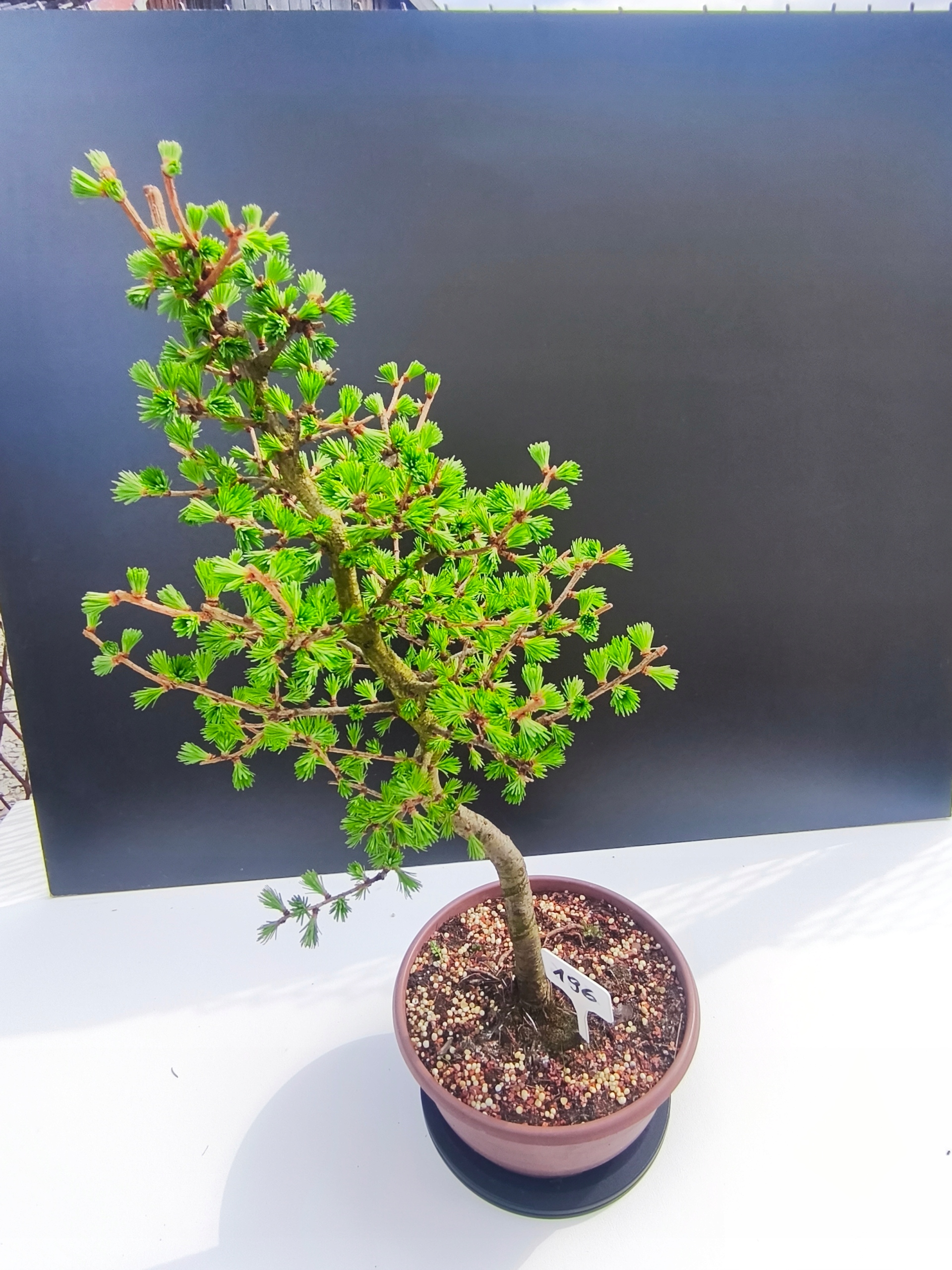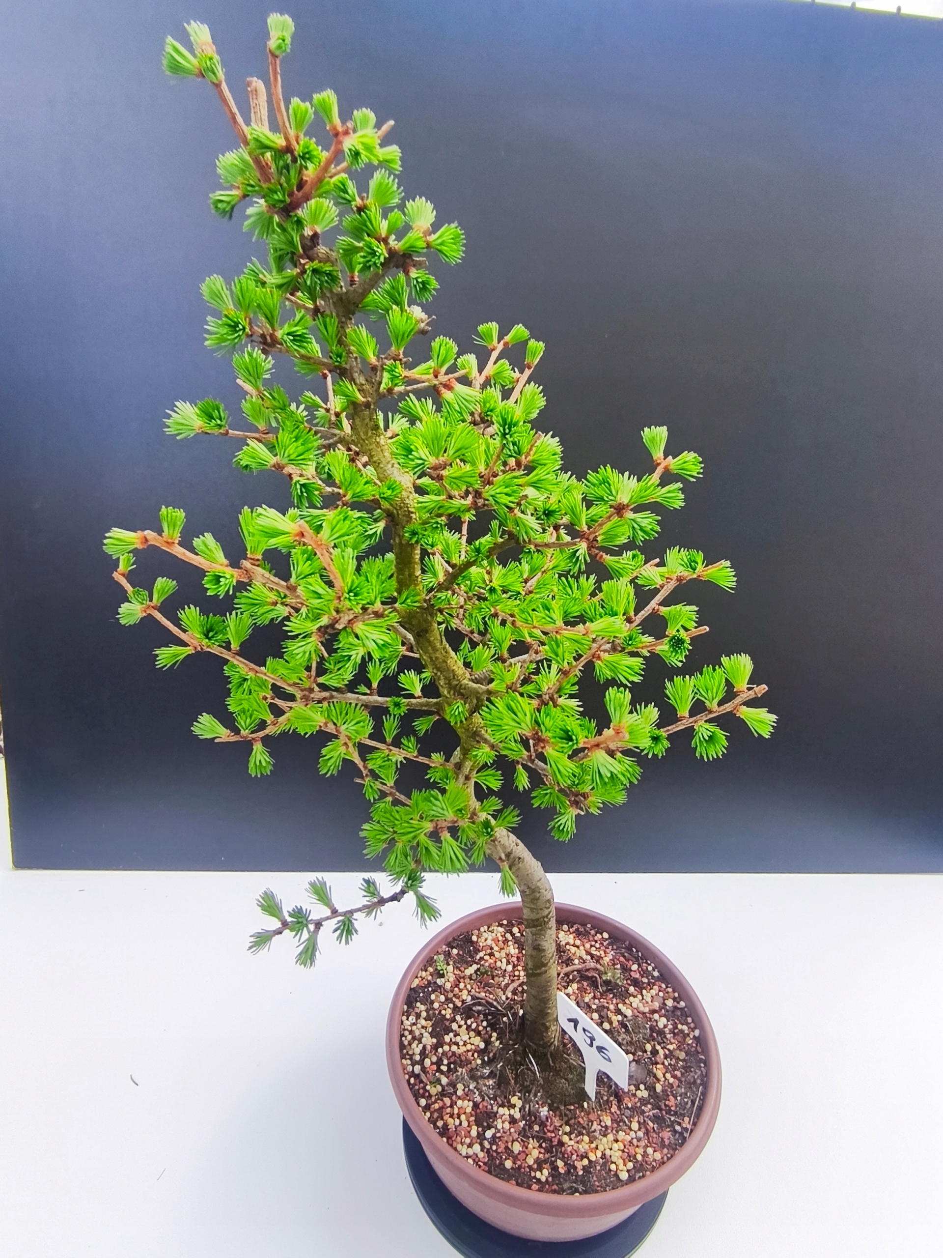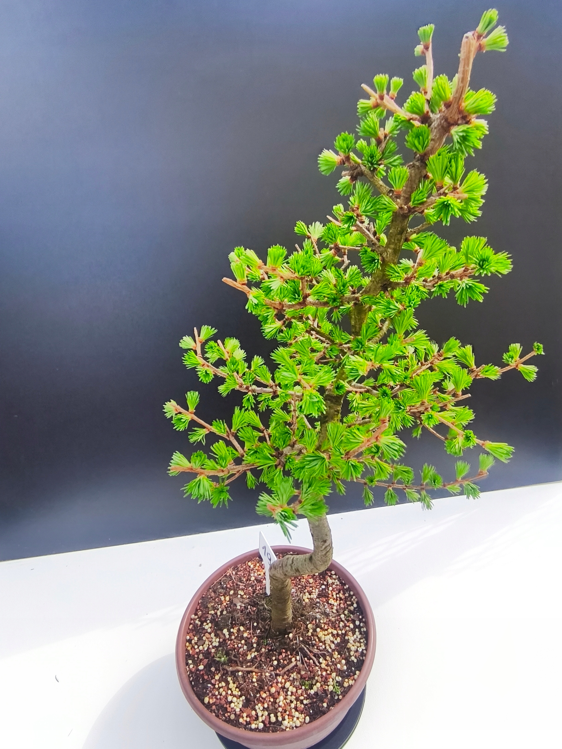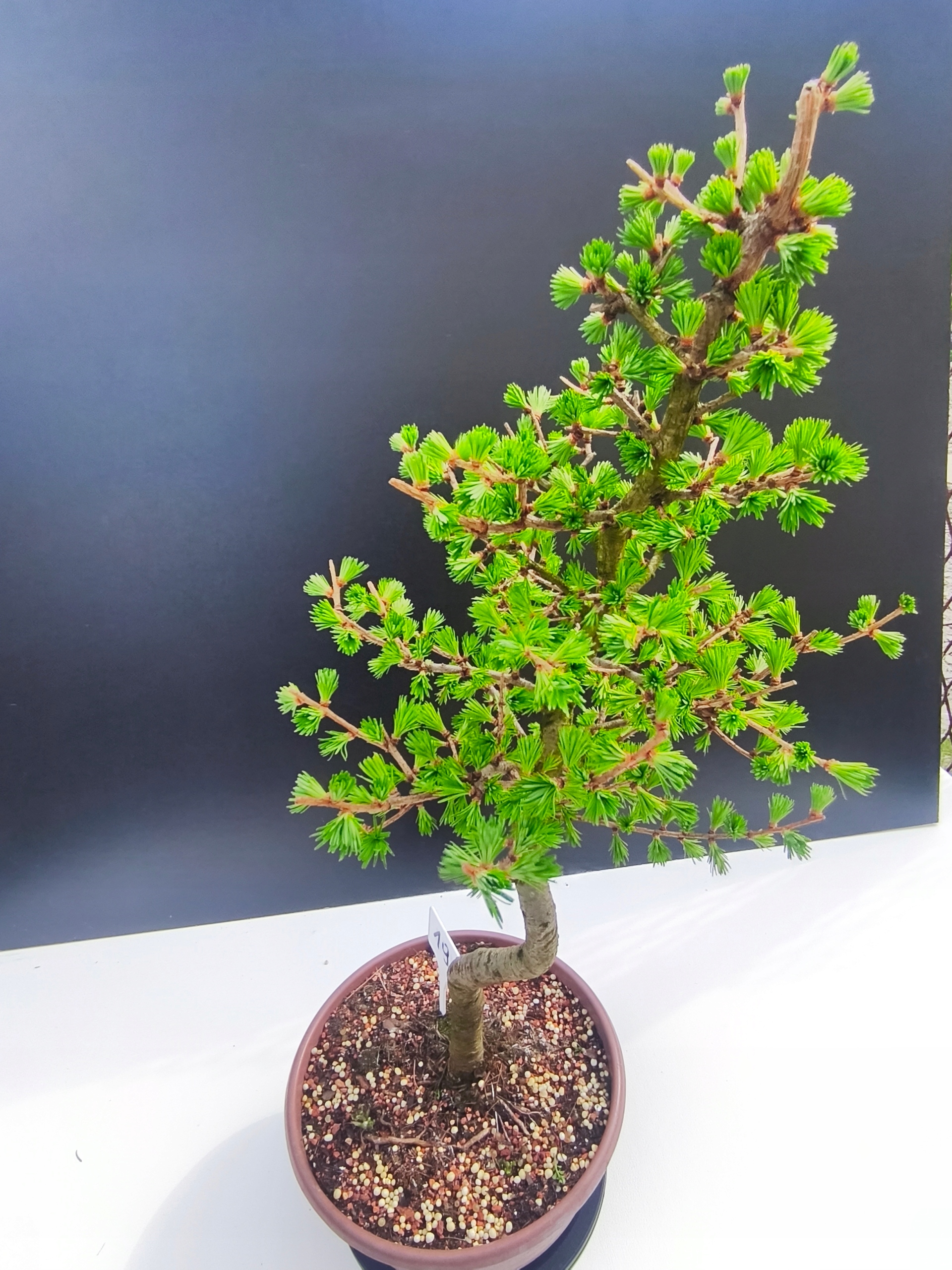 Każde nasze drzewko bonsai to unikalny egzemplarz, dlatego każde zostaje wystawione osobno, ponieważ traktujemy każde indywidualnie – od formowania po pielęgnację. Modrzewie te są w naszych rękach od 2021 roku i obecnie mają już 11 lat, dzięki czemu prezentują się wyjątkowo dojrzale i stabilnie.