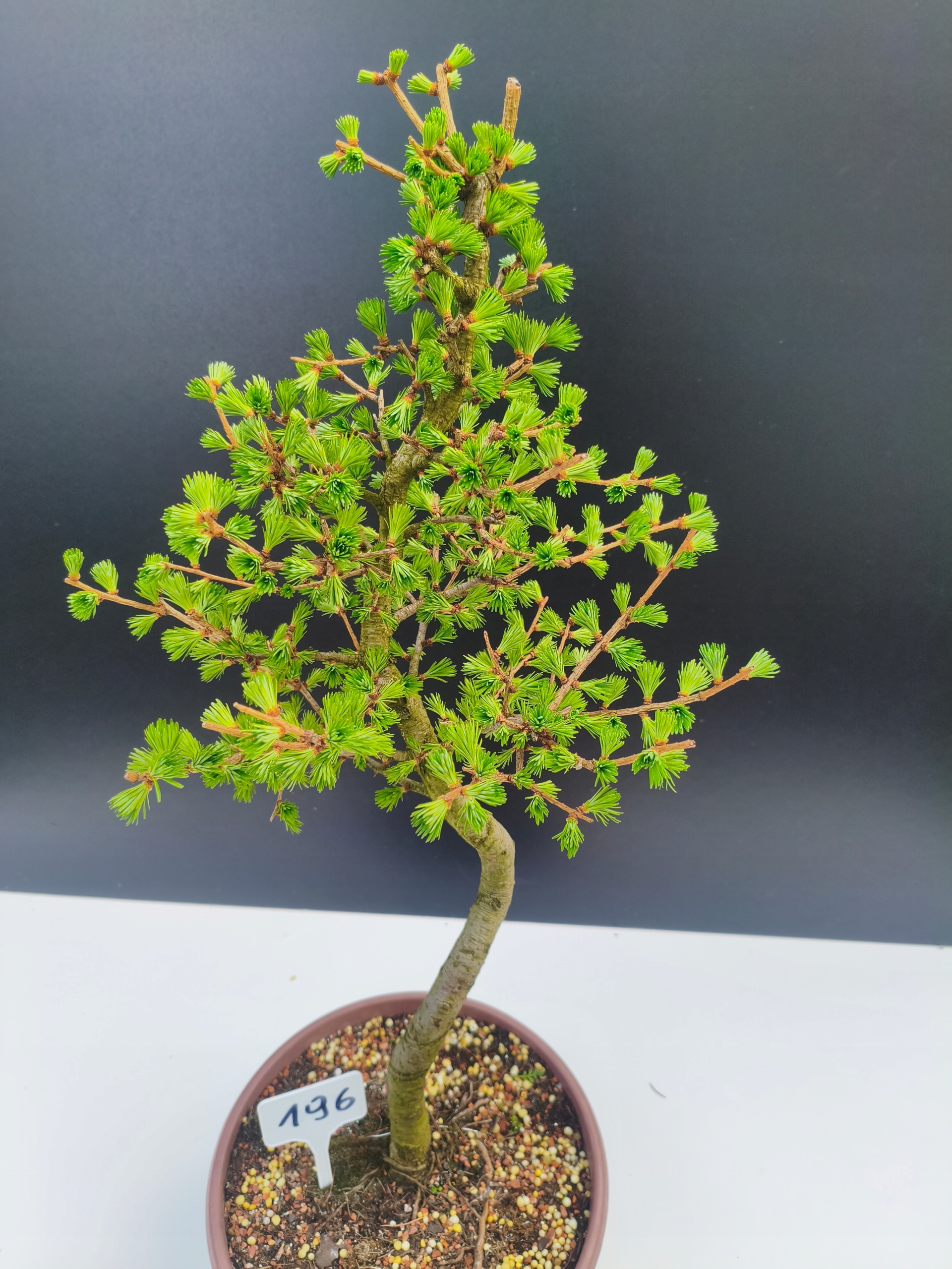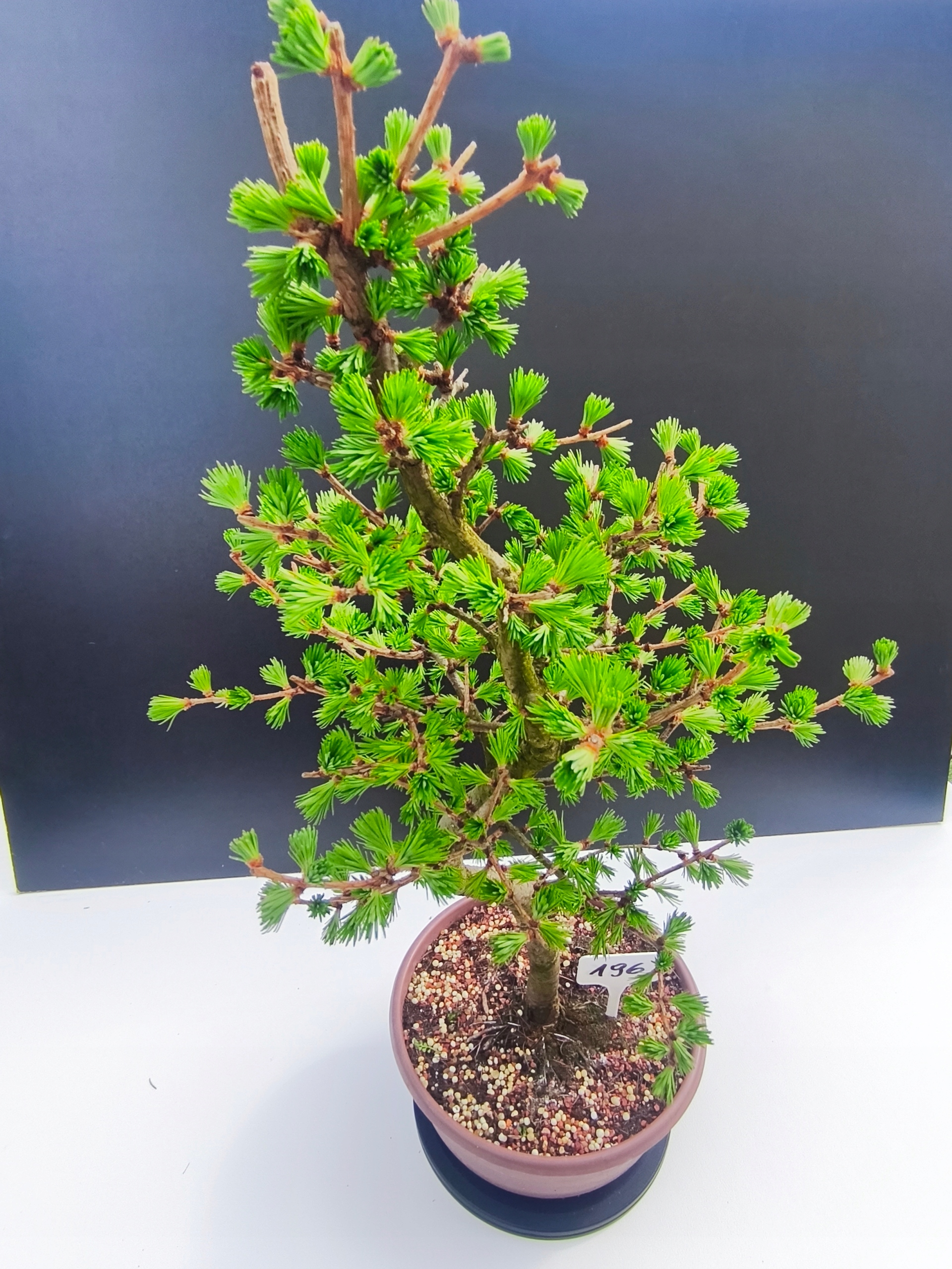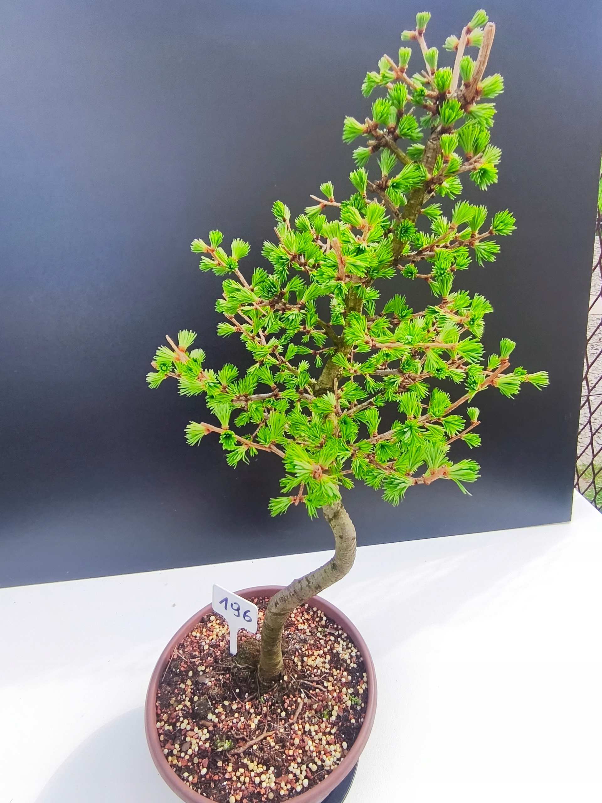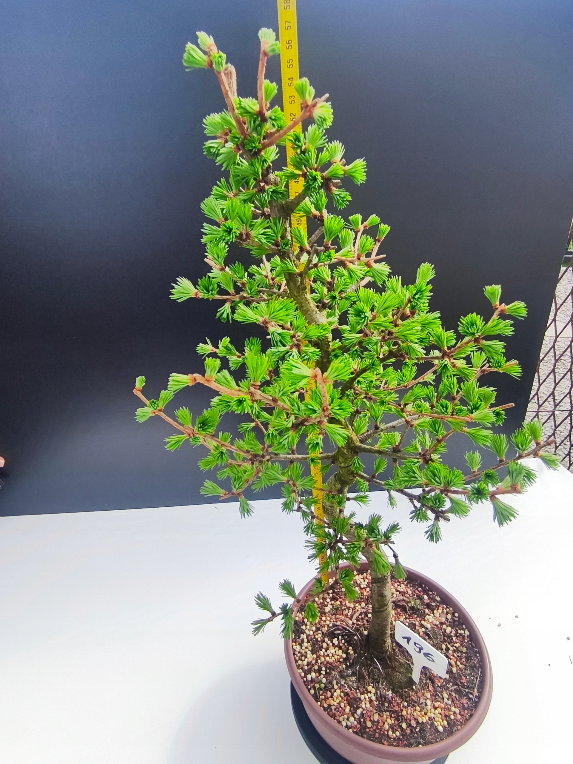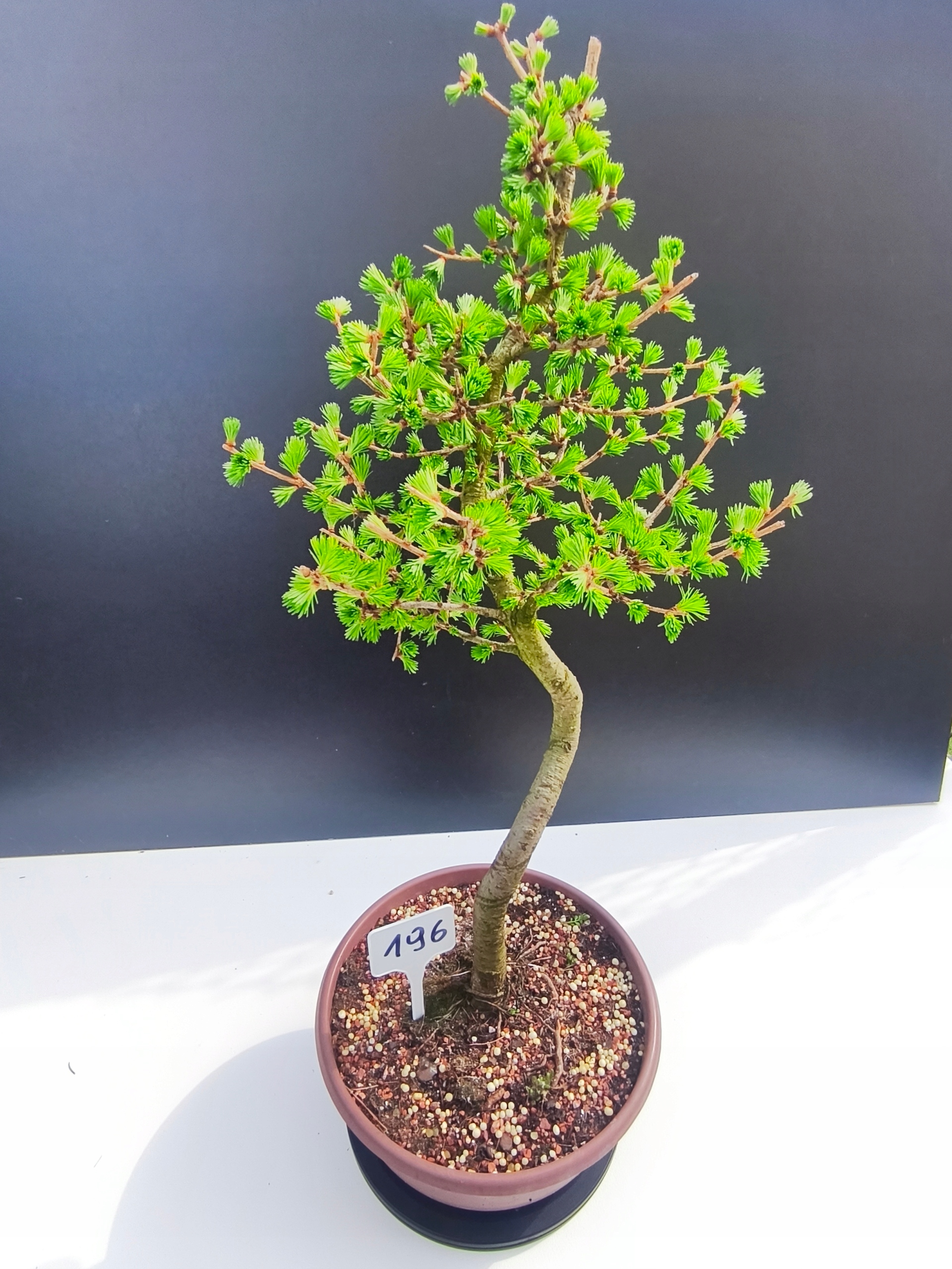 Każde nasze drzewko bonsai to unikalny egzemplarz, dlatego każde zostaje wystawione osobno, ponieważ traktujemy każde indywidualnie – od formowania po pielęgnację. Modrzewie te są w naszych rękach od 2021 roku i obecnie mają już 11 lat, dzięki czemu prezentują się wyjątkowo dojrzale i stabilnie.