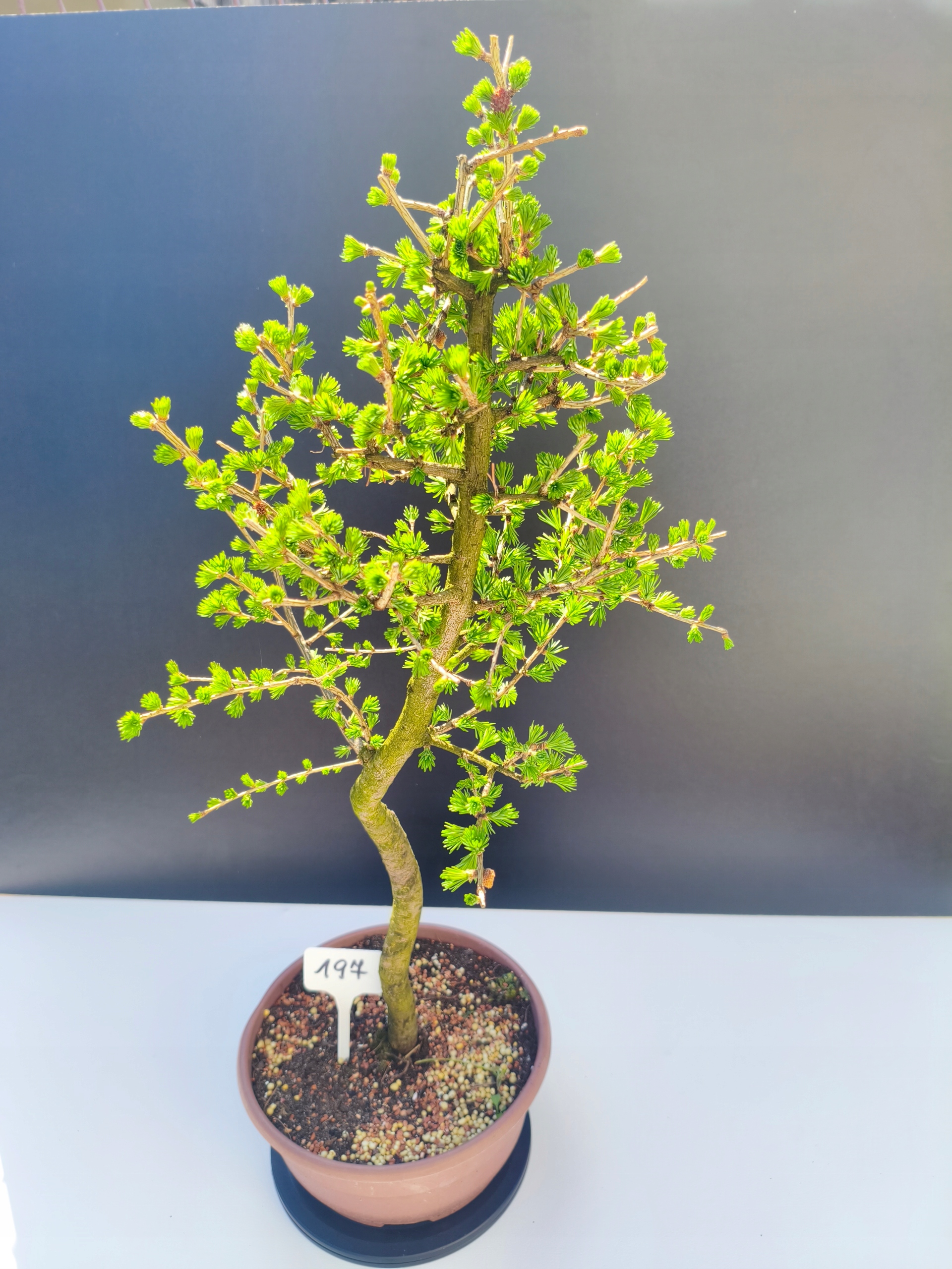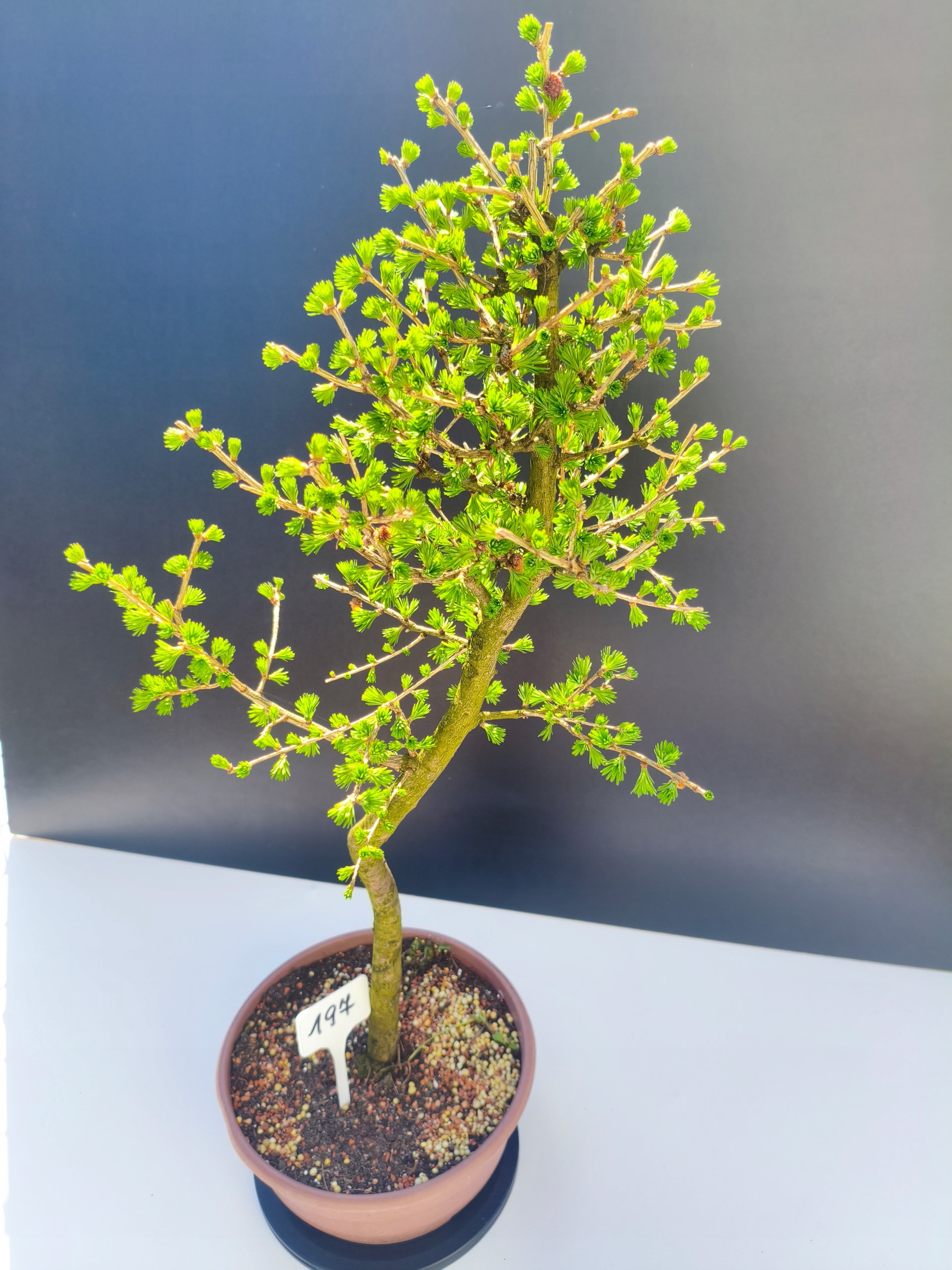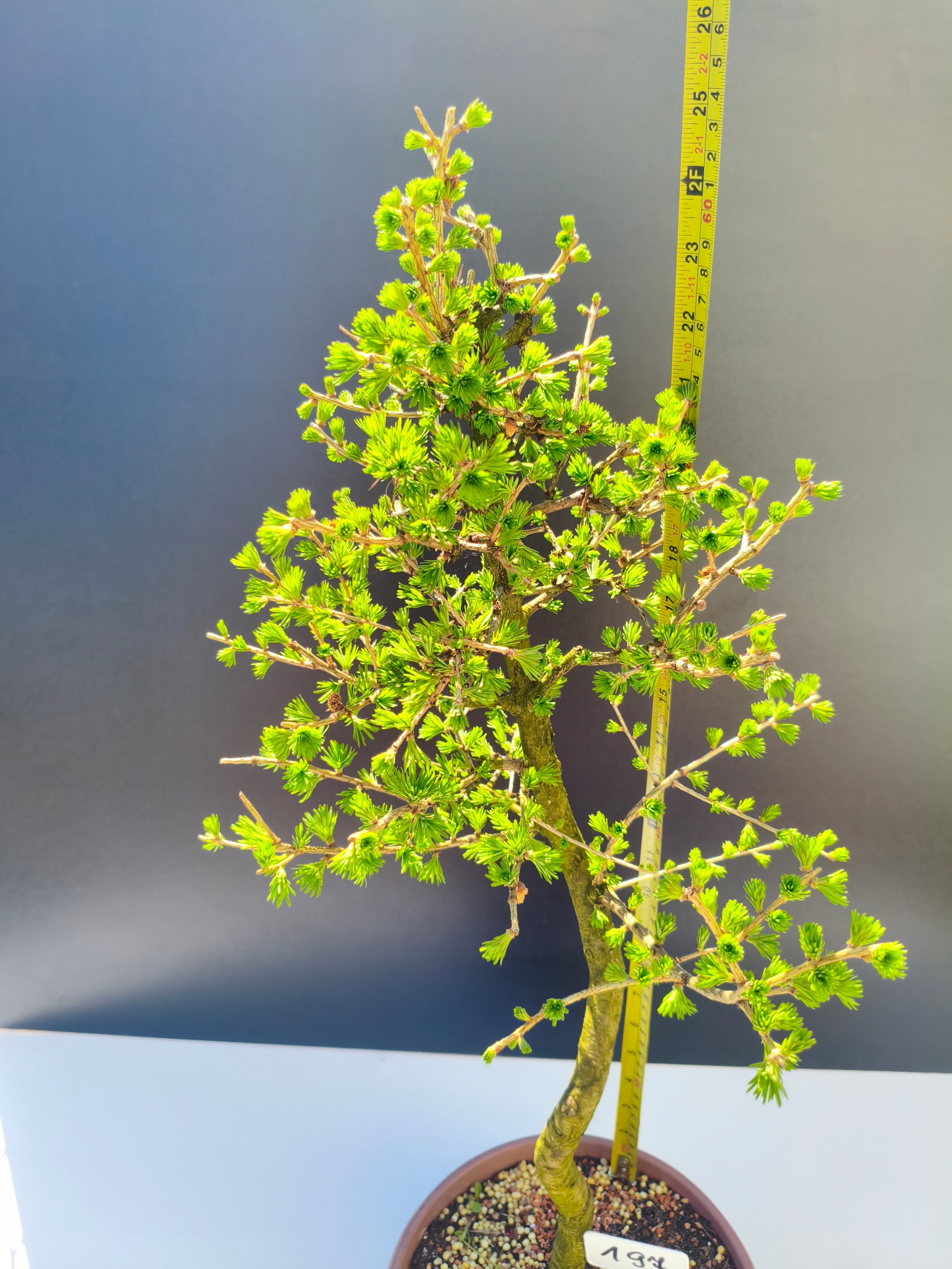 Każde nasze drzewko bonsai to unikalny egzemplarz, dlatego każde zostaje wystawione osobno, ponieważ traktujemy każde indywidualnie – od formowania po pielęgnację. Modrzewie te są w naszych rękach od 2021 roku i obecnie mają już 11 lat, dzięki czemu prezentują się wyjątkowo dojrzale i stabilnie.