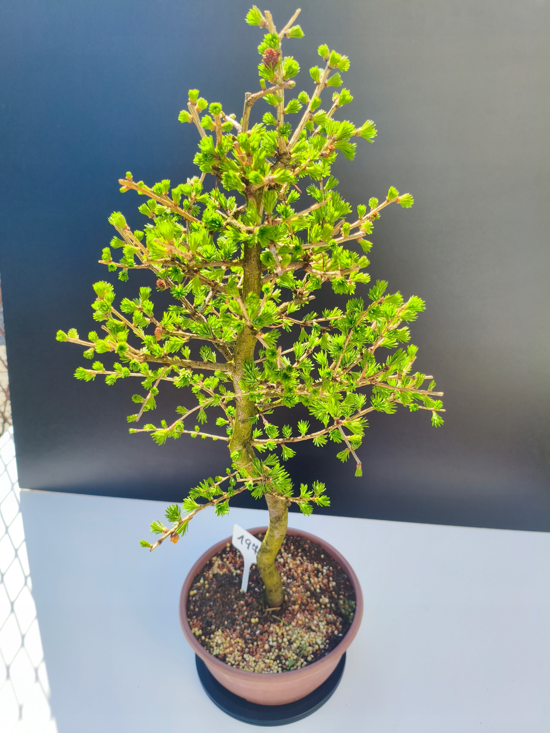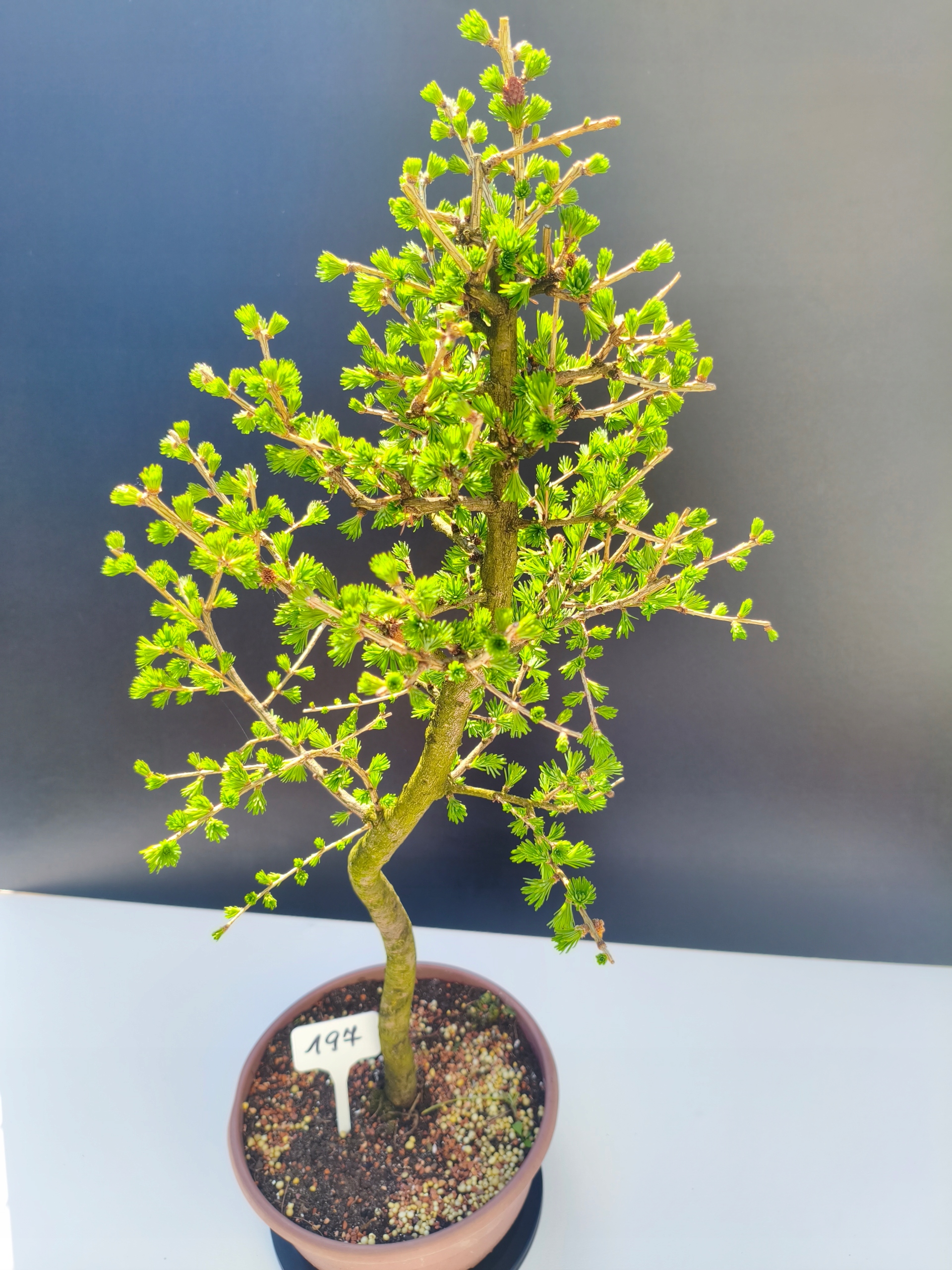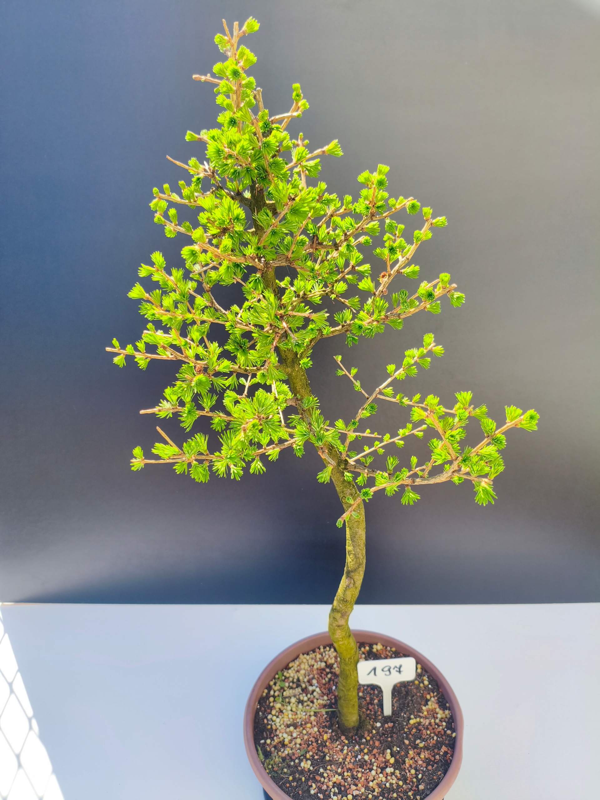 Każde nasze drzewko bonsai to unikalny egzemplarz, dlatego każde zostaje wystawione osobno, ponieważ traktujemy każde indywidualnie – od formowania po pielęgnację. Modrzewie te są w naszych rękach od 2021 roku i obecnie mają już 11 lat, dzięki czemu prezentują się wyjątkowo dojrzale i stabilnie.