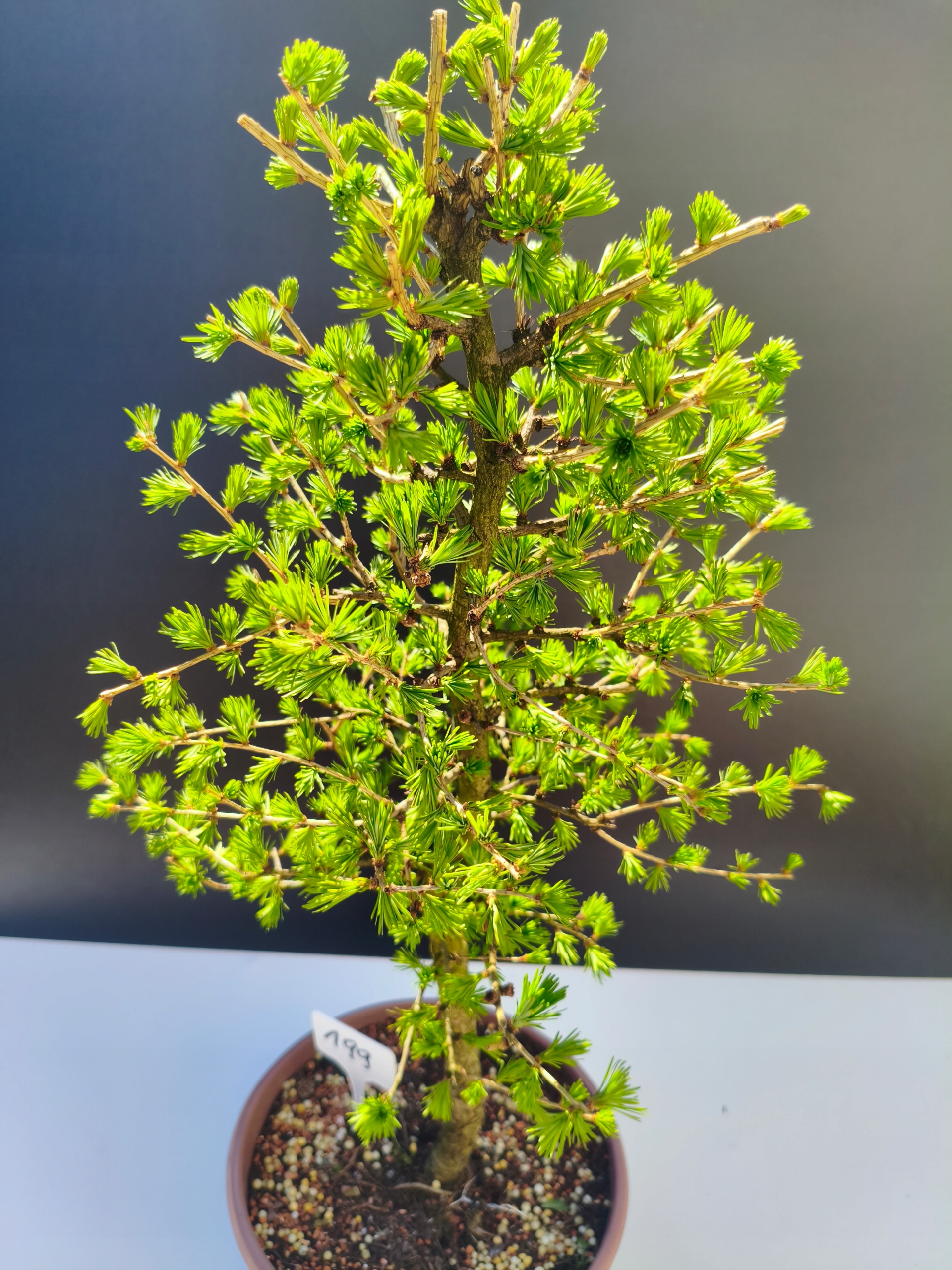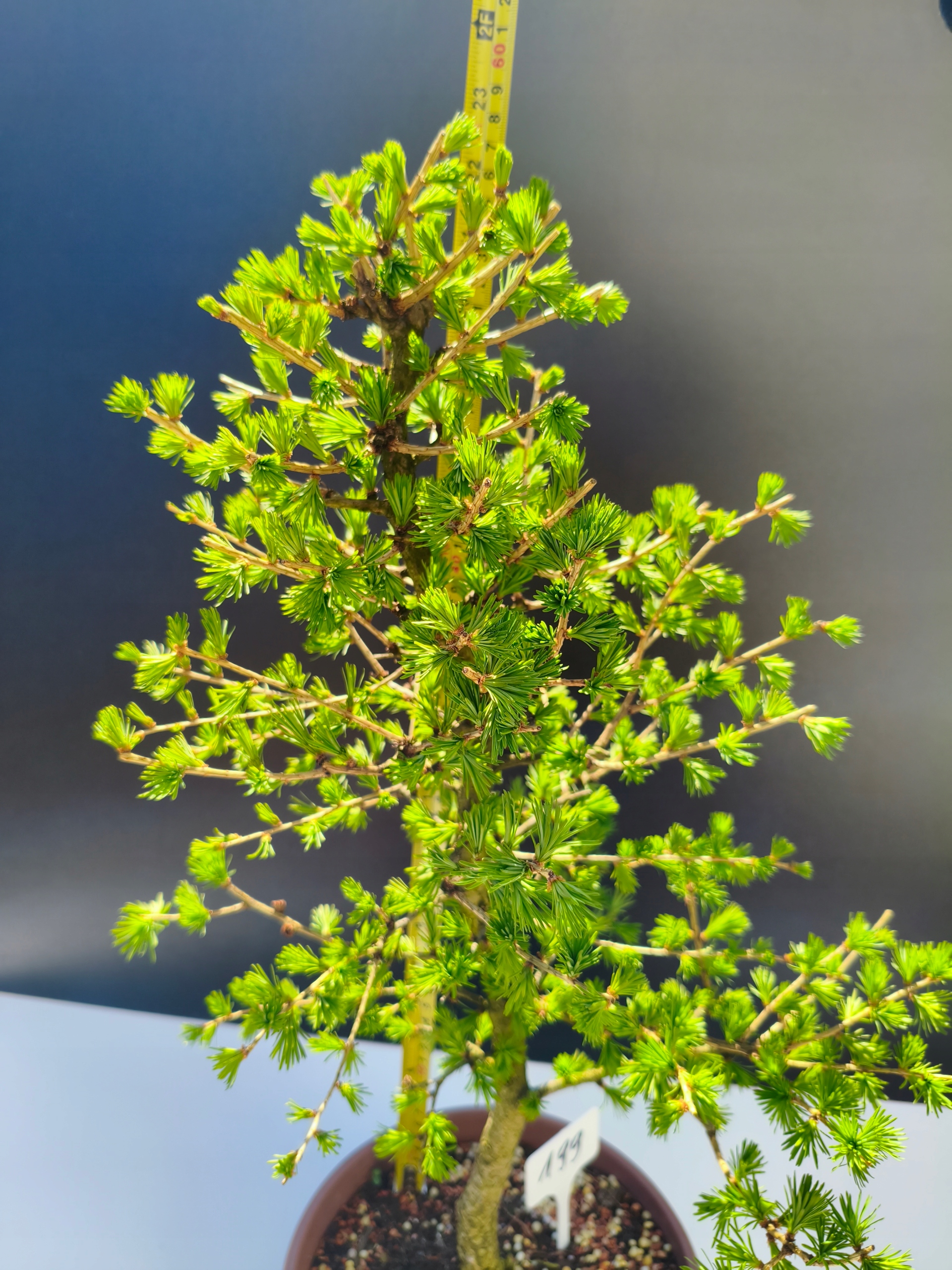 Każde nasze drzewko bonsai to unikalny egzemplarz, dlatego każde zostaje wystawione osobno, ponieważ traktujemy każde indywidualnie – od formowania po pielęgnację. Modrzewie te są w naszych rękach od 2021 roku i obecnie mają już 11 lat, dzięki czemu prezentują się wyjątkowo dojrzale i stabilnie.