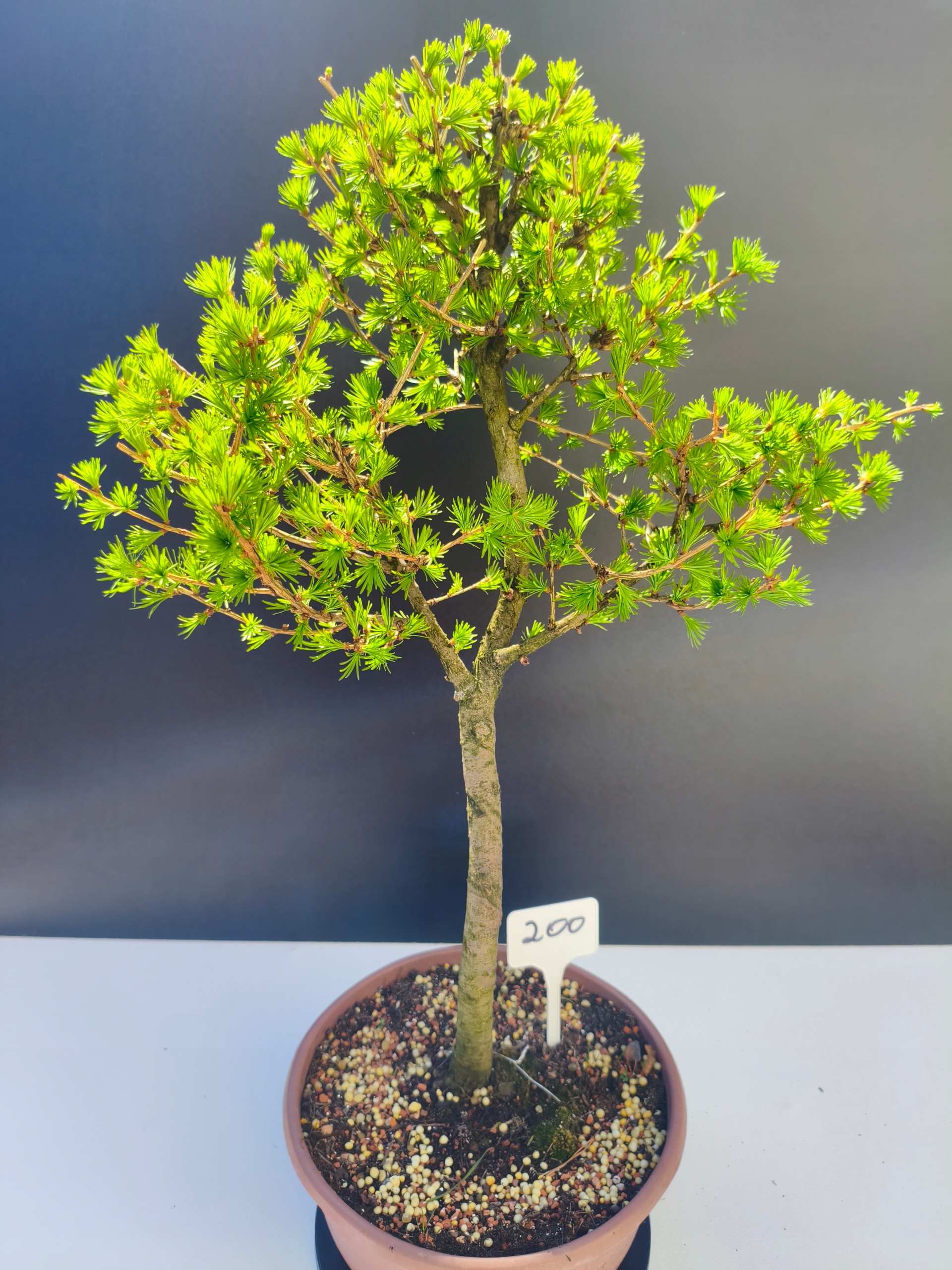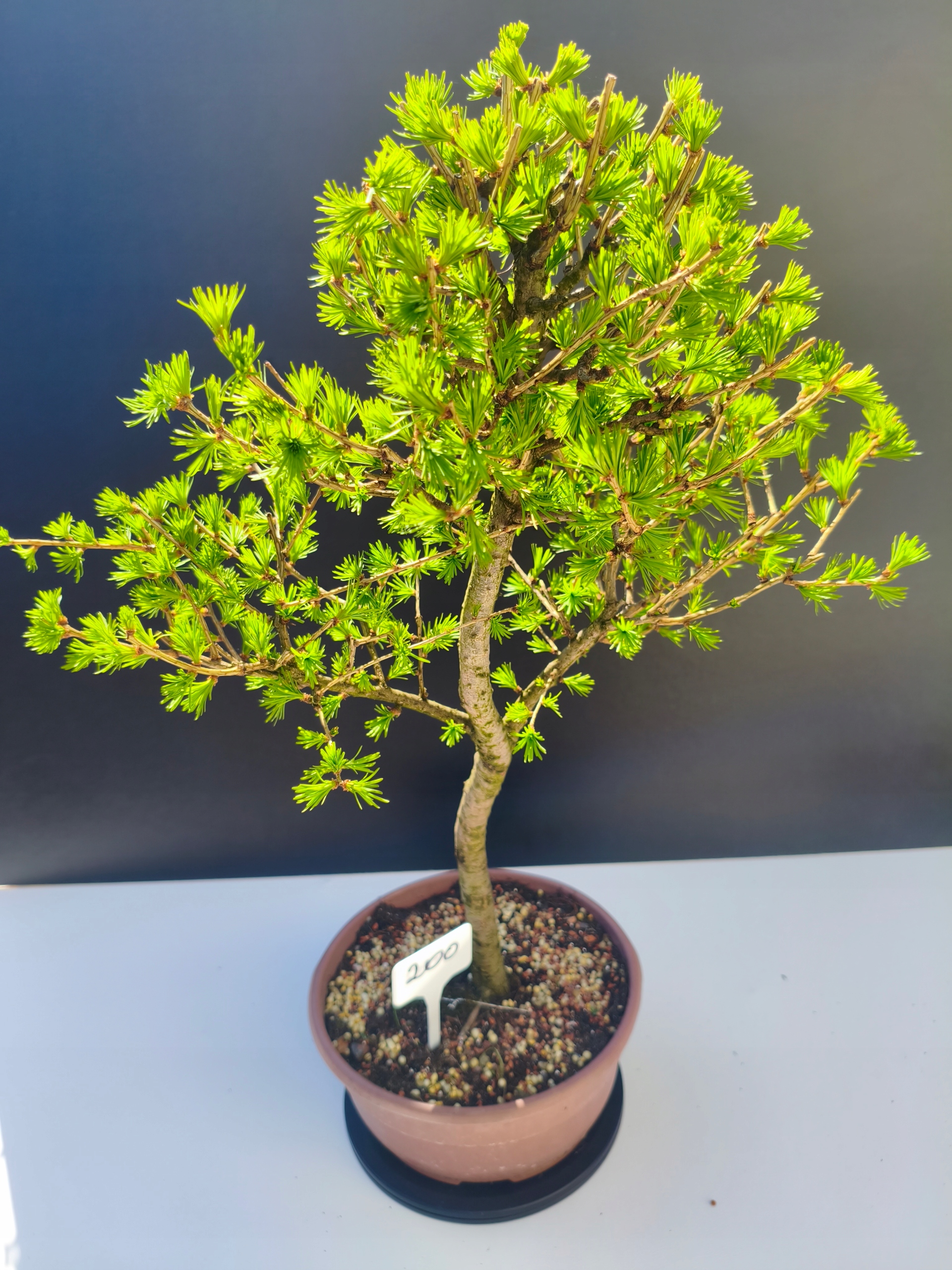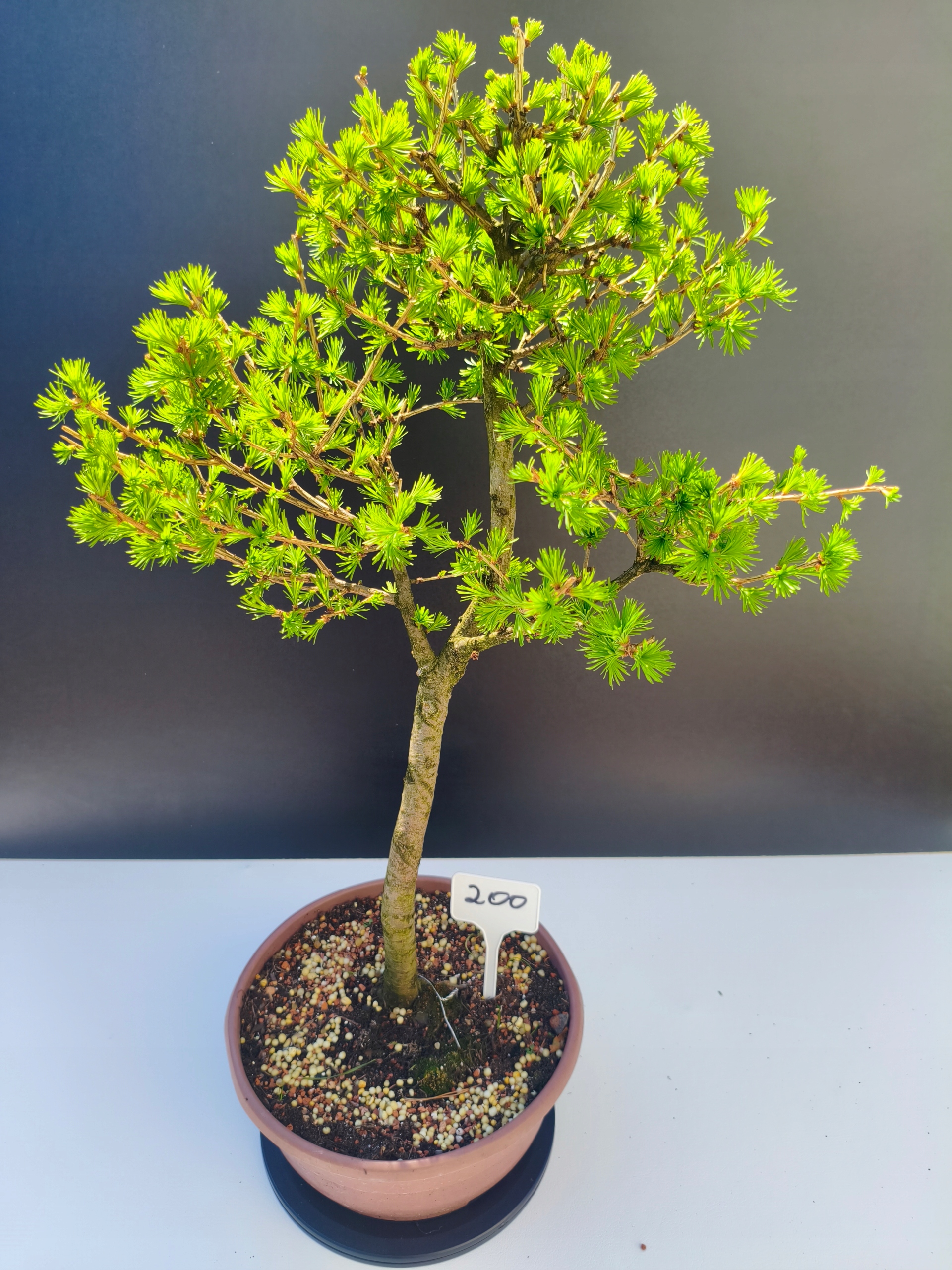 Każde nasze drzewko bonsai to unikalny egzemplarz, dlatego każde zostaje wystawione osobno, ponieważ traktujemy każde indywidualnie – od formowania po pielęgnację. Modrzewie te są w naszych rękach od 2021 roku i obecnie mają już 11 lat, dzięki czemu prezentują się wyjątkowo dojrzale i stabilnie.