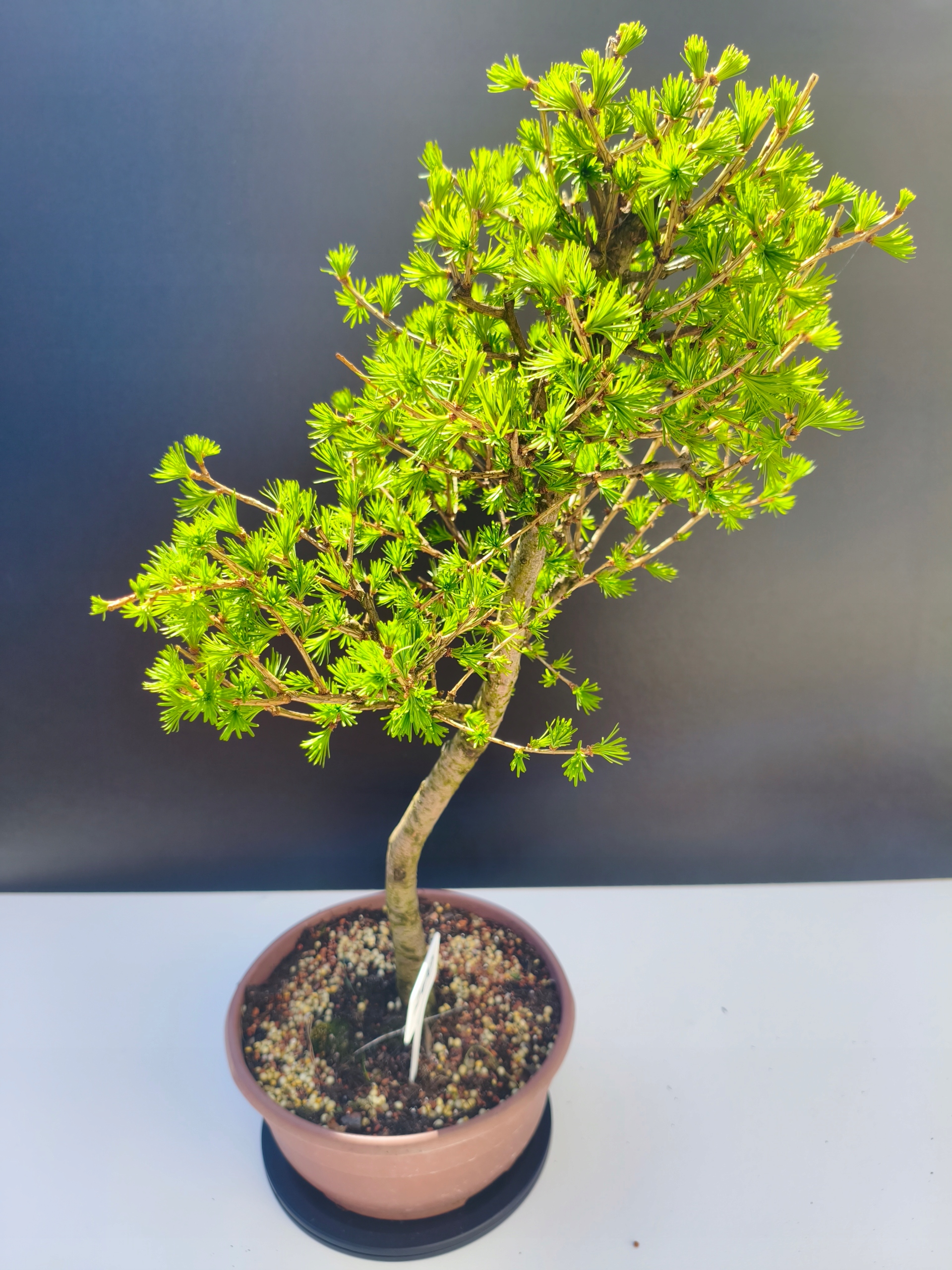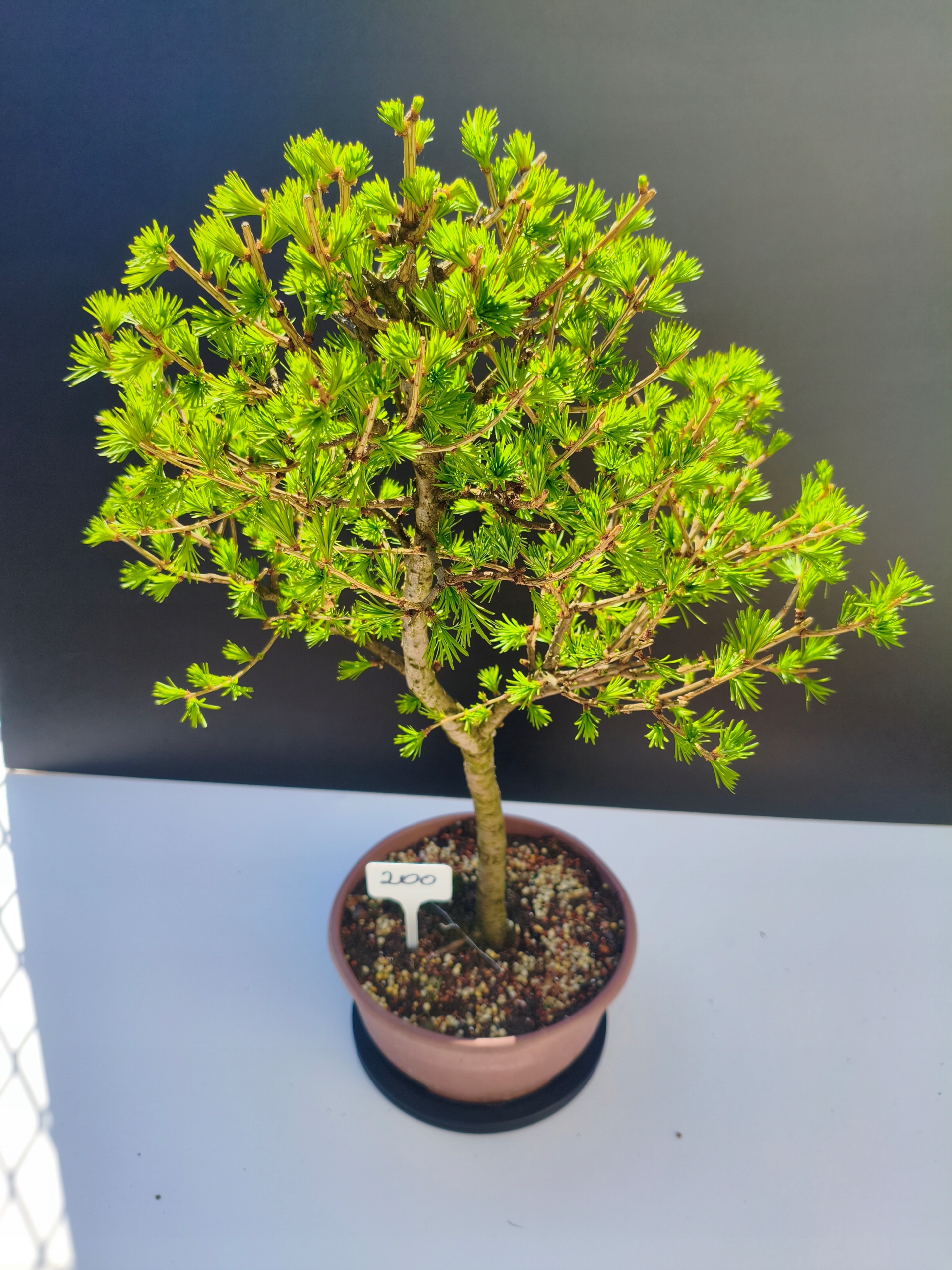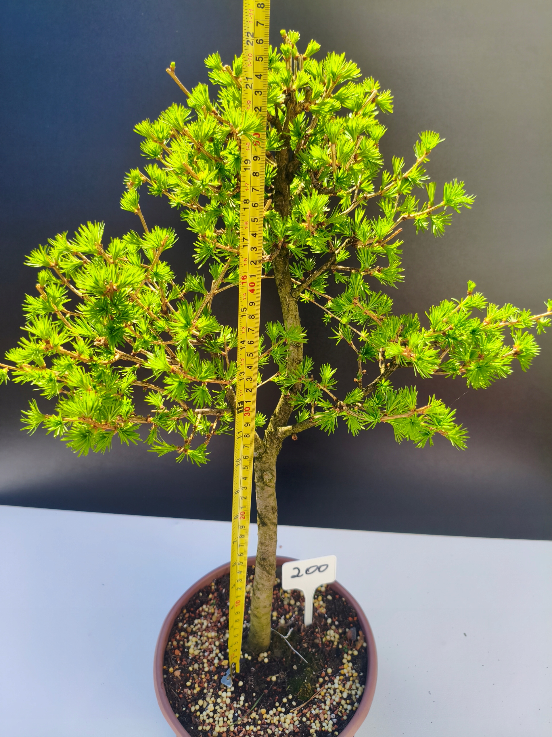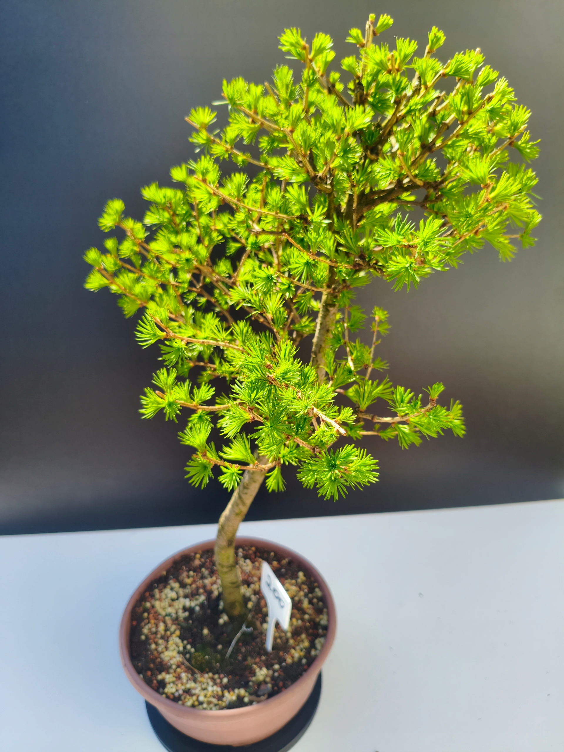 Każde nasze drzewko bonsai to unikalny egzemplarz, dlatego każde zostaje wystawione osobno, ponieważ traktujemy każde indywidualnie – od formowania po pielęgnację. Modrzewie te są w naszych rękach od 2021 roku i obecnie mają już 11 lat, dzięki czemu prezentują się wyjątkowo dojrzale i stabilnie.