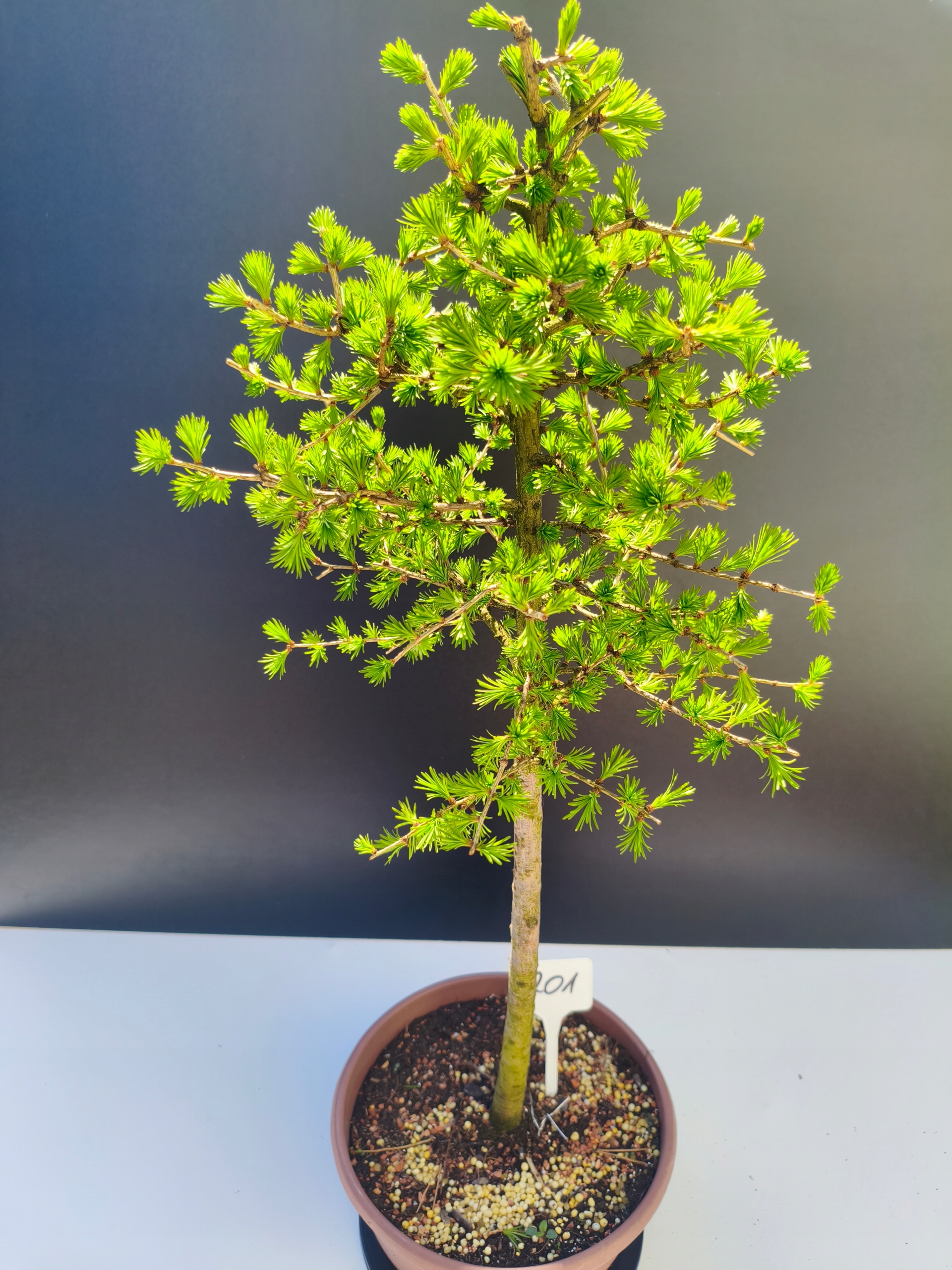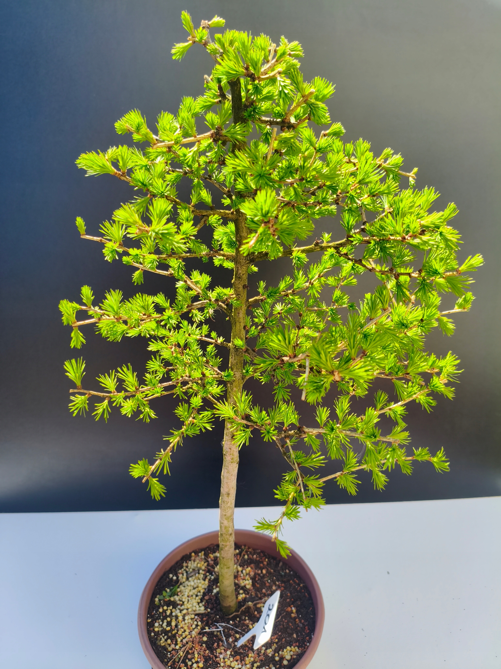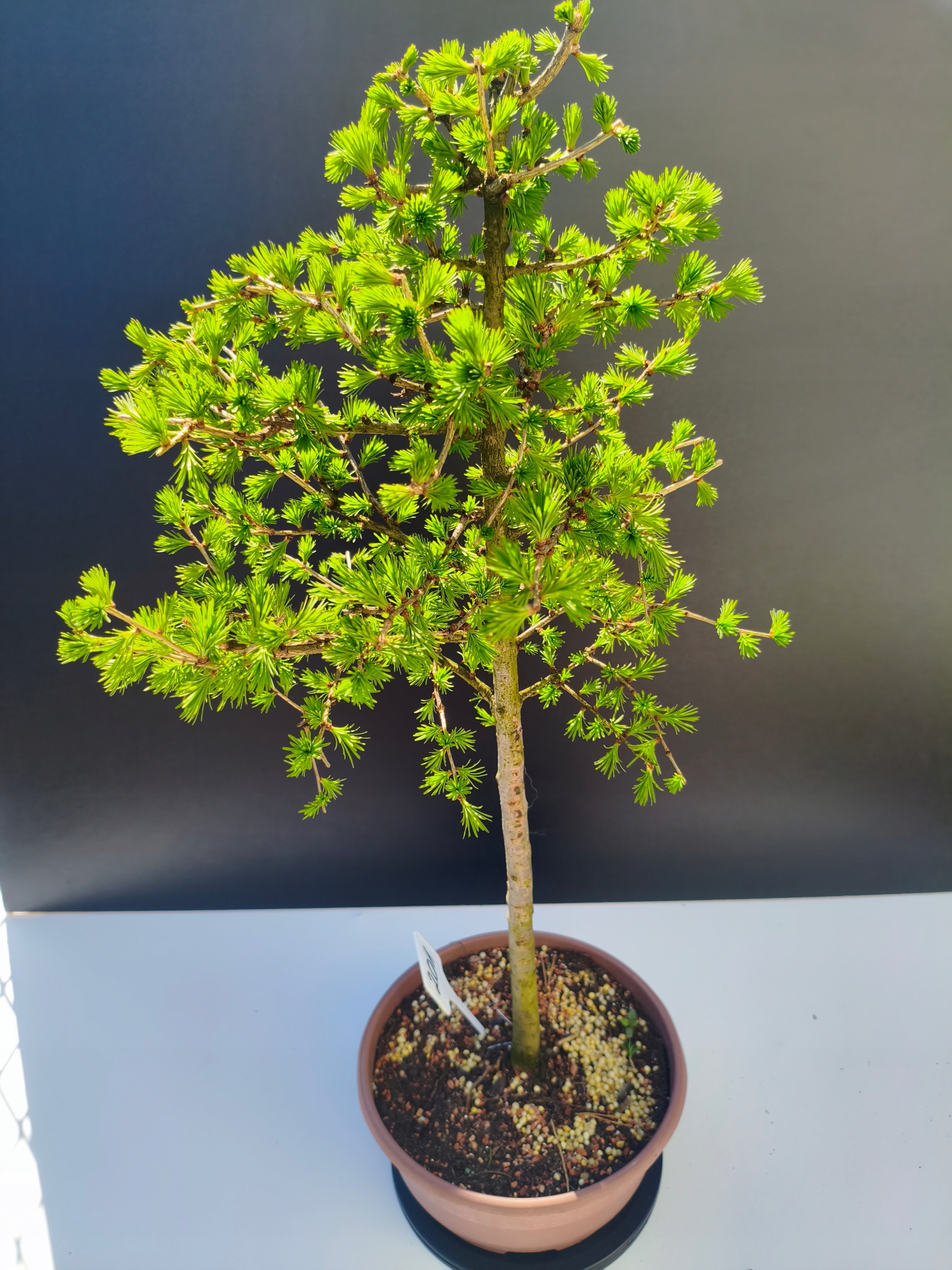Każde nasze drzewko bonsai to unikalny egzemplarz, dlatego każde zostaje wystawione osobno, ponieważ traktujemy każde indywidualnie – od formowania po pielęgnację. Modrzewie te są w naszych rękach od 2021 roku i obecnie mają już 11 lat, dzięki czemu prezentują się wyjątkowo dojrzale i stabilnie.
