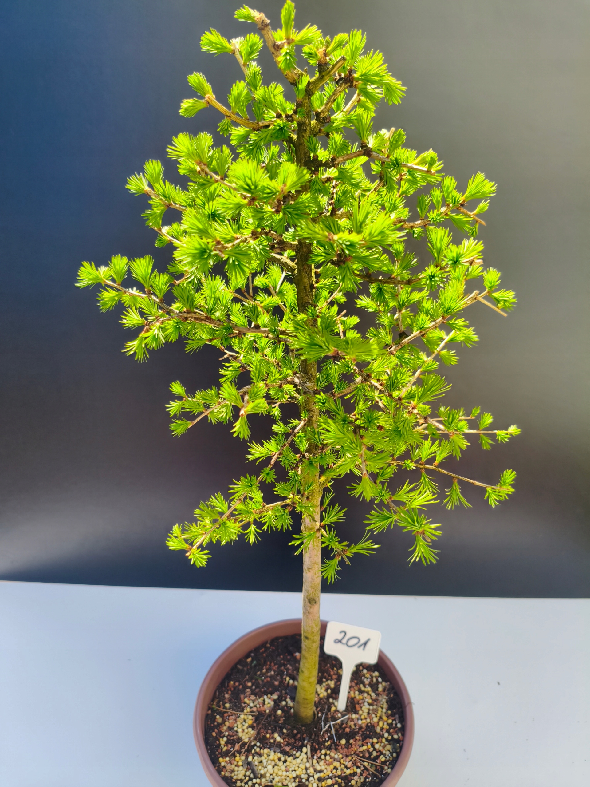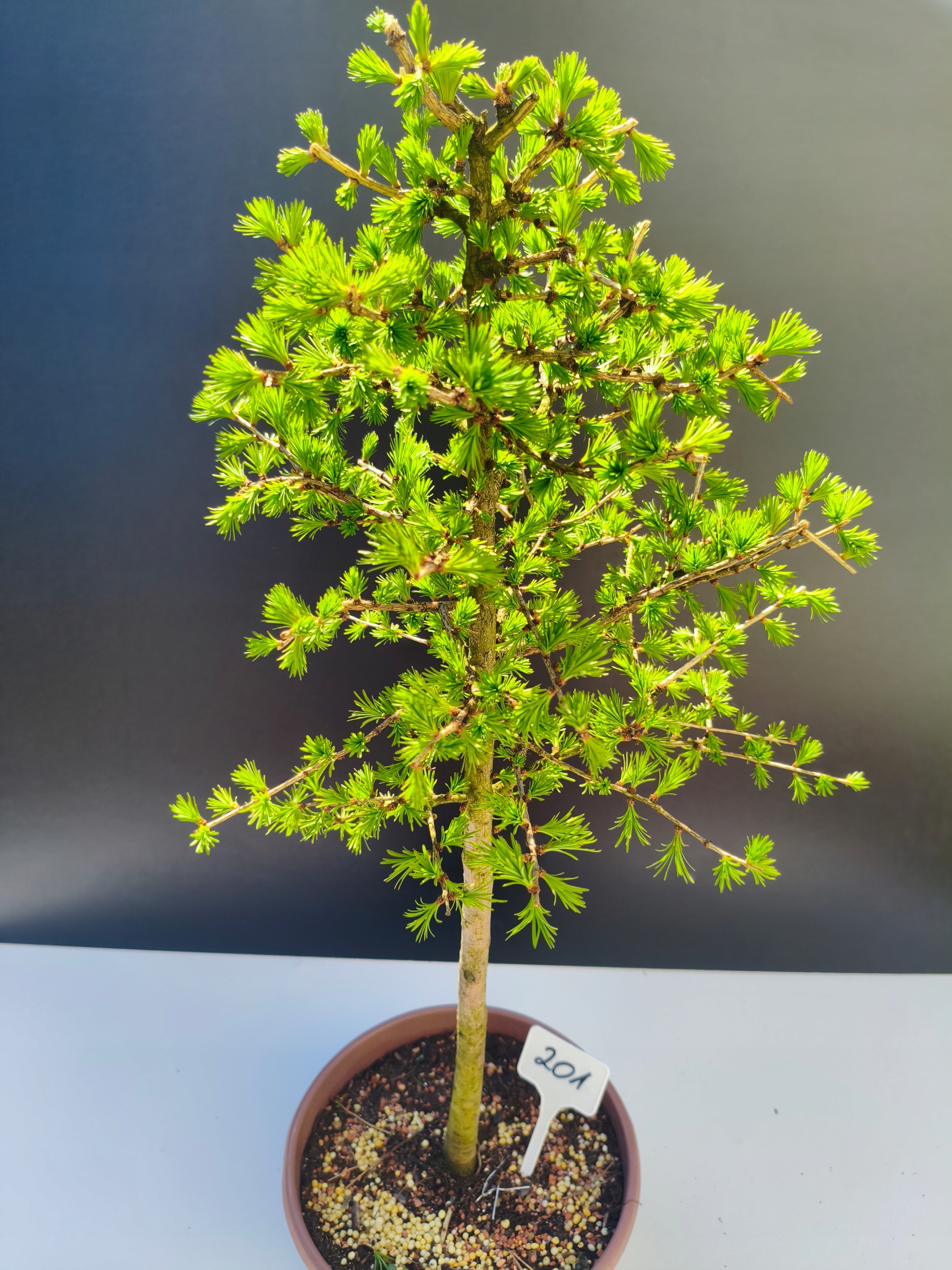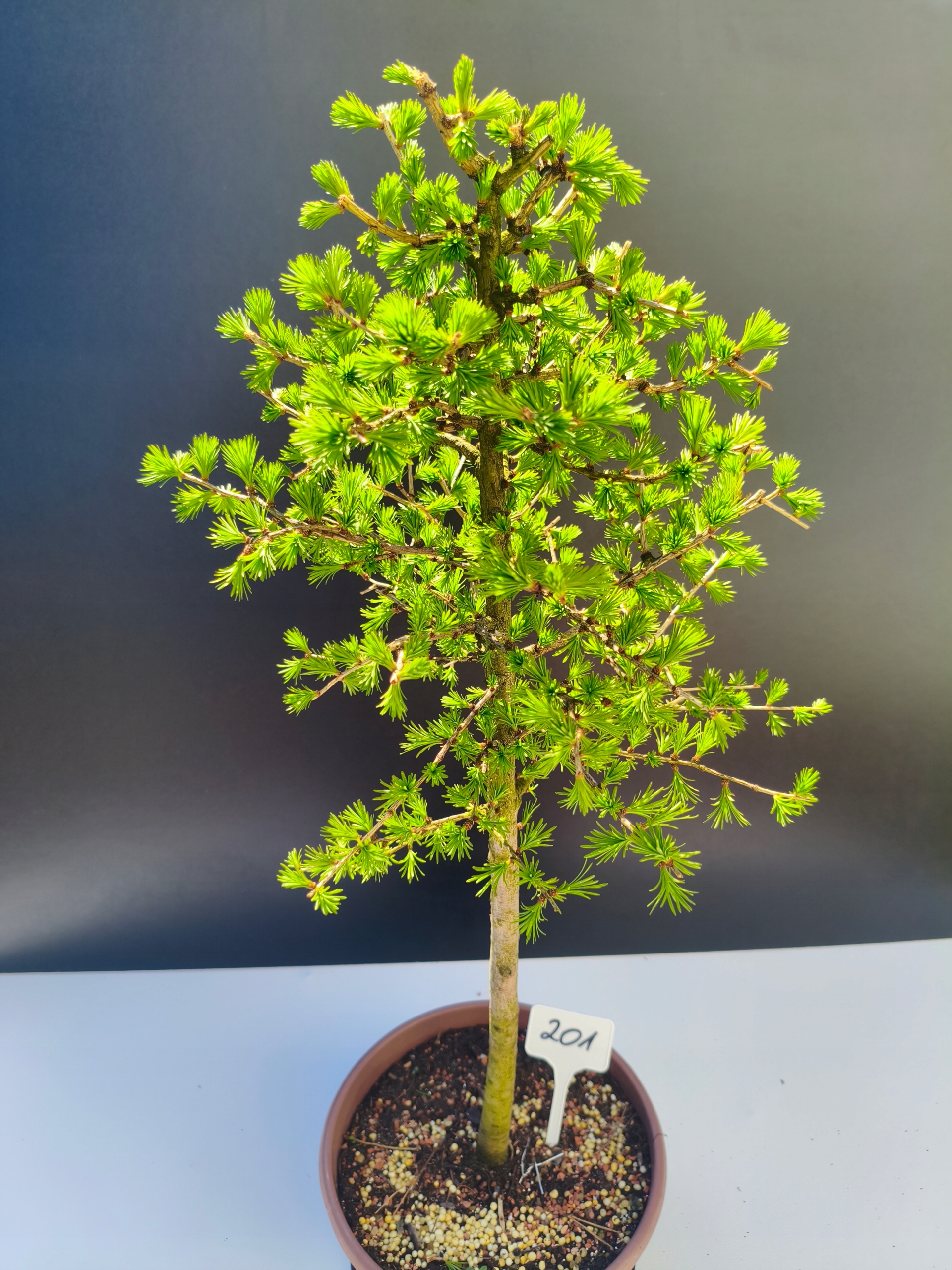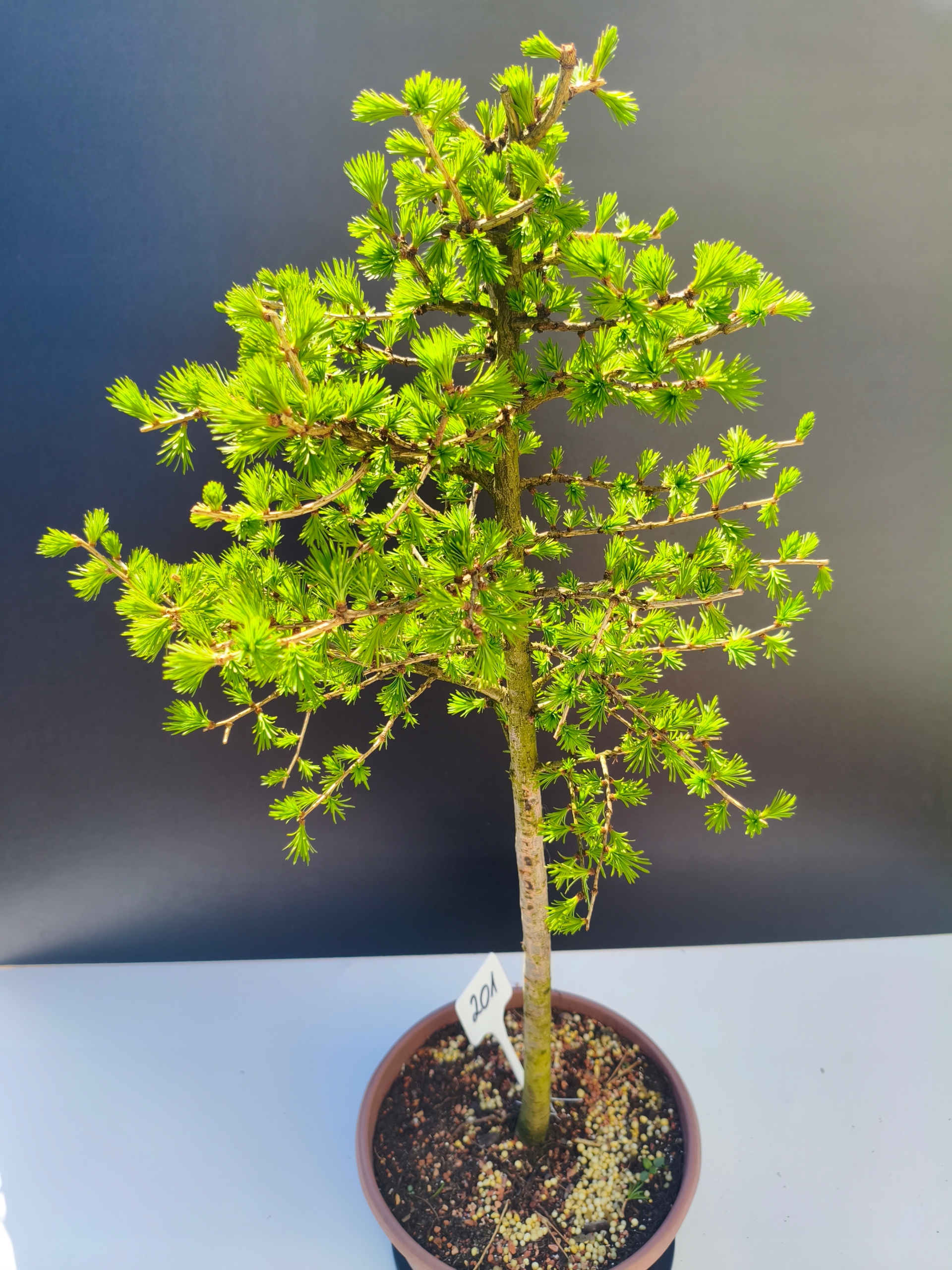 Każde nasze drzewko bonsai to unikalny egzemplarz, dlatego każde zostaje wystawione osobno, ponieważ traktujemy każde indywidualnie – od formowania po pielęgnację. Modrzewie te są w naszych rękach od 2021 roku i obecnie mają już 11 lat, dzięki czemu prezentują się wyjątkowo dojrzale i stabilnie.