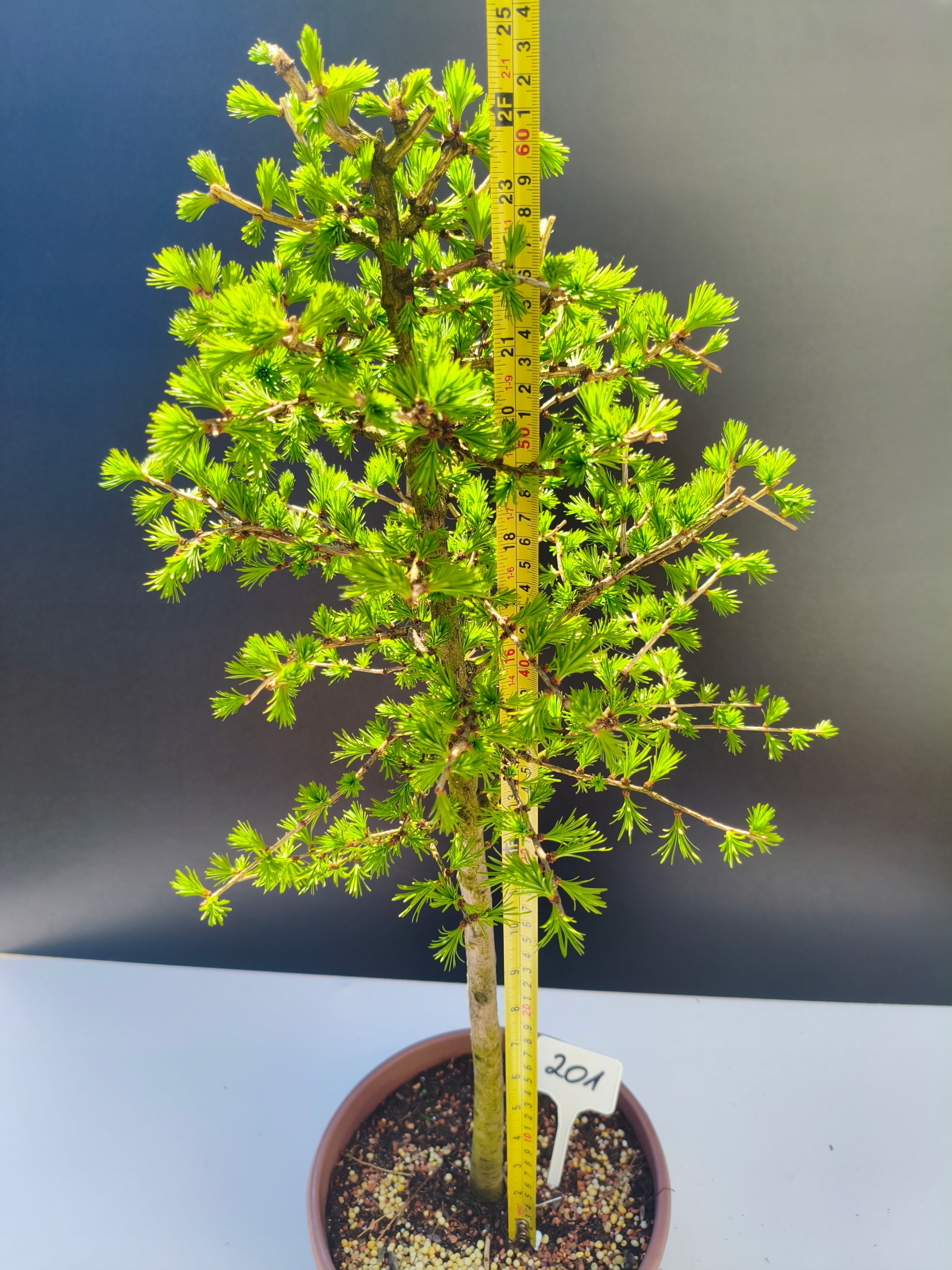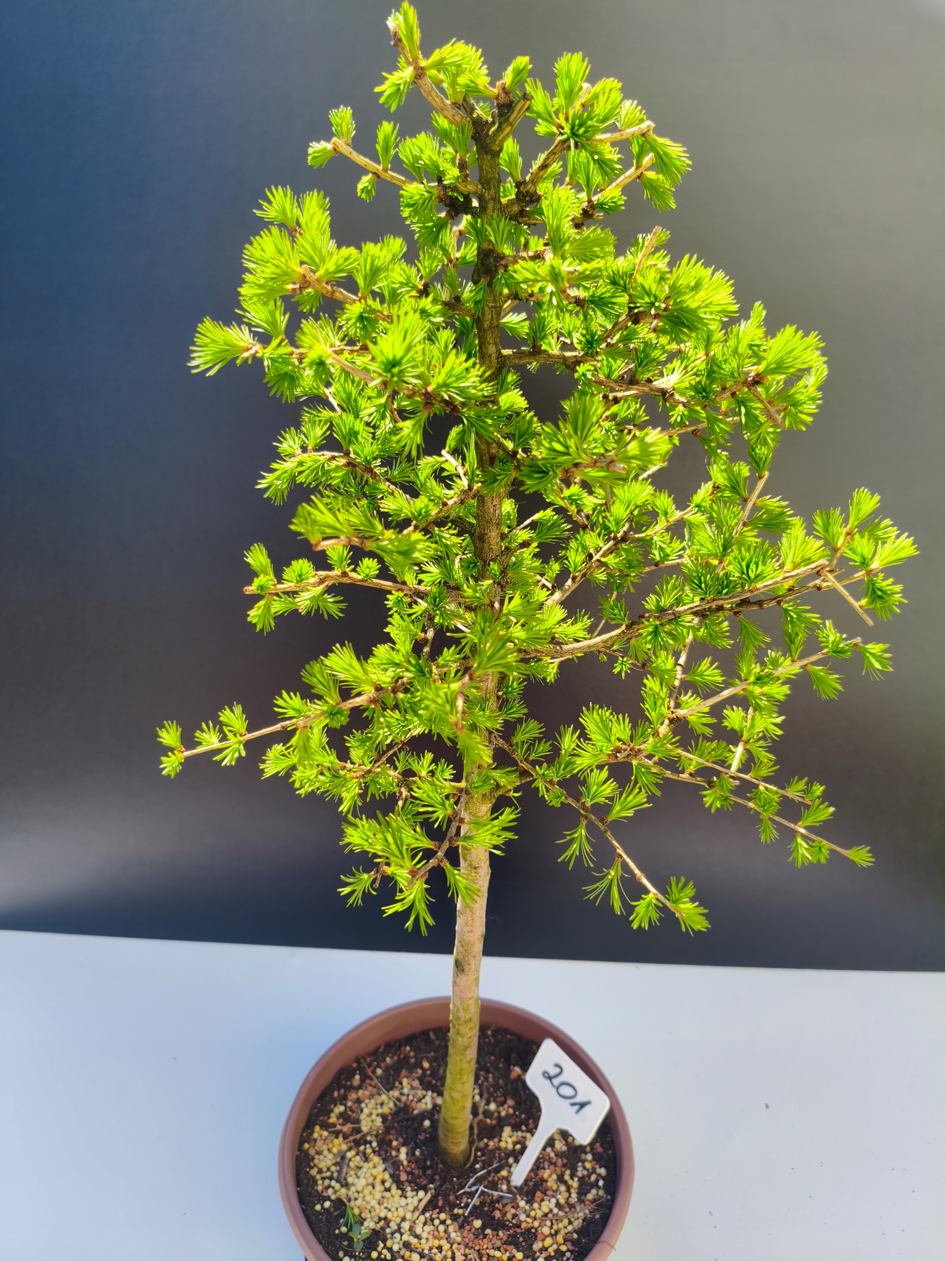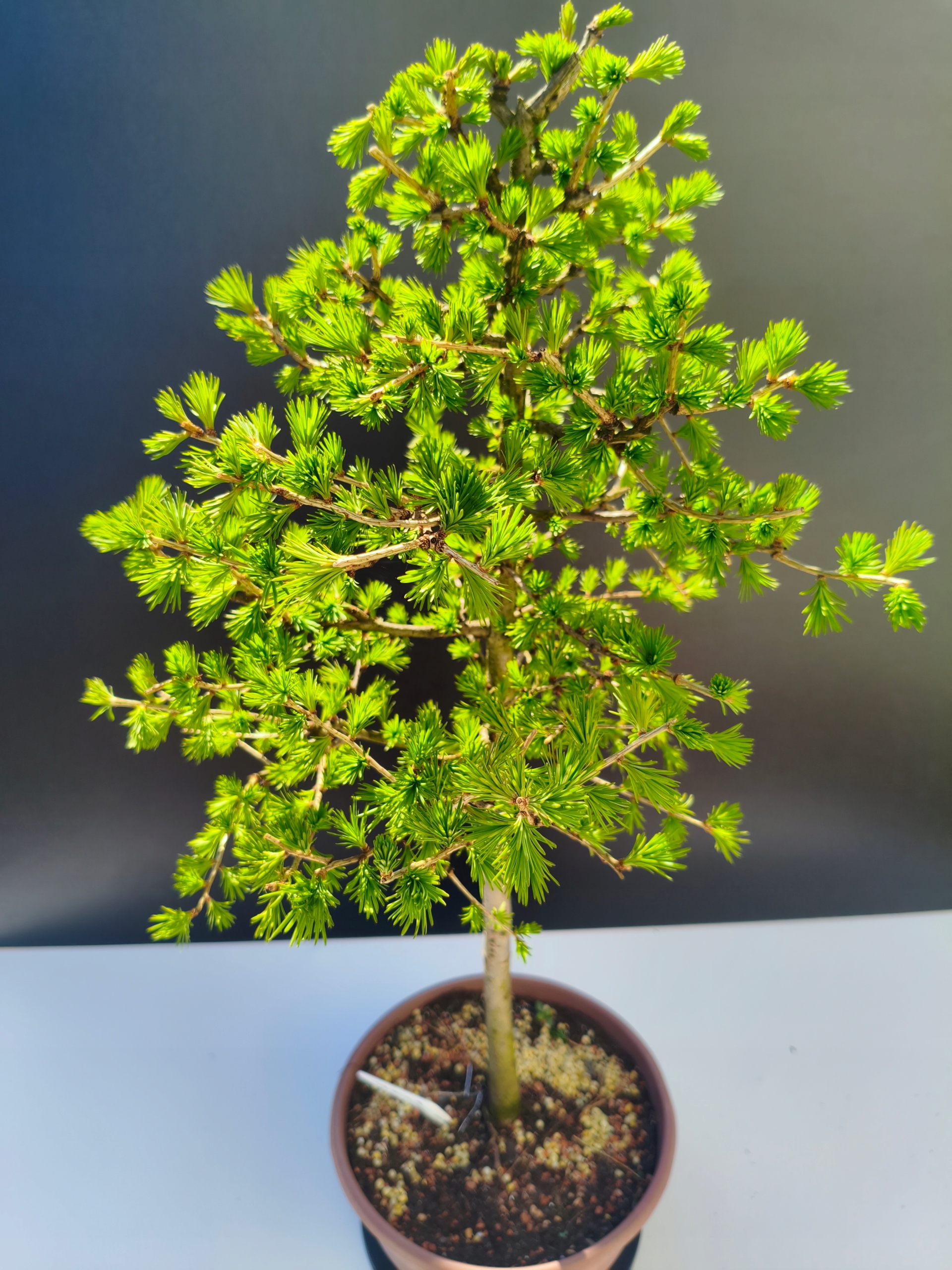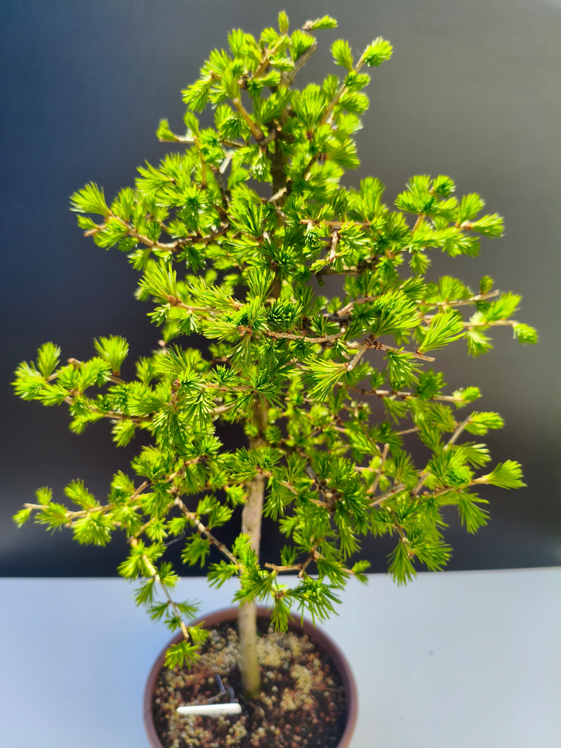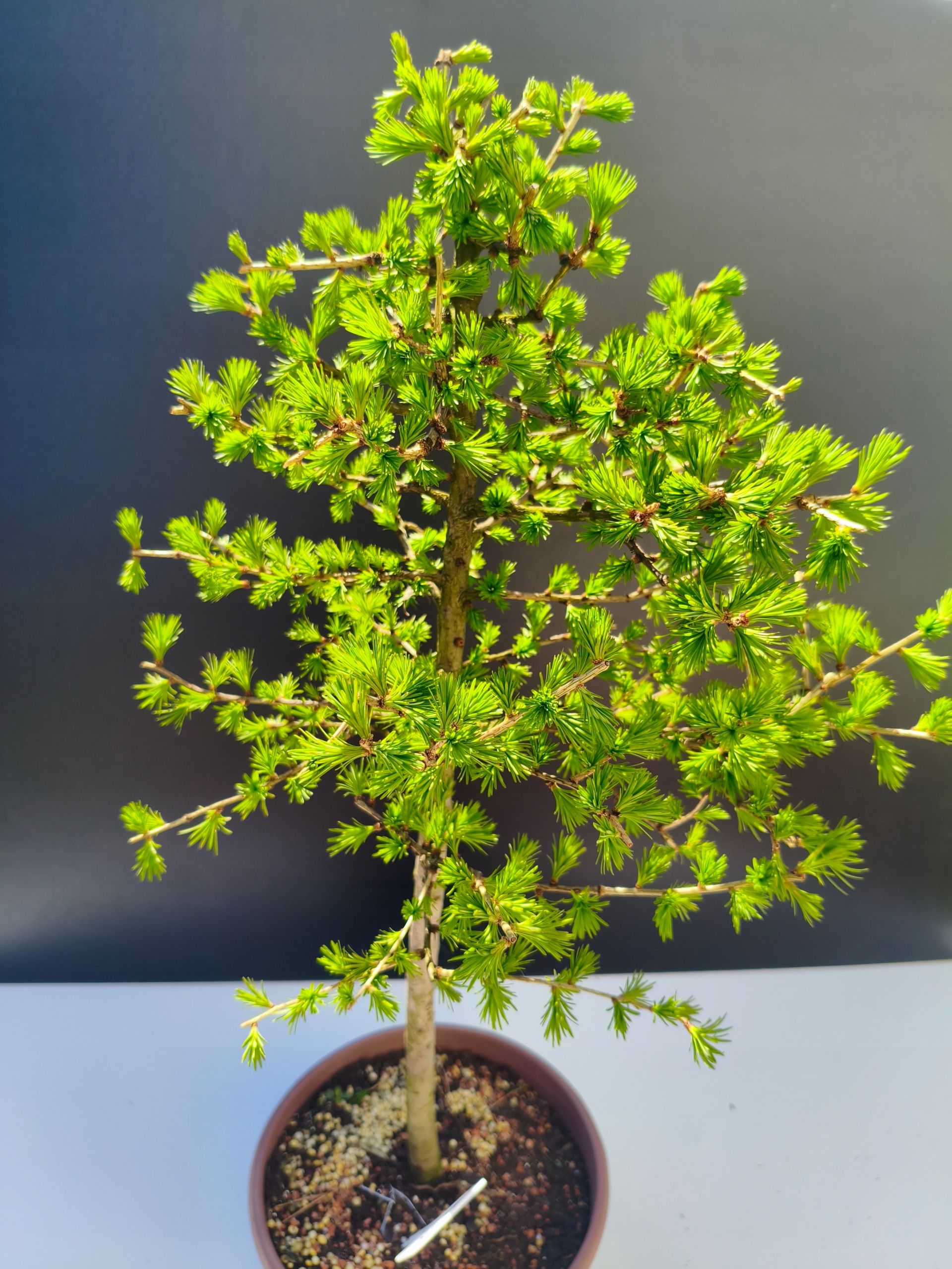 Naturalny rytm – piękno zmienności Modrzew europejski to wyjątkowe bonsai, które jesienią naturalnie zrzuca igły, aby na wiosnę wypuścić nowe, soczyście zielone przyrosty. To jedno z nielicznych drzewek iglastych z tak wyraźnym sezonowym cyklem – co czyni je jeszcze bardziej fascynującym.