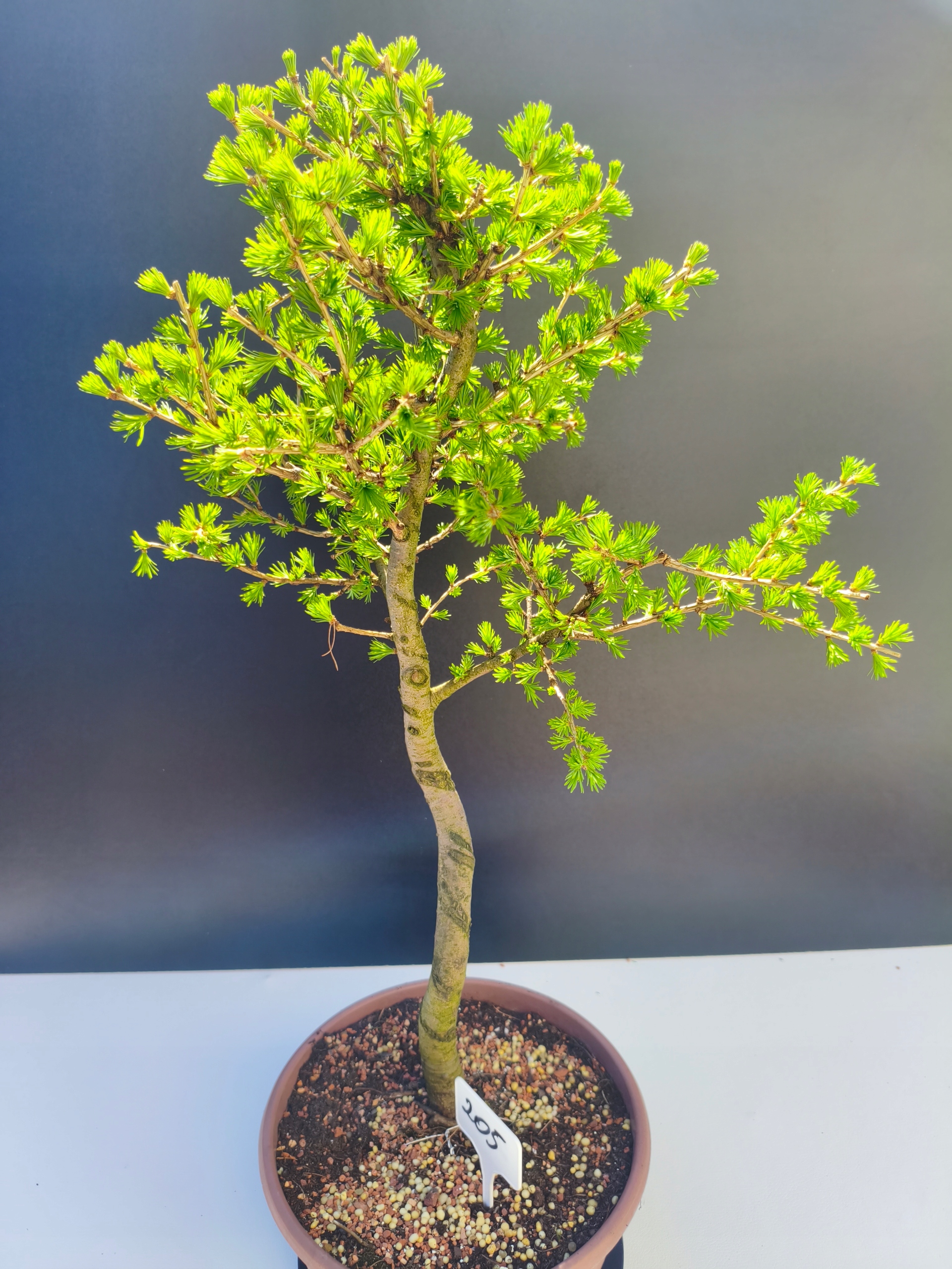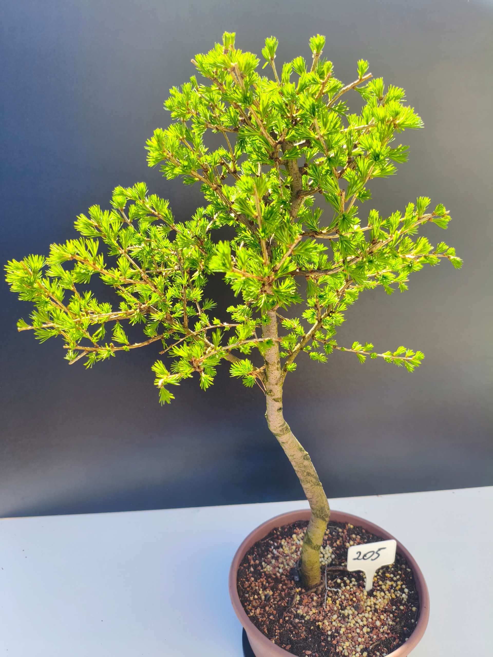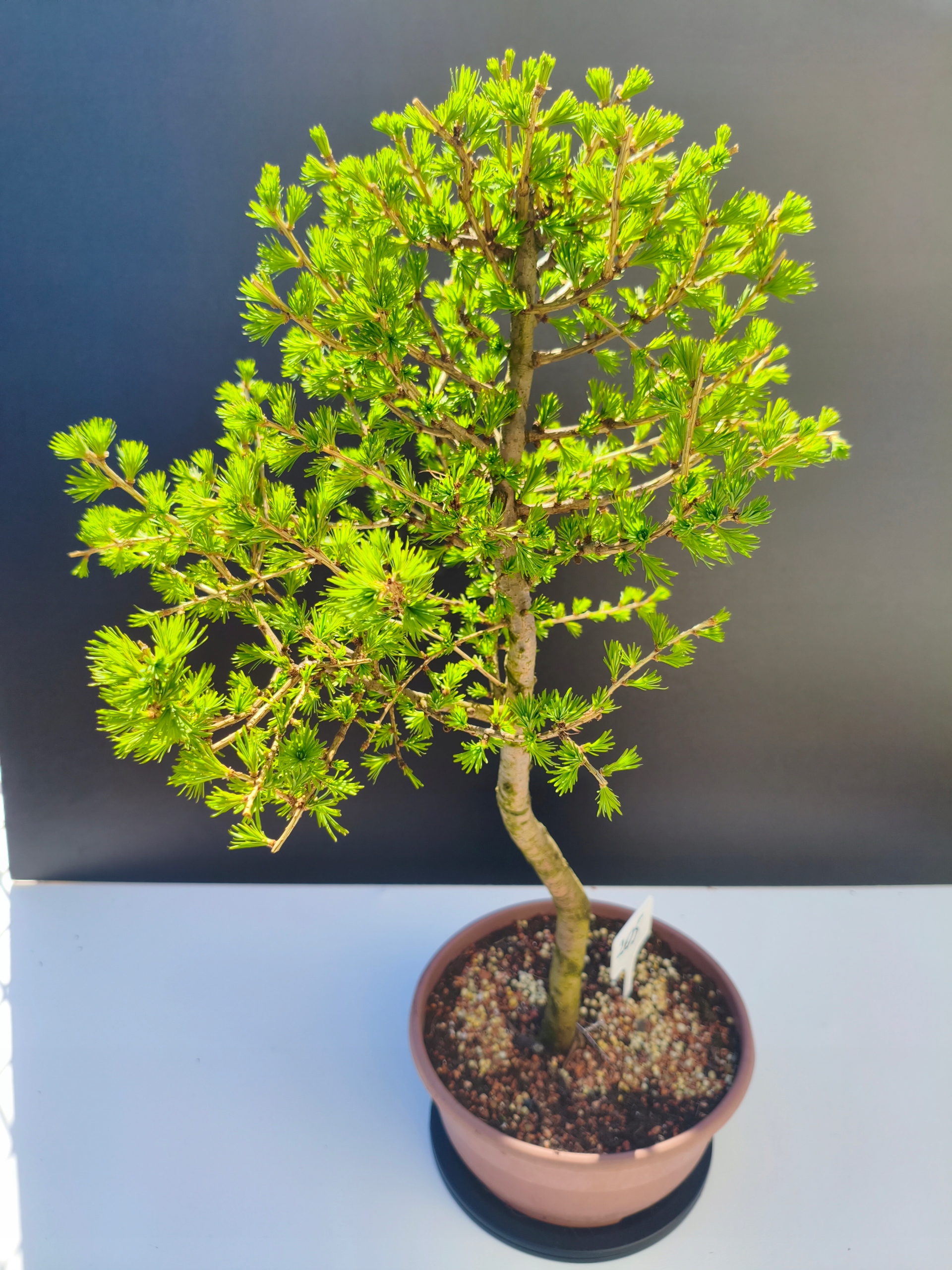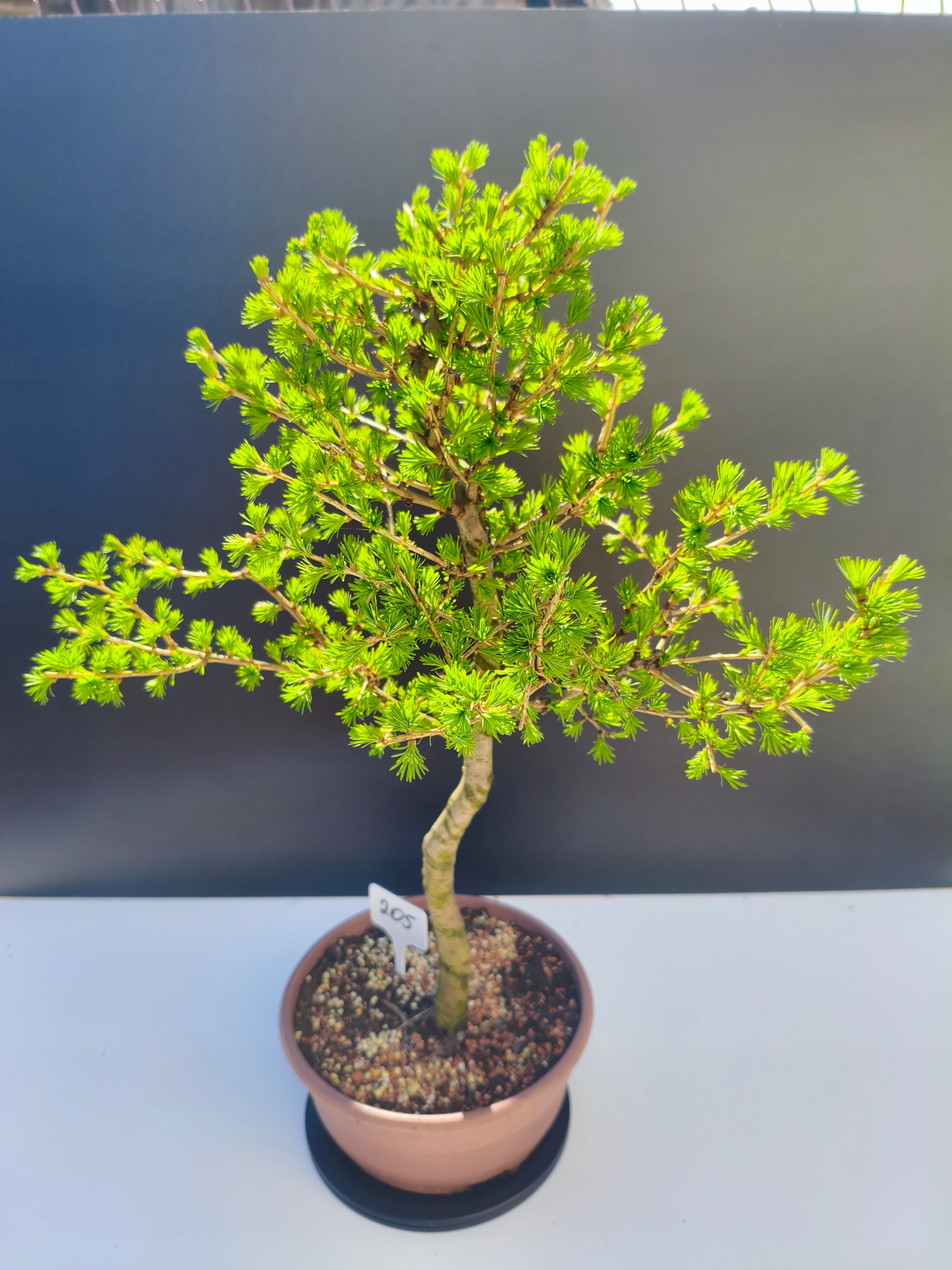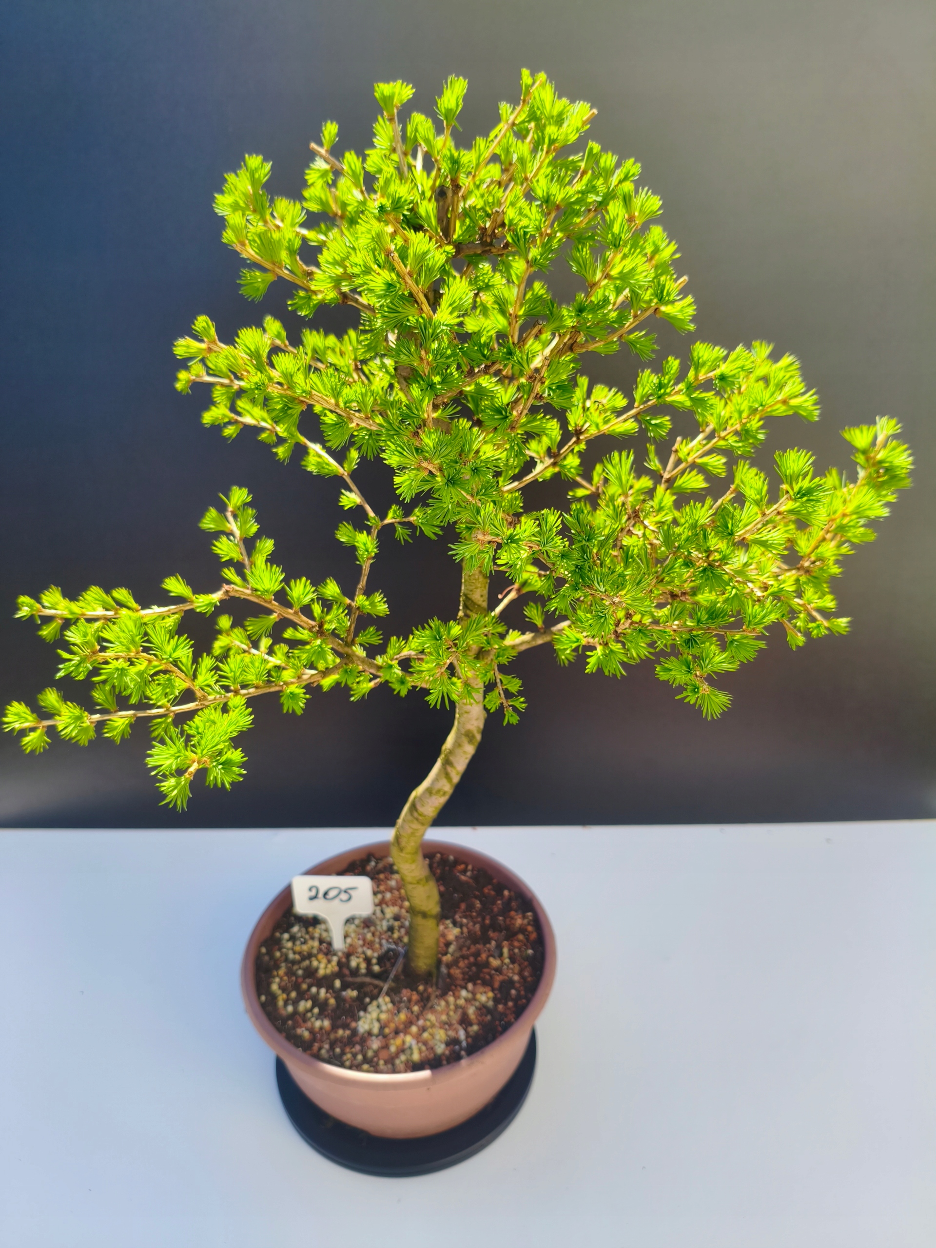 Każde nasze drzewko bonsai to unikalny egzemplarz, dlatego każde zostaje wystawione osobno, ponieważ traktujemy każde indywidualnie – od formowania po pielęgnację. Modrzewie te są w naszych rękach od 2021 roku i obecnie mają już 11 lat, dzięki czemu prezentują się wyjątkowo dojrzale i stabilnie.